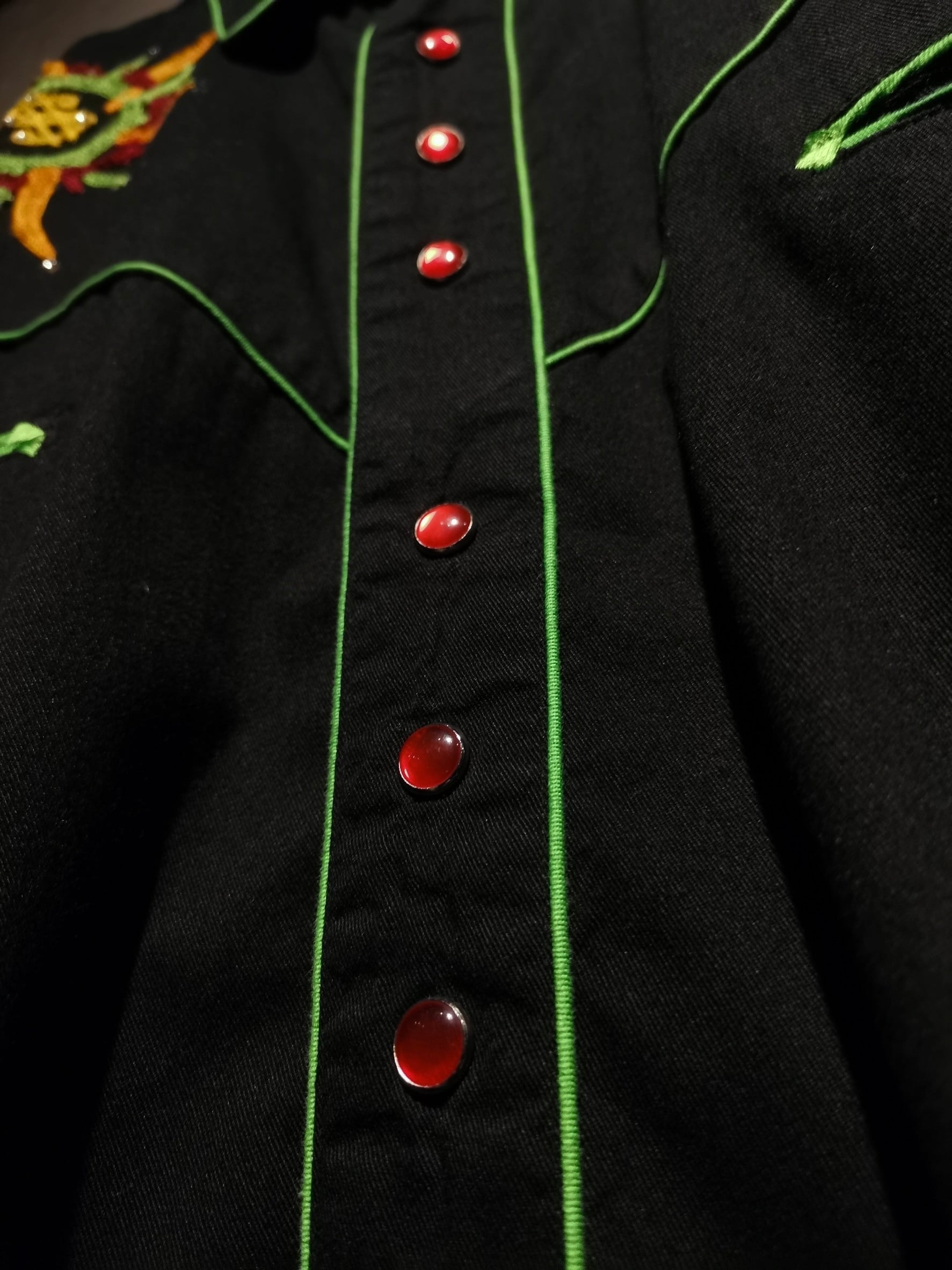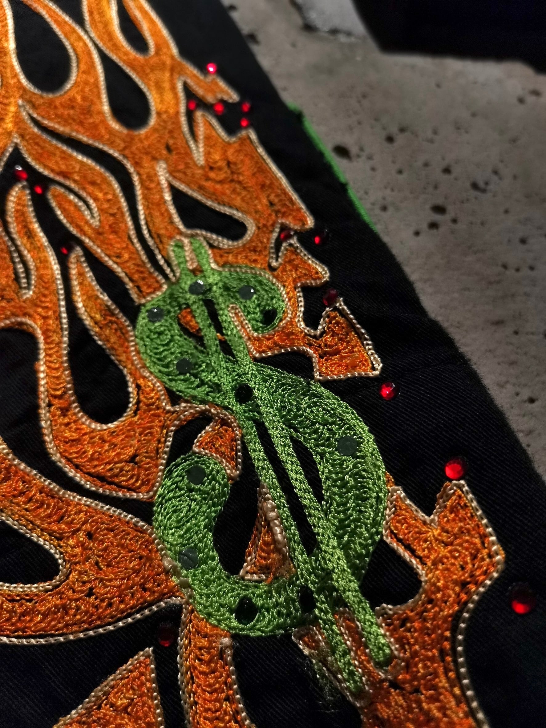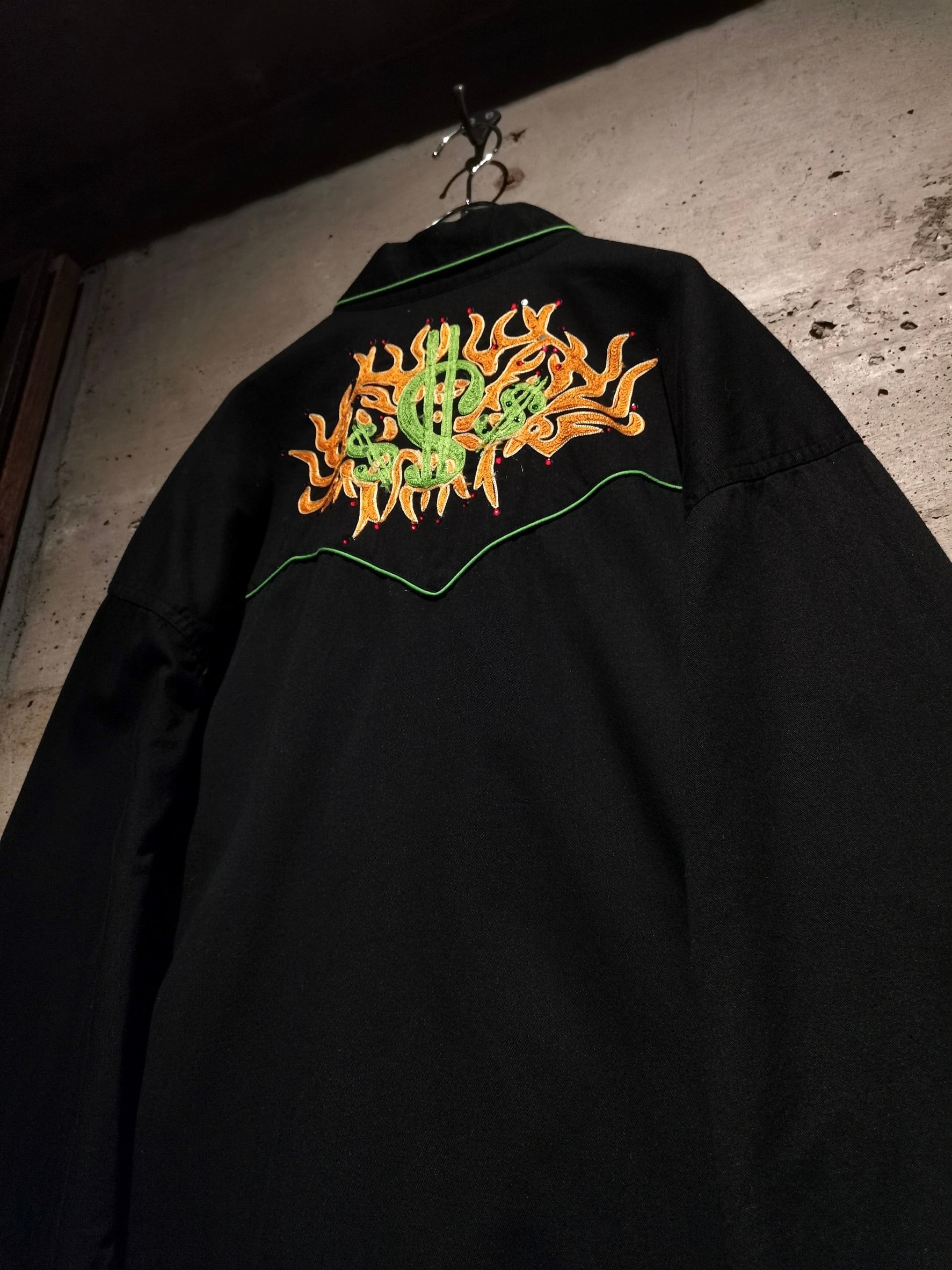 タフかつコシのあるブラックのコットンツイルのボディに、ドルマークやファイアーパターンを緻密な刺繍で刻んだ1着。