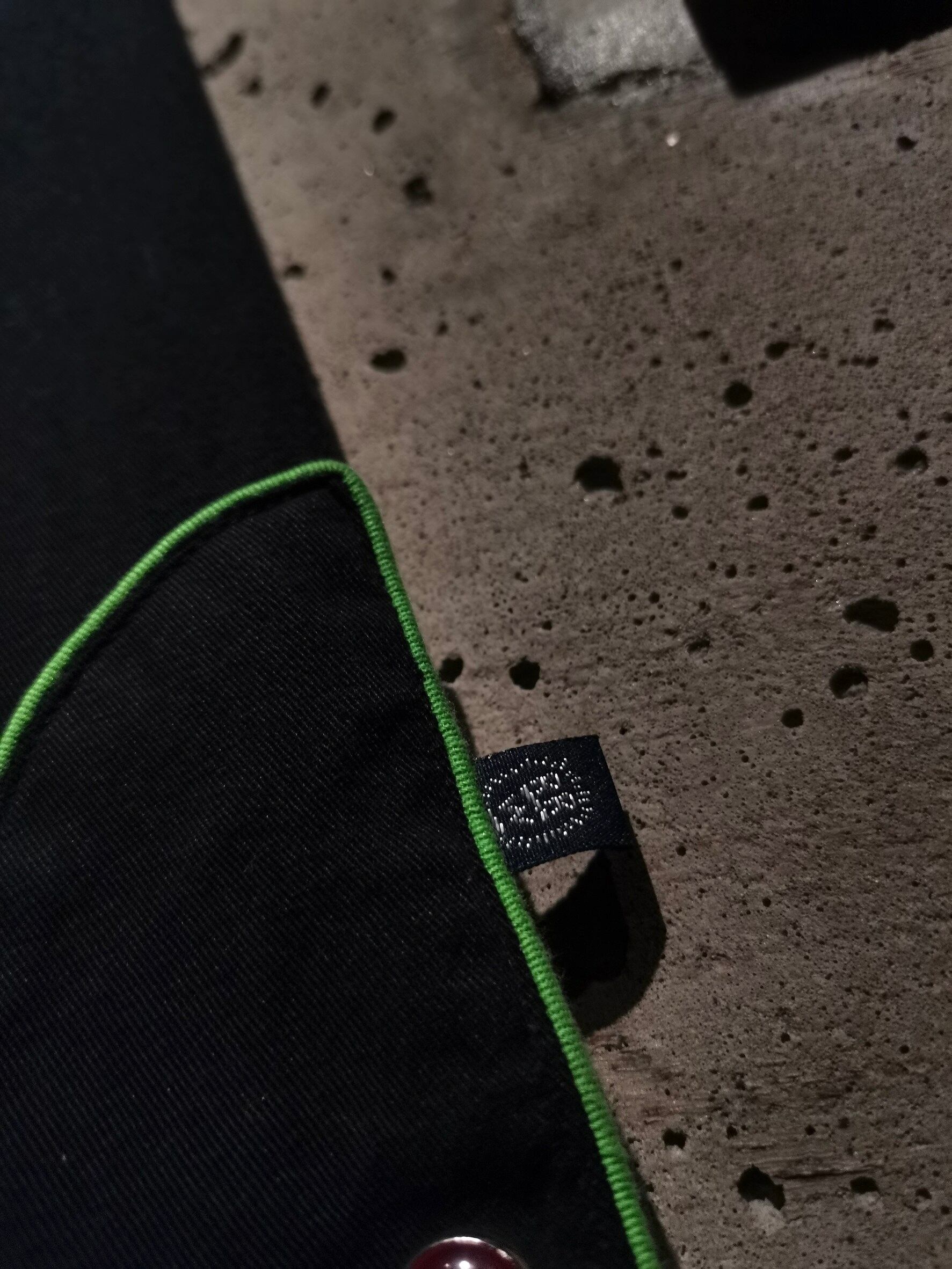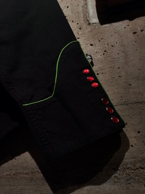 ブラックのボディに緑のパイピングのアクセントも良く、前たての赤色の3連ボタンも洒落てます。