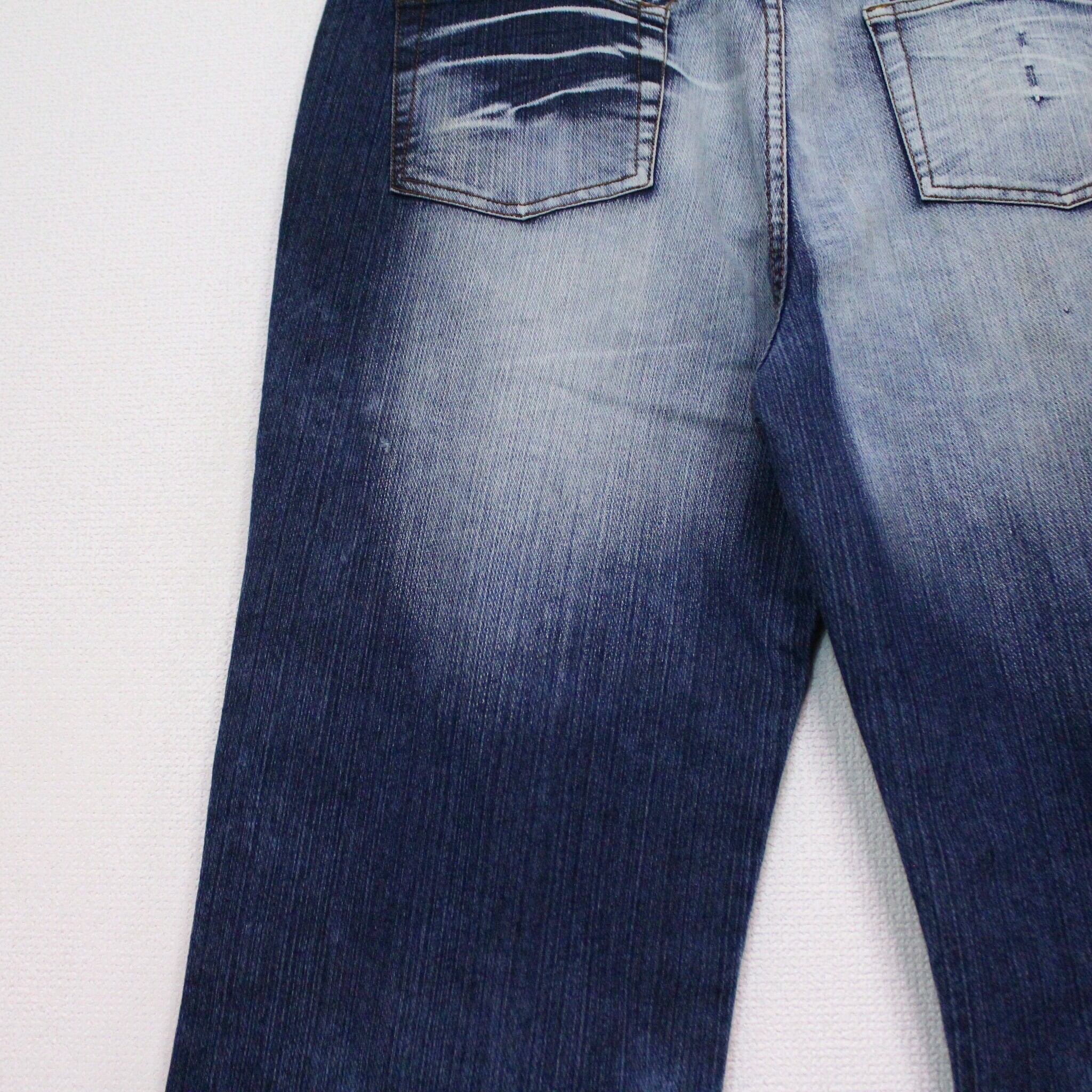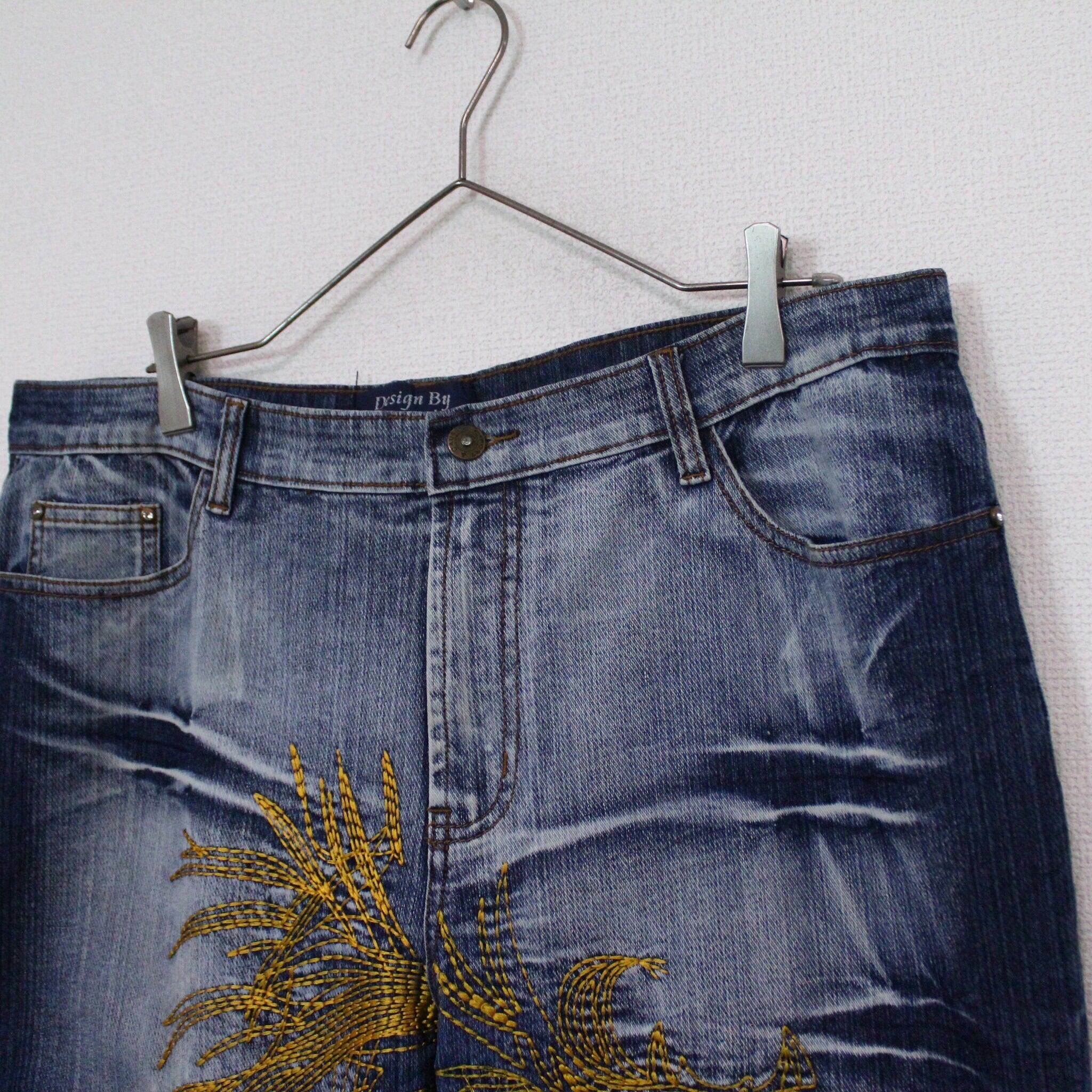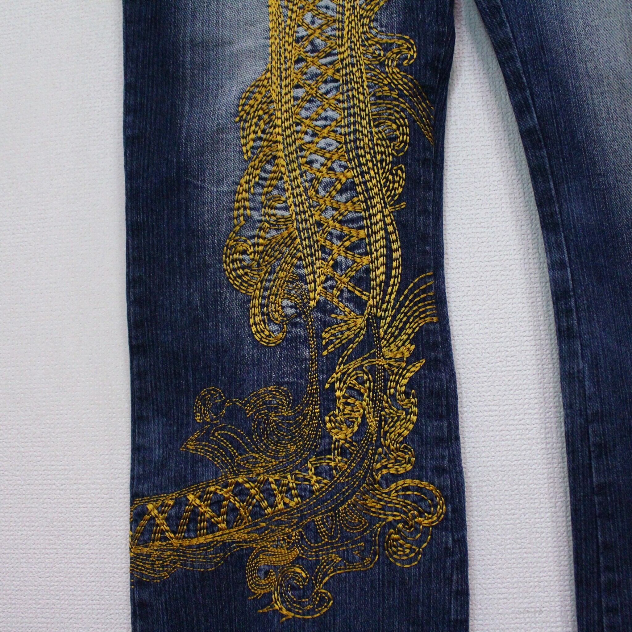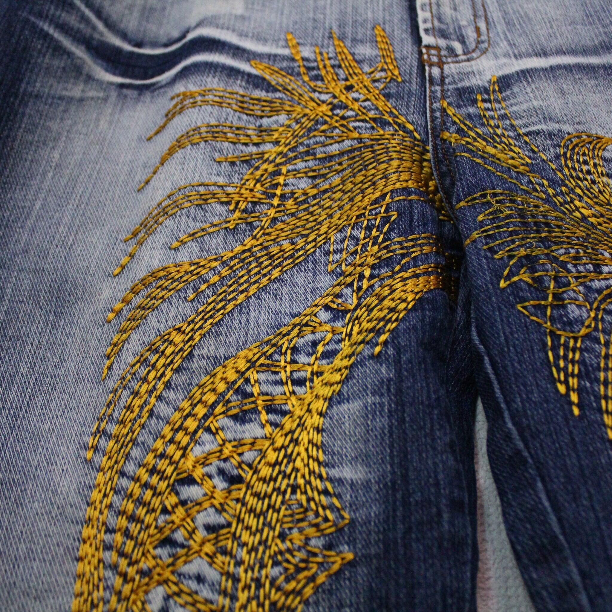 深みのある濃紺色をベースに、随所には色を落としたフェード加工、そしてフロントに大きく光沢のあるゴールドの糸で龍を緻密な刺繍によって施したフレアデニムパンツ。