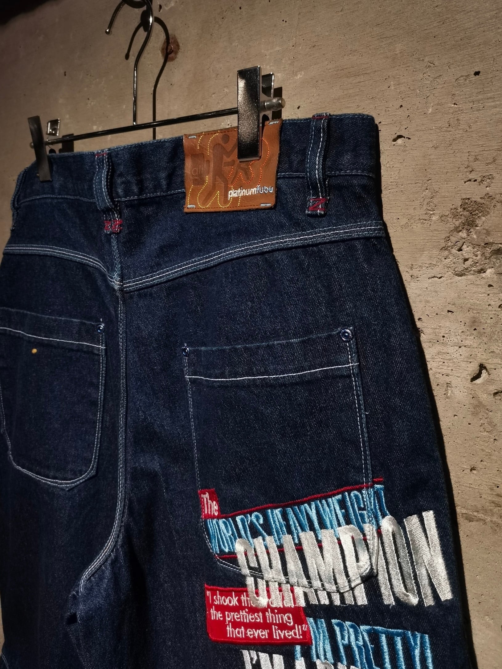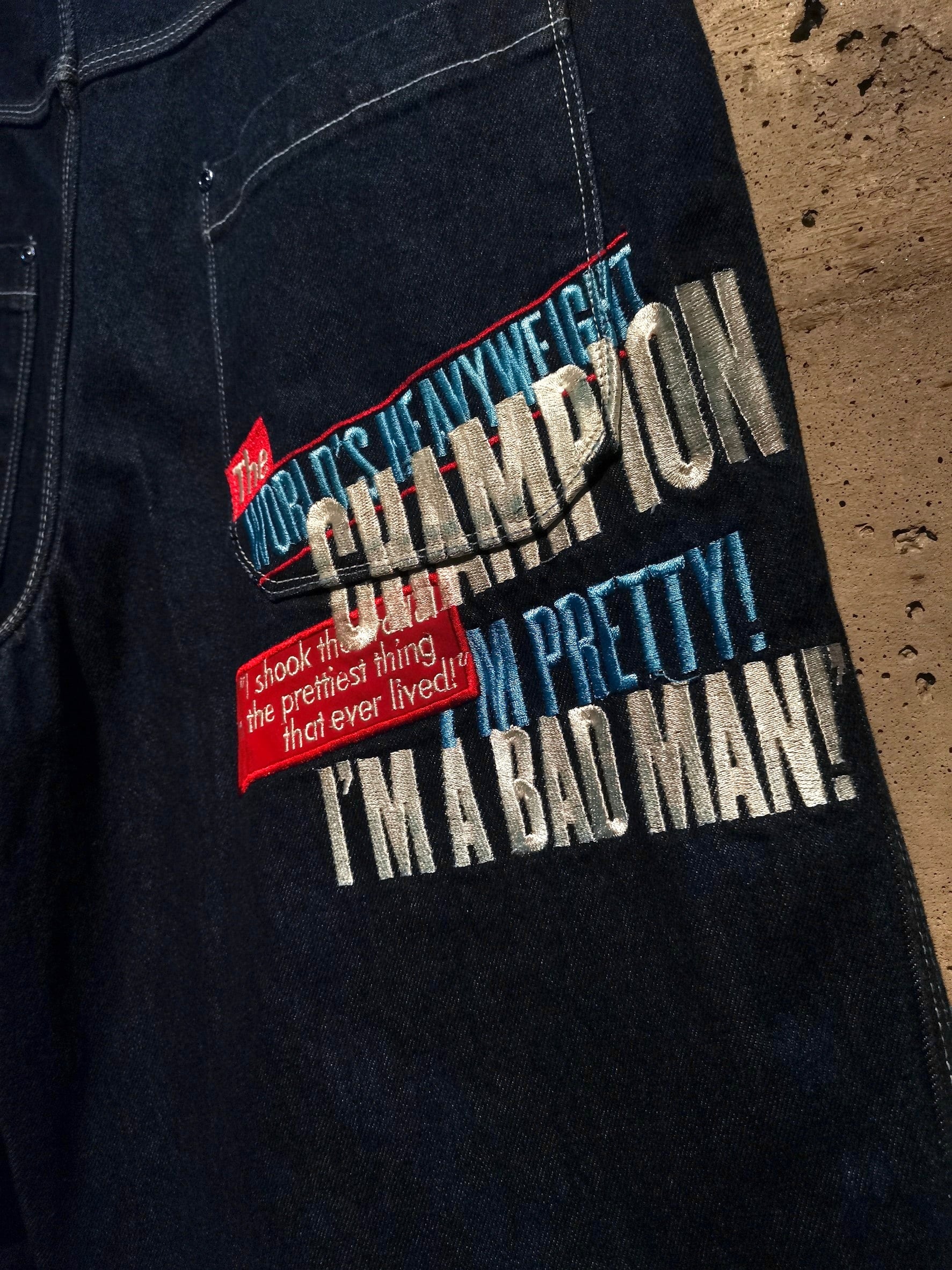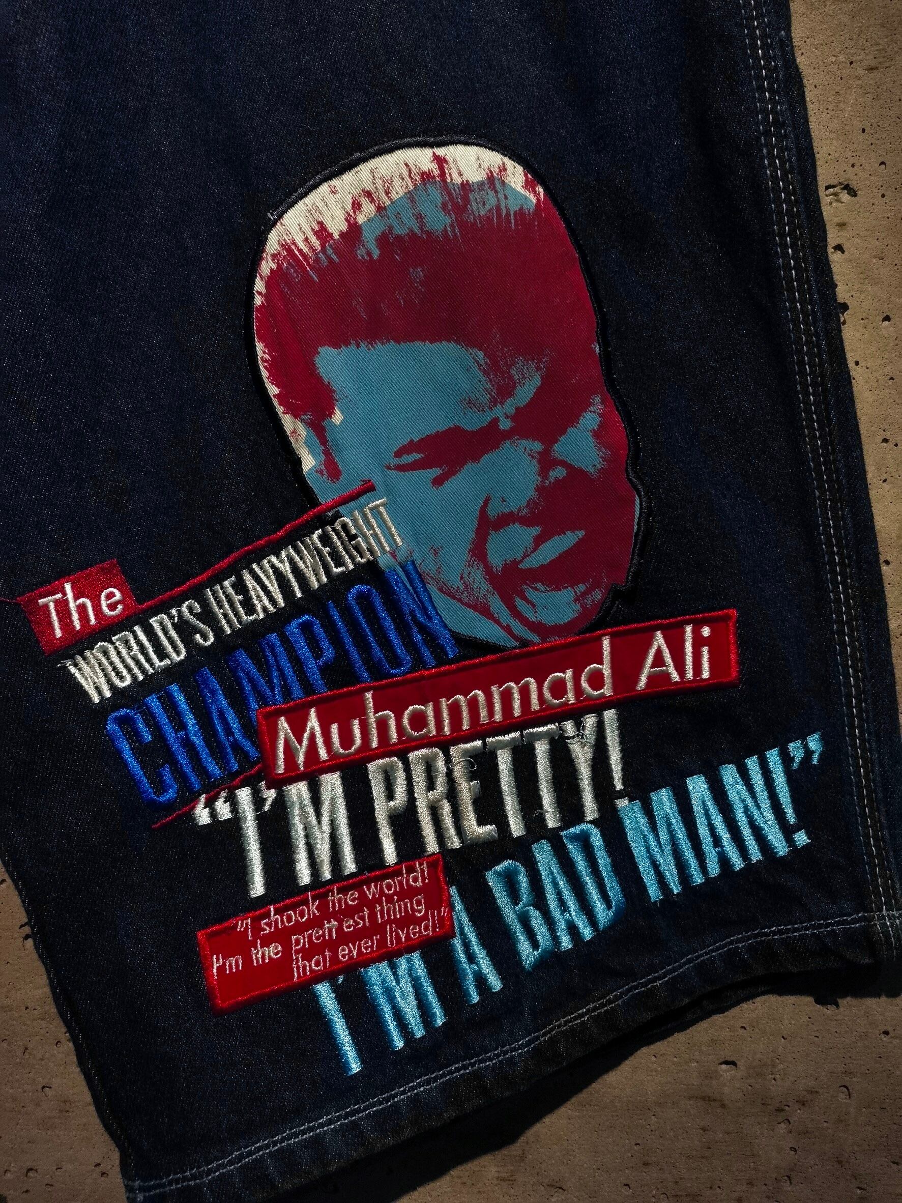 色残りがしっかりとあるインディゴブルーのボディに、フロント、背面にモハメド・アリのフェイスパッチ、彼らしい言葉を刺繍で刻んだ一本。