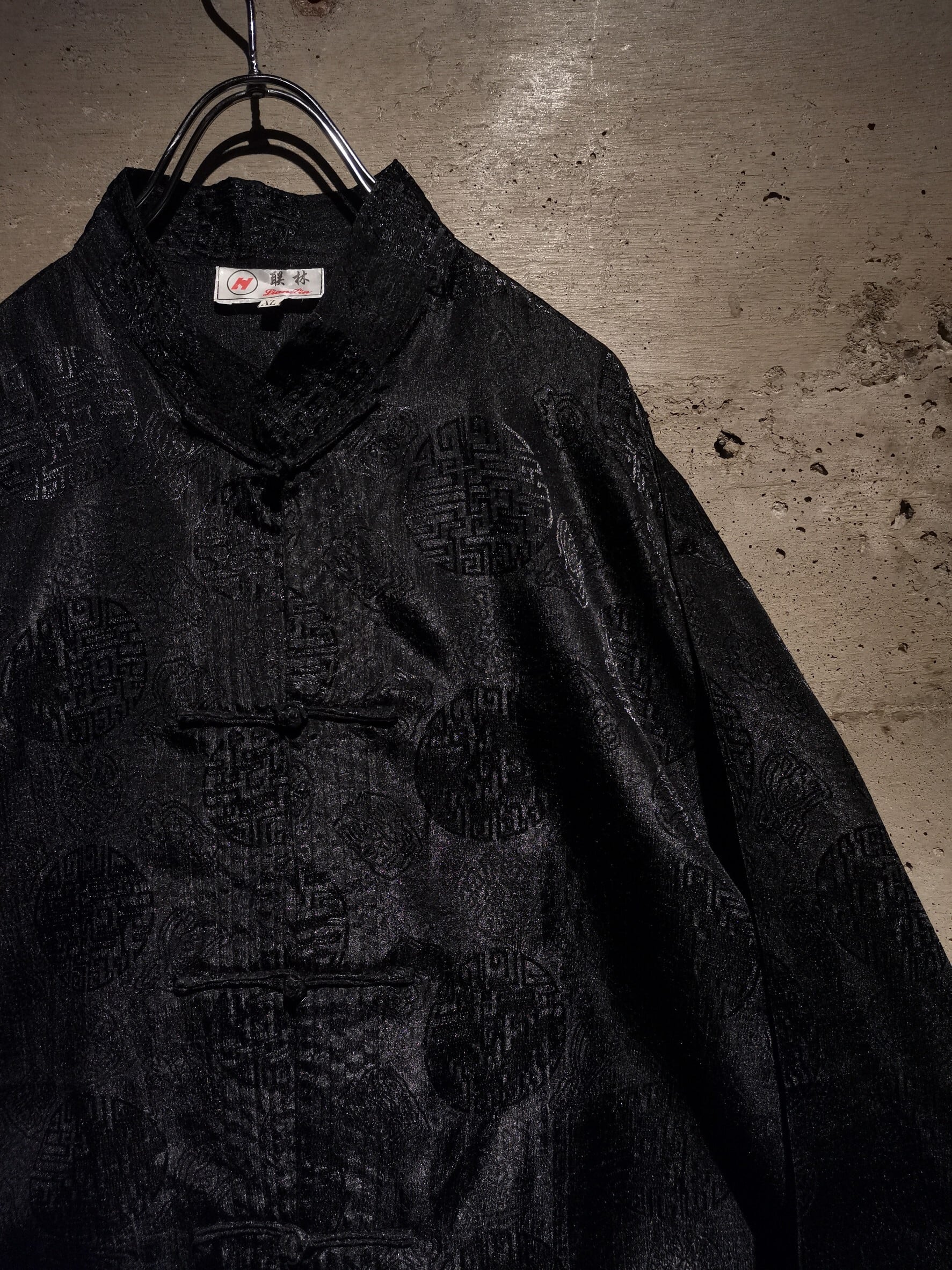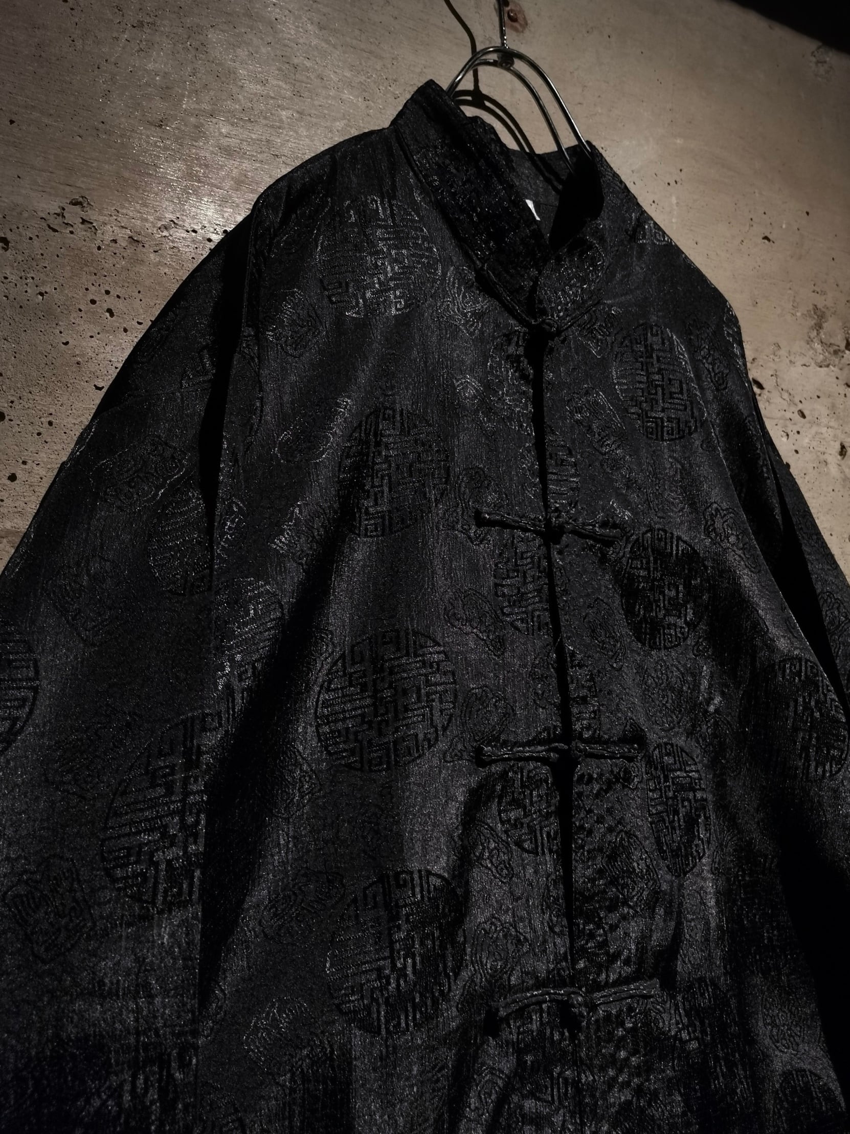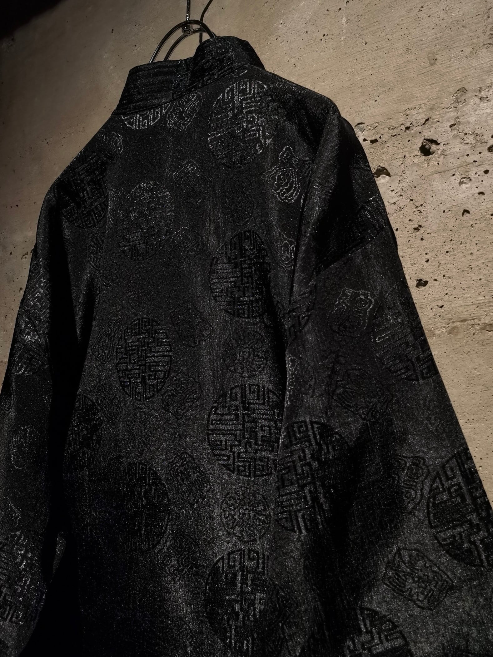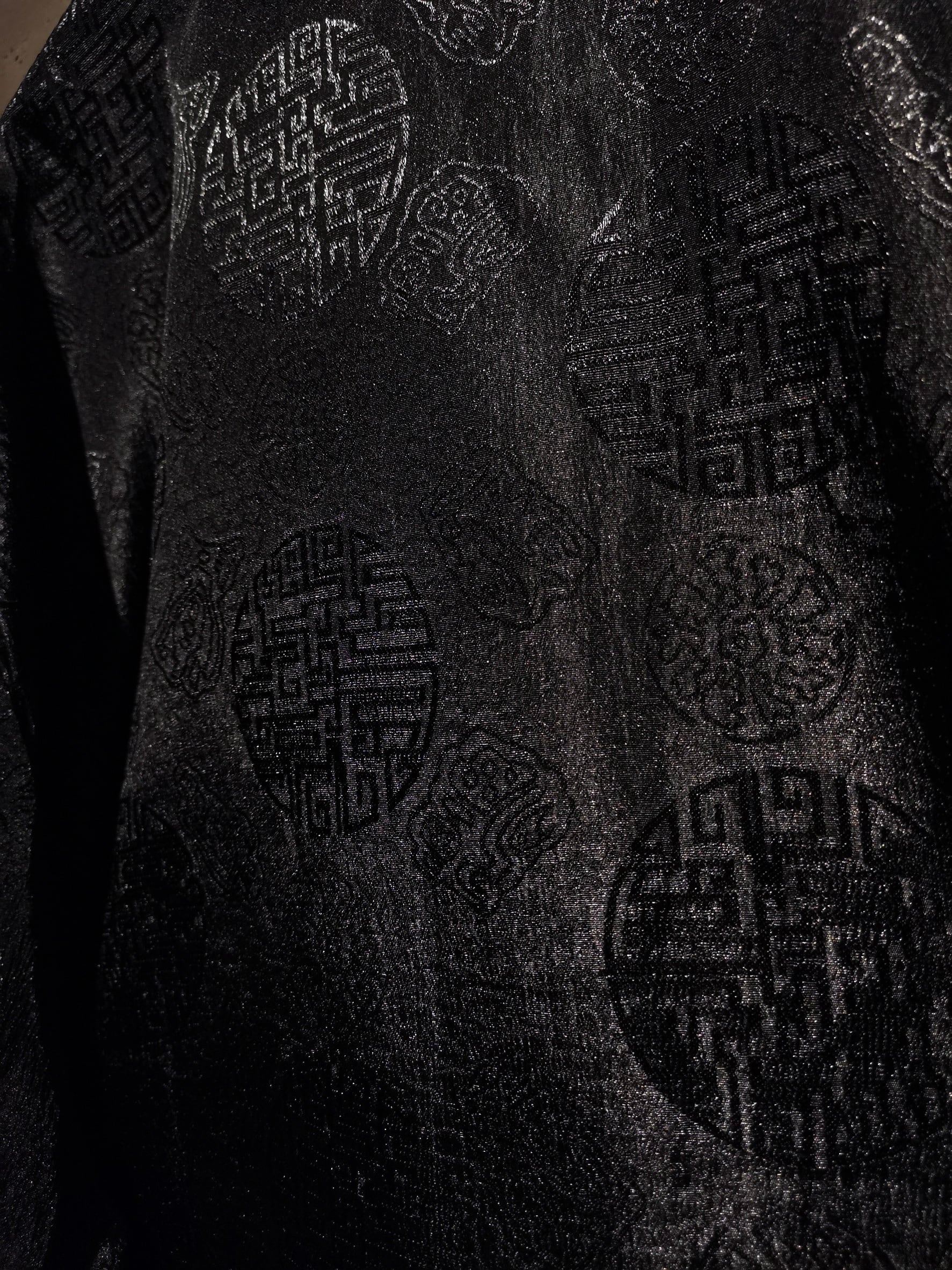 ブラックのカラーリングで、シャツ、パンツ共に上質な織りで中華紋様を織り込んだ逸品。光沢のある生地で、光の当たり加減で柄模様が浮き出て見え、雰囲気をムンムンに放ちます。