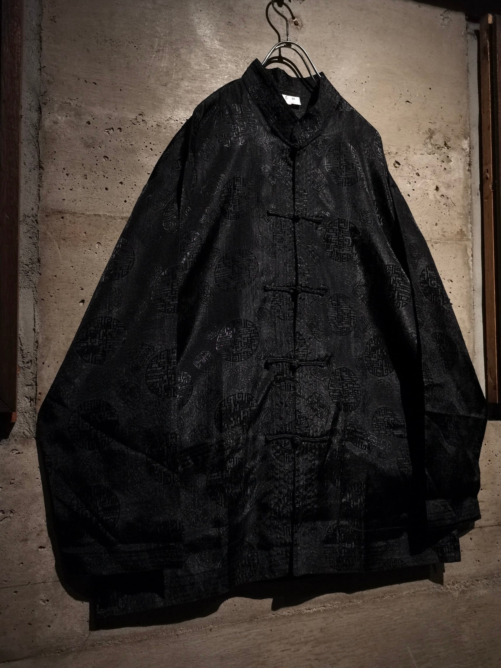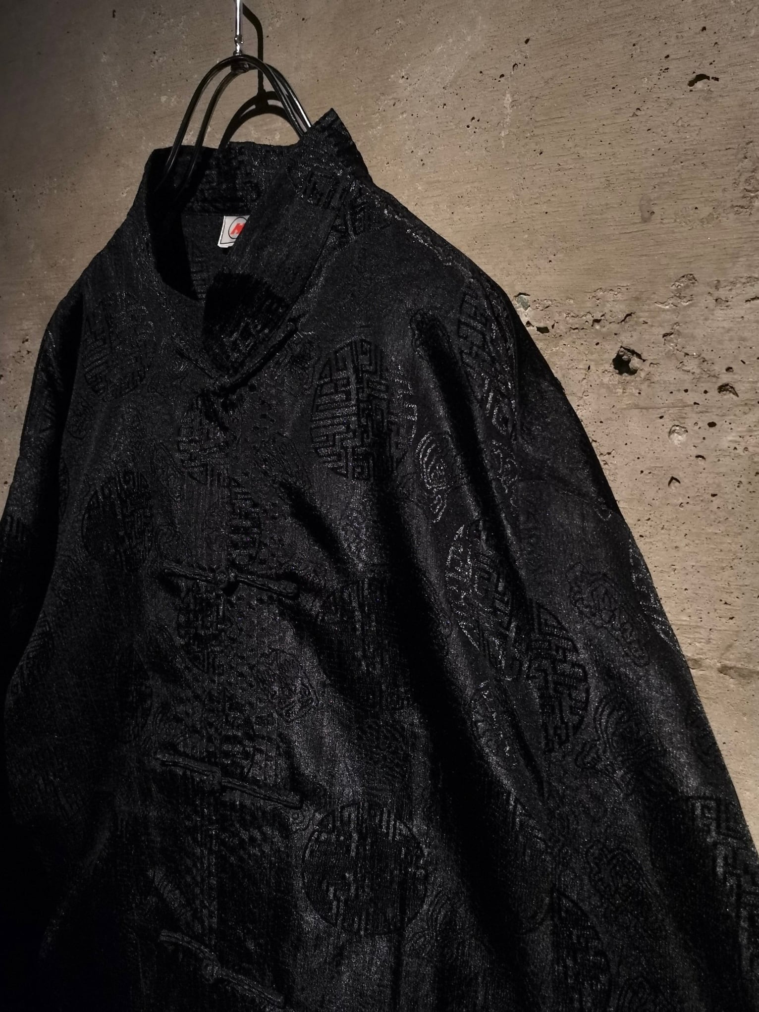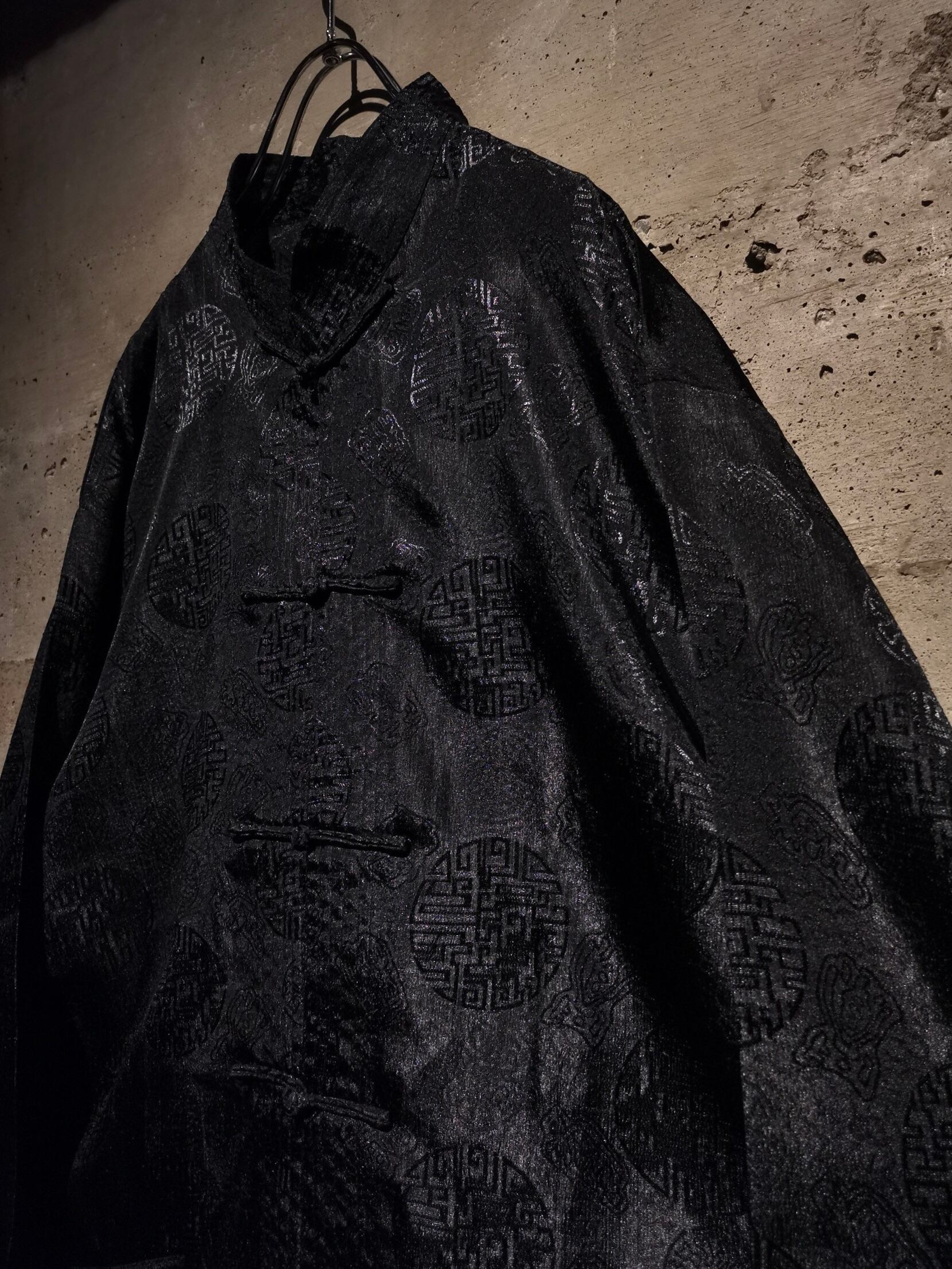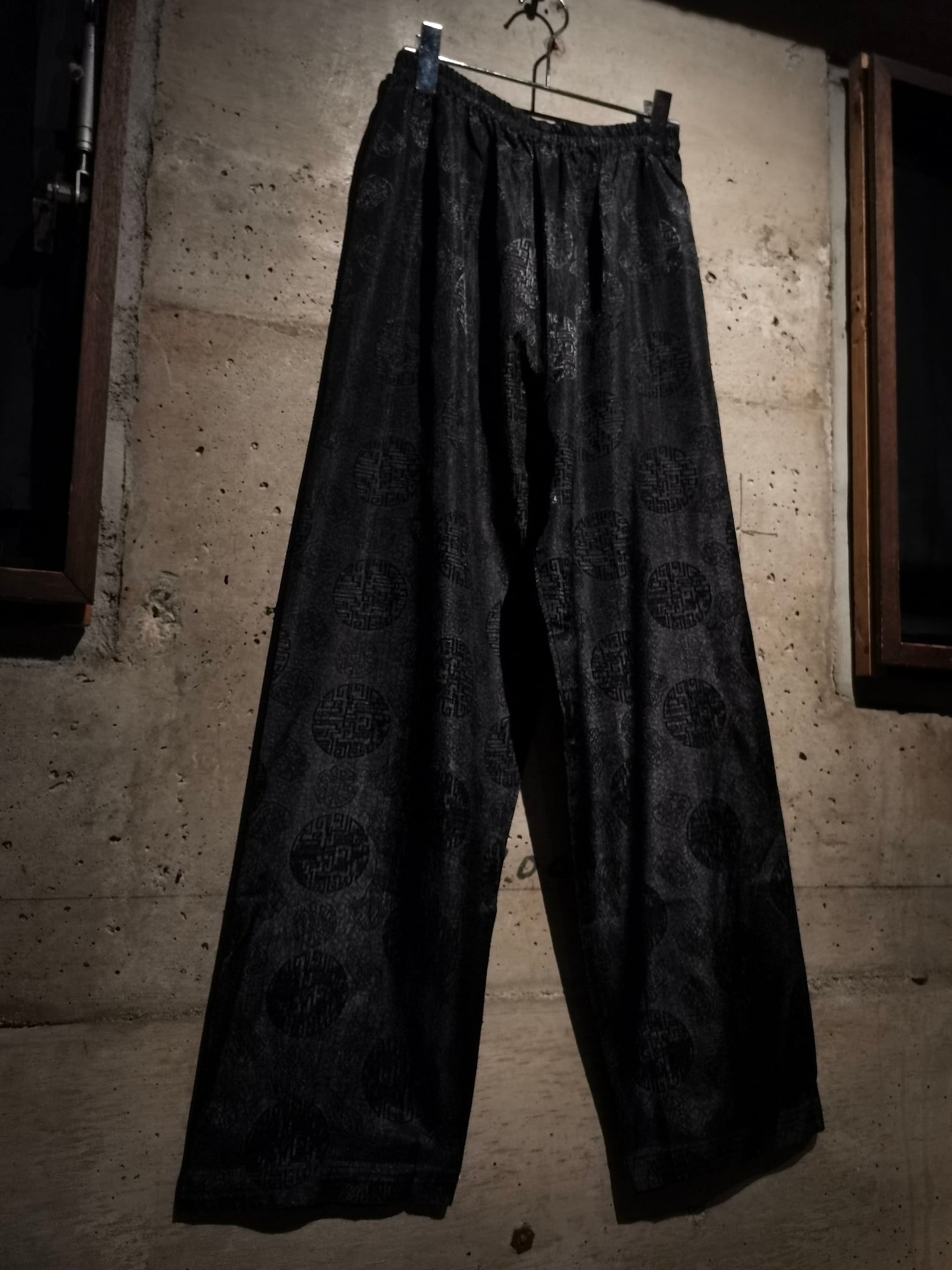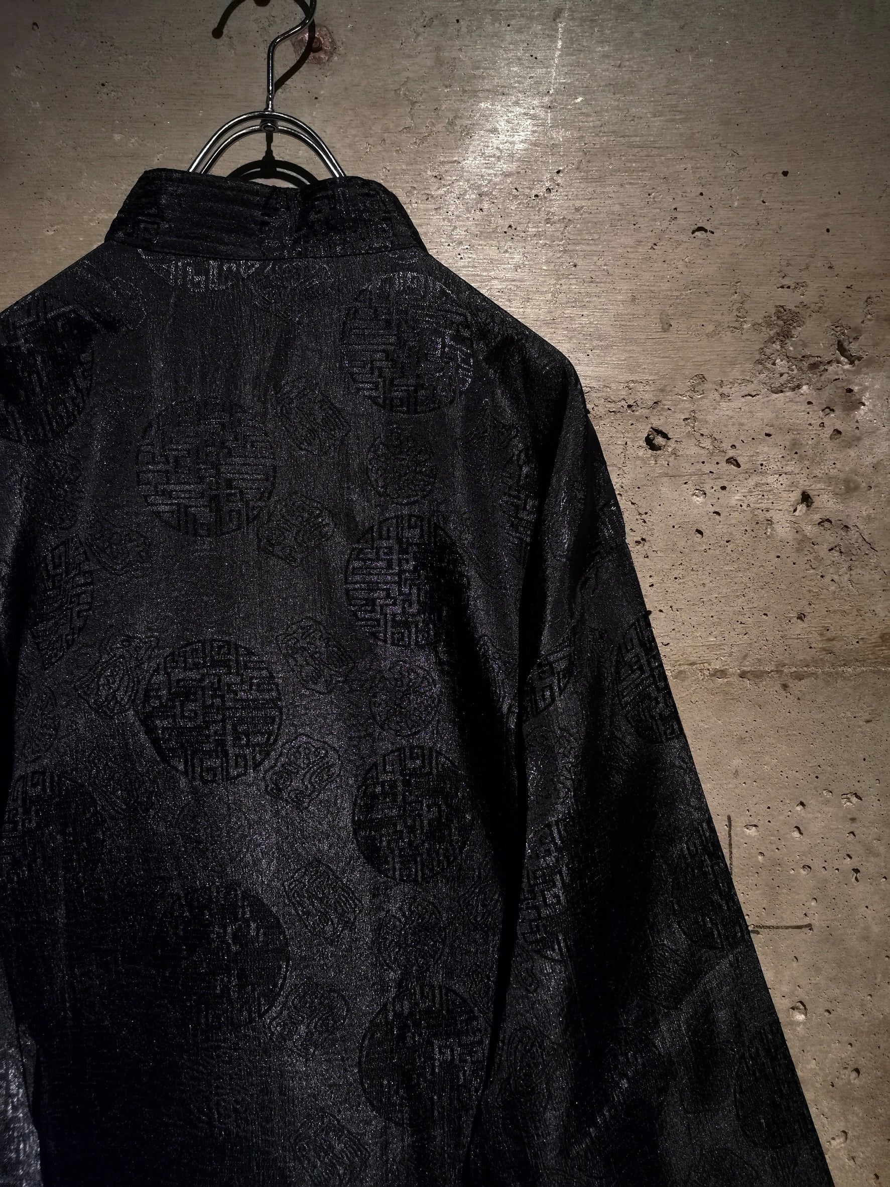 ブラックのカラーリングで、シャツ、パンツ共に上質な織りで中華紋様を織り込んだ逸品。光沢のある生地で、光の当たり加減で柄模様が浮き出て見え、雰囲気をムンムンに放ちます。