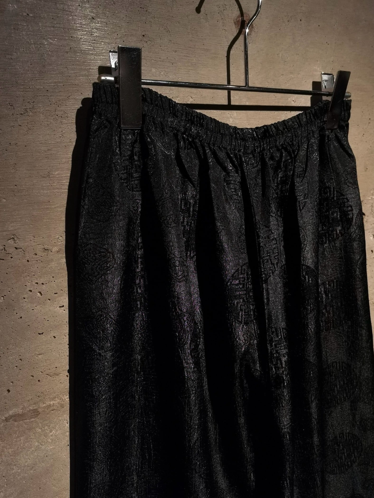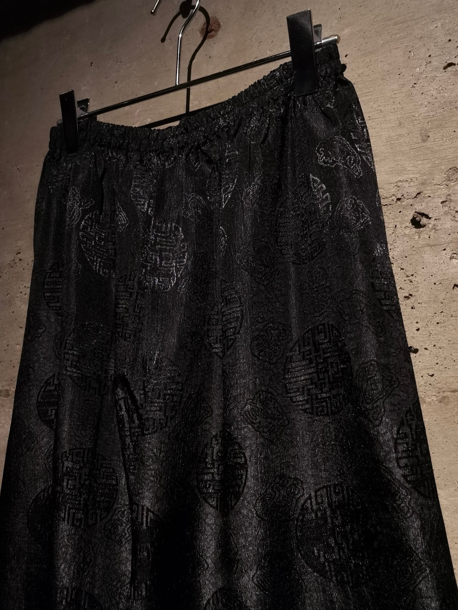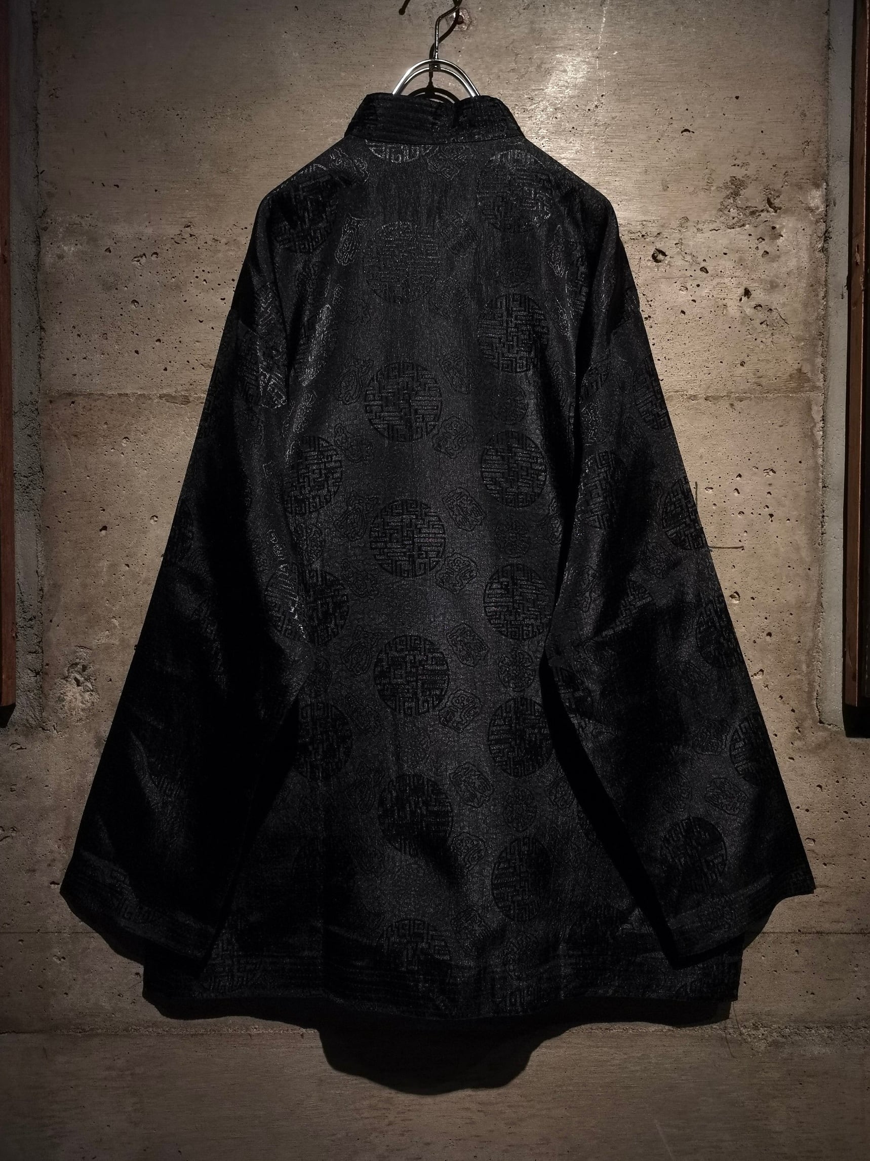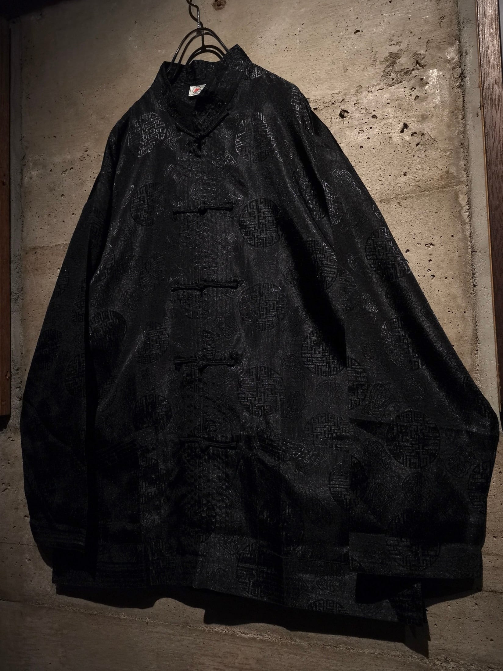 ブラックのカラーリングで、シャツ、パンツ共に上質な織りで中華紋様を織り込んだ逸品。光沢のある生地で、光の当たり加減で柄模様が浮き出て見え、雰囲気をムンムンに放ちます。