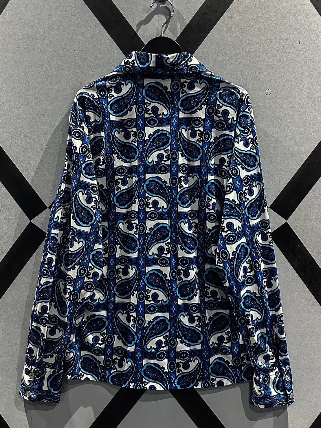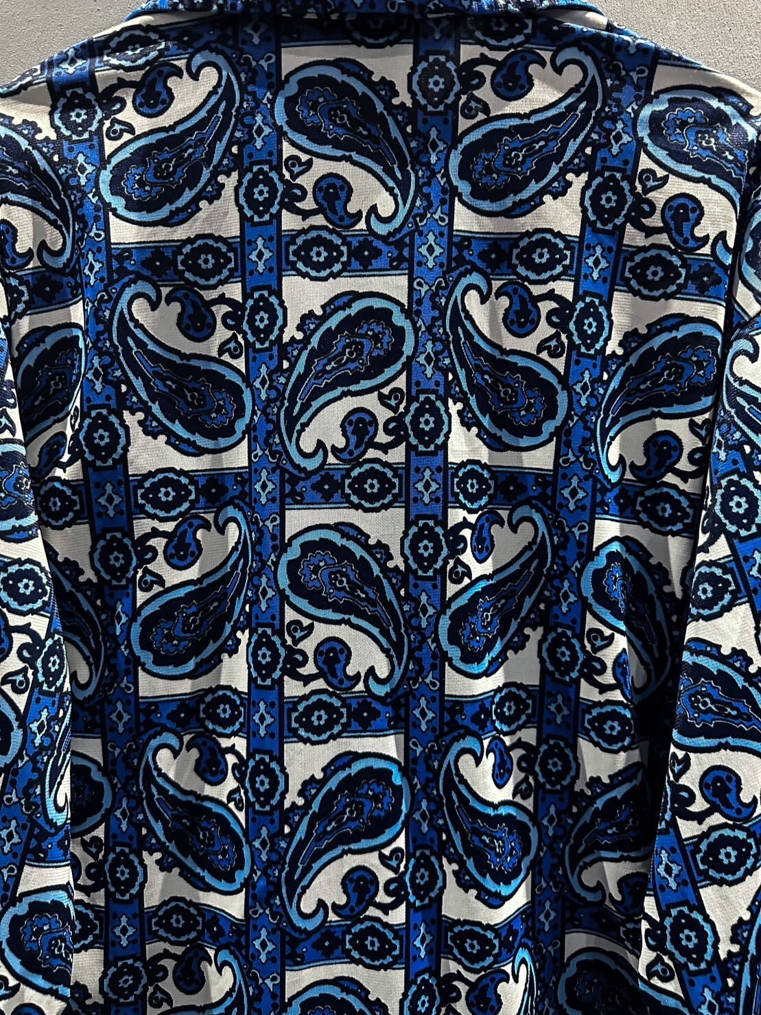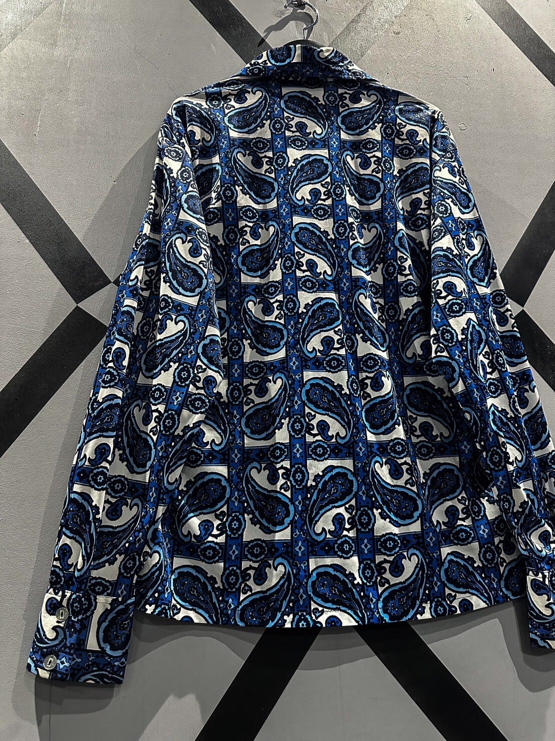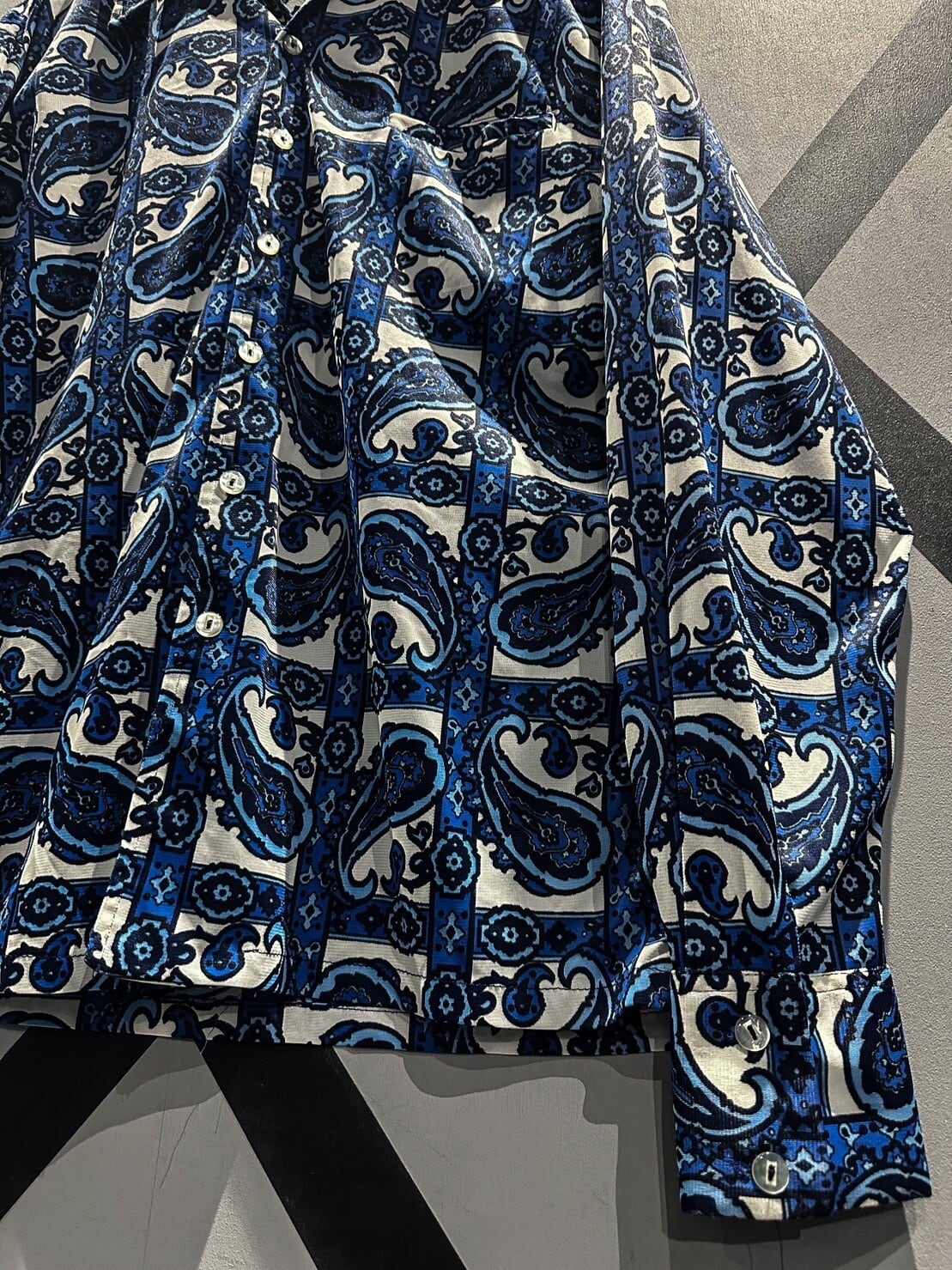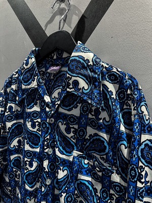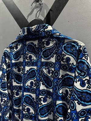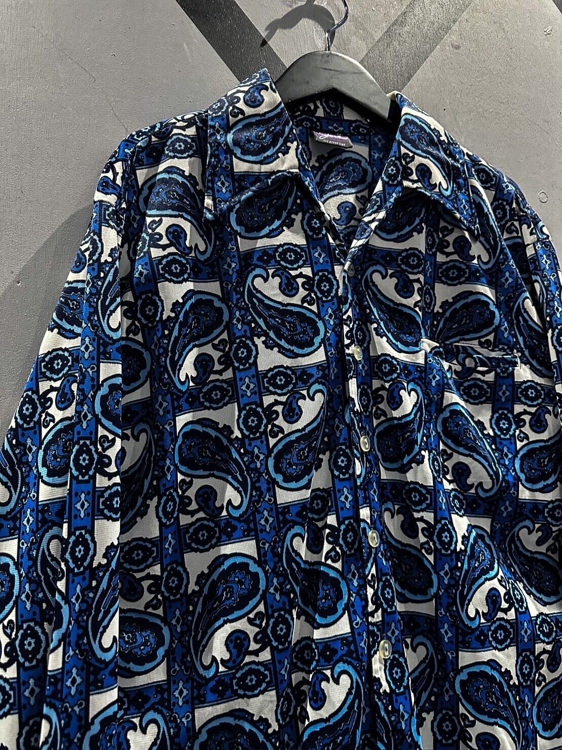 伸縮性のある、サラッと肌触りの良い素材をベースに、青×白の爽やかなカラーリングでペイズリー柄を載せた70'sの長袖シャツ。