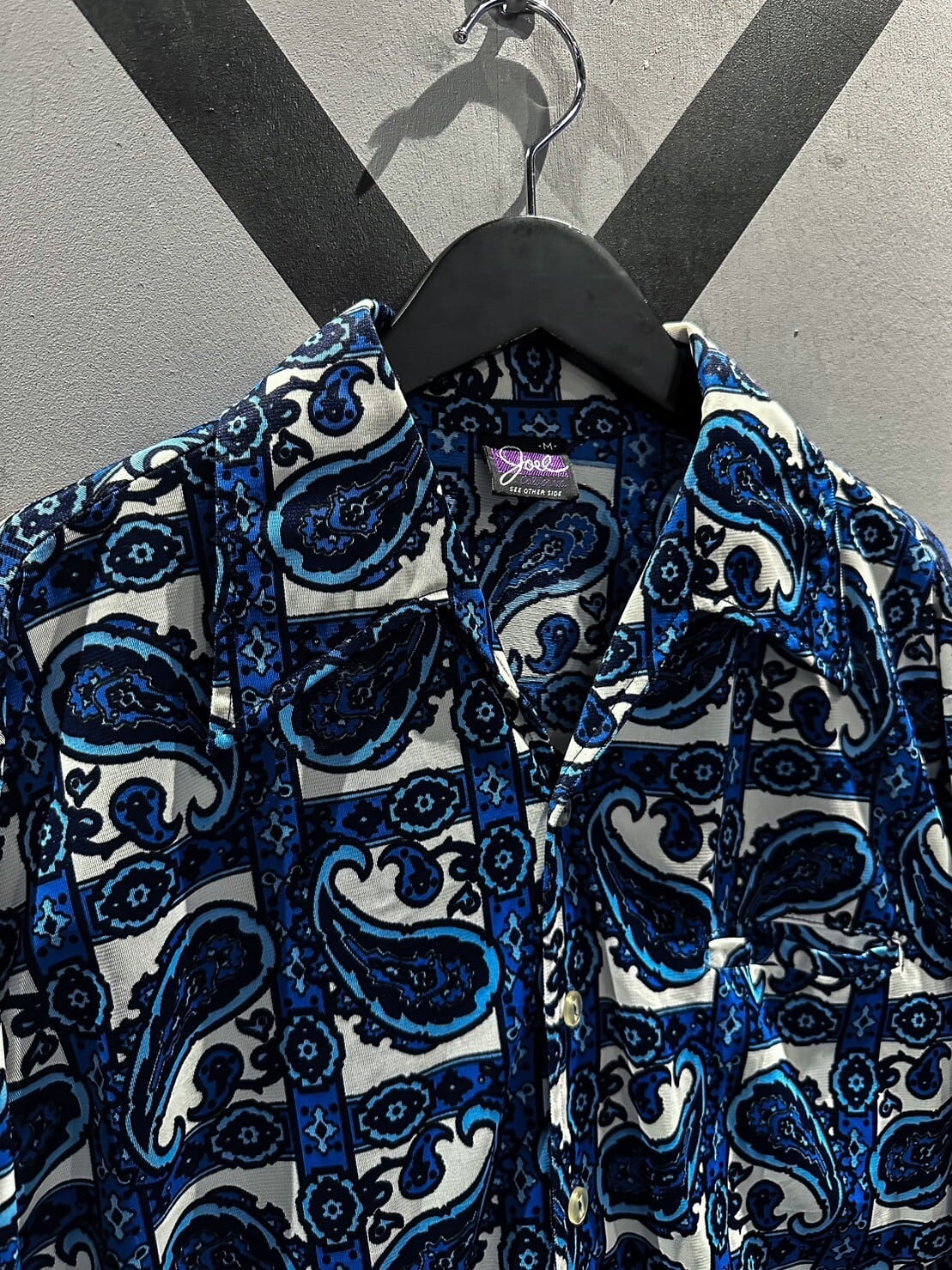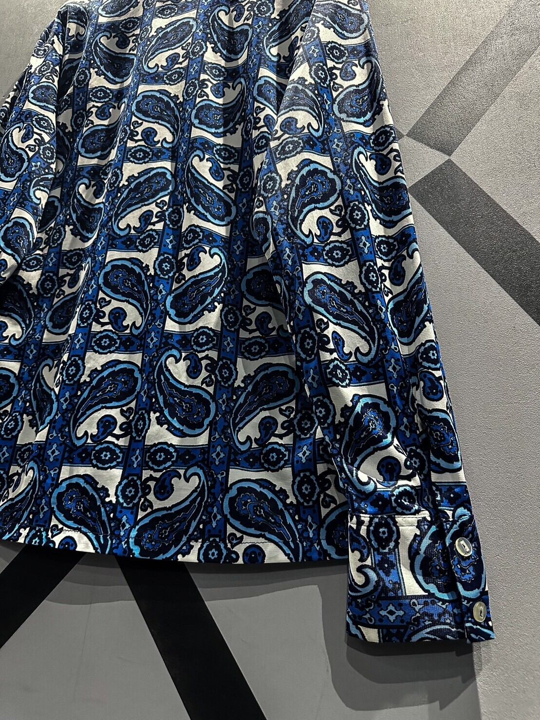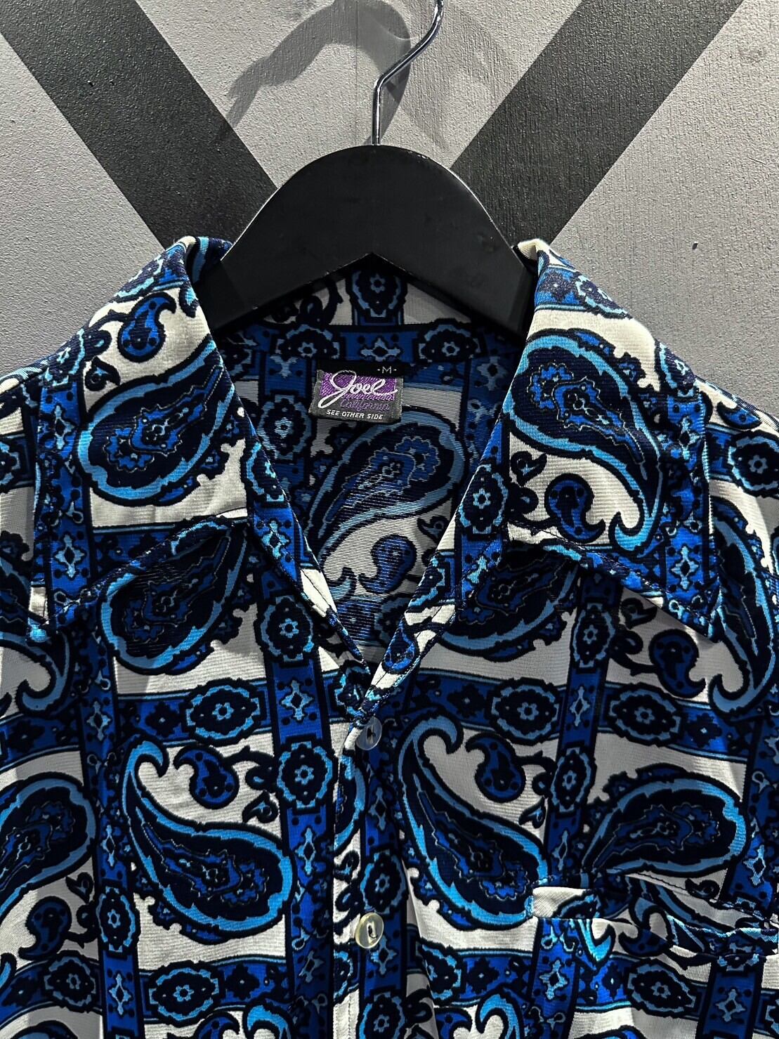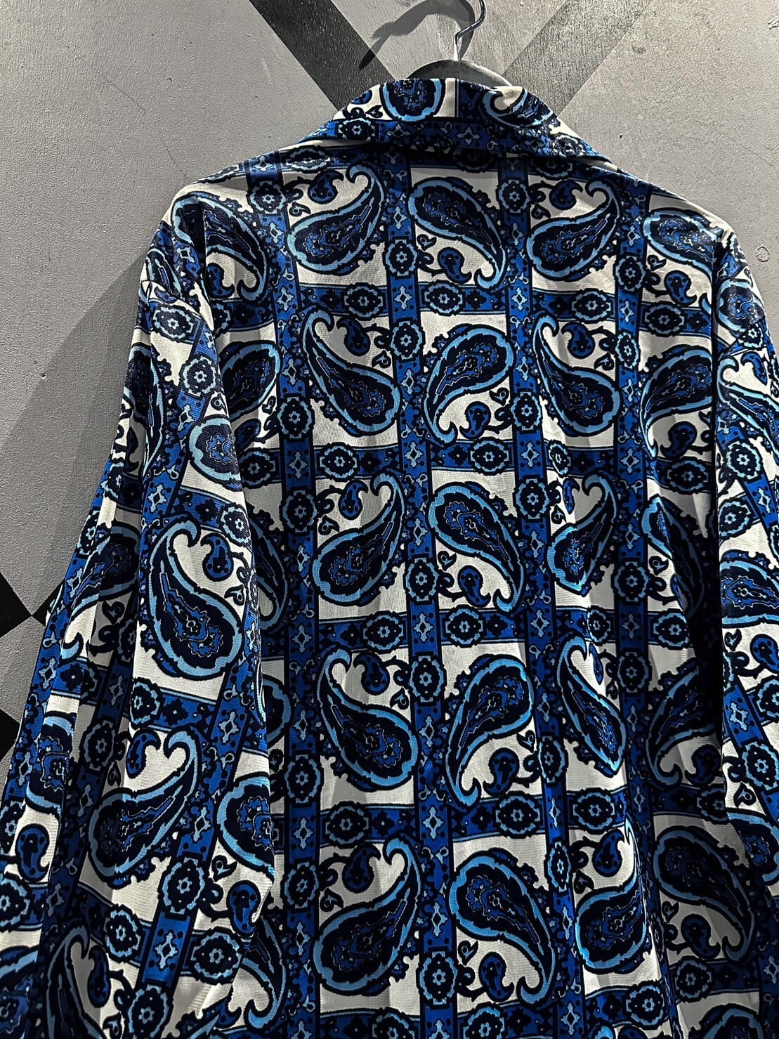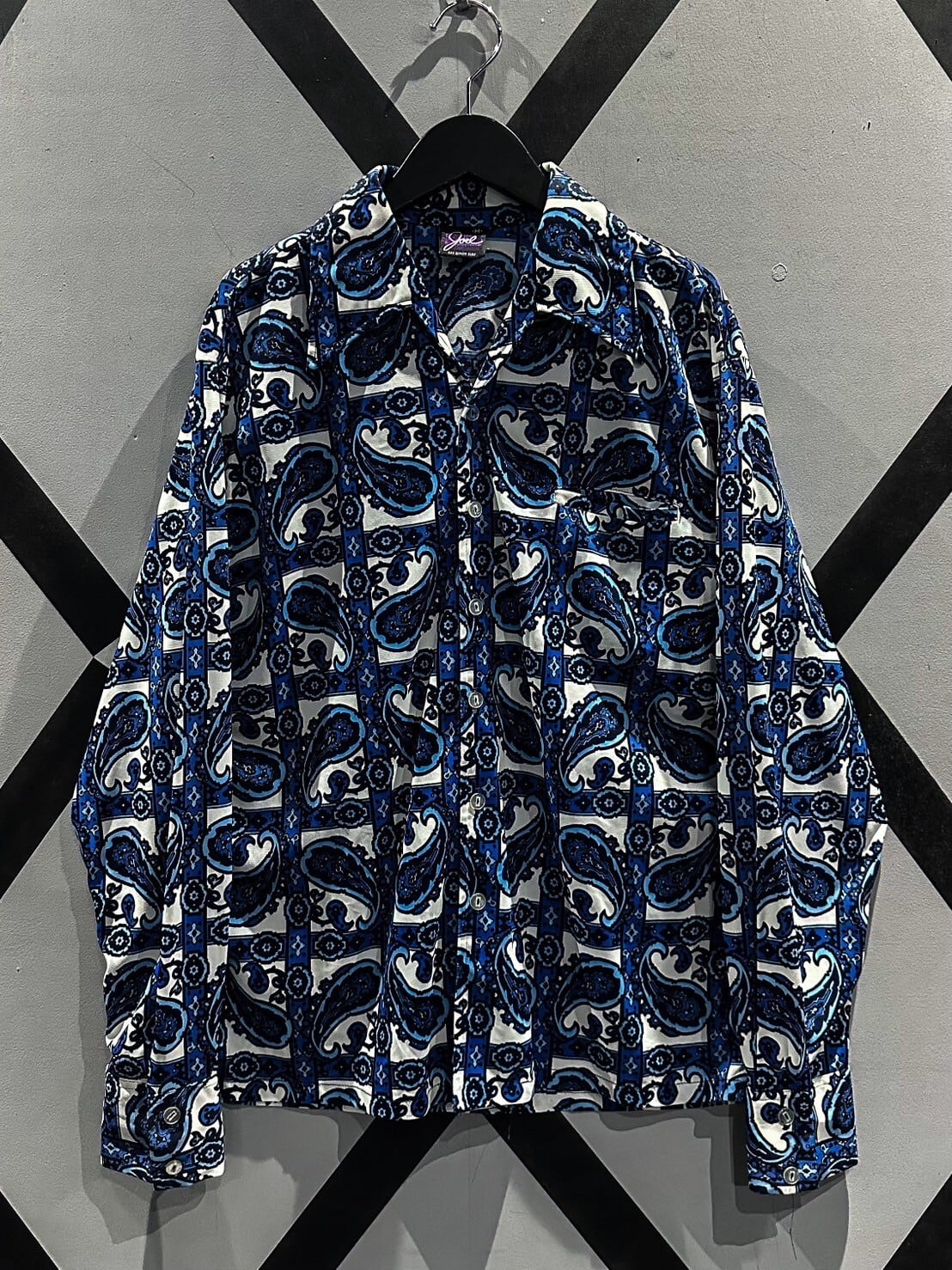 伸縮性のある、サラッと肌触りの良い素材をベースに、青×白の爽やかなカラーリングでペイズリー柄を載せた70'sの長袖シャツ。