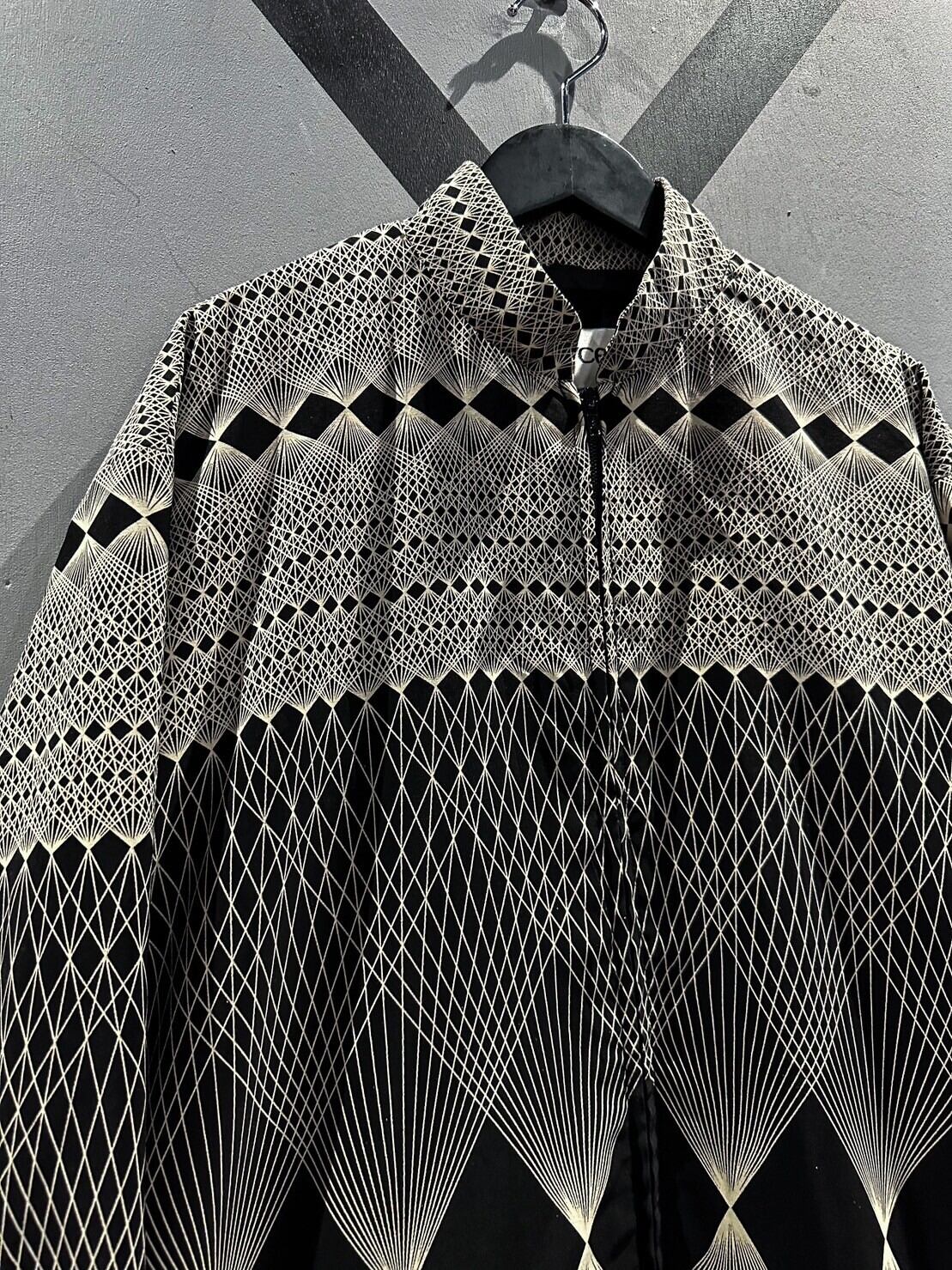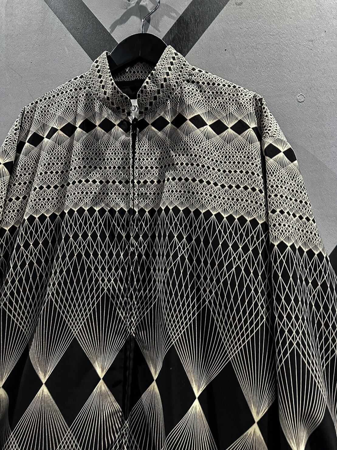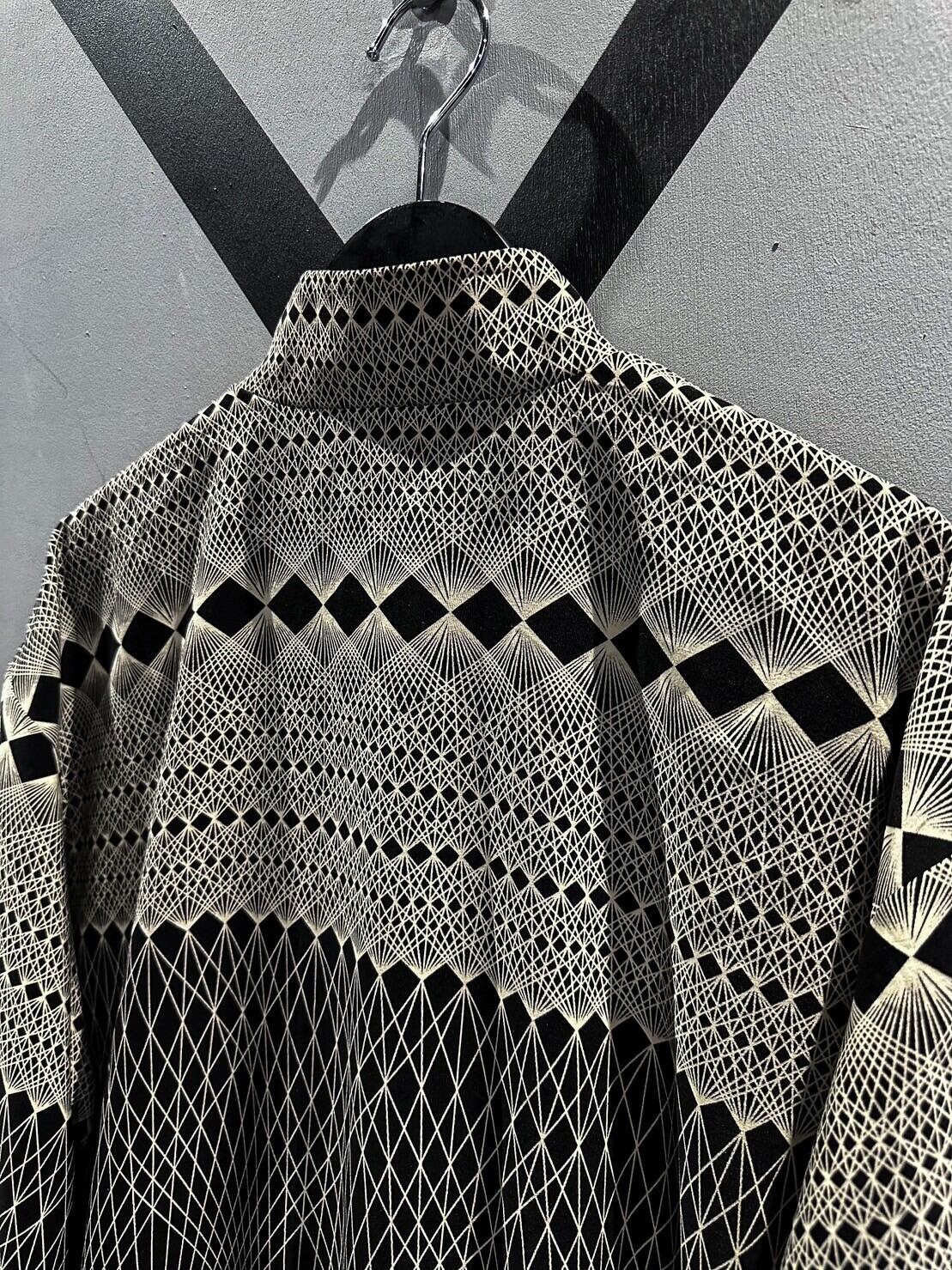柔らかくサラッとした上質なポリエステル素材、上品なブラックカラーをベースに、ベージュカラーの太さの違うラインでダイヤモンド柄を配した長袖シャツ。