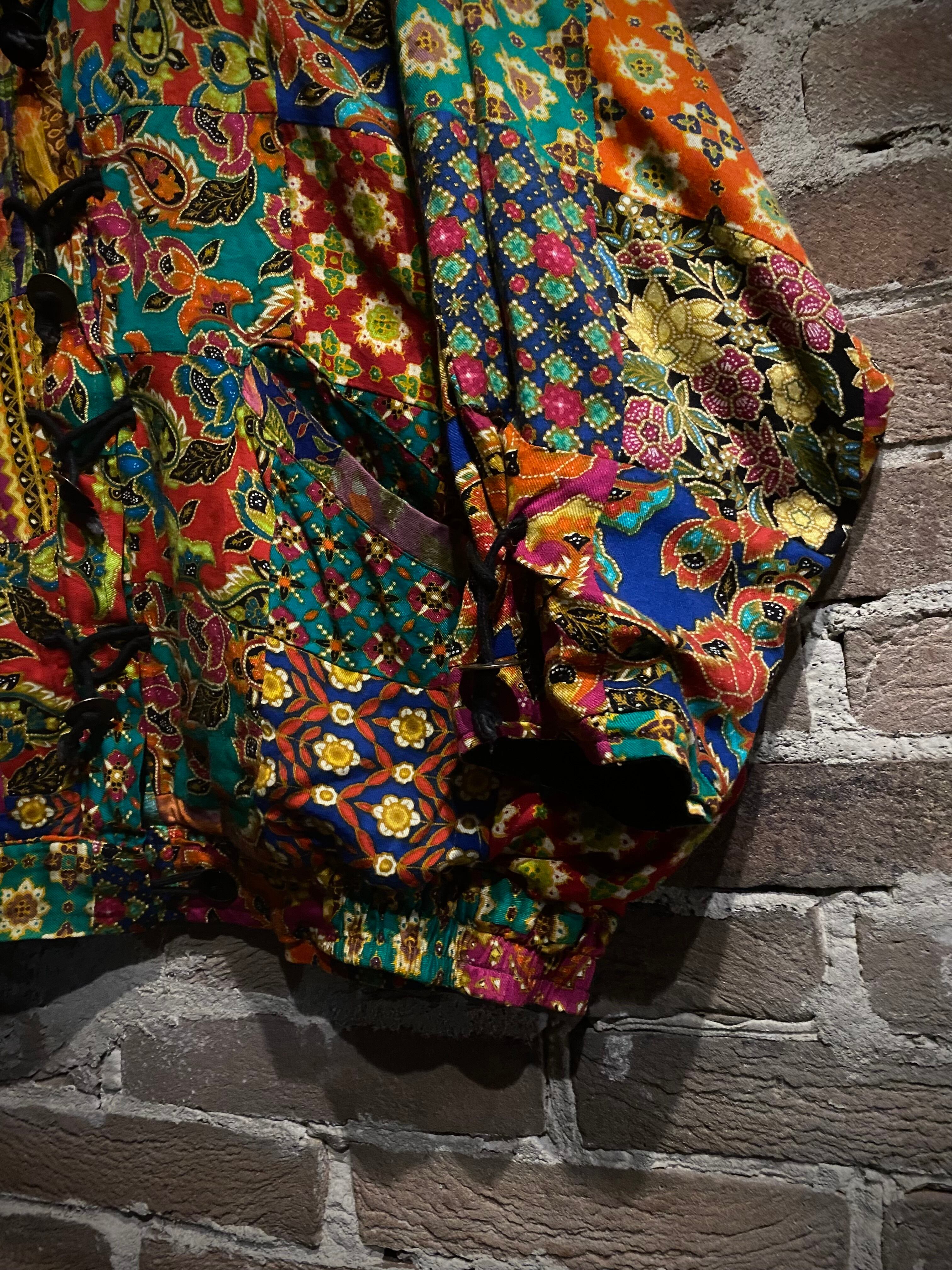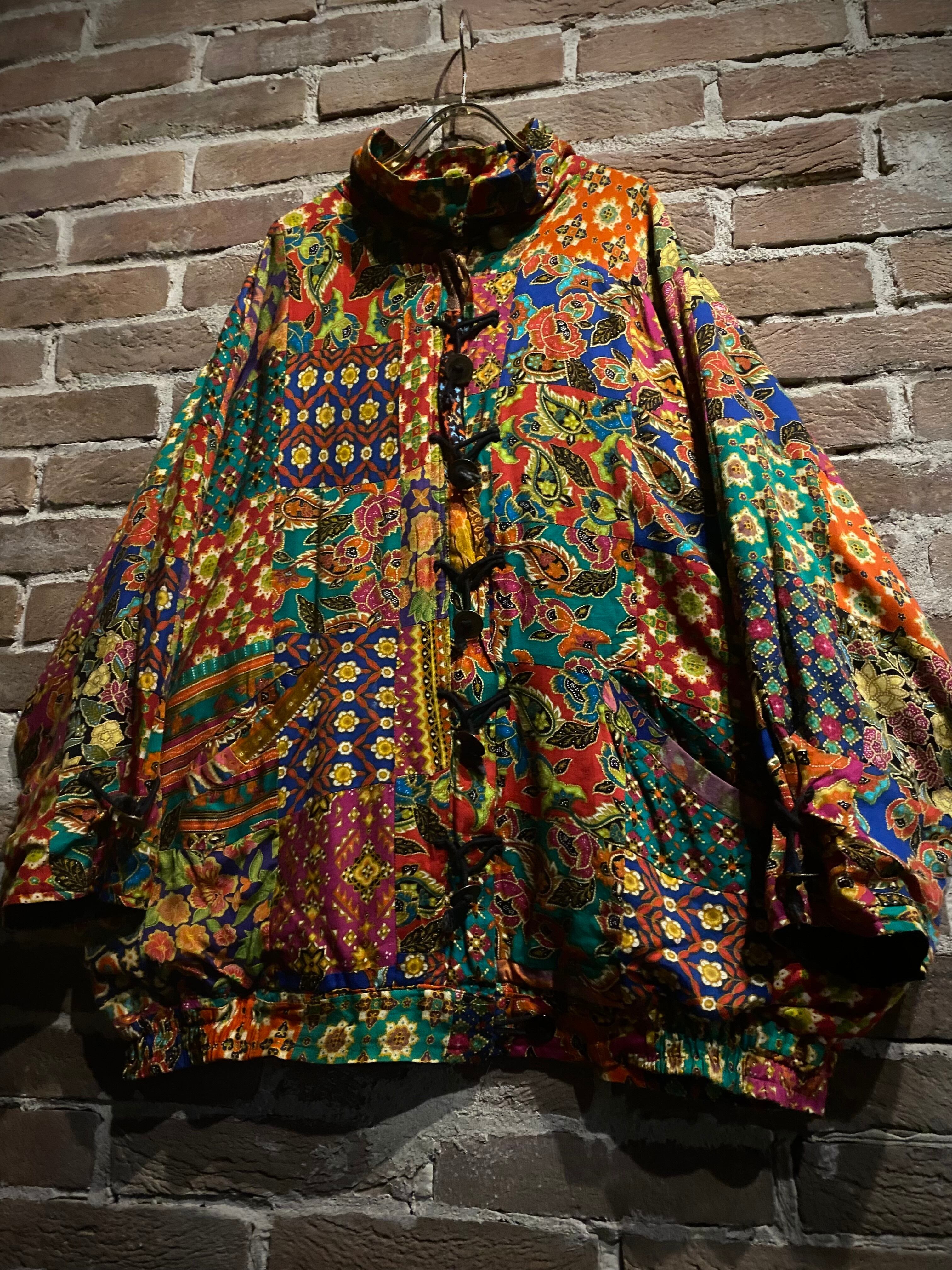 ハリ、トロみのあるレーヨン素材をベースにサイケデリックな花柄、ペイズリー柄を載せたジャケット。
