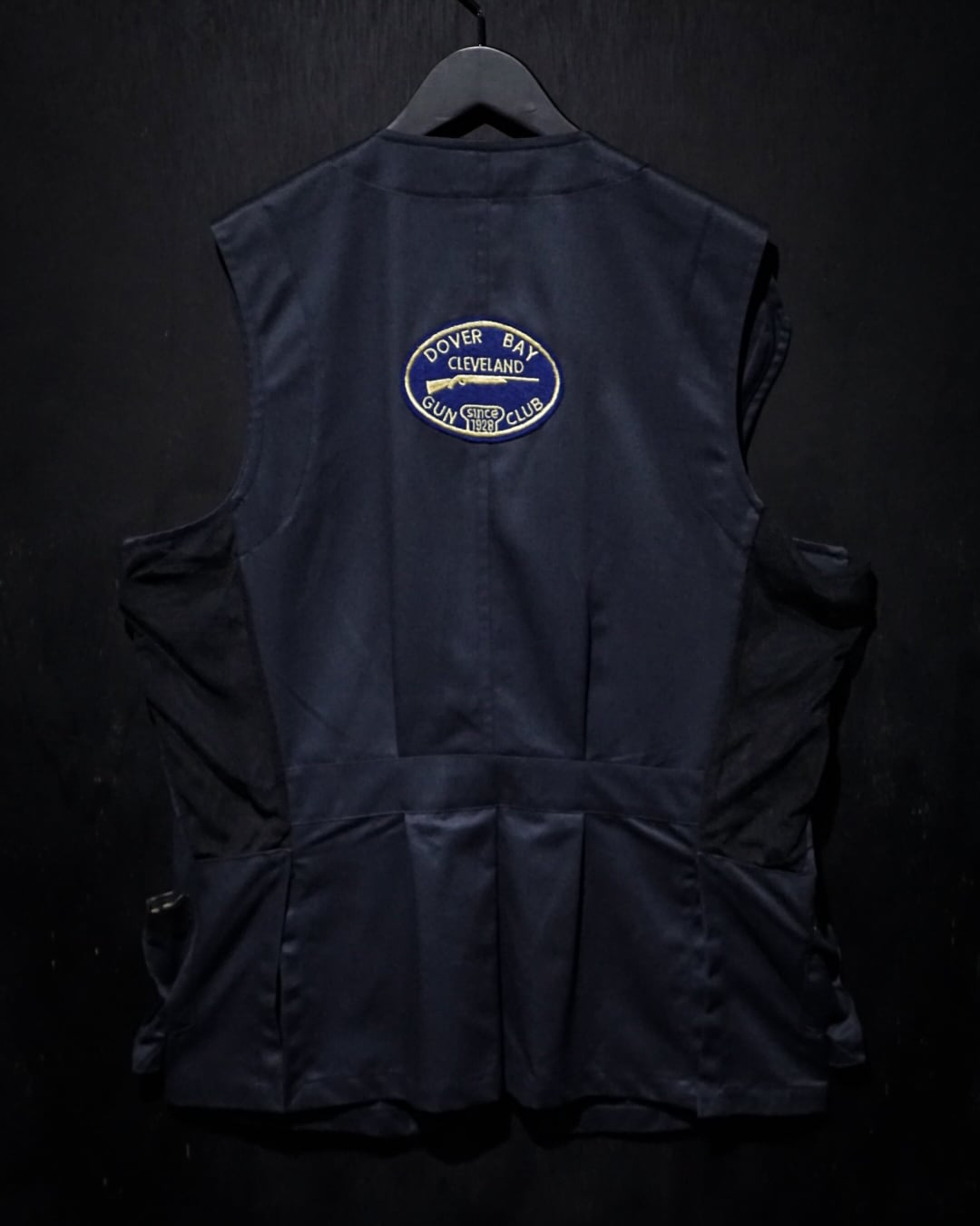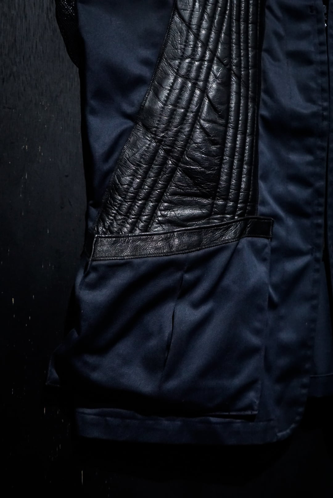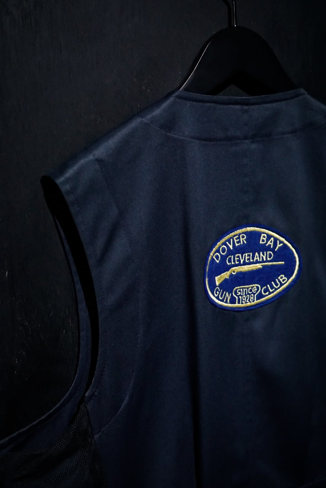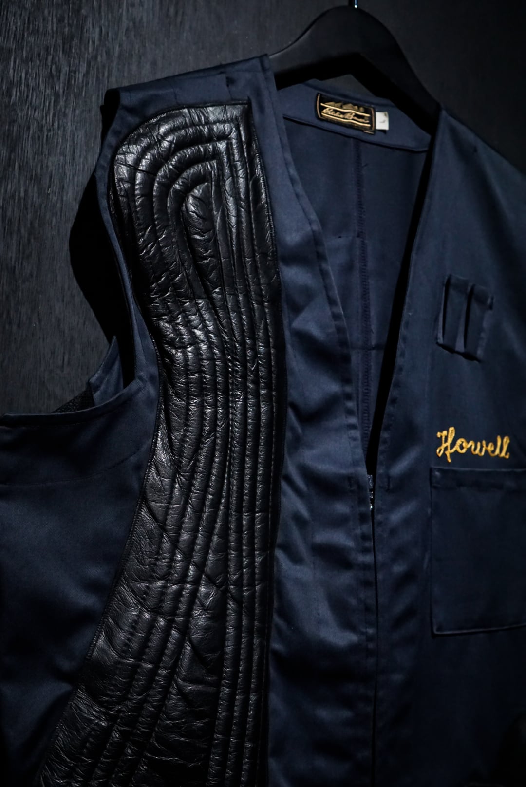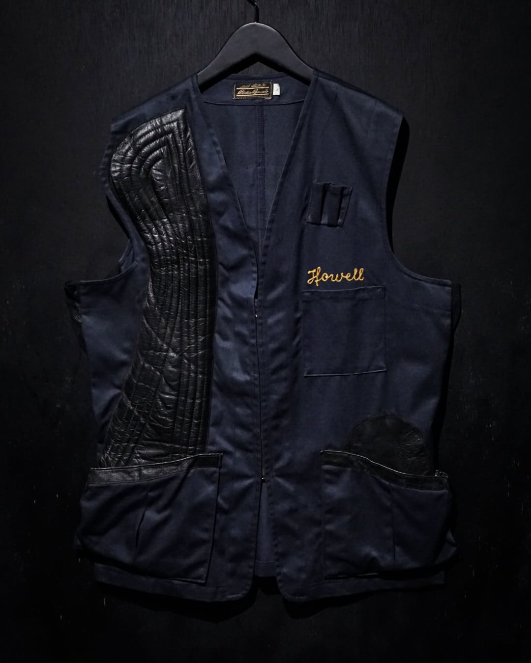 コシのあるネイビーのボディに、右身頃にステッチを施したレザーを大胆に切り替えたベスト。ハンティングなど銃を扱う際に着る為に作られた物で、レザーを切り替えたことで肩周りを強化する役割を果たしてくれています。