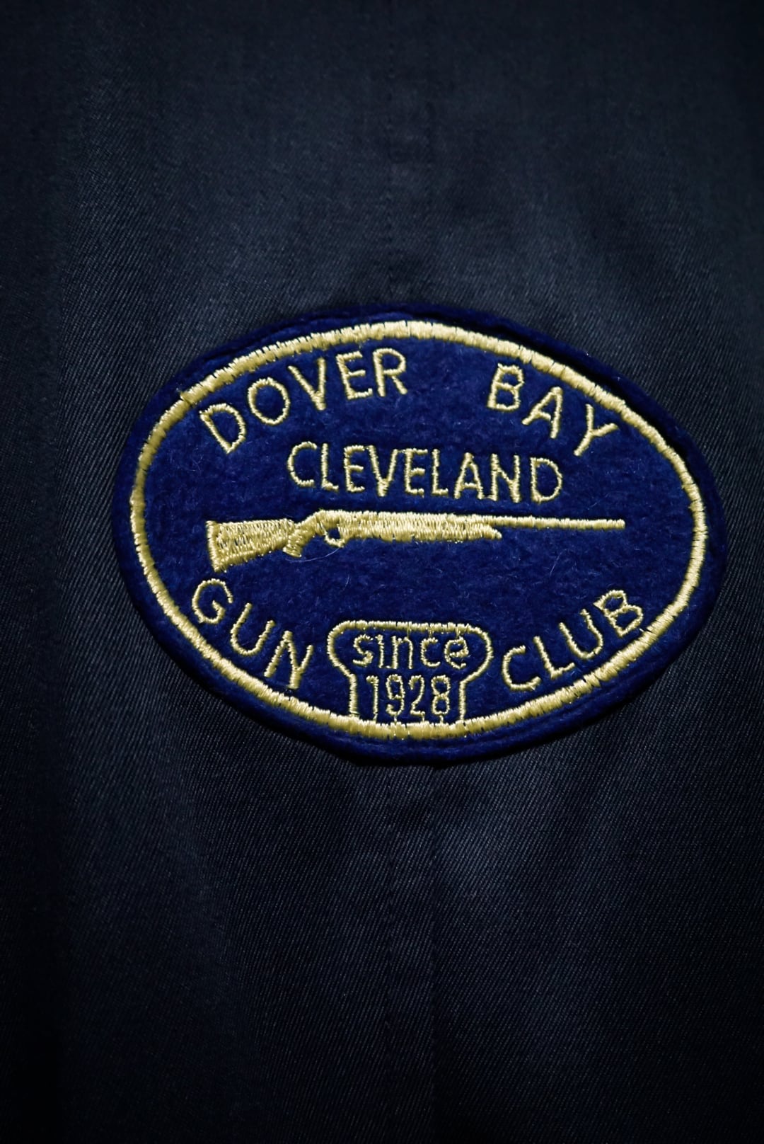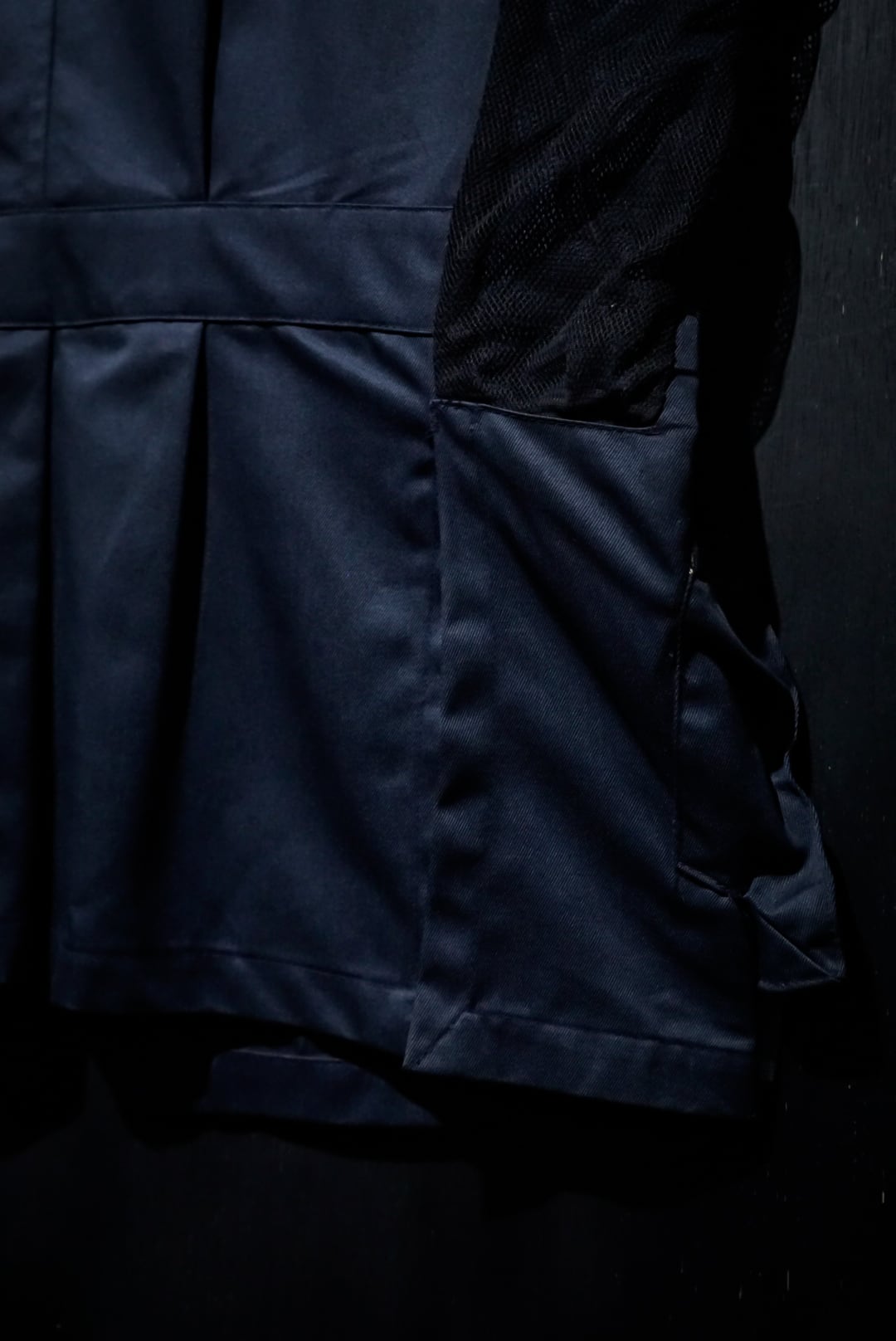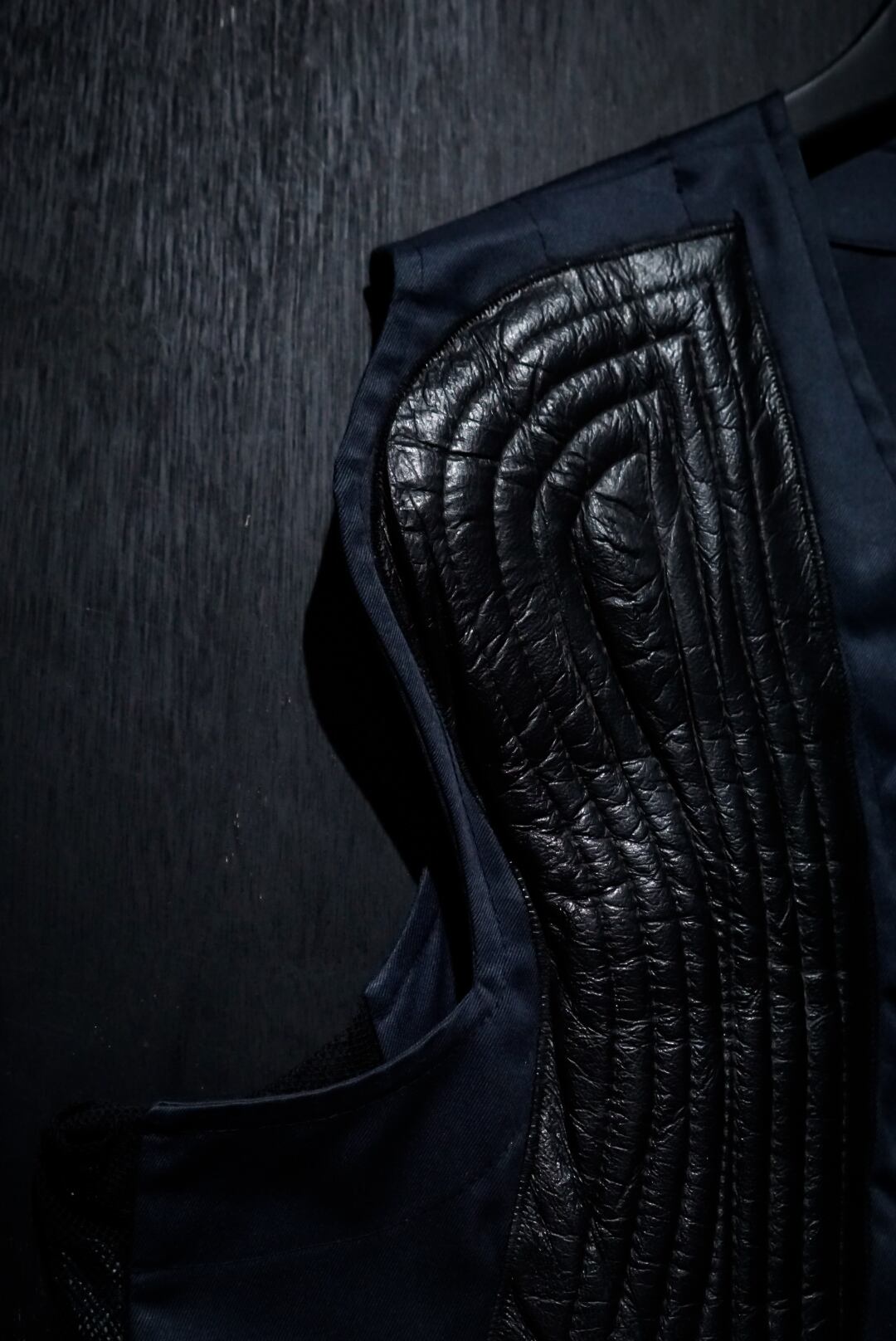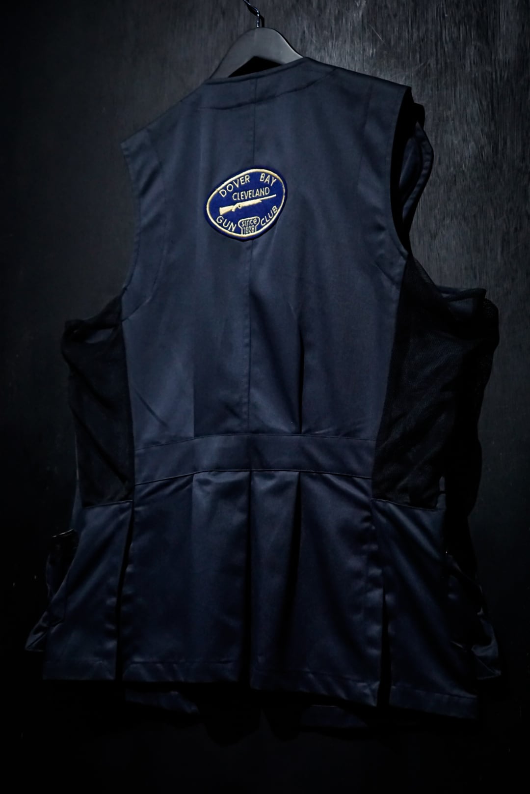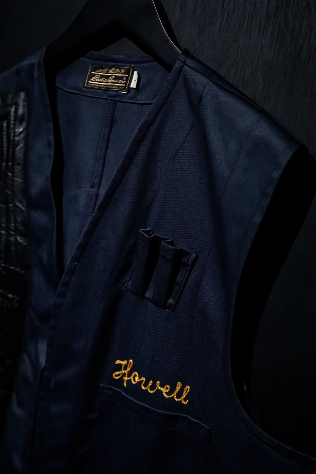 コシのあるネイビーのボディに、右身頃にステッチを施したレザーを大胆に切り替えたベスト。ハンティングなど銃を扱う際に着る為に作られた物で、レザーを切り替えたことで肩周りを強化する役割を果たしてくれています。