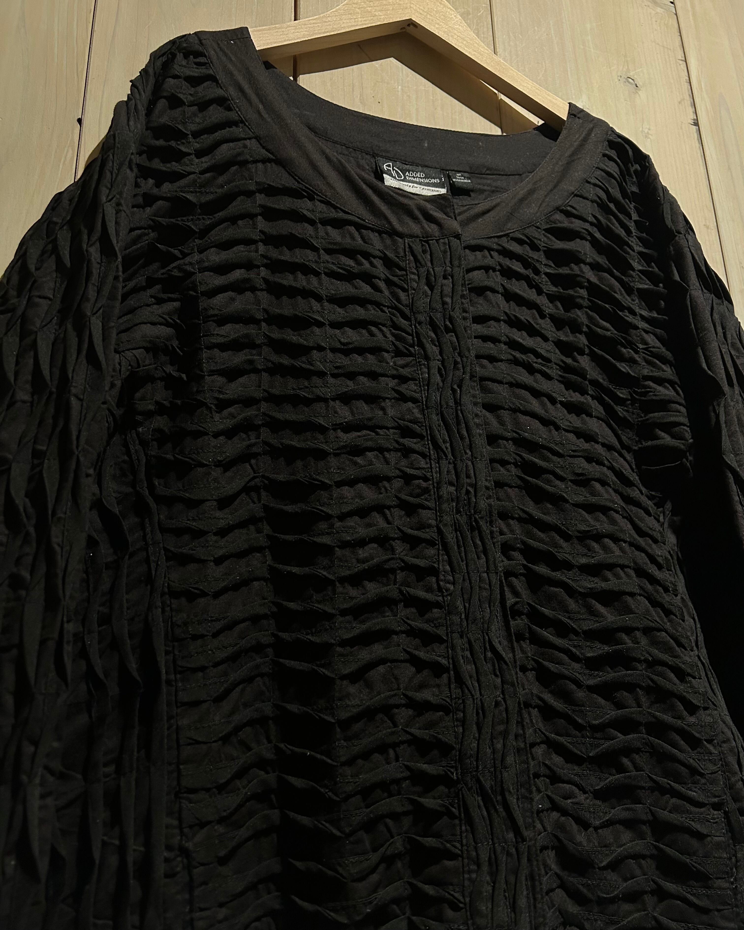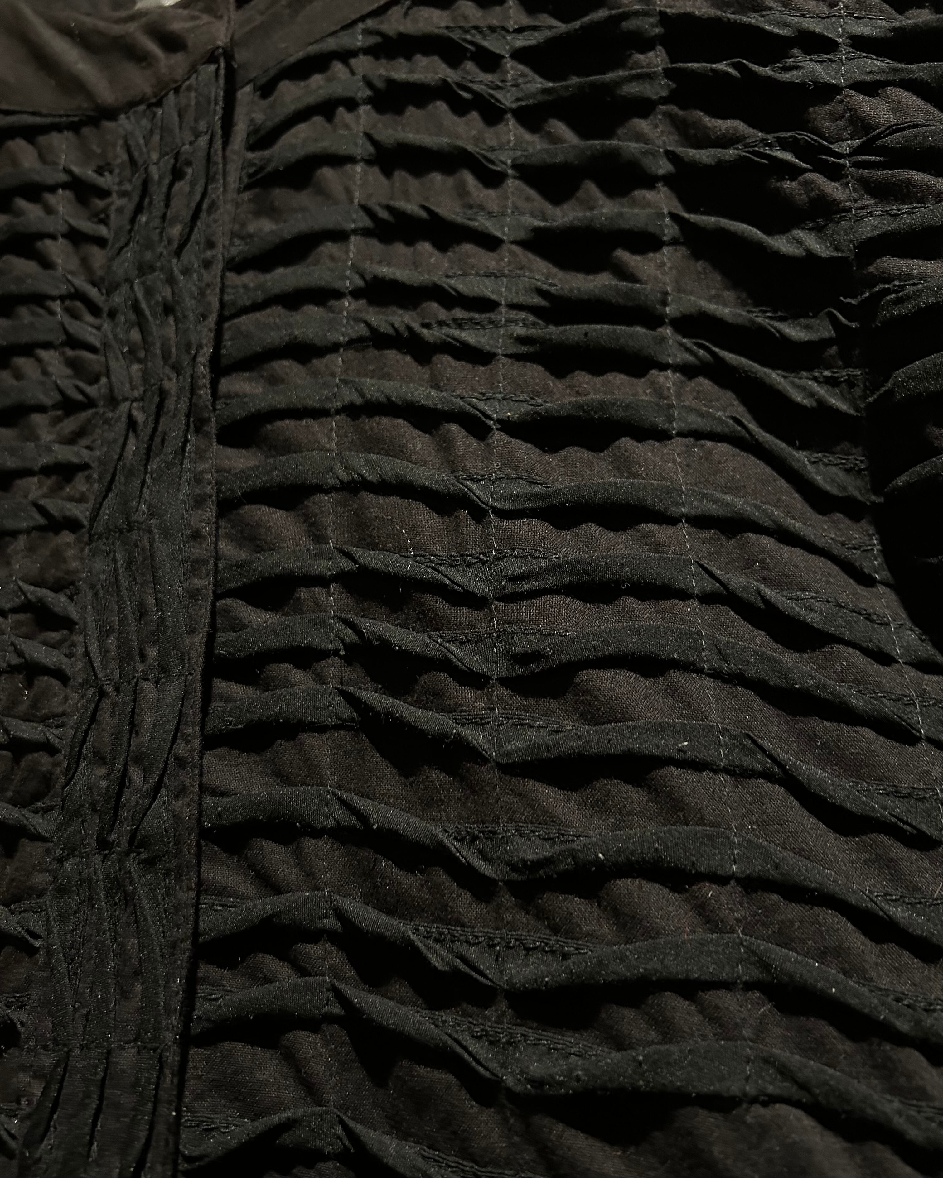 ハリがありながらも柔らかな素材を用いたボディにボーダー状に生地を載せ、垂直にステッチを施し生地がめくれるように3Dのデザインを施したジャケット。