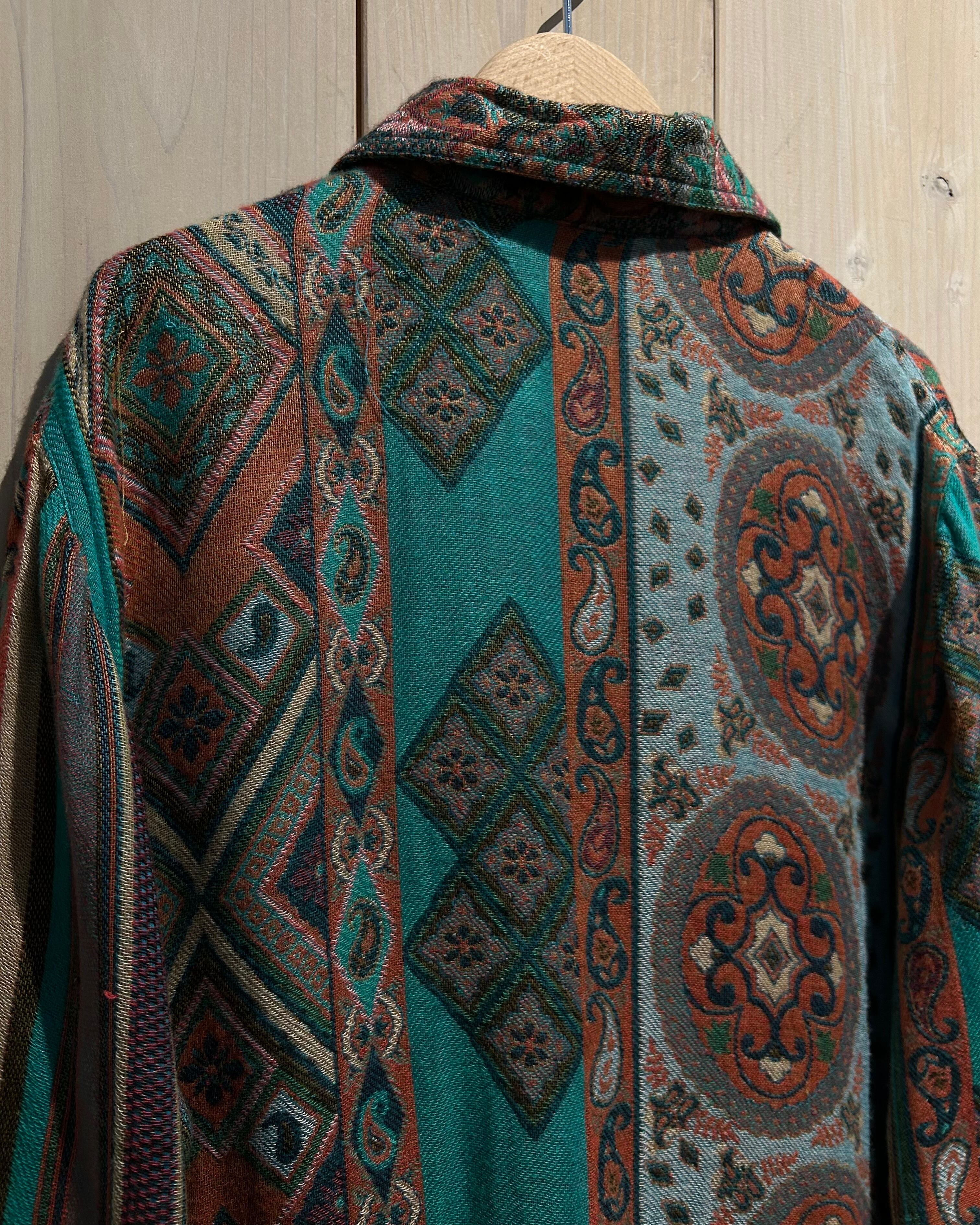 上質なジャガード織りを用いて、ラグジュアリーかつヨーロピアンな雰囲気漂う美しい柄模様を緻密に織り込んだシャツジャケット。近くで見ると分かるのですが、何色もの糸を用いており、その繊細には毎度圧倒されてしまいます、、、