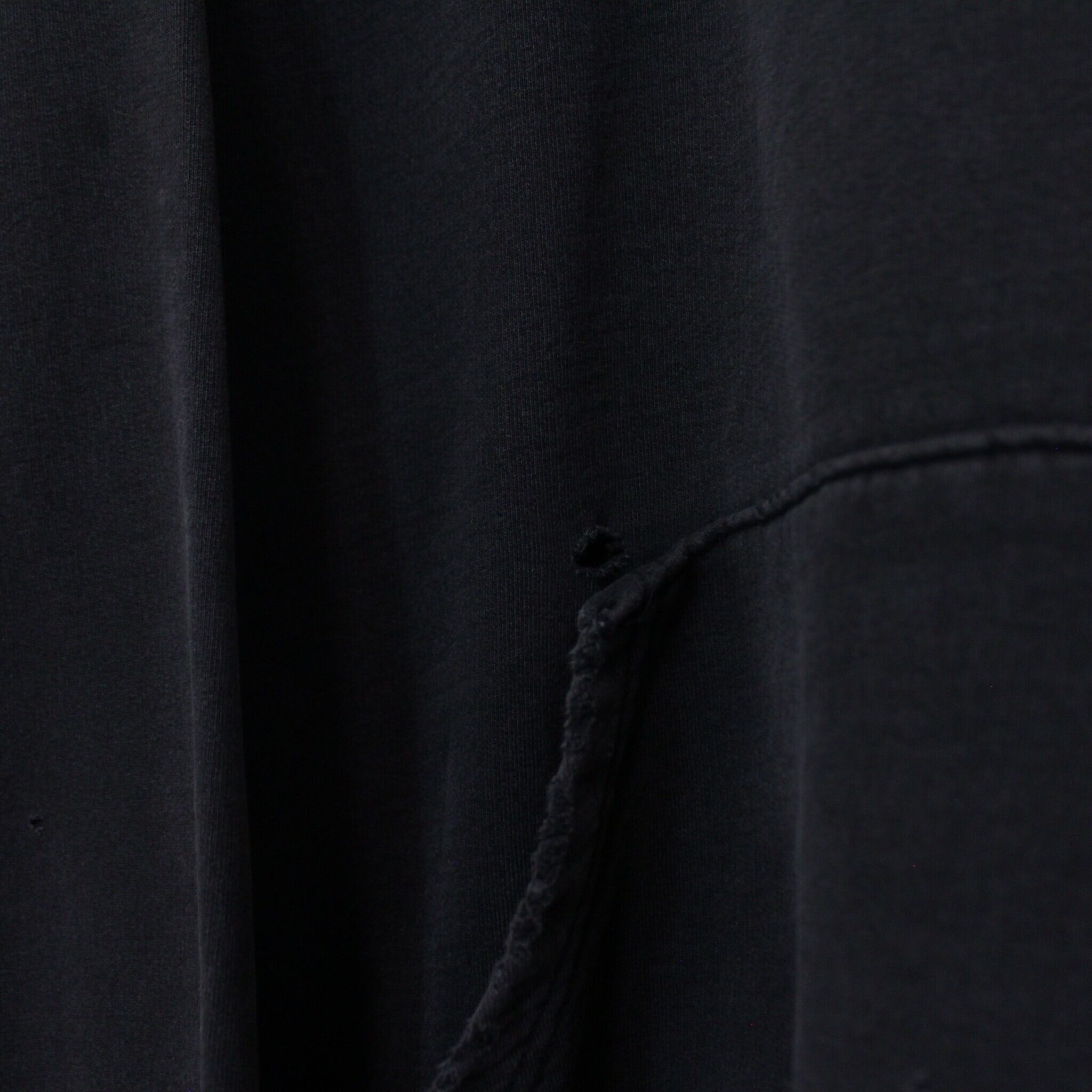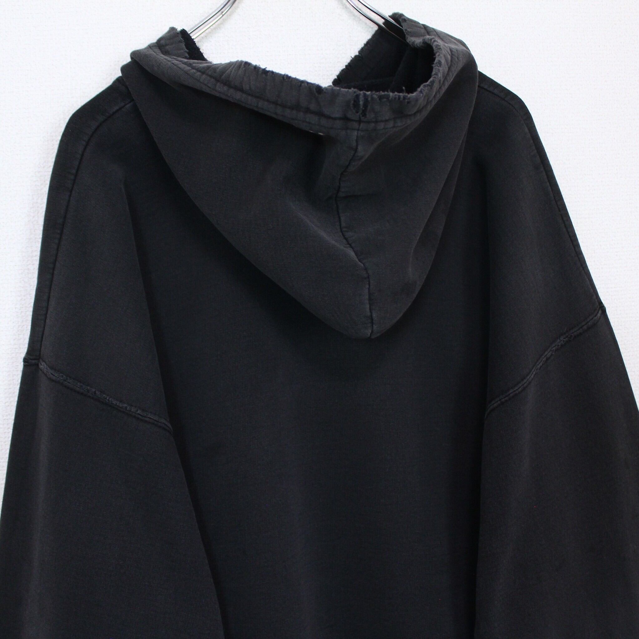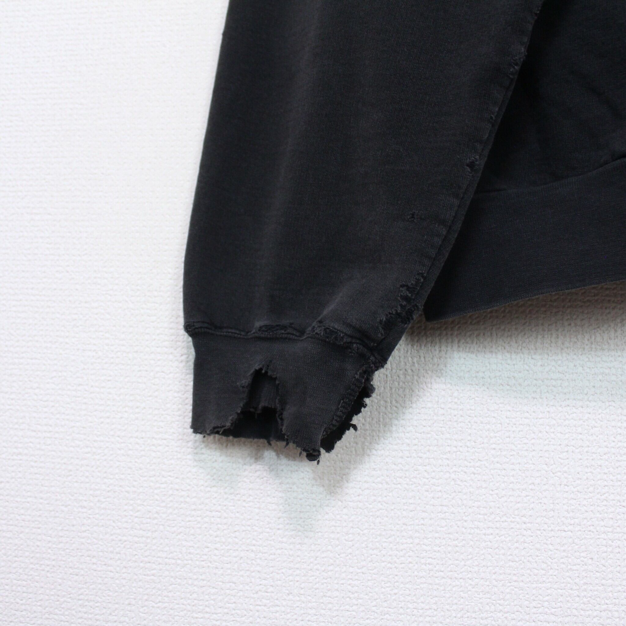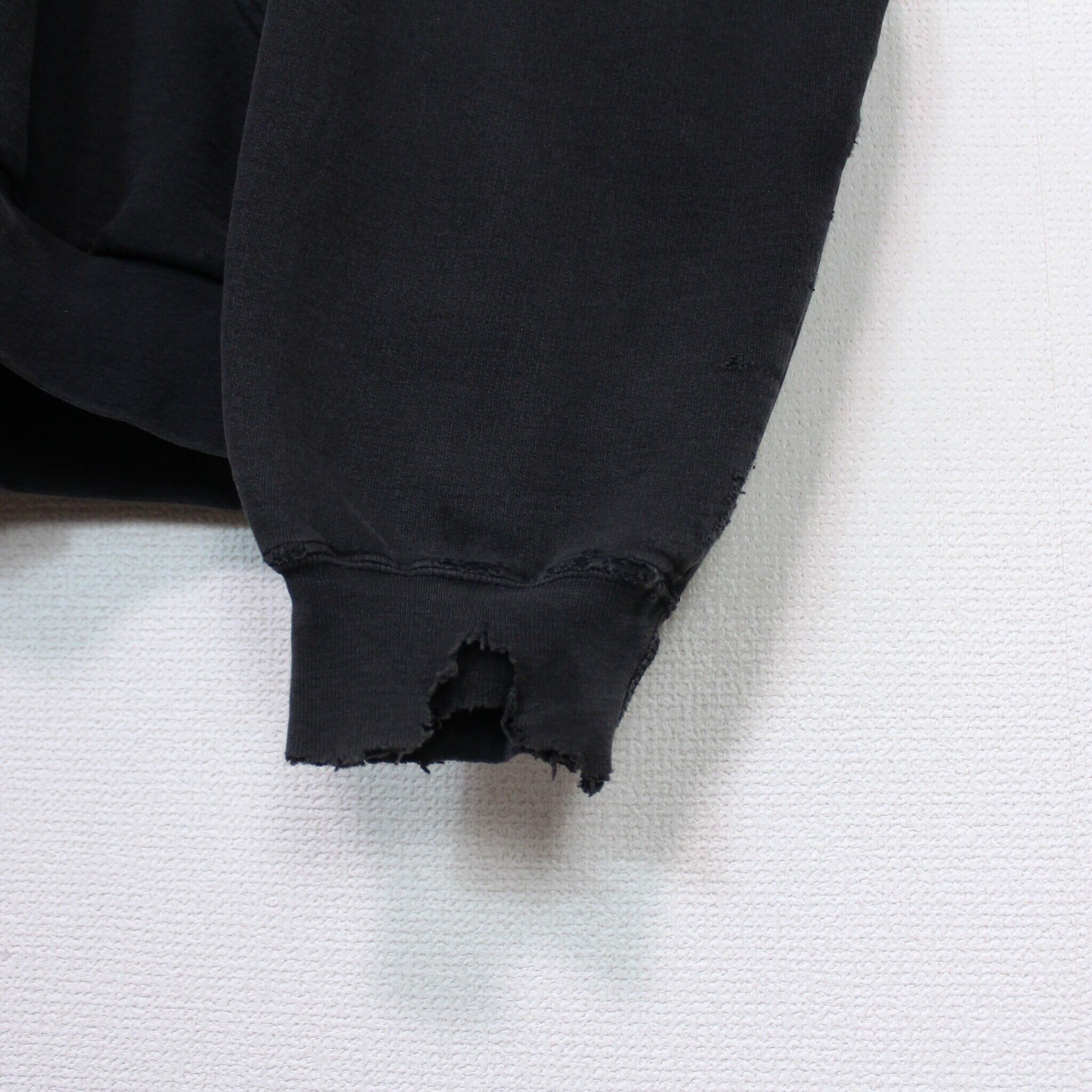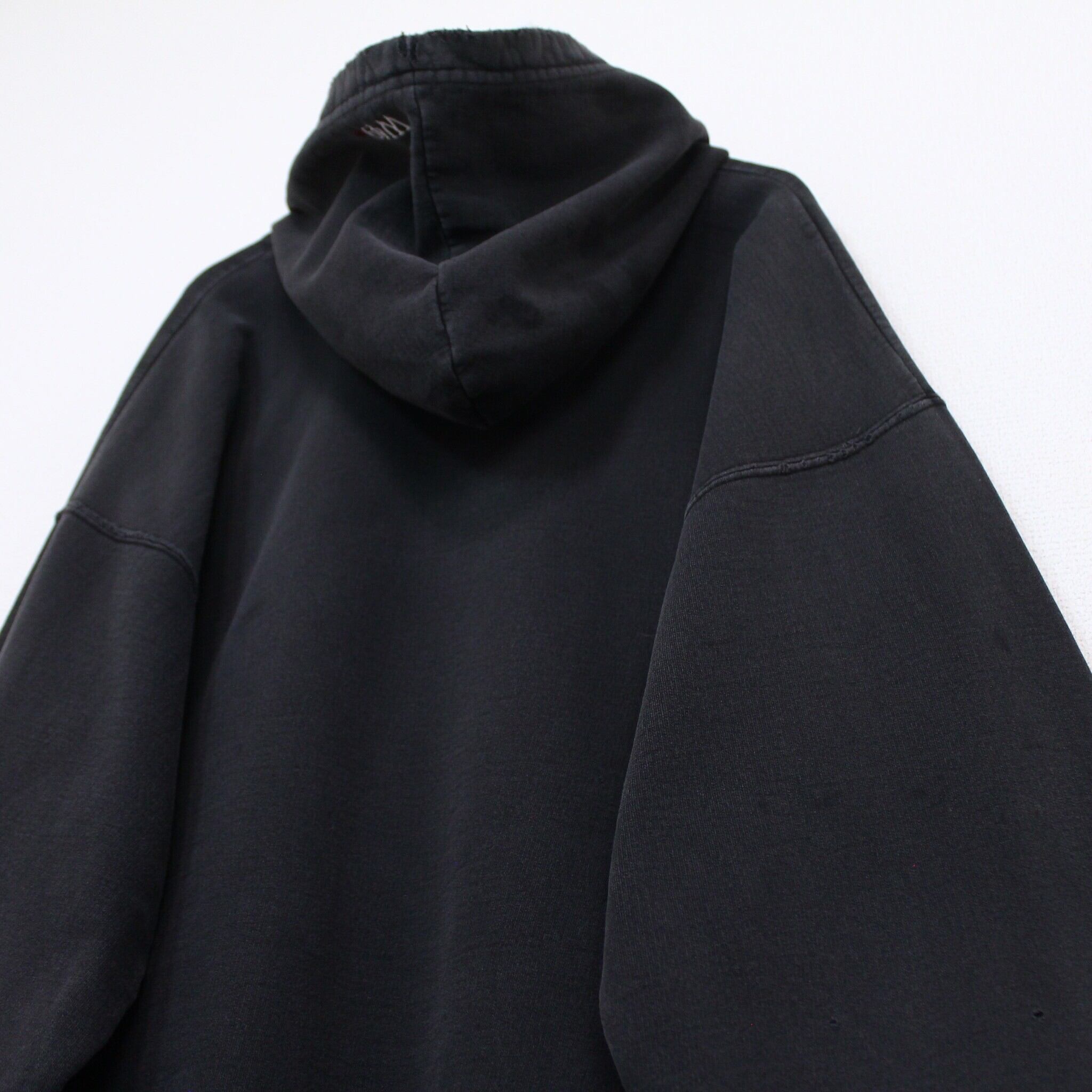 ブラックのボディがフェードした墨黒のボティに、フロントにオールドイングリッシュの自体でブランドネームを載せ、経年変化によるボロ具合が雰囲気をムンムンに醸し出すフーディの1着。