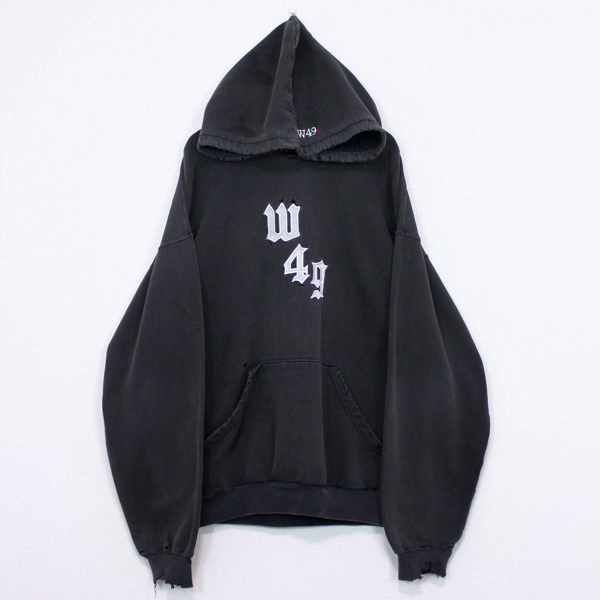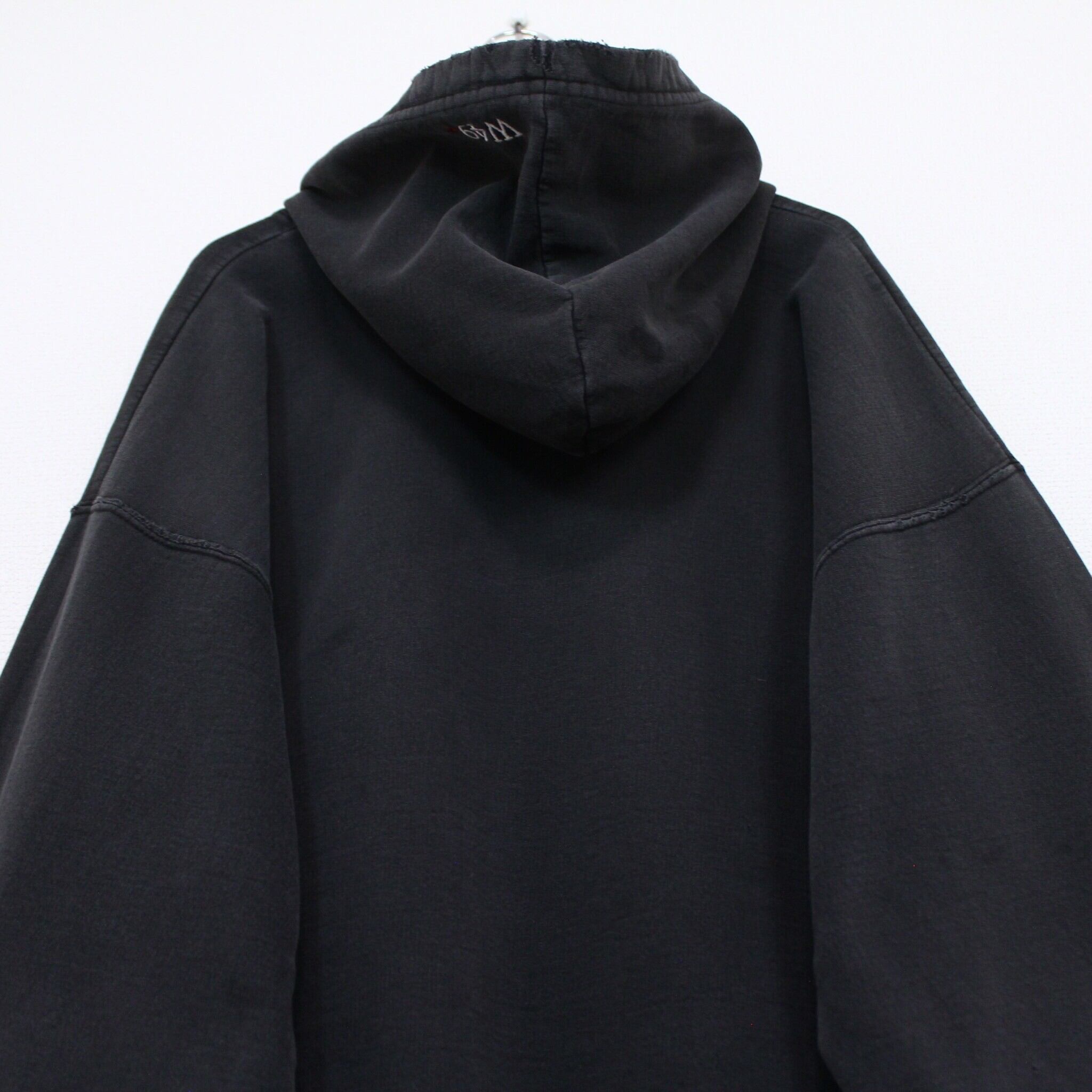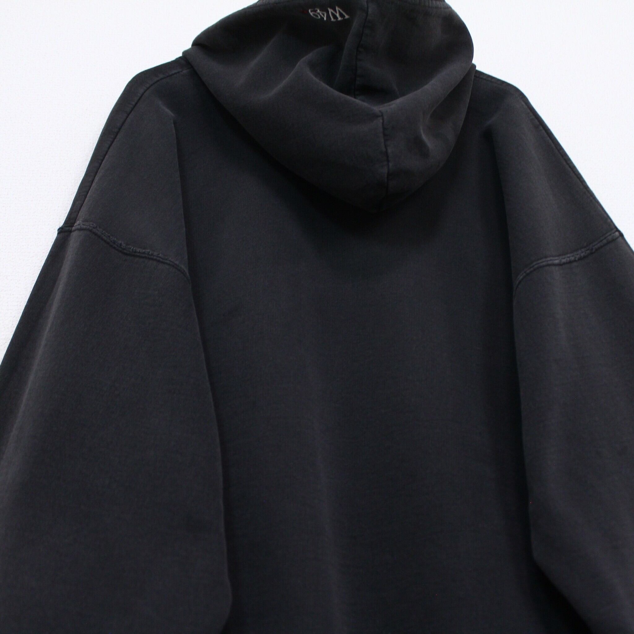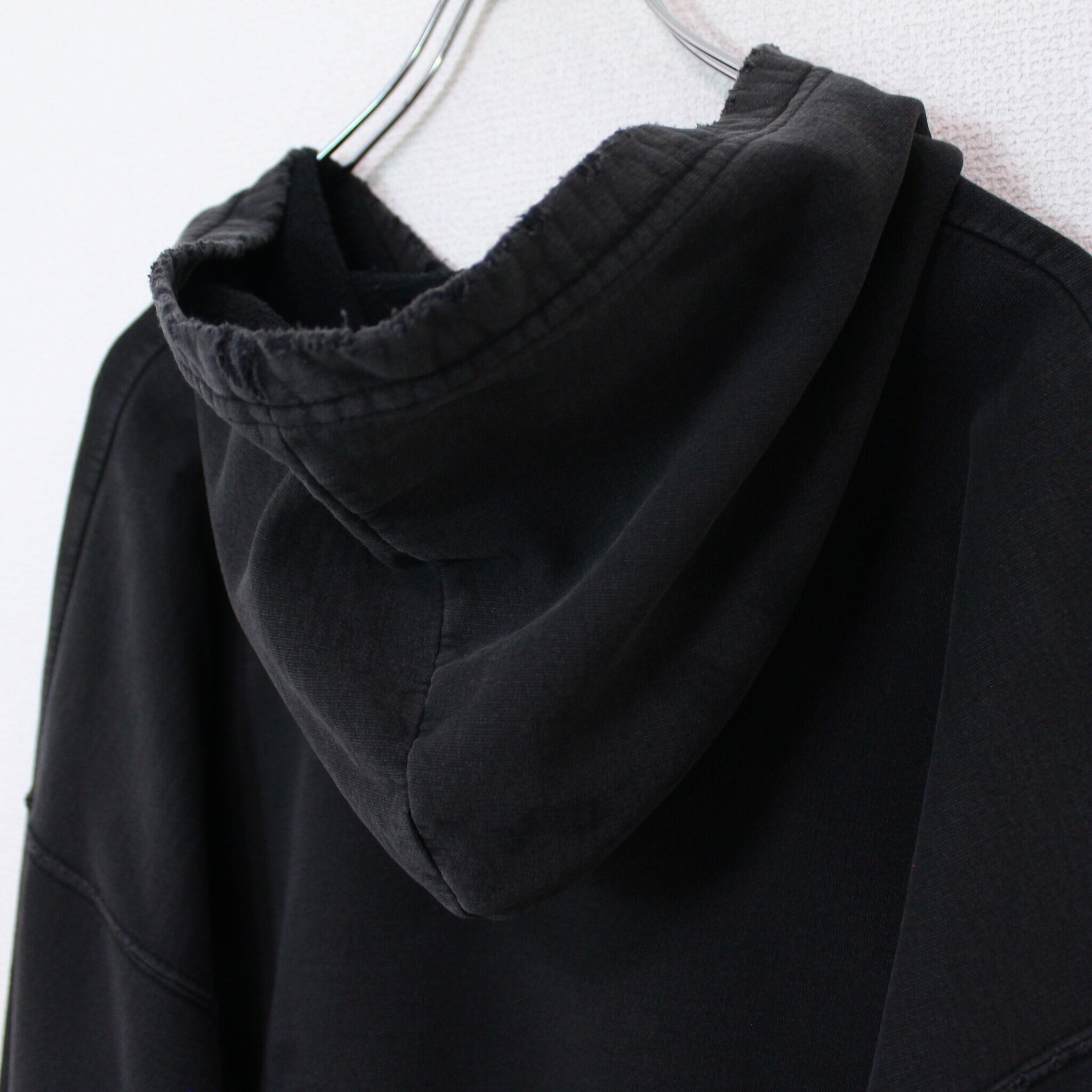 ブラックのボディがフェードした墨黒のボティに、フロントにオールドイングリッシュの自体でブランドネームを載せ、経年変化によるボロ具合が雰囲気をムンムンに醸し出すフーディの1着。