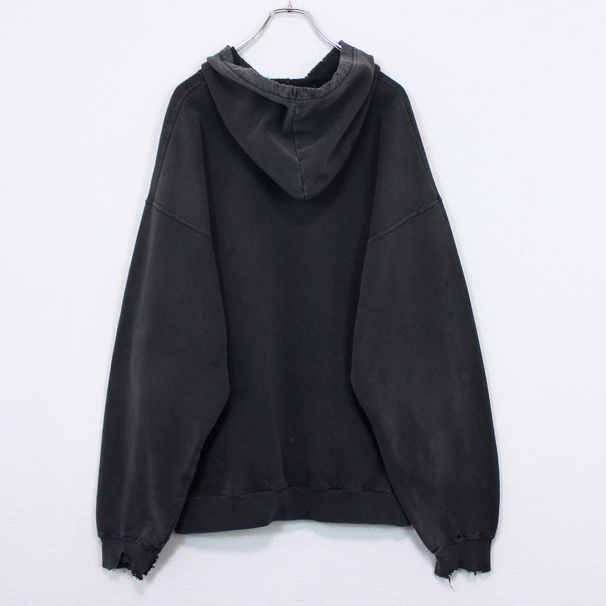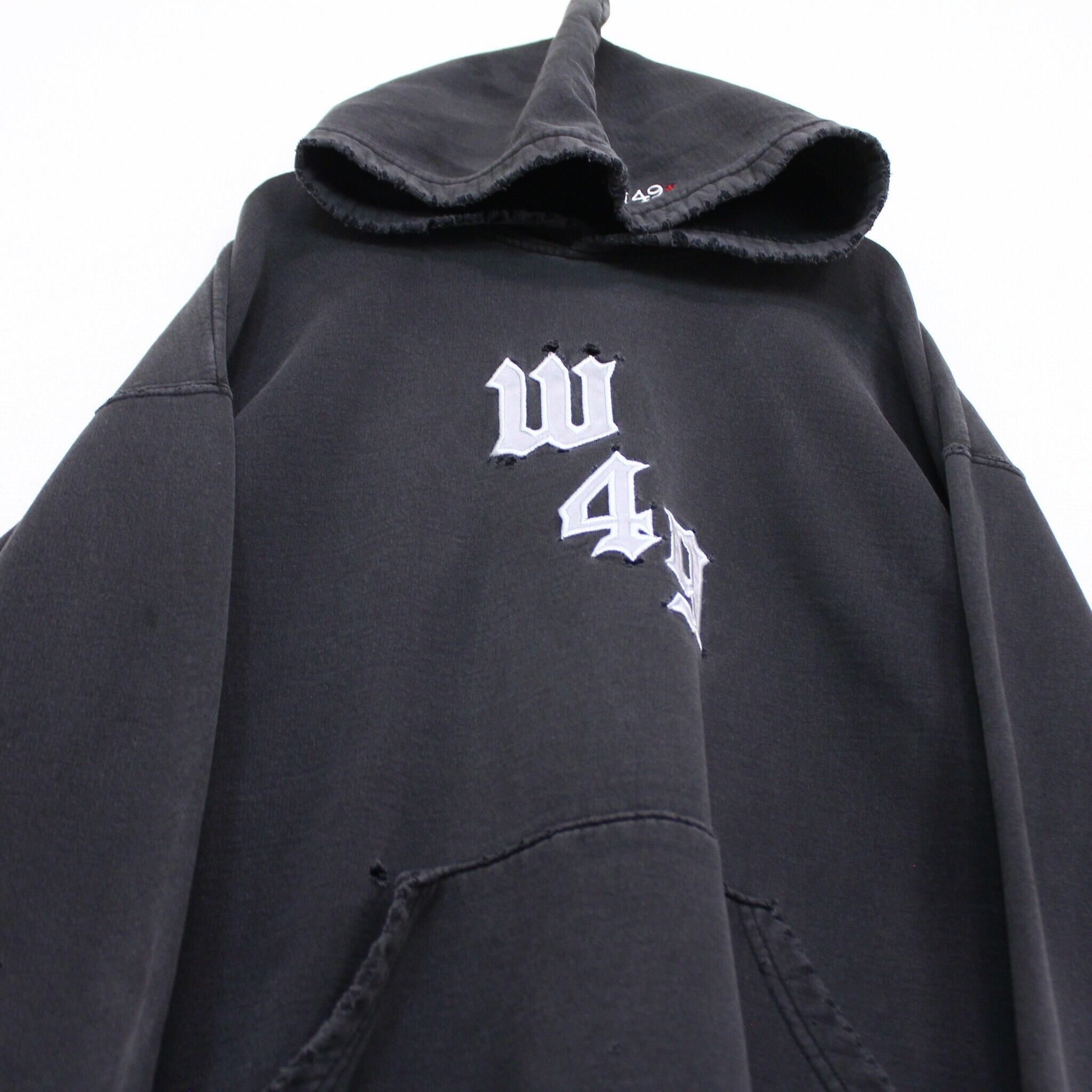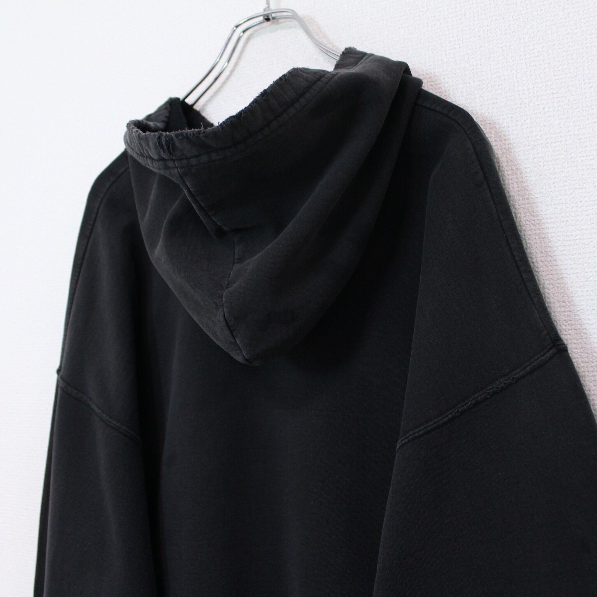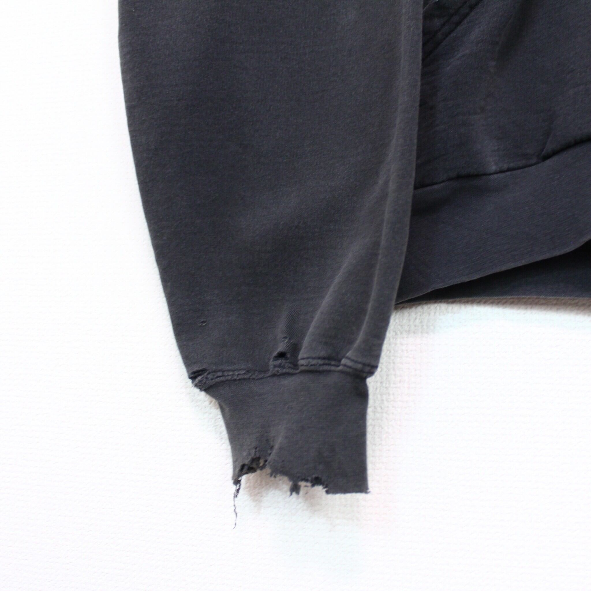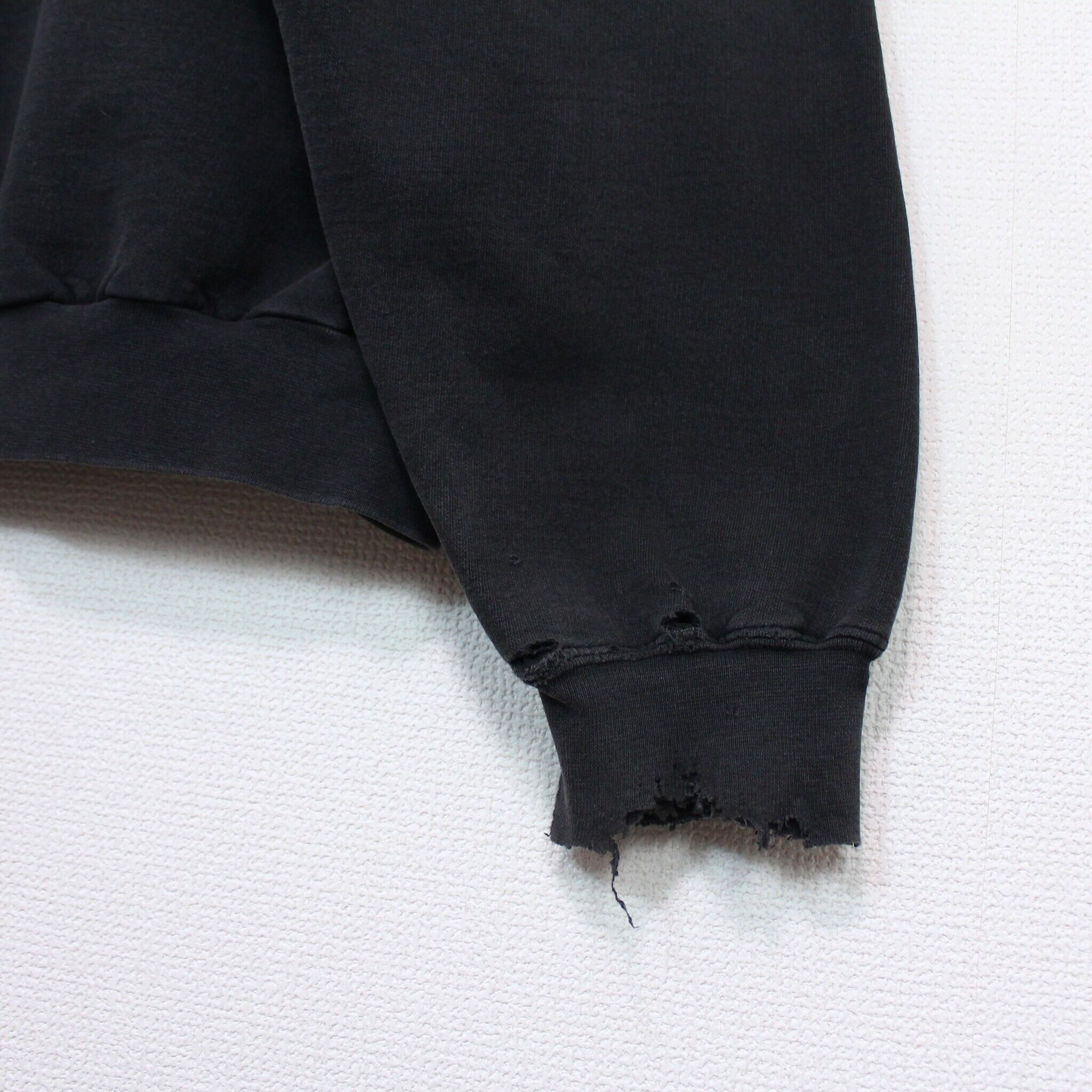 ブラックのボディがフェードした墨黒のボティに、フロントにオールドイングリッシュの自体でブランドネームを載せ、経年変化によるボロ具合が雰囲気をムンムンに醸し出すフーディの1着。