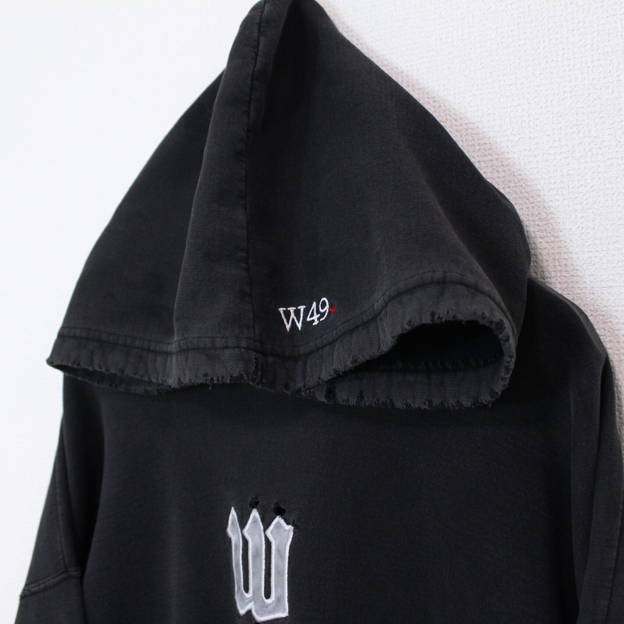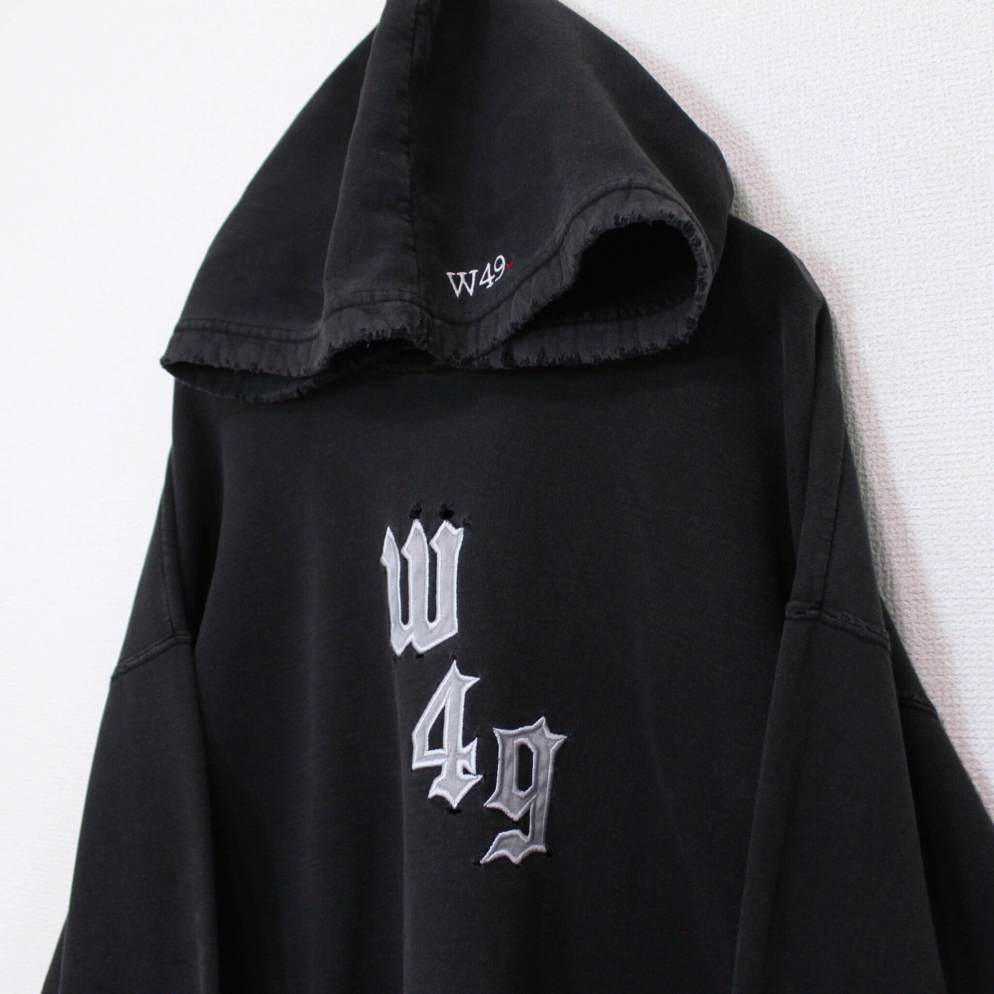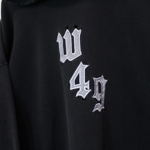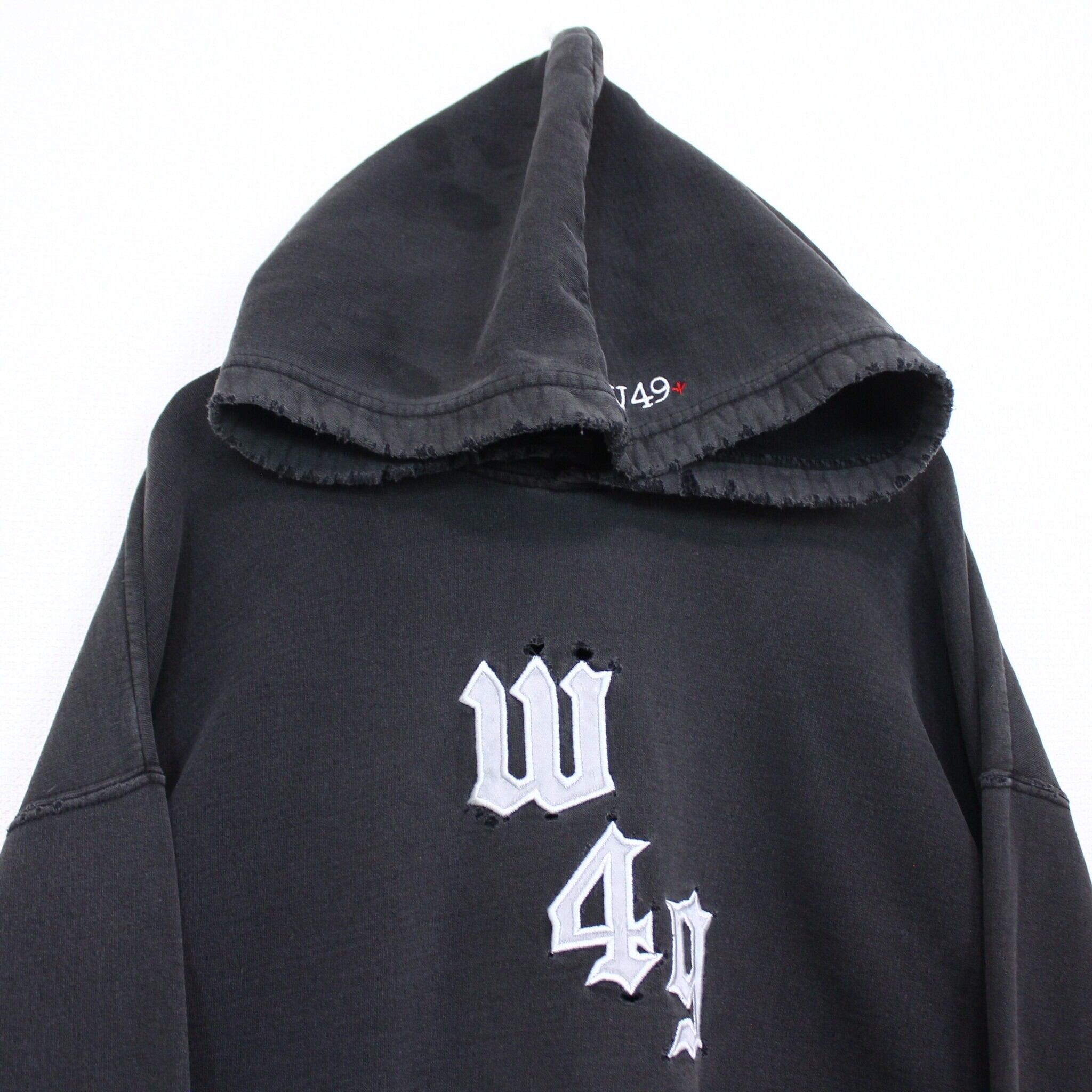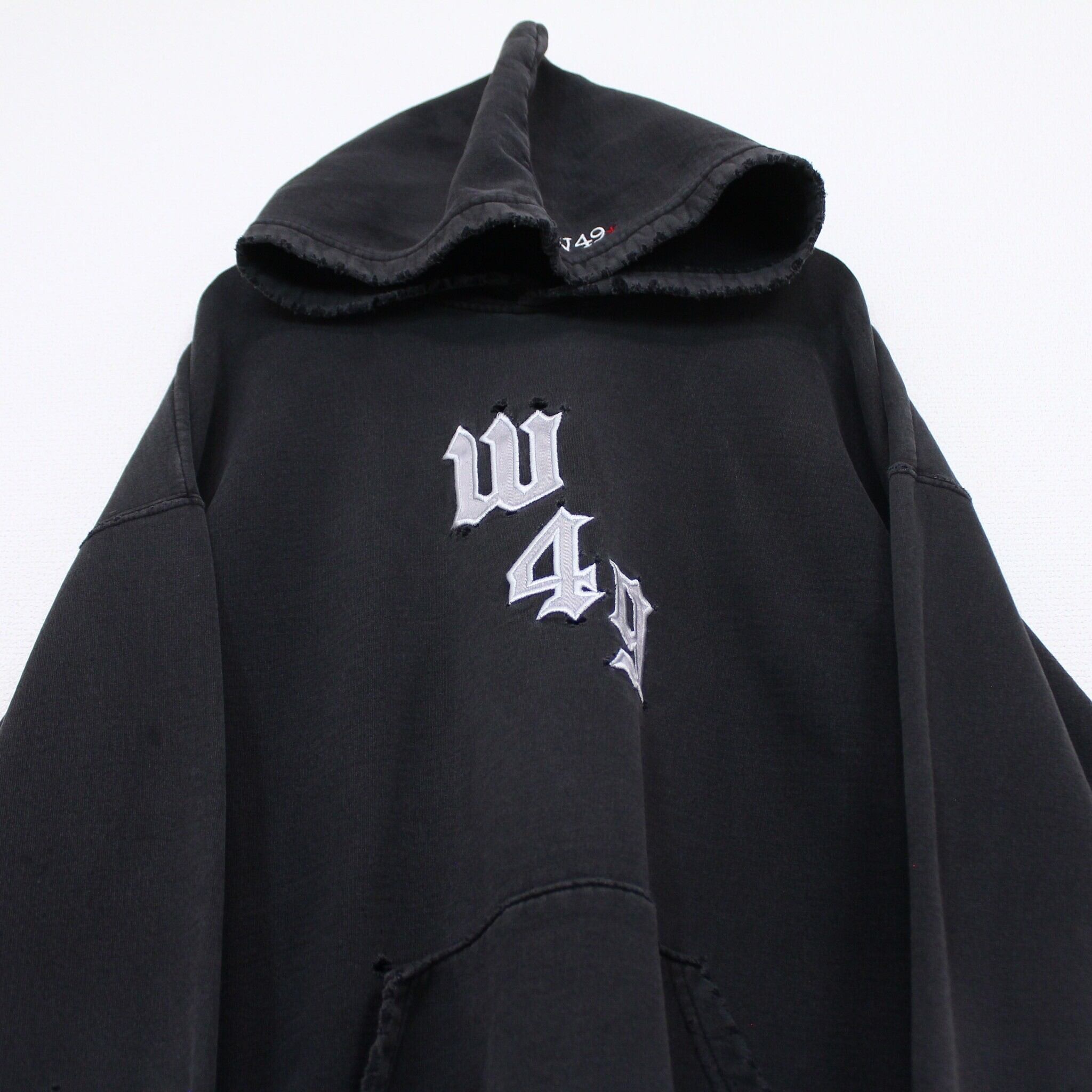 ブラックのボディがフェードした墨黒のボティに、フロントにオールドイングリッシュの自体でブランドネームを載せ、経年変化によるボロ具合が雰囲気をムンムンに醸し出すフーディの1着。