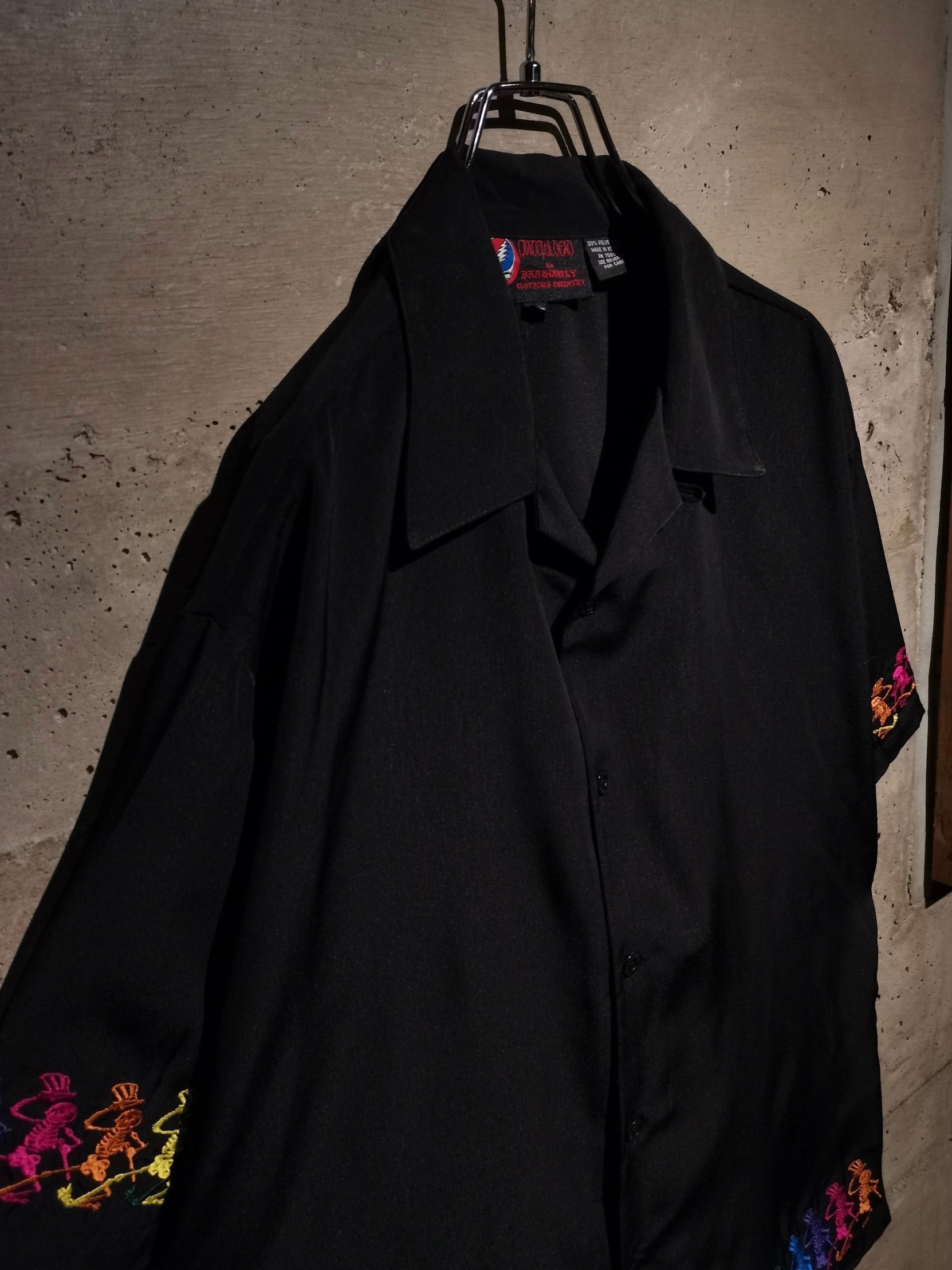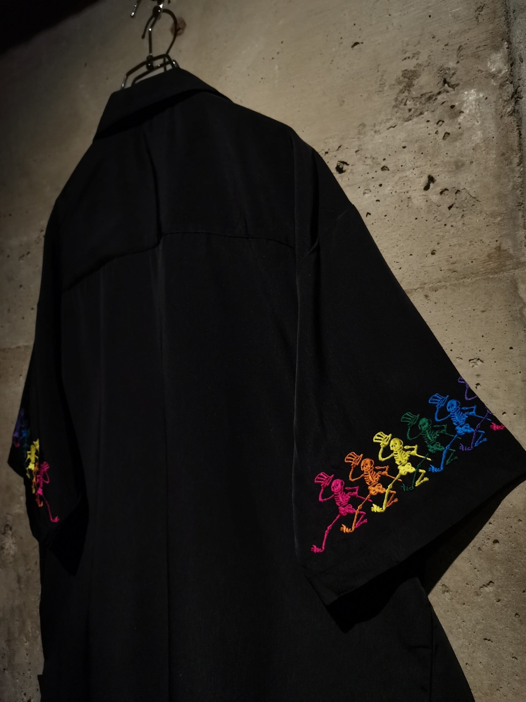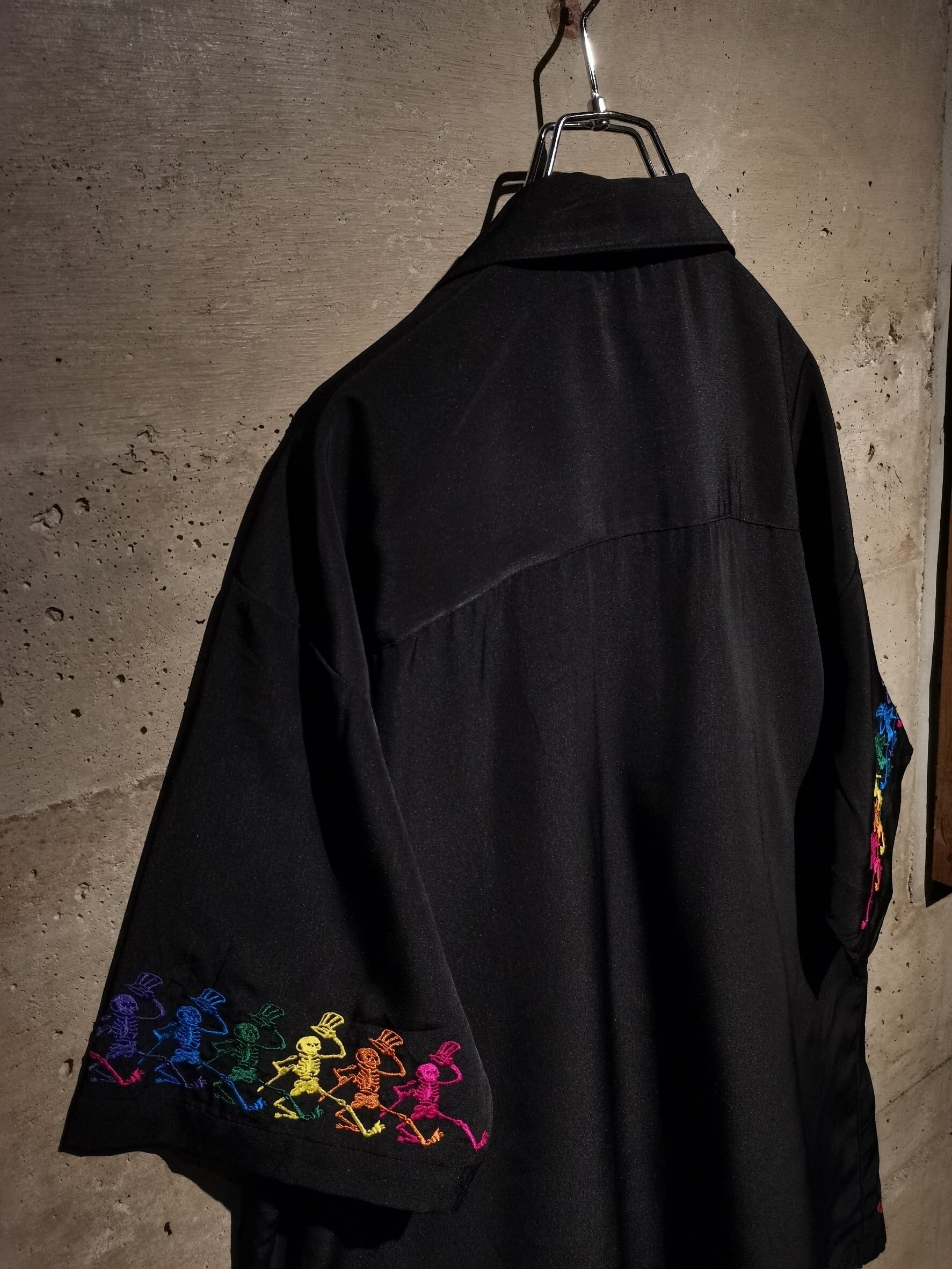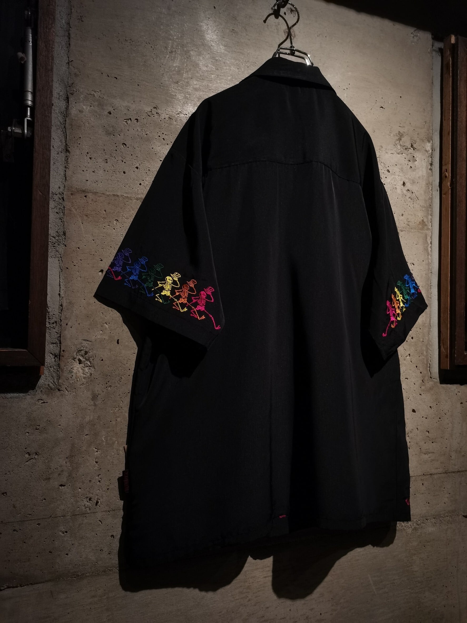 ツルッと滑らかな質感のボディに、同バンドのアイコンでもあるスカルをサイケデリックなカラーリングを用いて刺繍で刻んだ1着。