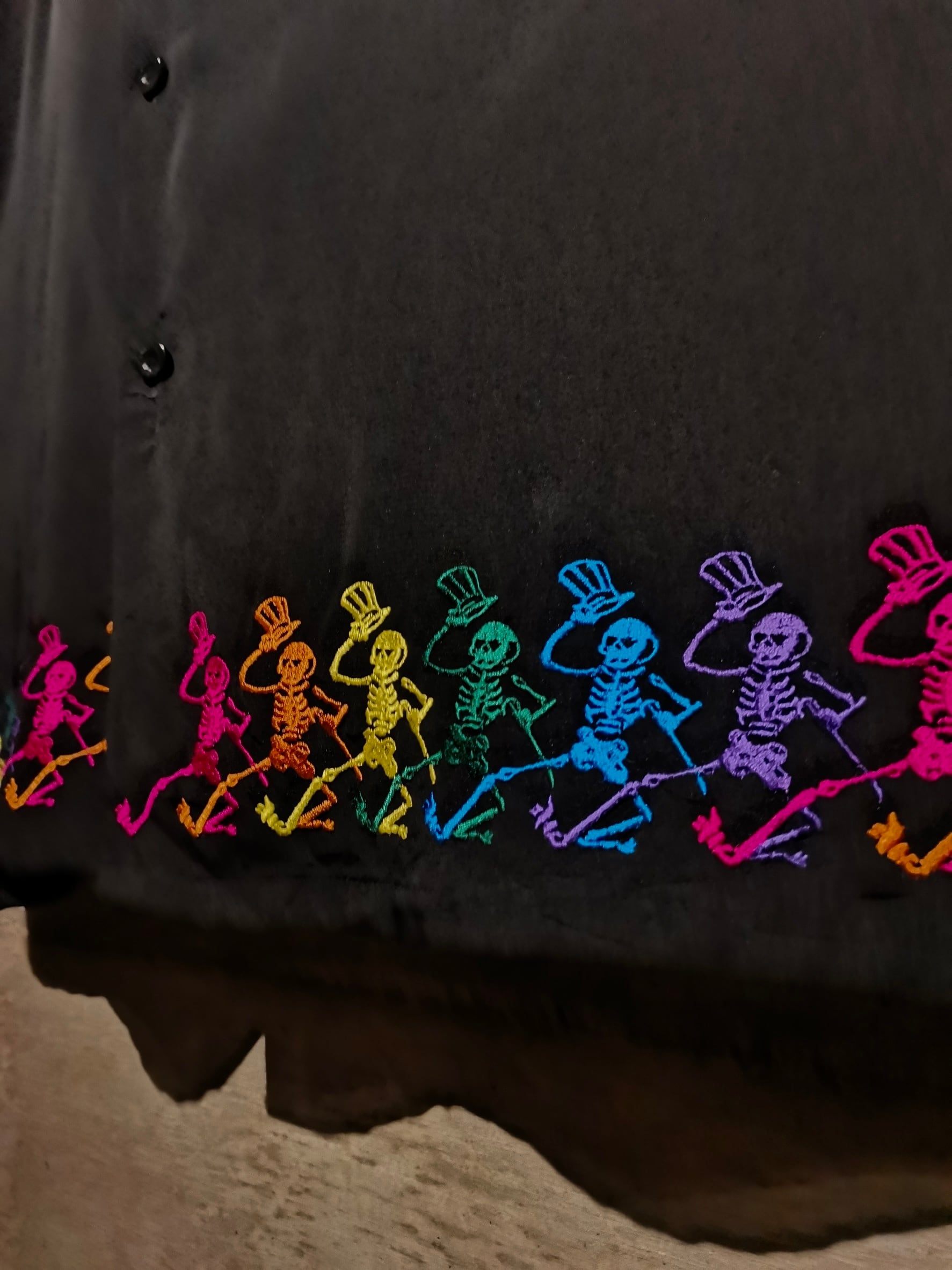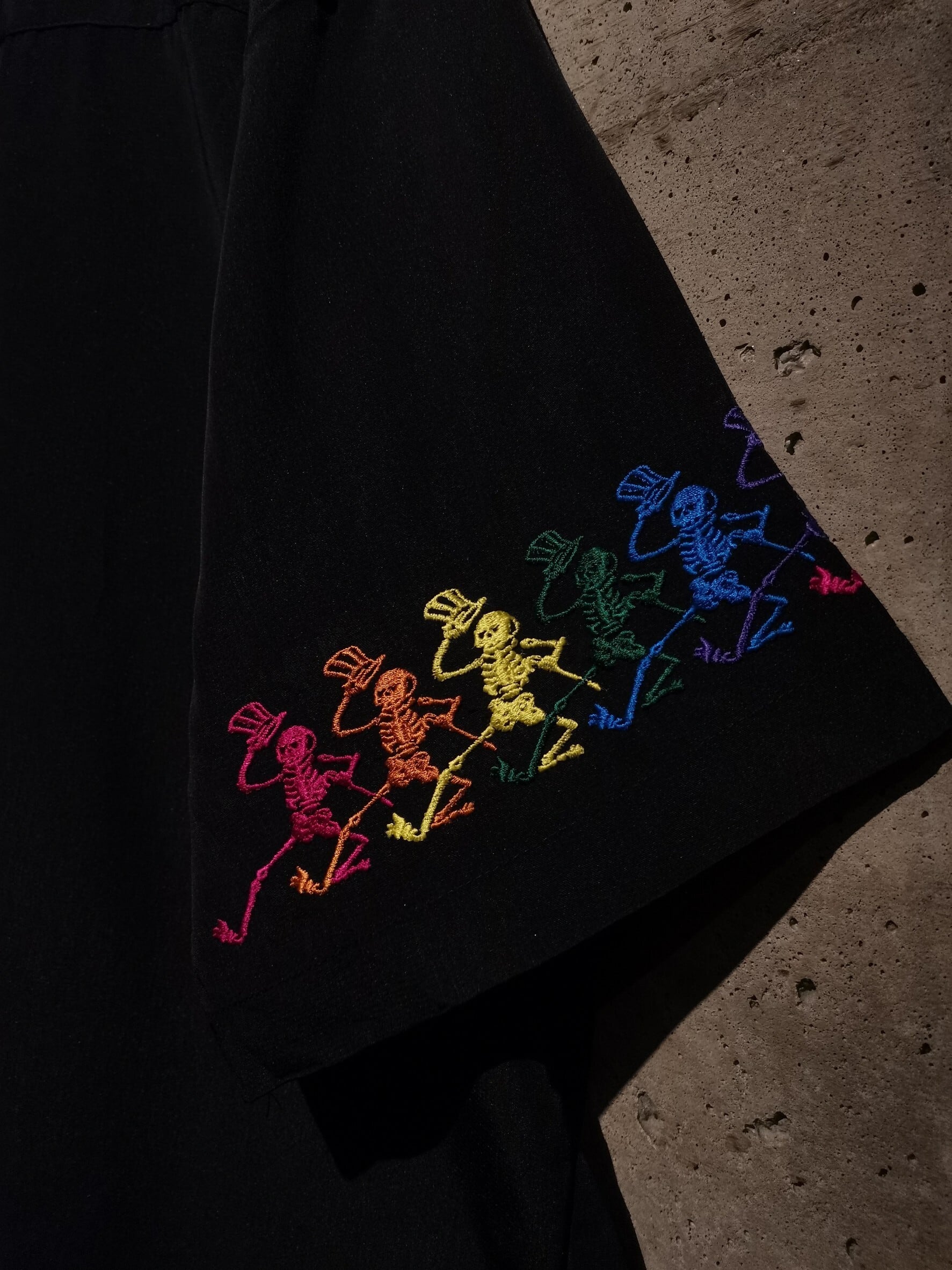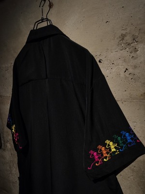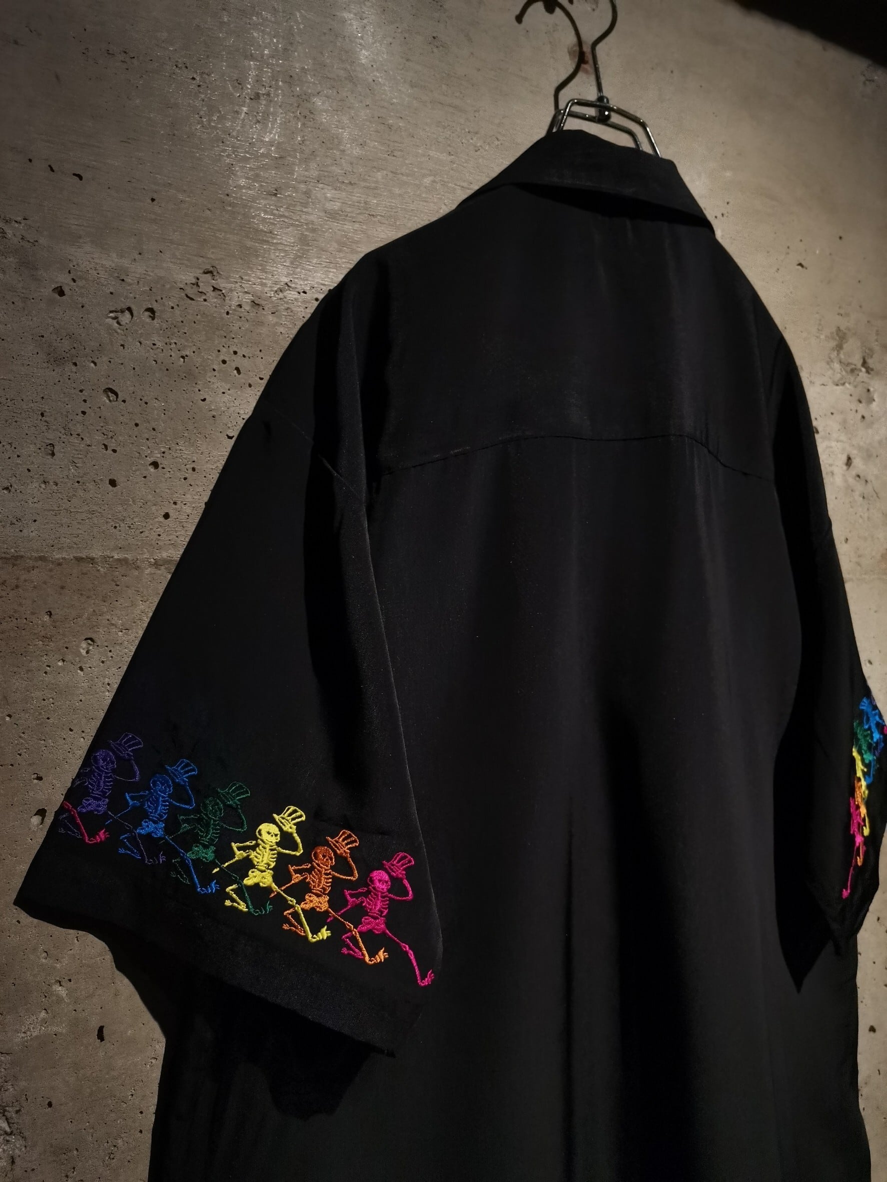 ツルッと滑らかな質感のボディに、同バンドのアイコンでもあるスカルをサイケデリックなカラーリングを用いて刺繍で刻んだ1着。