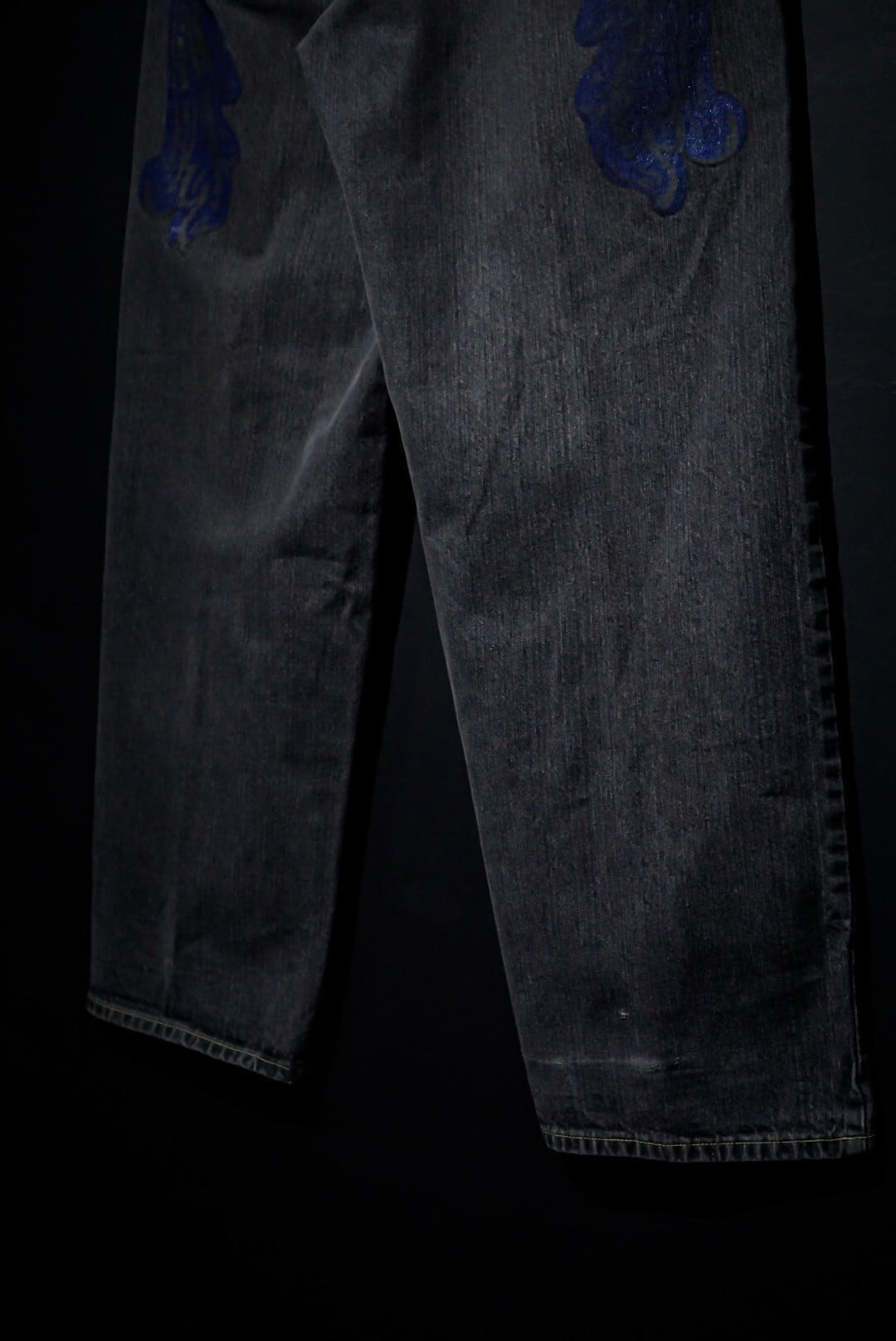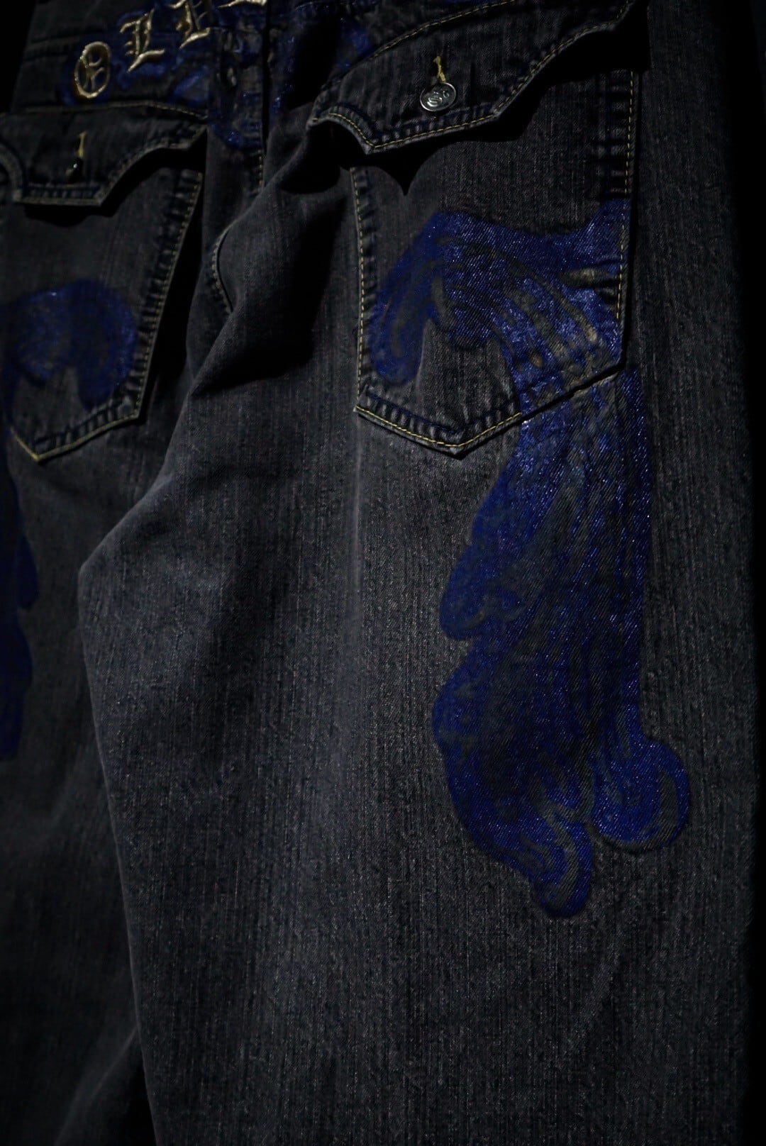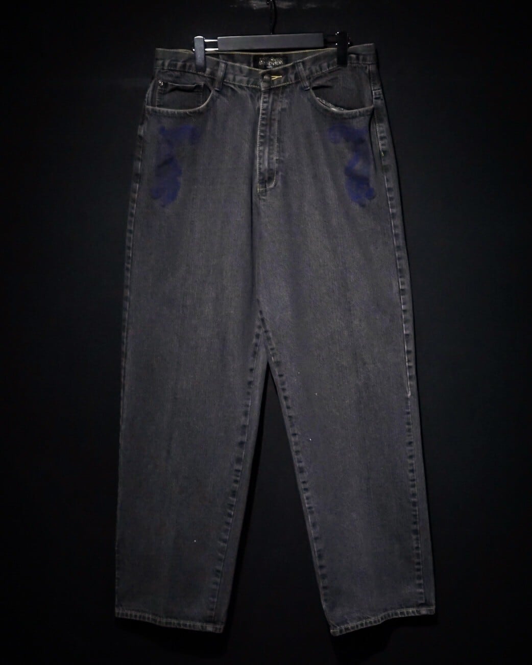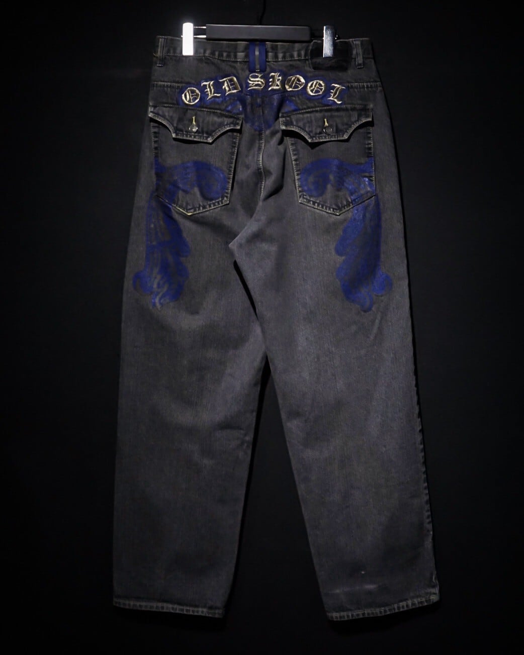 フェード感の美しいグレーのデニムのボディに、背面にはオールドイングリッシュの自体でブランドネームを、両面のポケット付近にブルーのカラーリングでペイズリー調のペイントを施したバギーデニムパンツ。