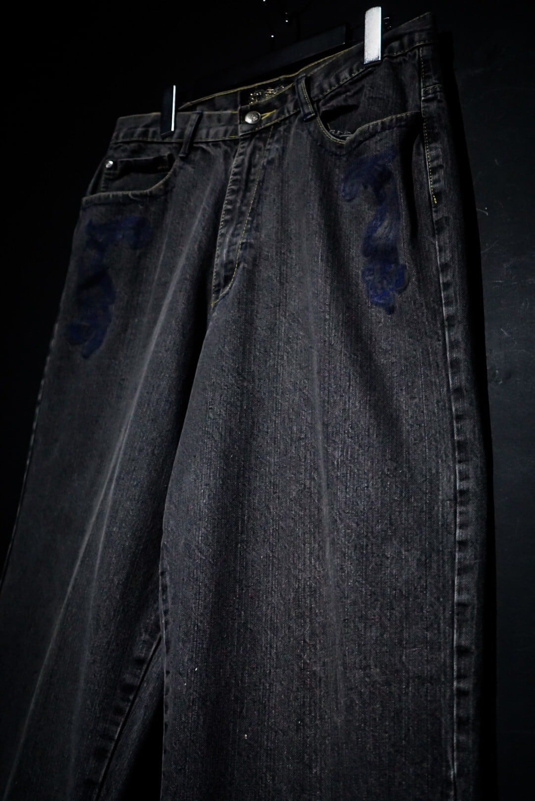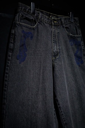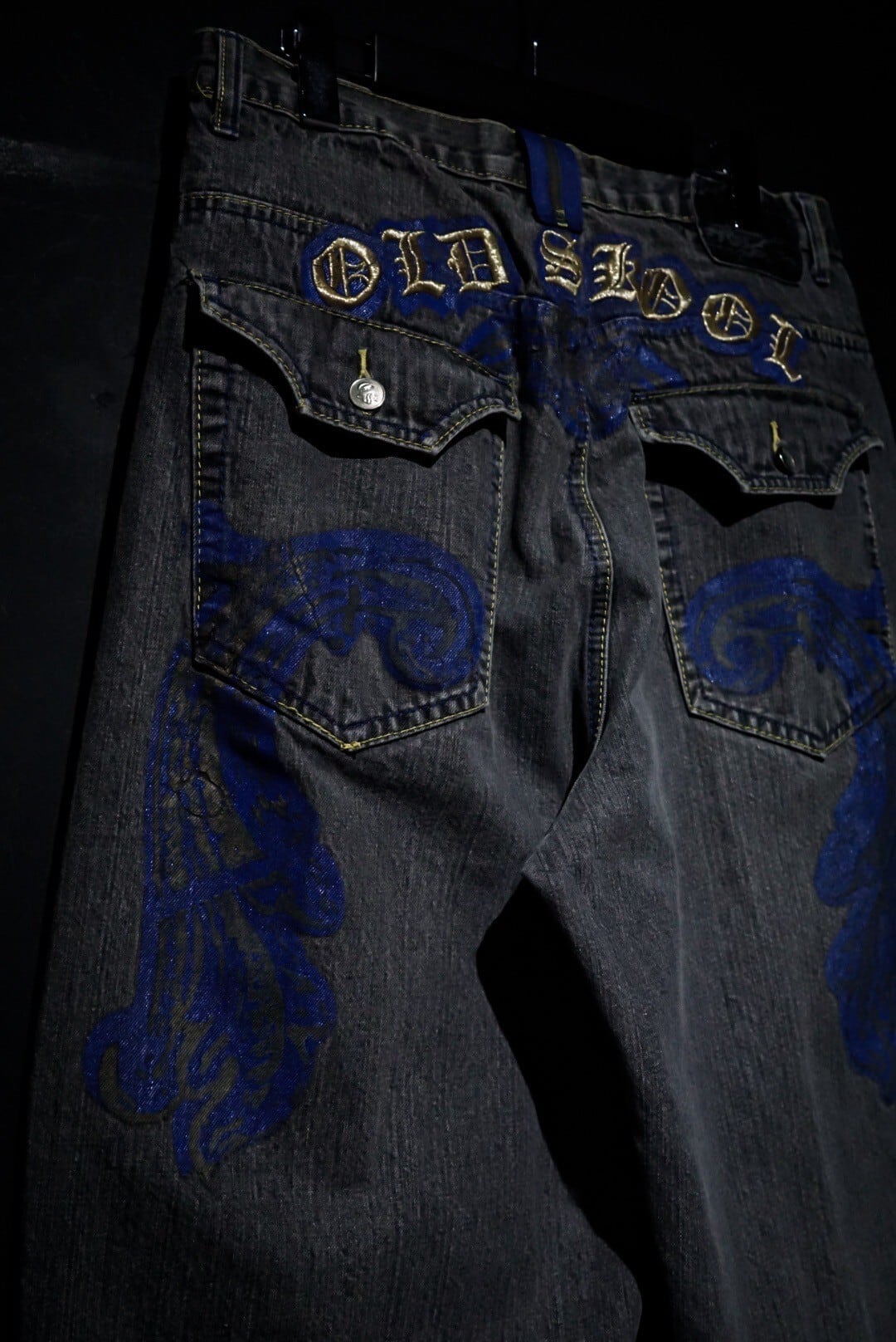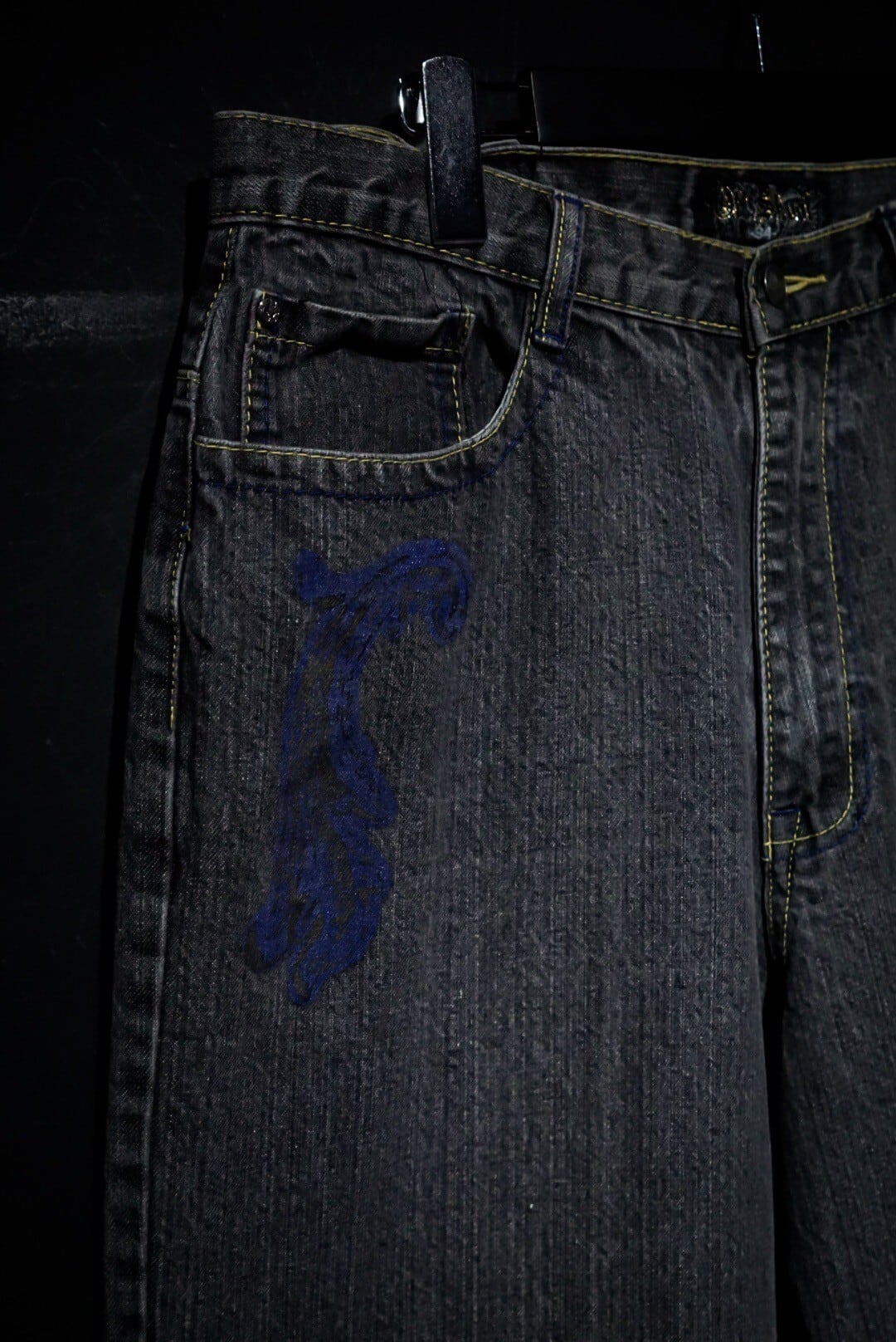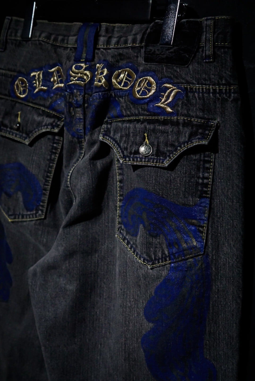 フェード感の美しいグレーのデニムのボディに、背面にはオールドイングリッシュの自体でブランドネームを、両面のポケット付近にブルーのカラーリングでペイズリー調のペイントを施したバギーデニムパンツ。