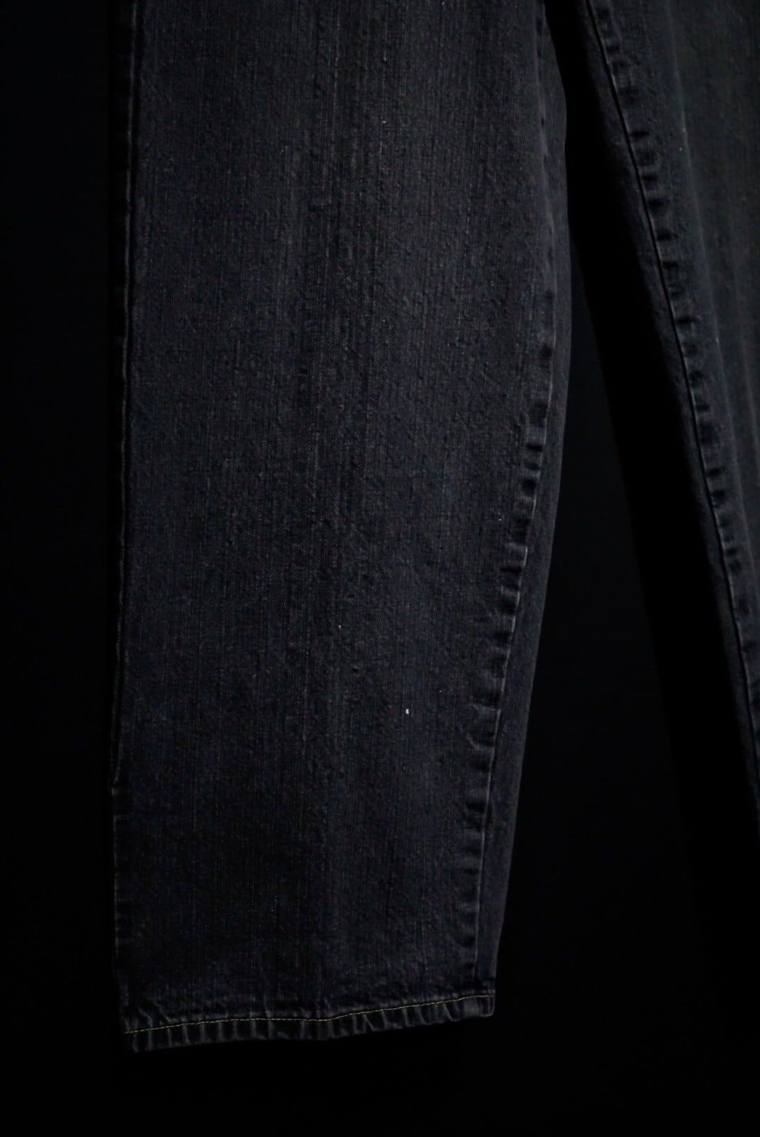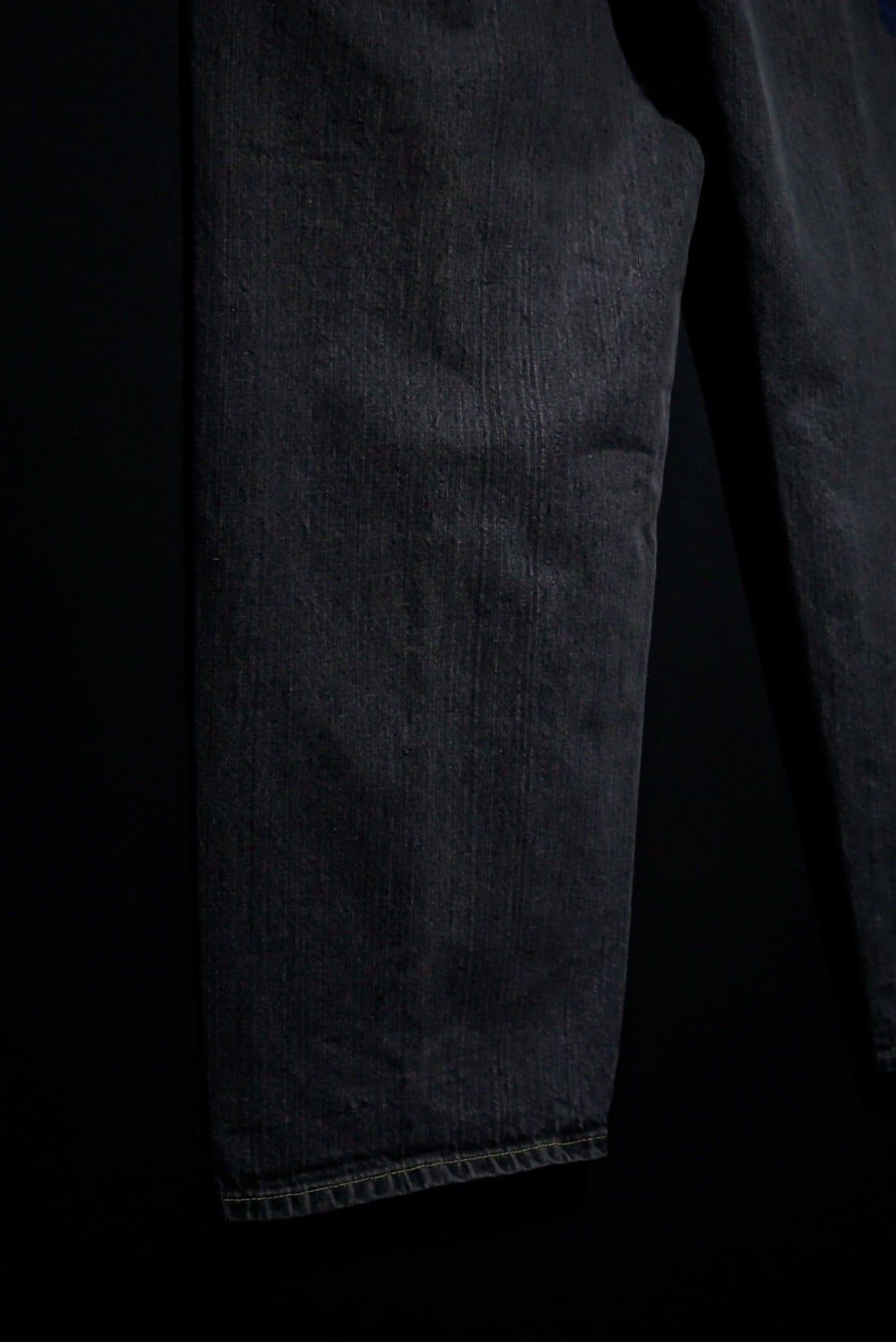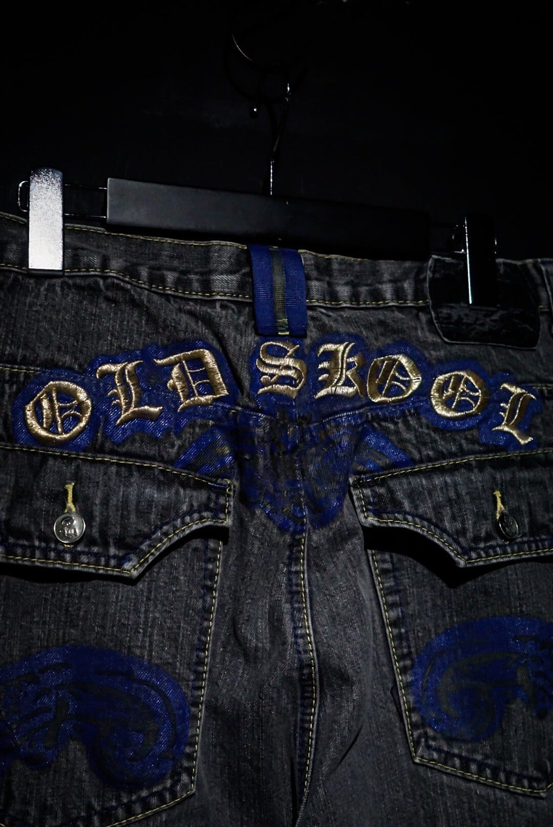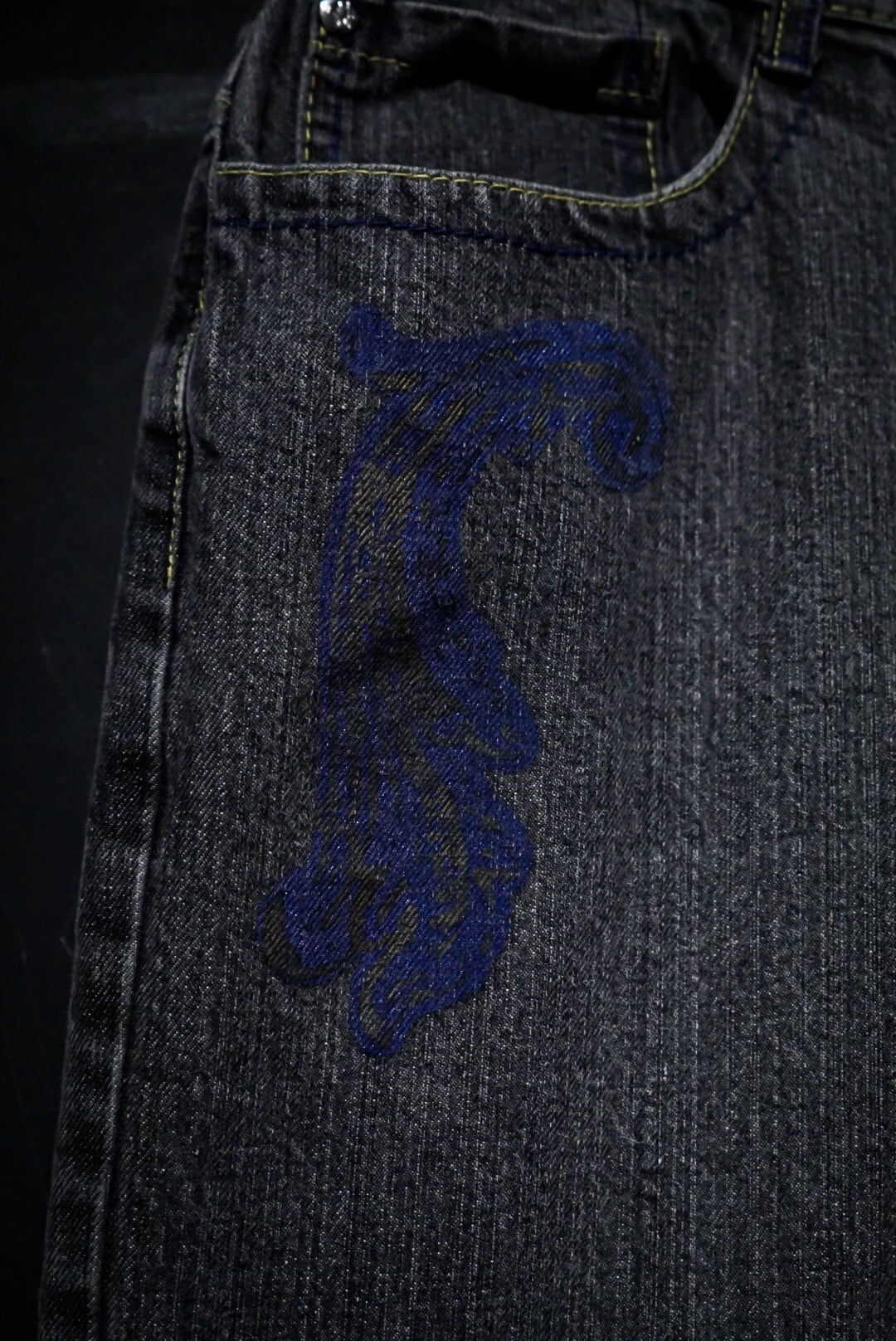 フェード感の美しいグレーのデニムのボディに、背面にはオールドイングリッシュの自体でブランドネームを、両面のポケット付近にブルーのカラーリングでペイズリー調のペイントを施したバギーデニムパンツ。
