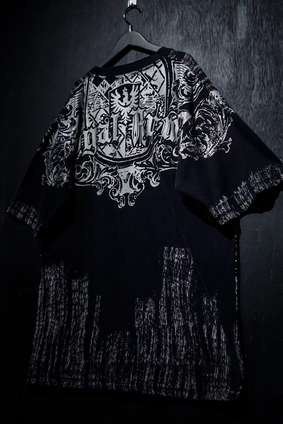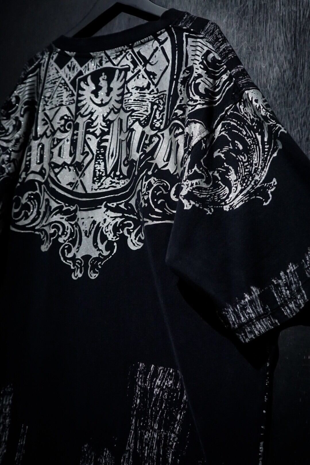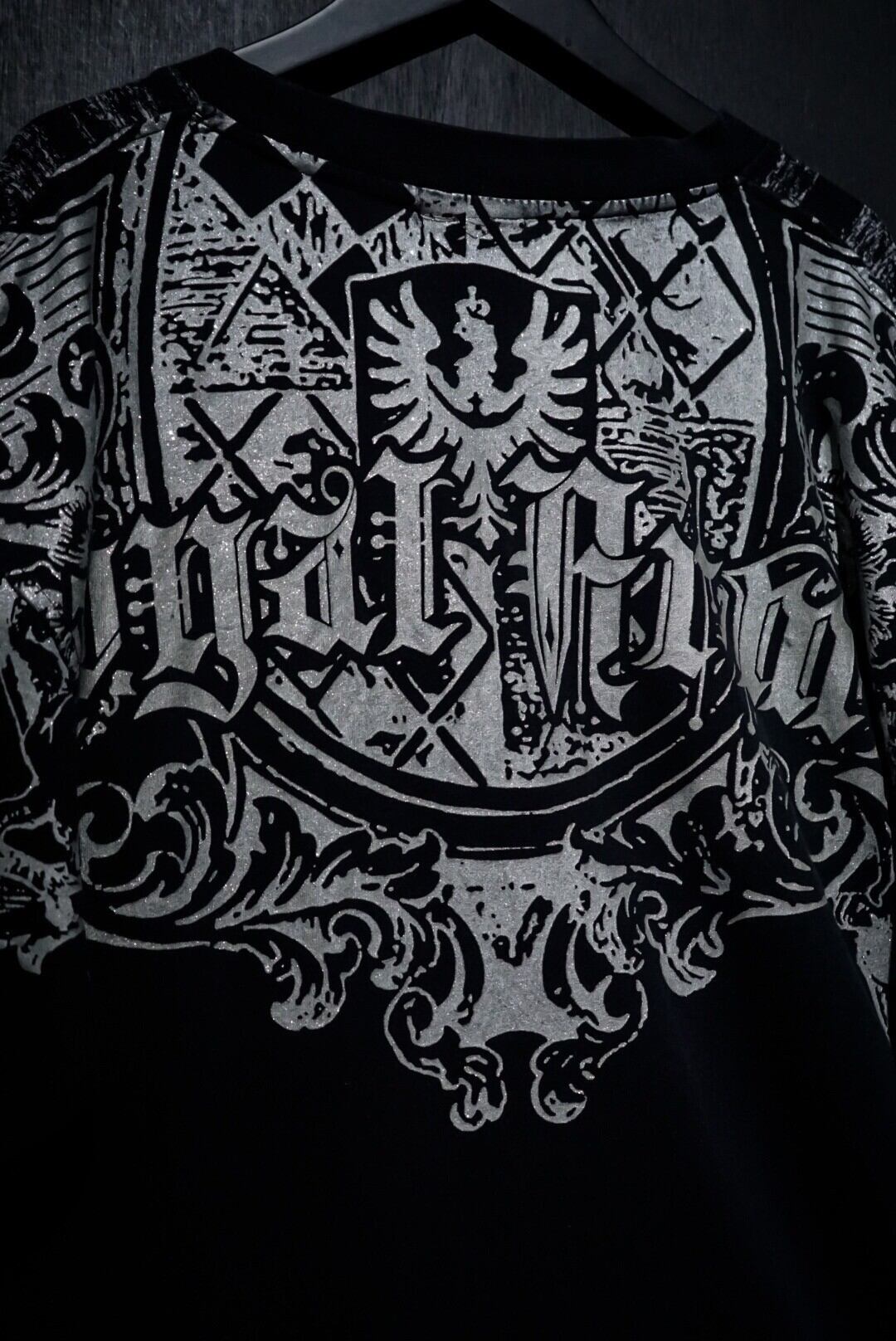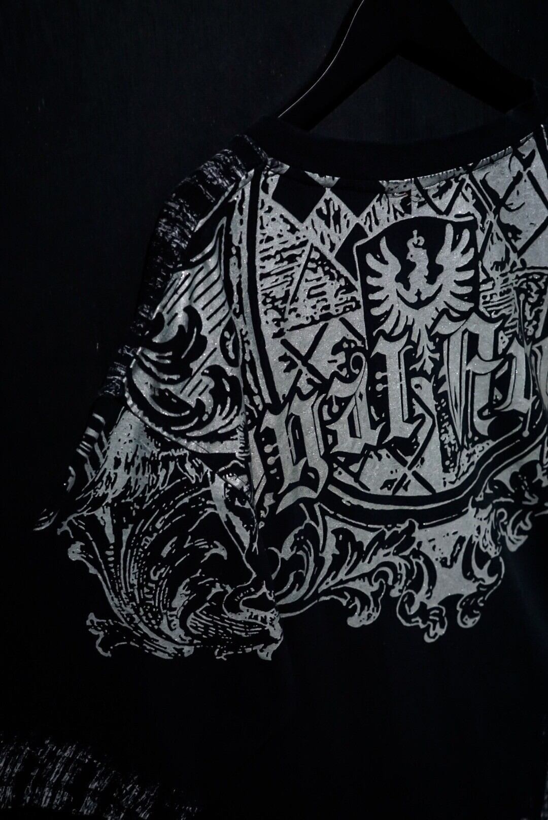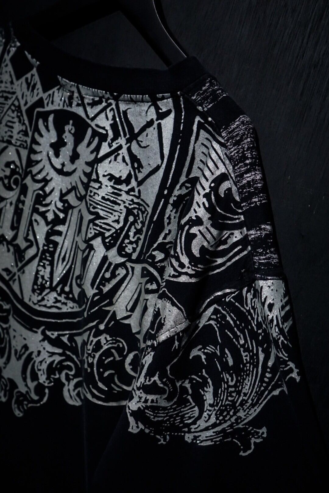 ブラックのボディをベースに、ダークな雰囲気漂うゴシック調のデザインをラメプリントで載せたTシャツ。
