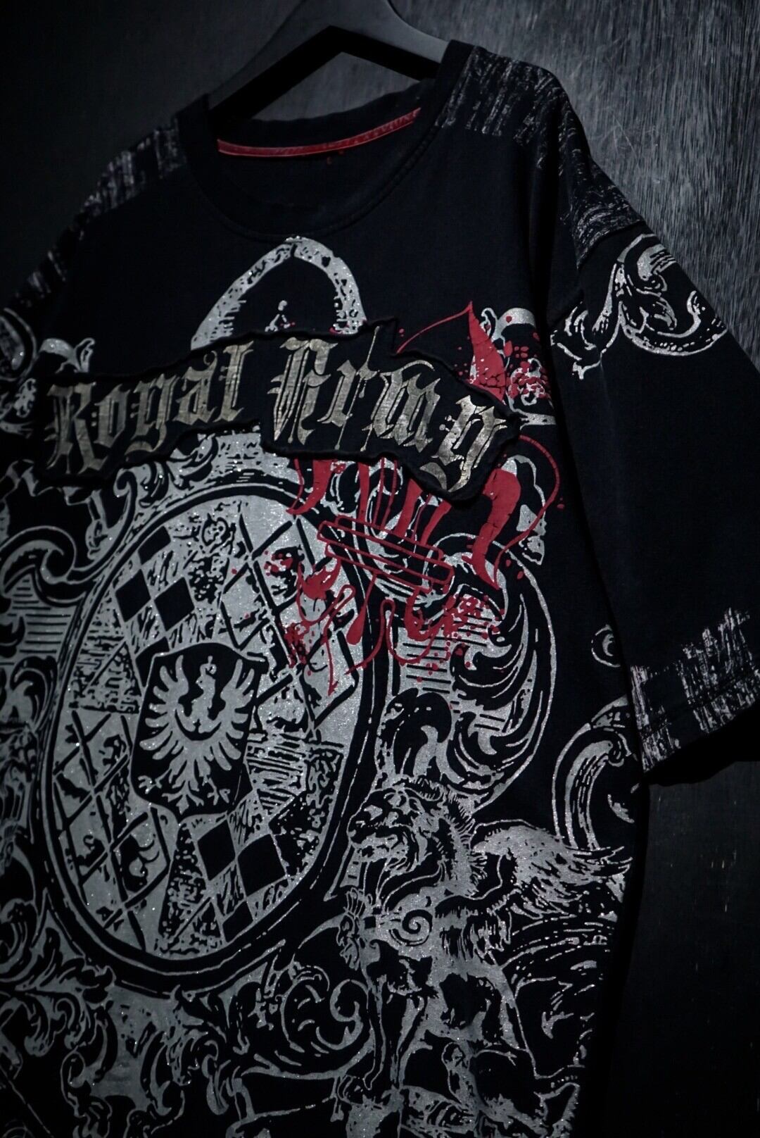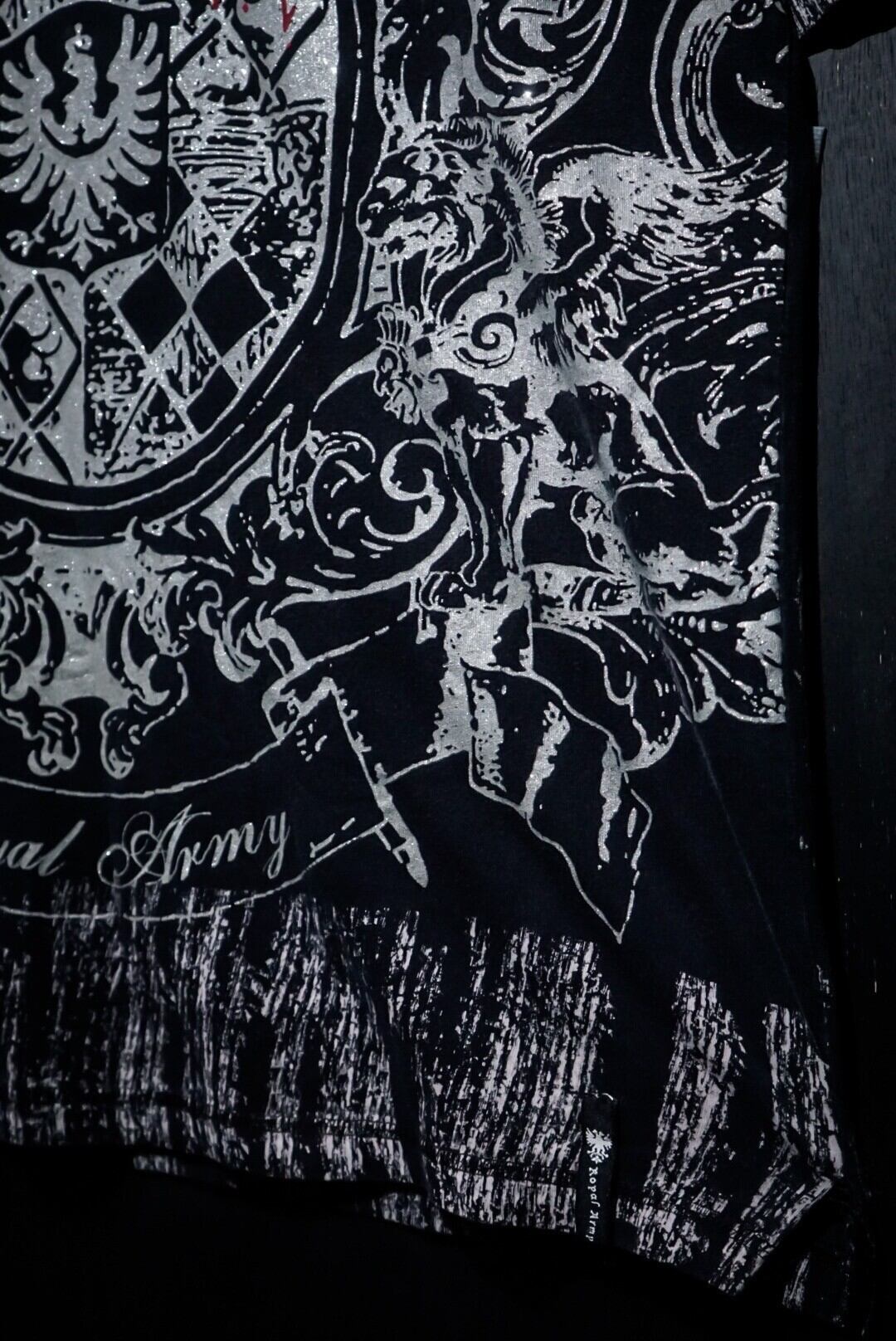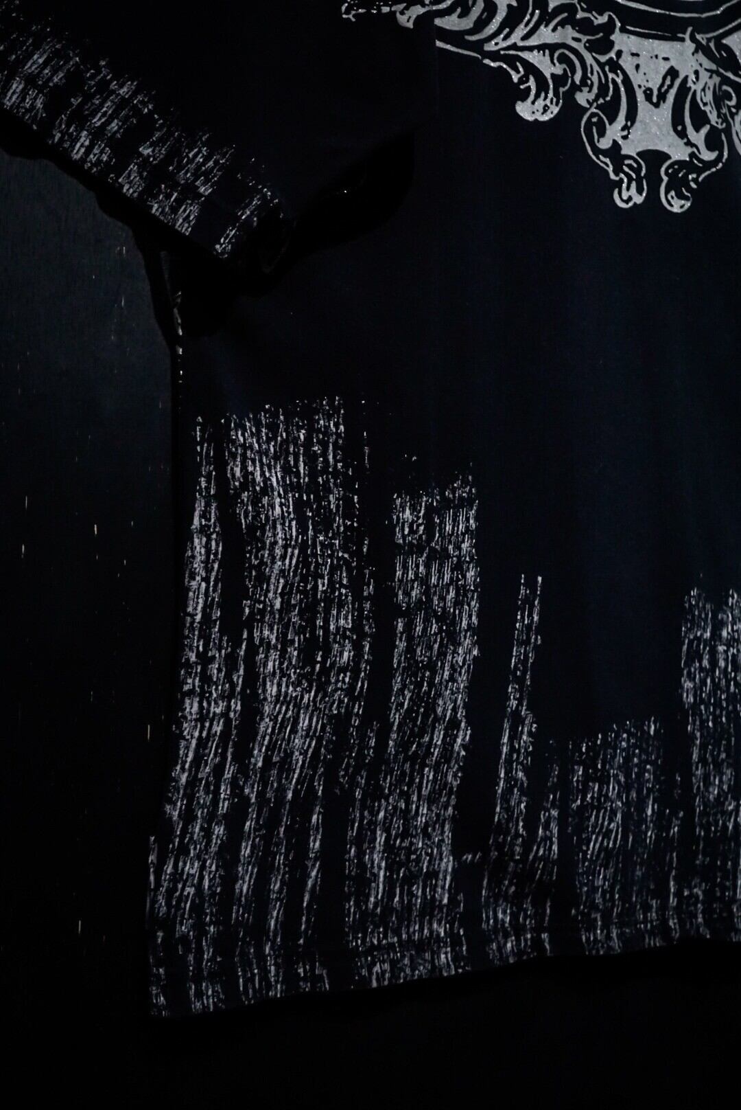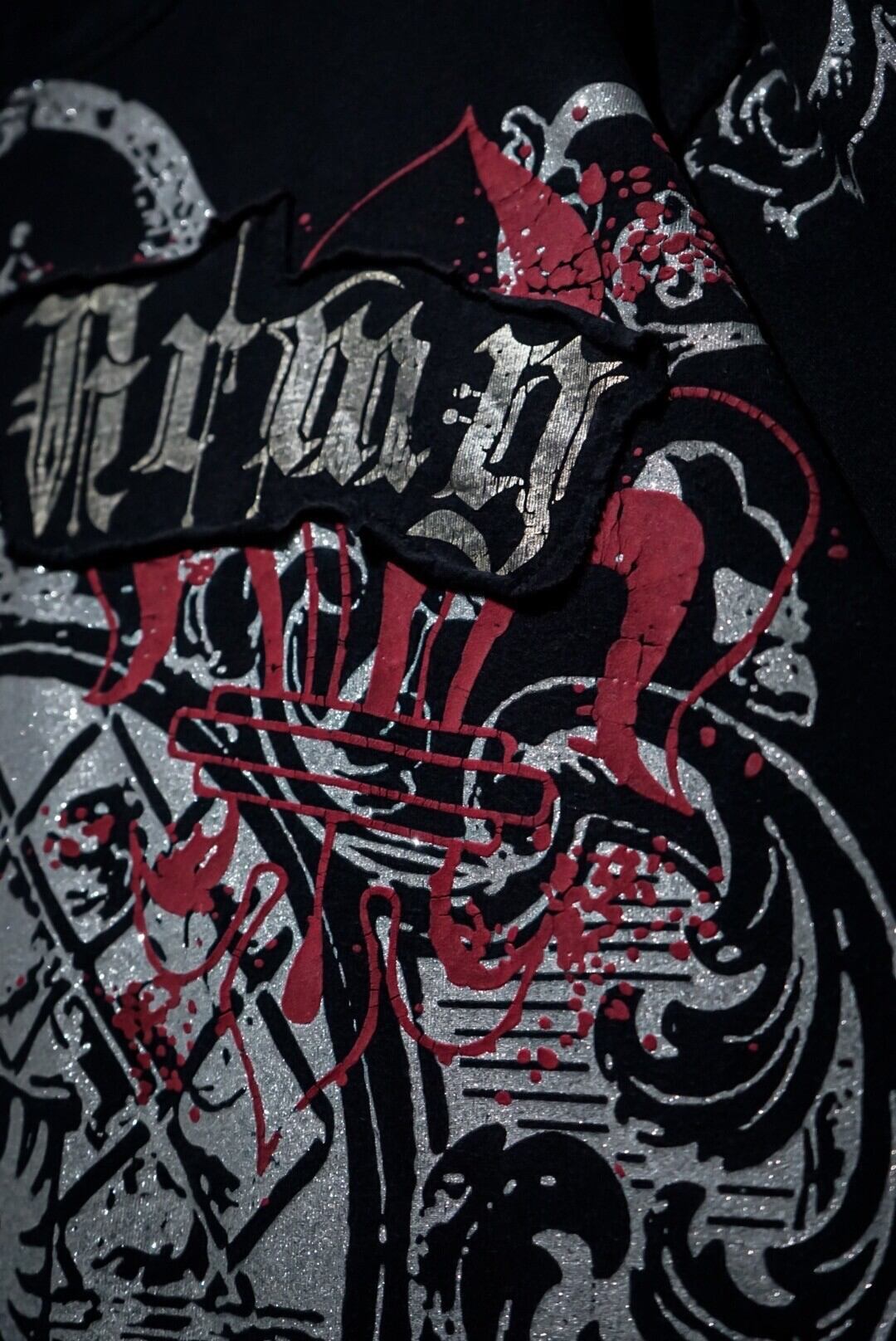 ブラックのボディをベースに、ダークな雰囲気漂うゴシック調のデザインをラメプリントで載せたTシャツ。