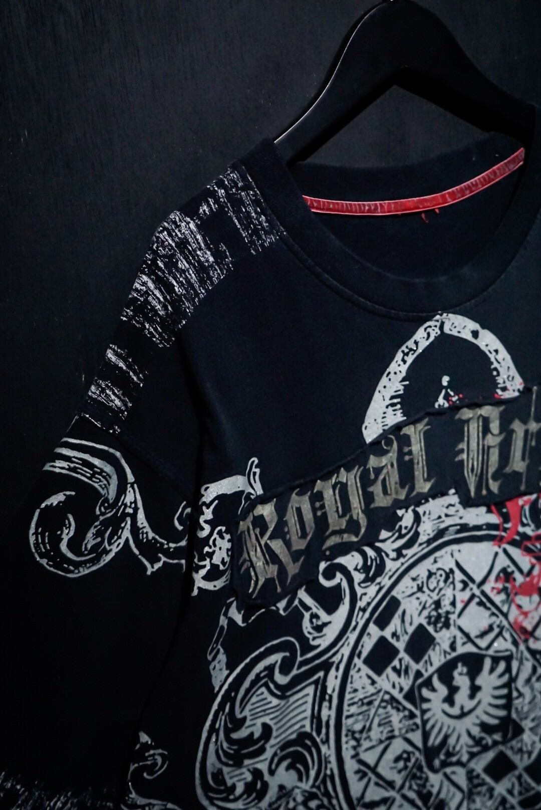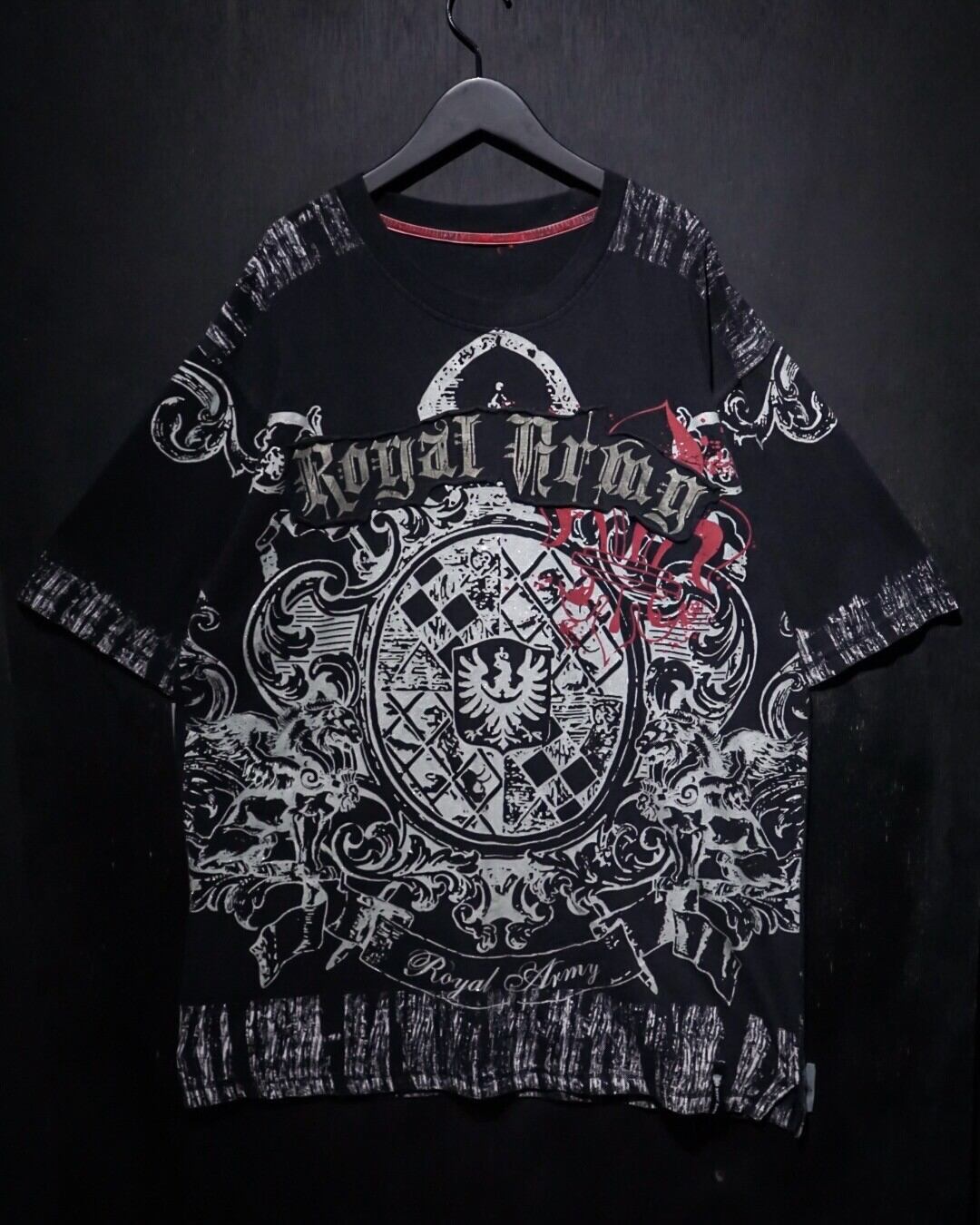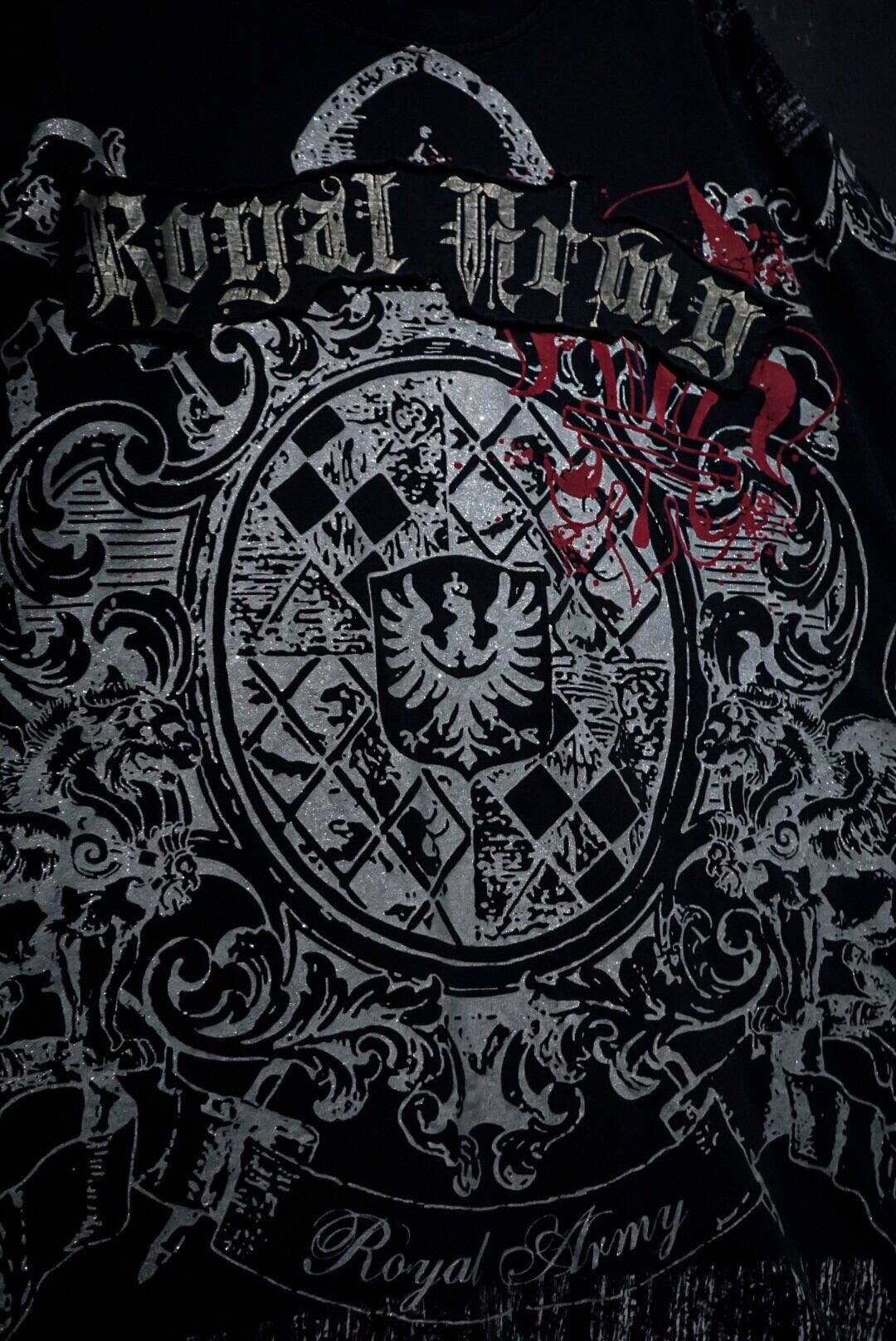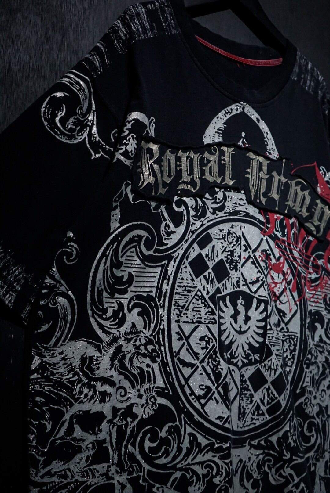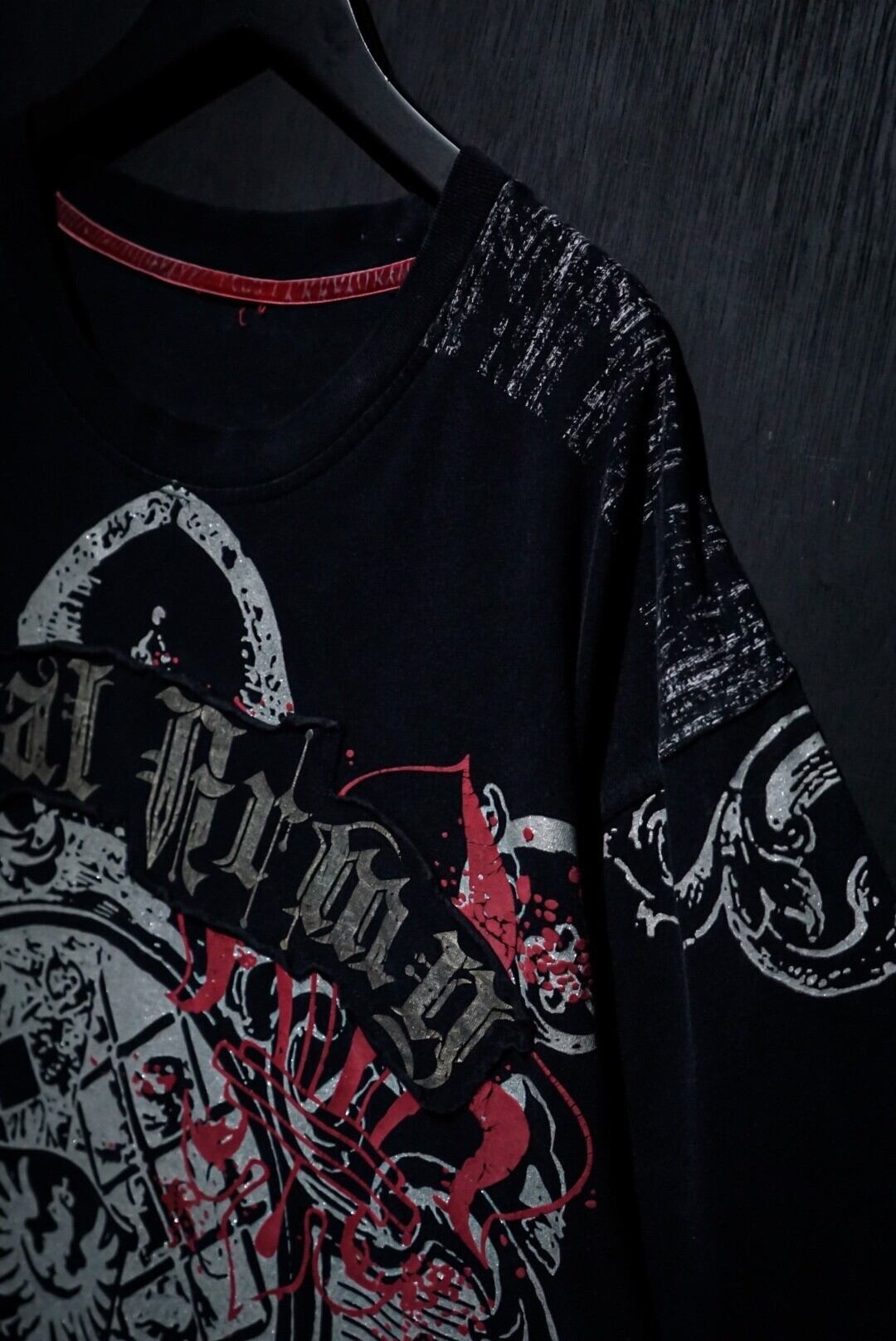 ブラックのボディをベースに、ダークな雰囲気漂うゴシック調のデザインをラメプリントで載せたTシャツ。