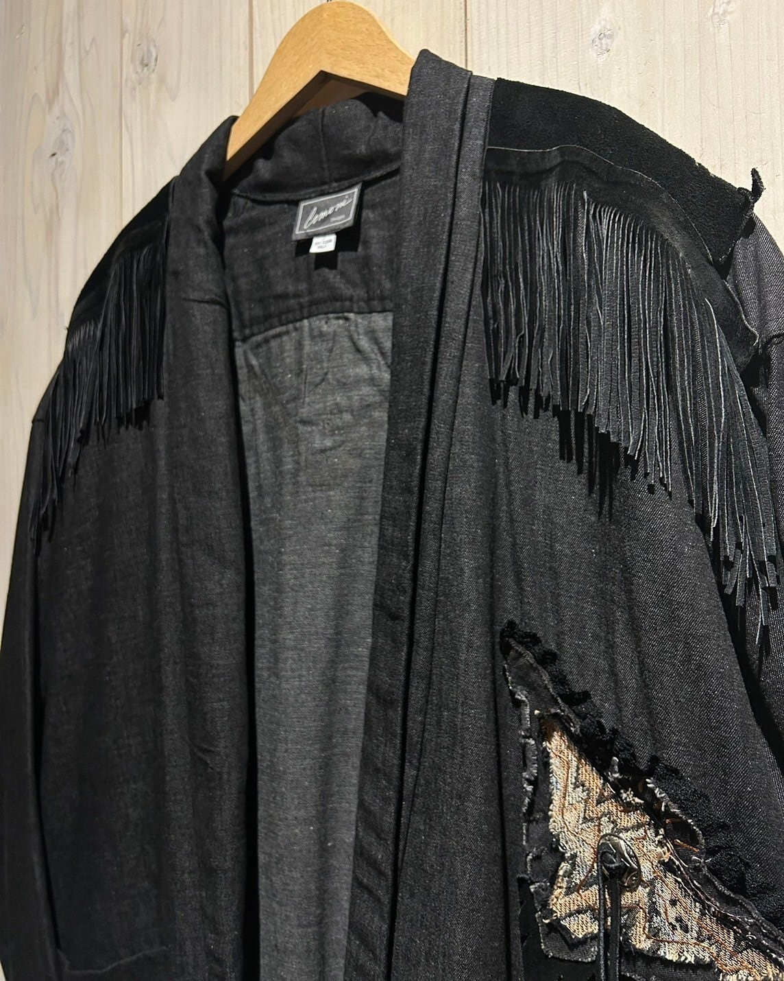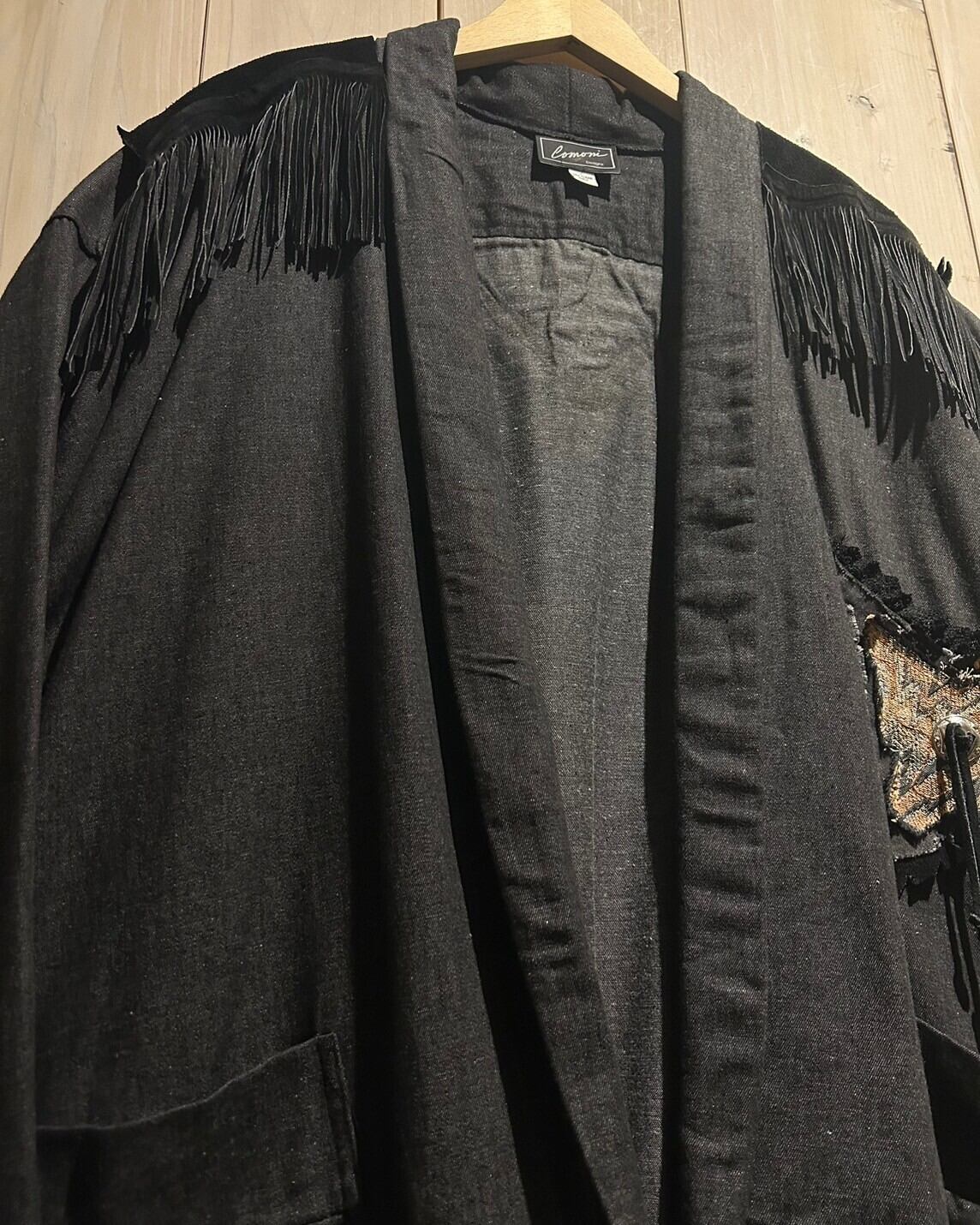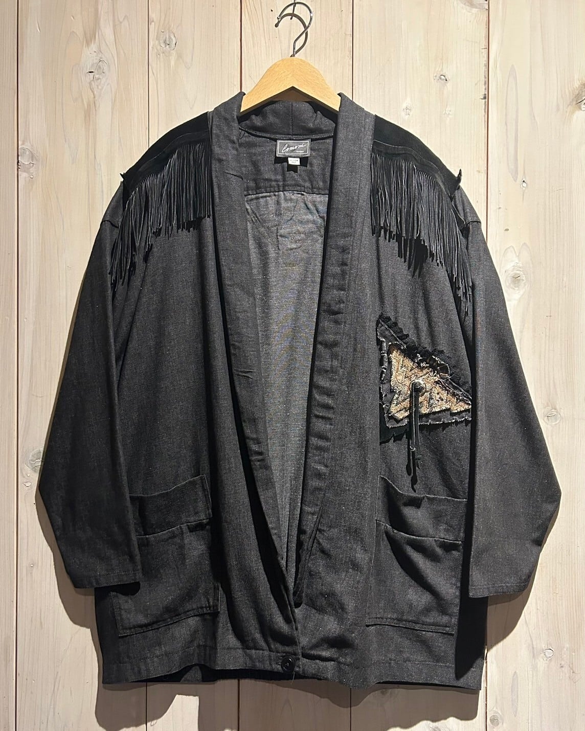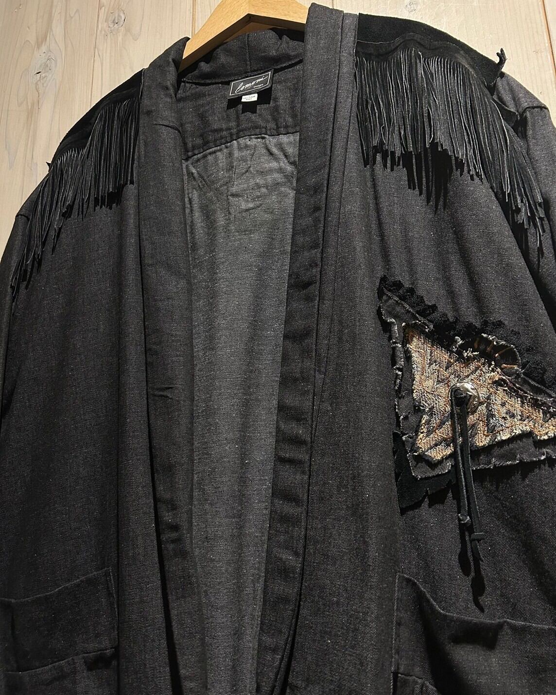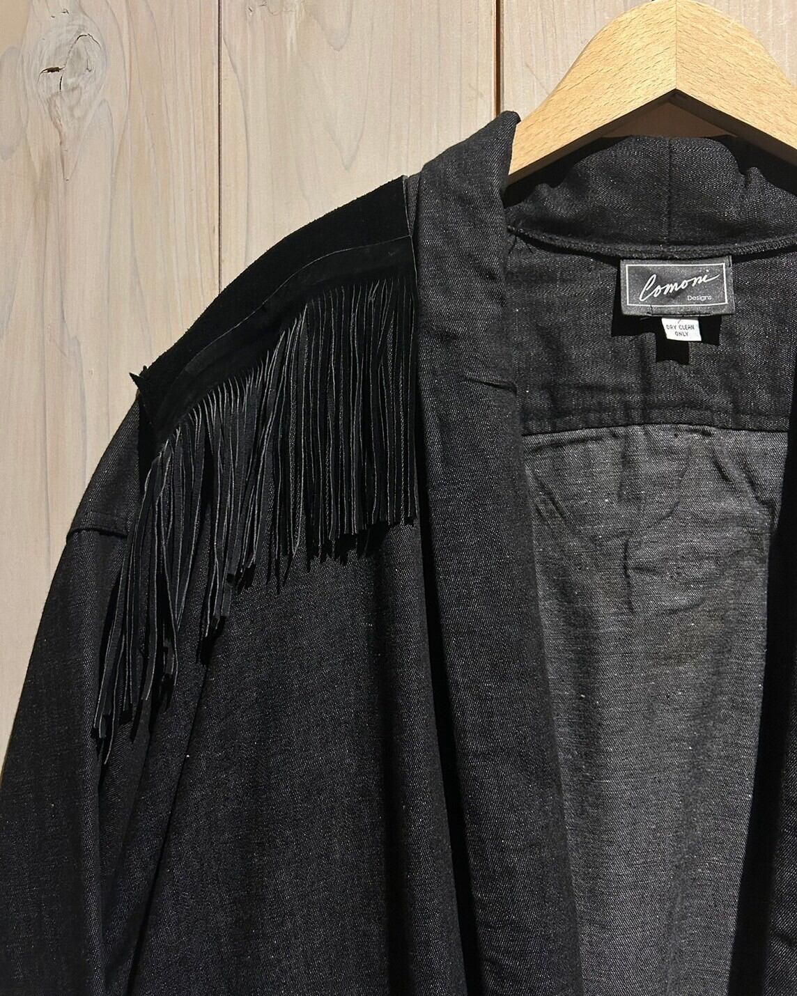 落ち着きのあるグレーカラーのコットン素材をベースとし、ヨーク部分にはレザー切り替え、フリンジを落とし込んだ羽織りシャツジャケット。