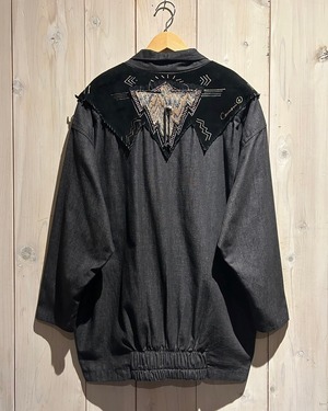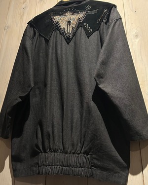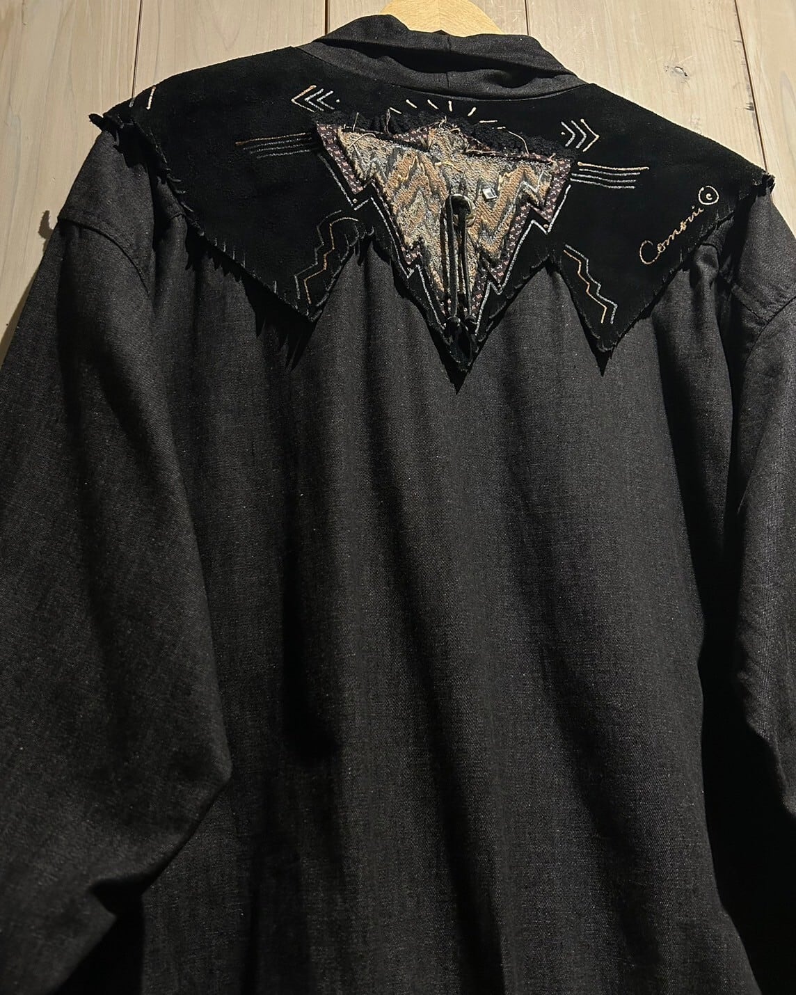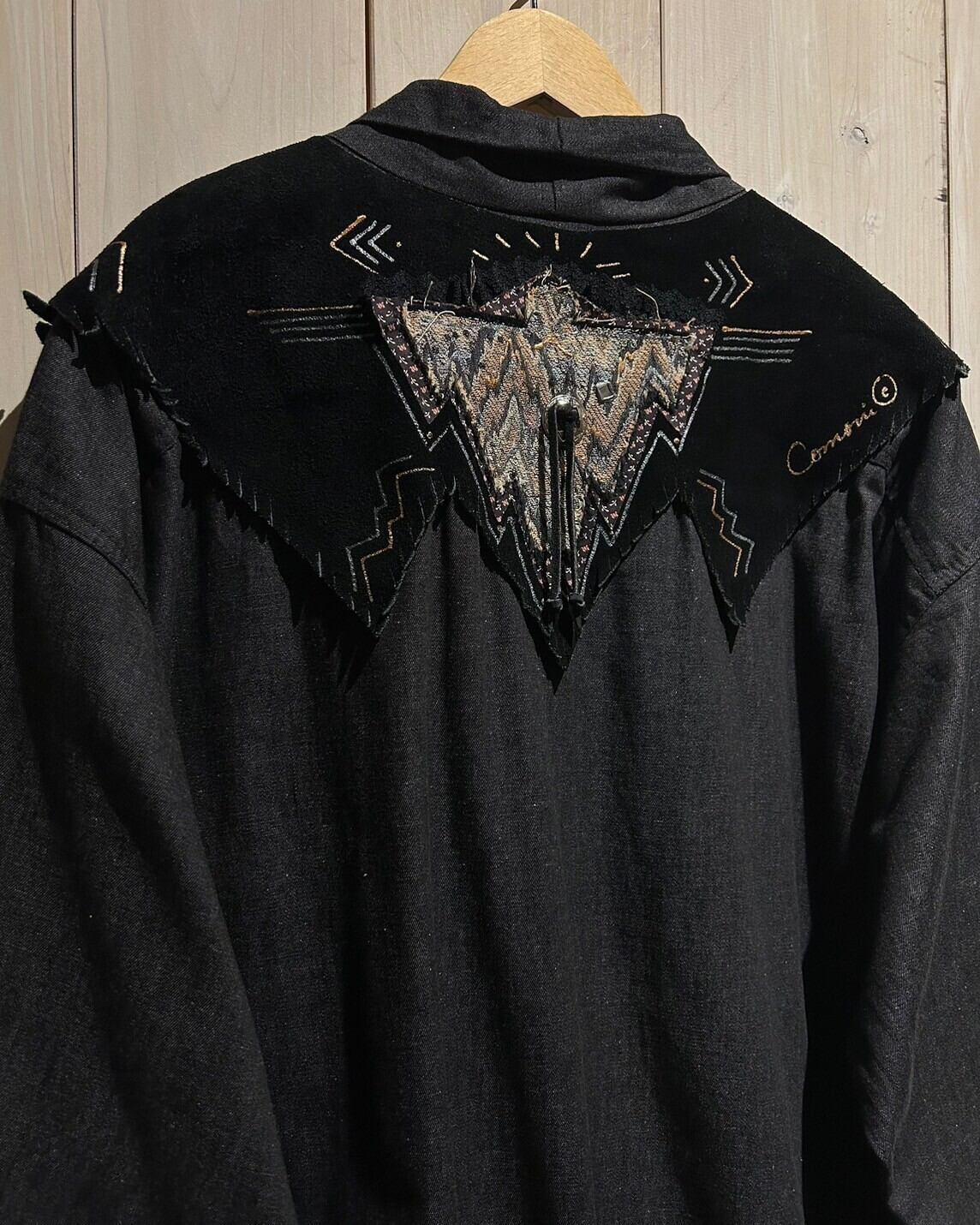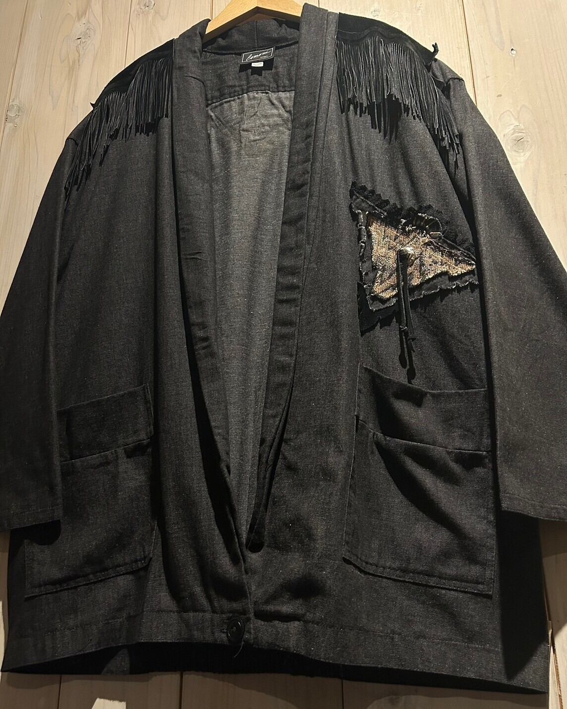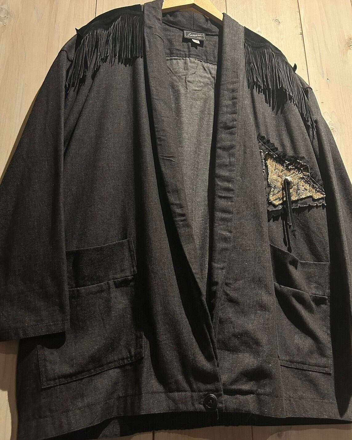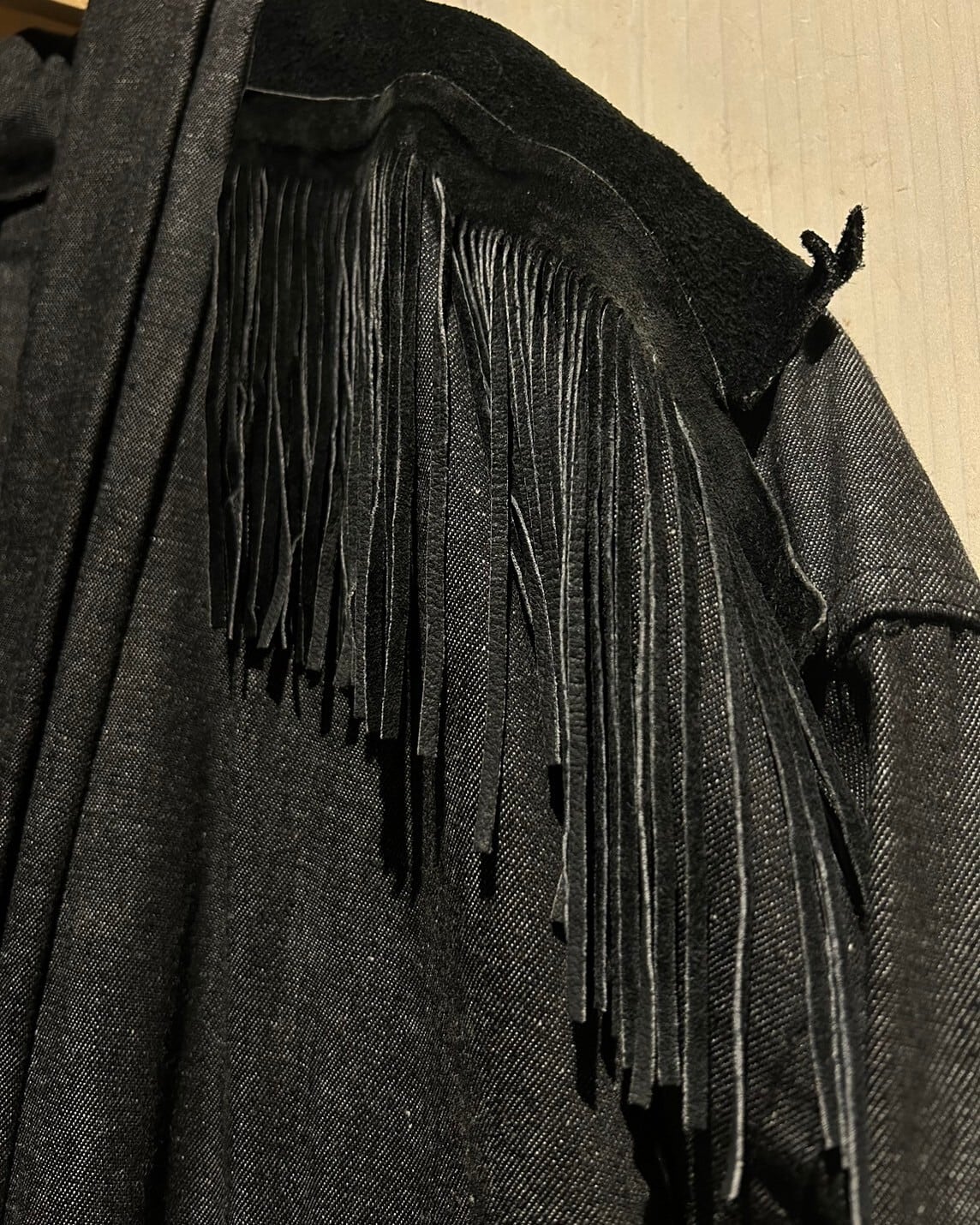 落ち着きのあるグレーカラーのコットン素材をベースとし、ヨーク部分にはレザー切り替え、フリンジを落とし込んだ羽織りシャツジャケット。