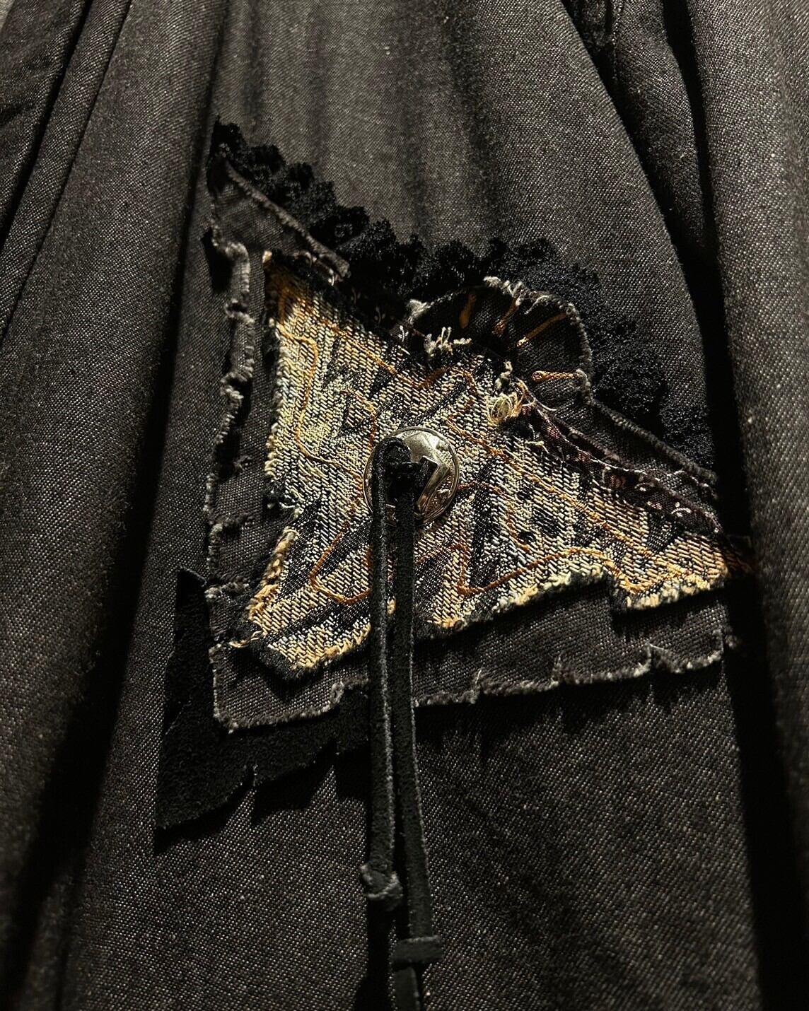 首元背面やフロント一部には、レースやリーフ柄、ジャガード調など複数の生地を重ねて表現したエスニック味のある柄を配置。