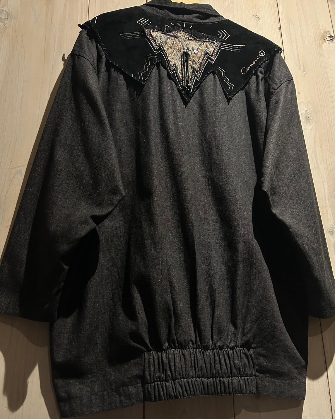 フロントにはポケットを左右に1つずつ取り付け、背面の裾にはゴムを効かせたリブを搭載。身幅、肩幅、アームの広く採られたルーズなサイジングから生まれる陰影の深いドレープもたまりません、、、