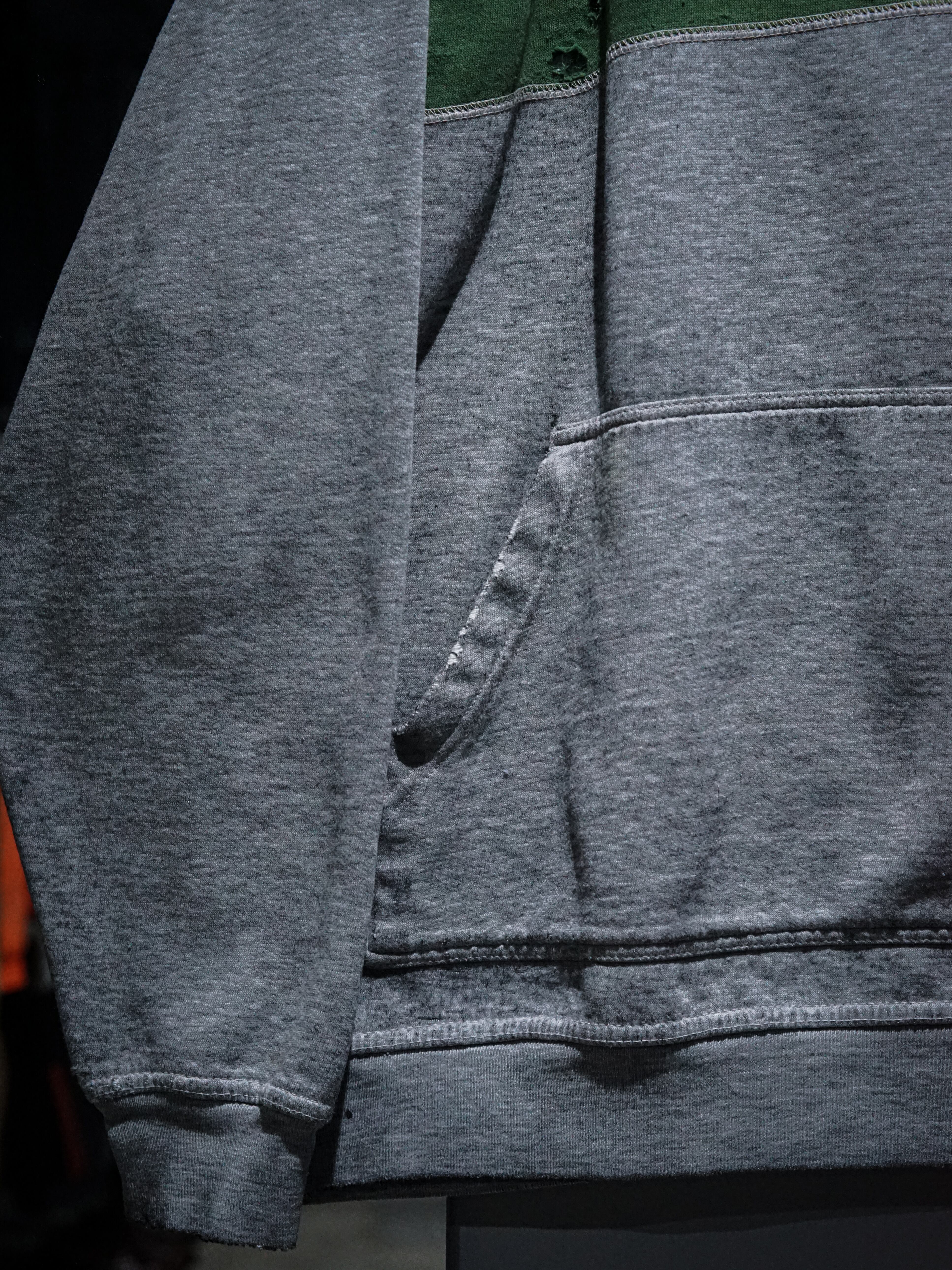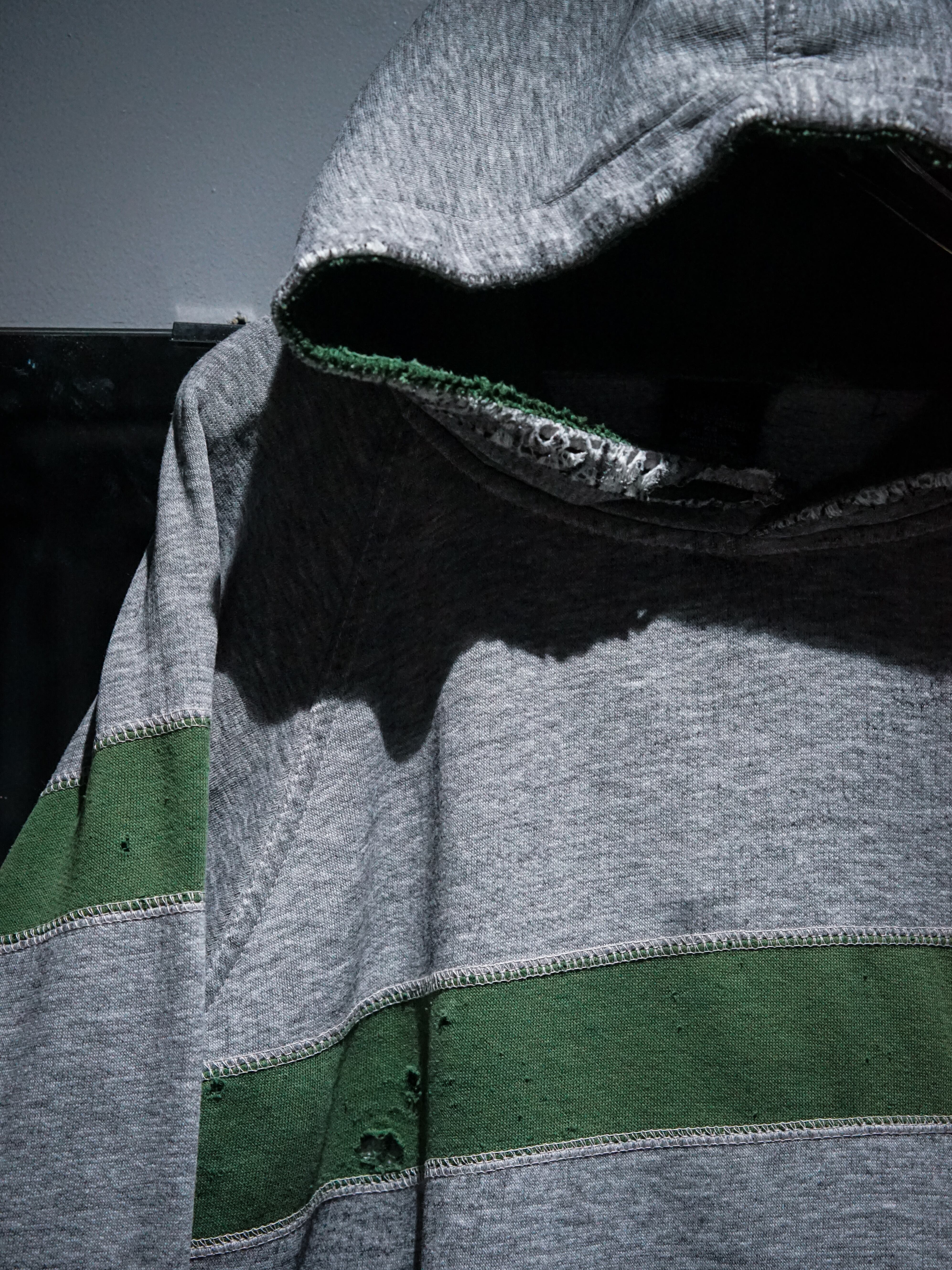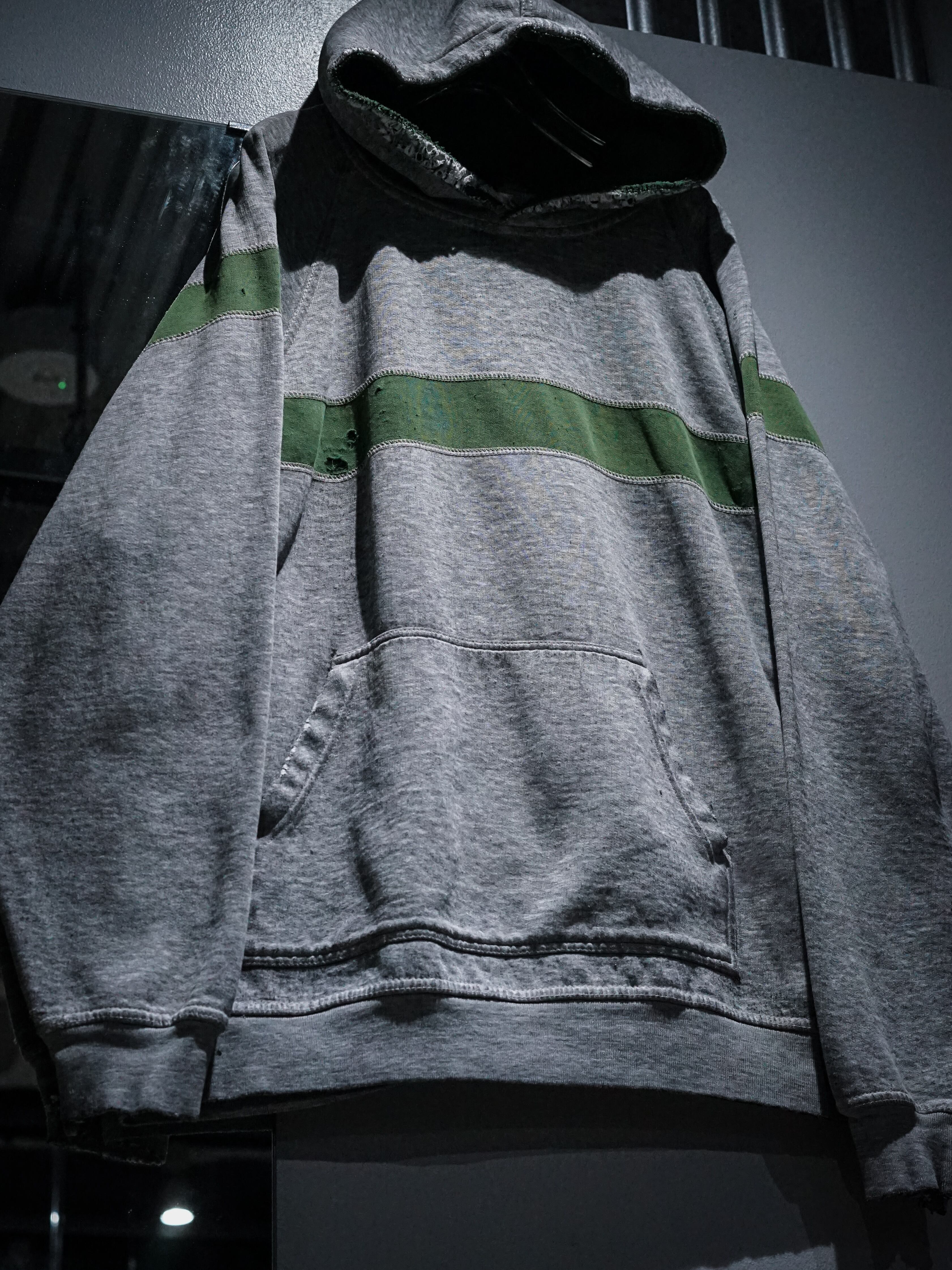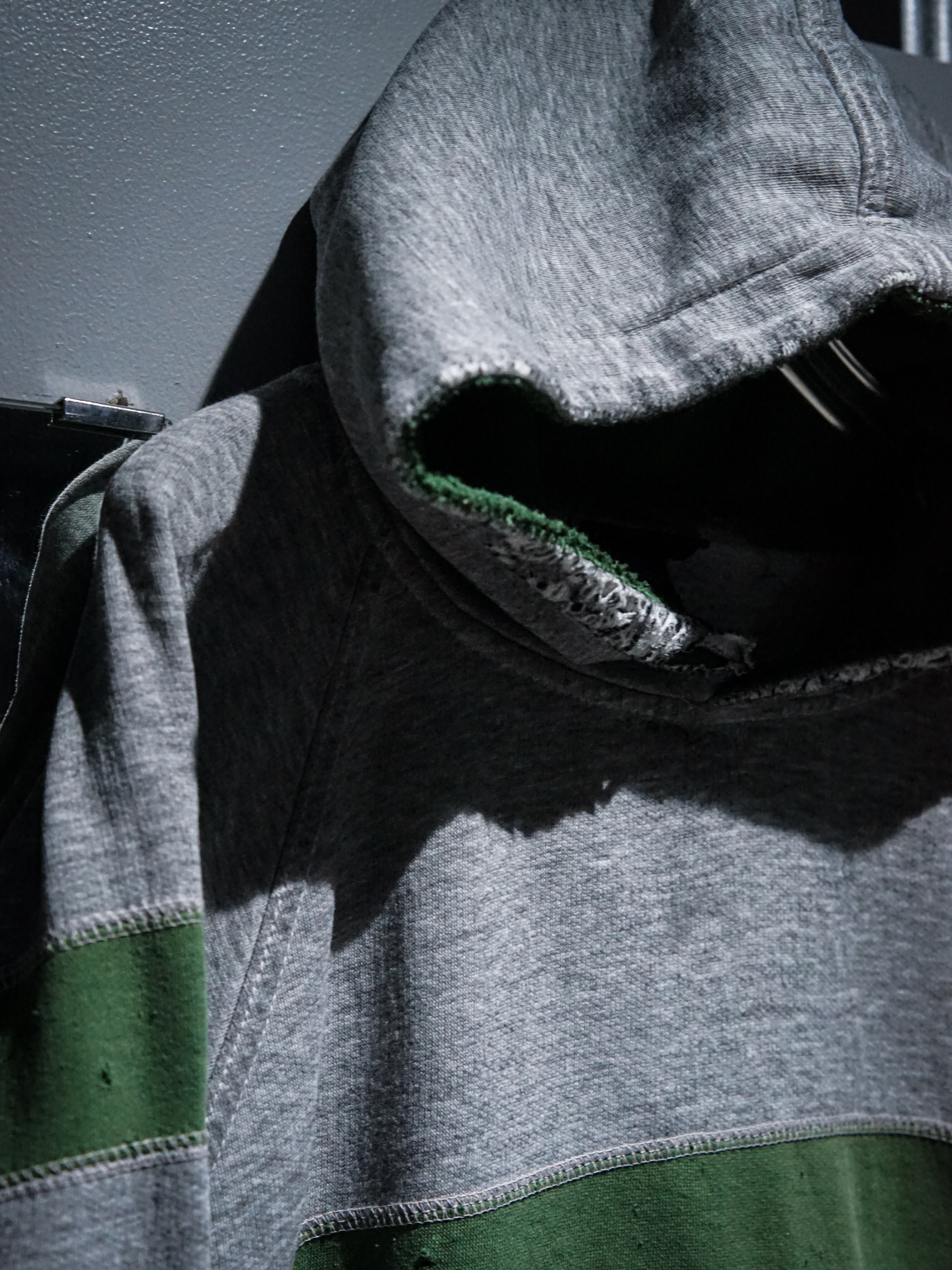 グレーのボディをベースにグリーンのラインを施したシンプルなフーディに、袖口やフーディなどボディの随所が経年変化による"ボロ"い1着。