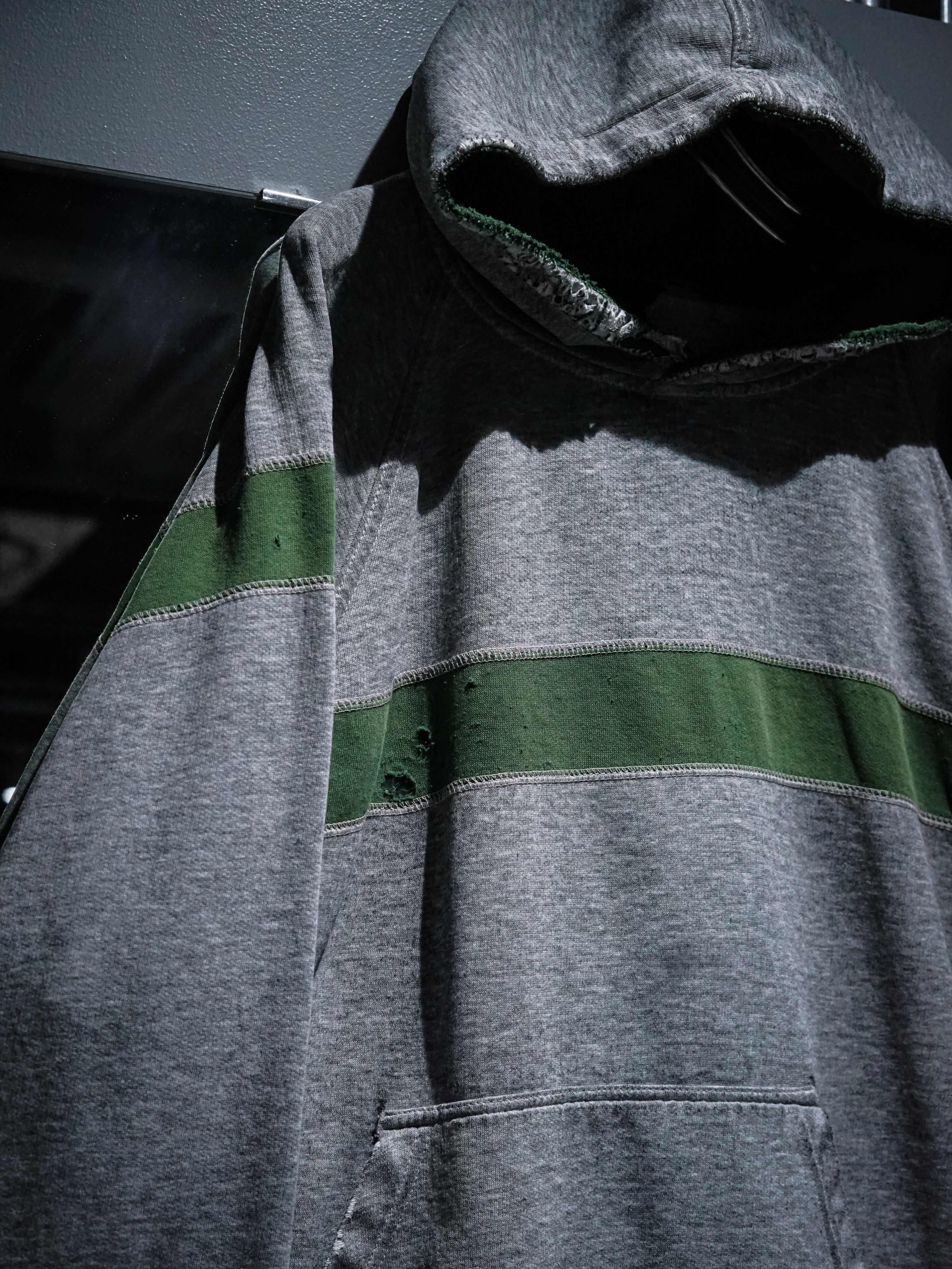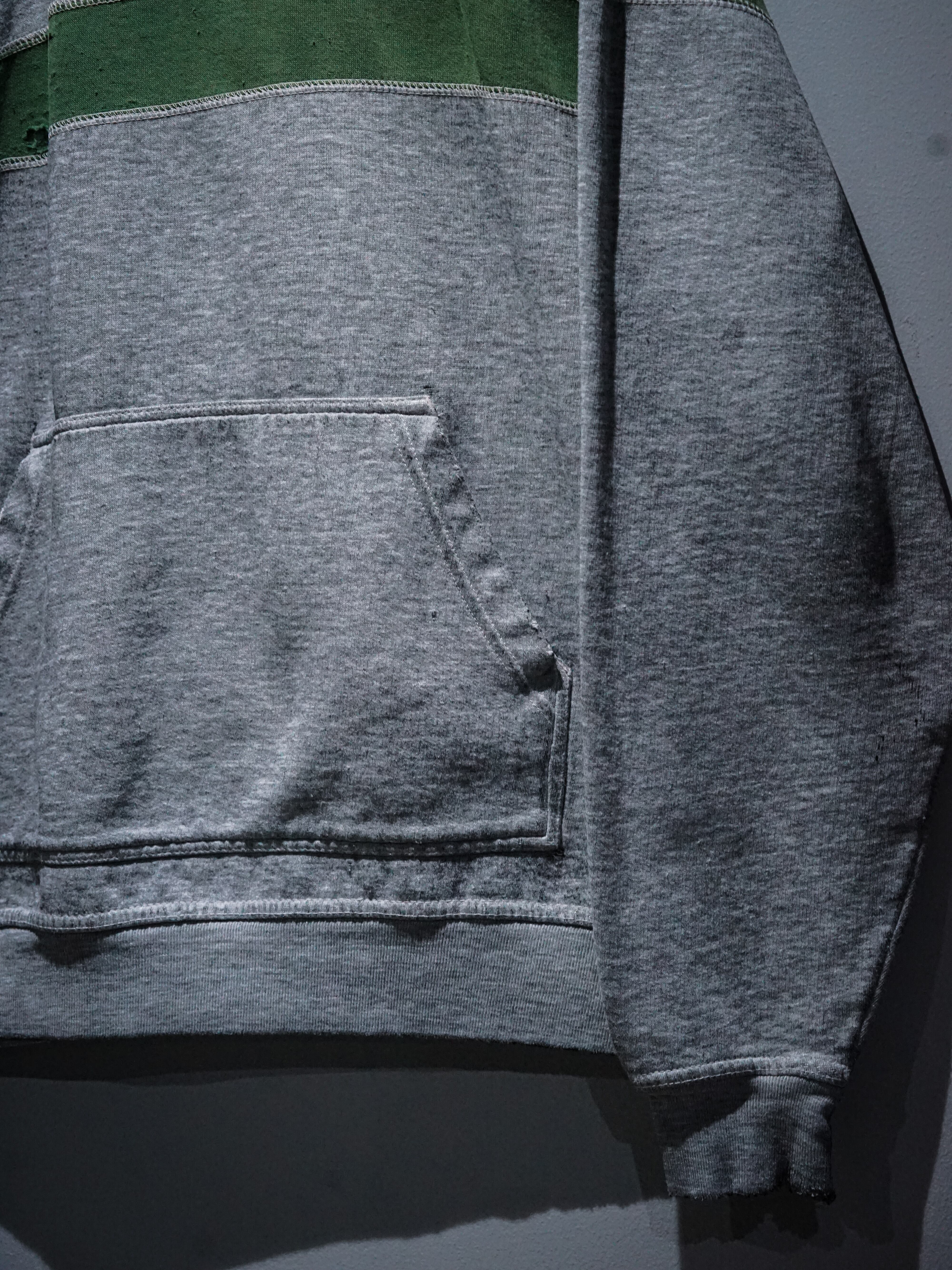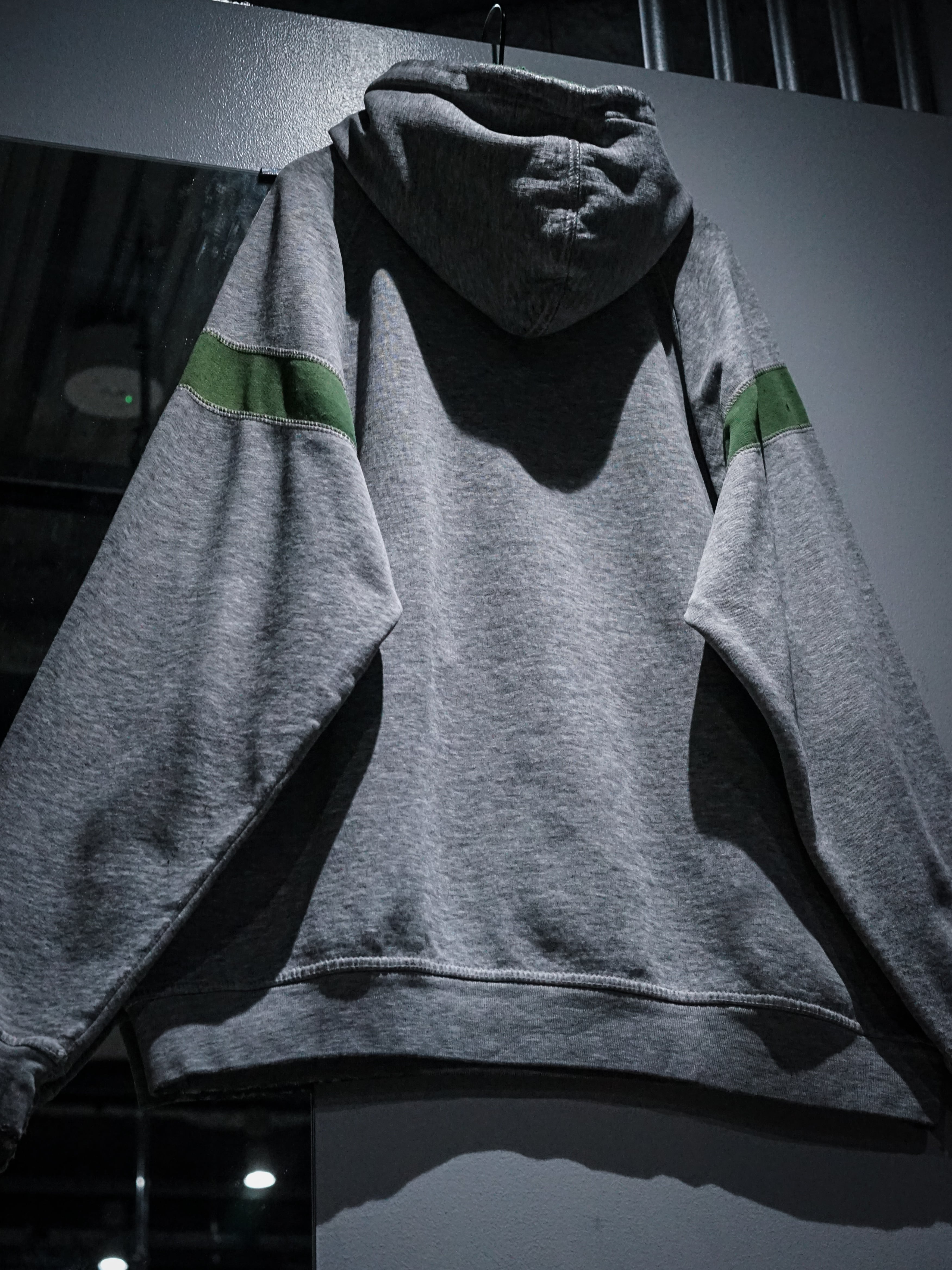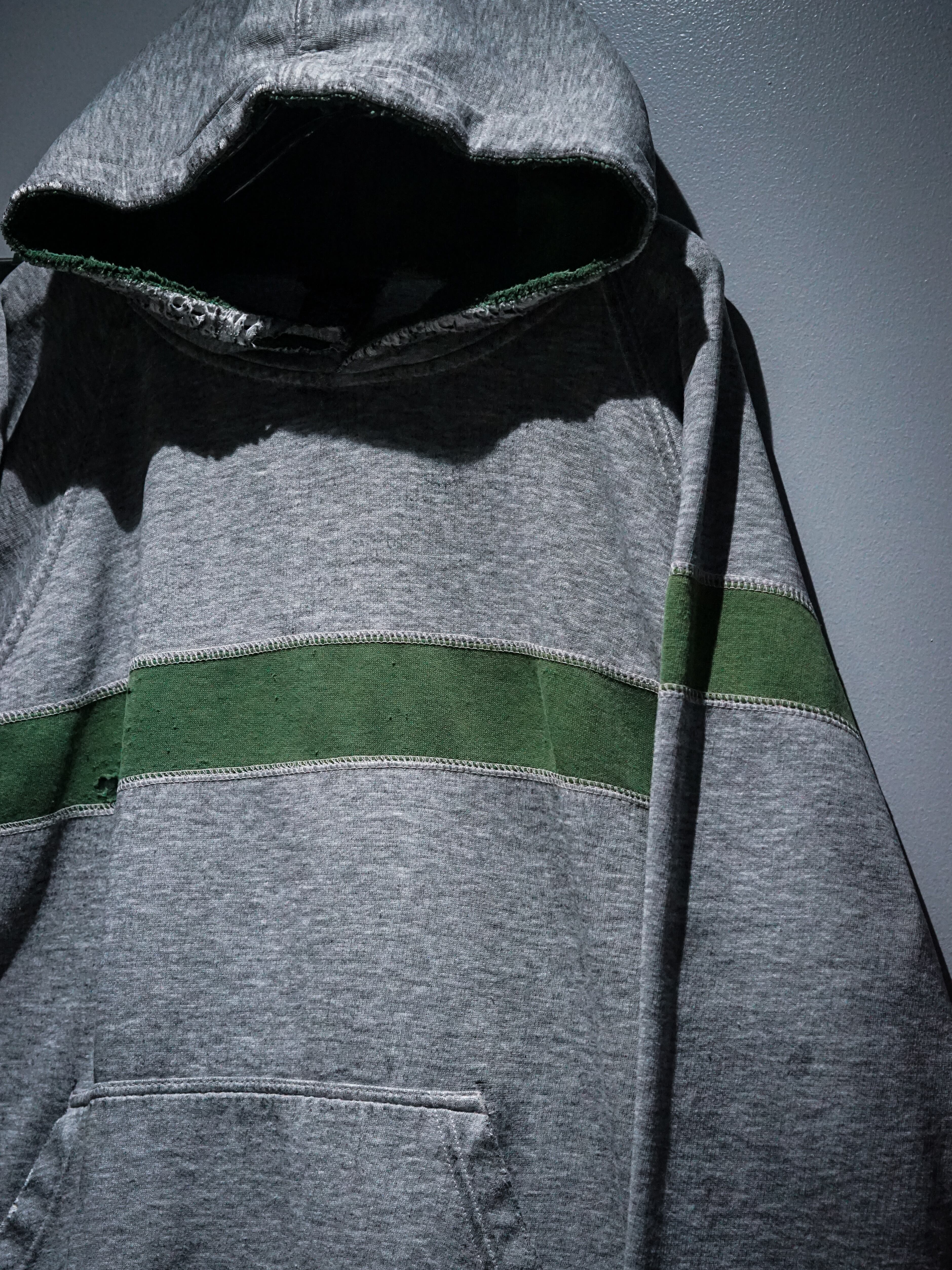 グレーのボディをベースにグリーンのラインを施したシンプルなフーディに、袖口やフーディなどボディの随所が経年変化による"ボロ"い1着。