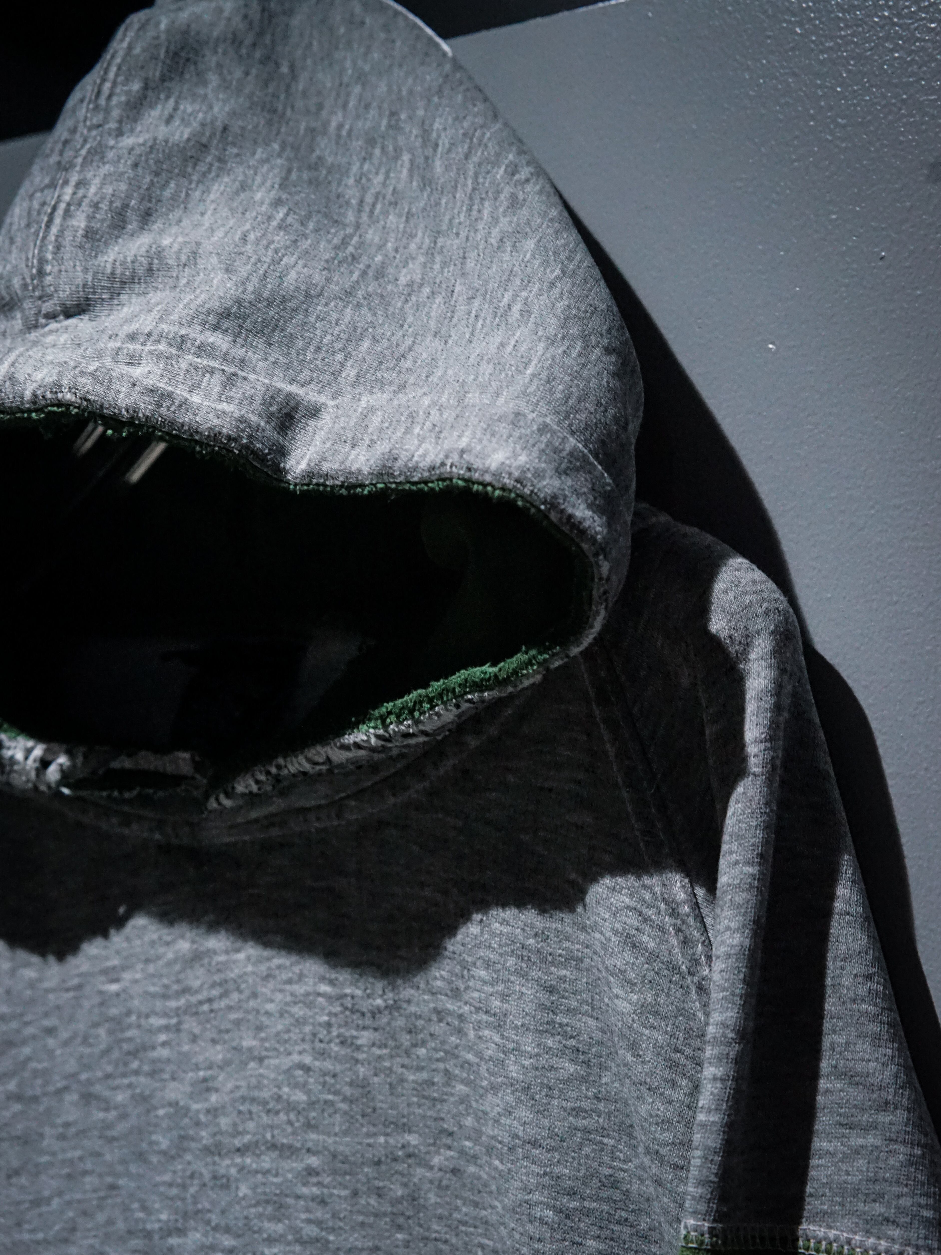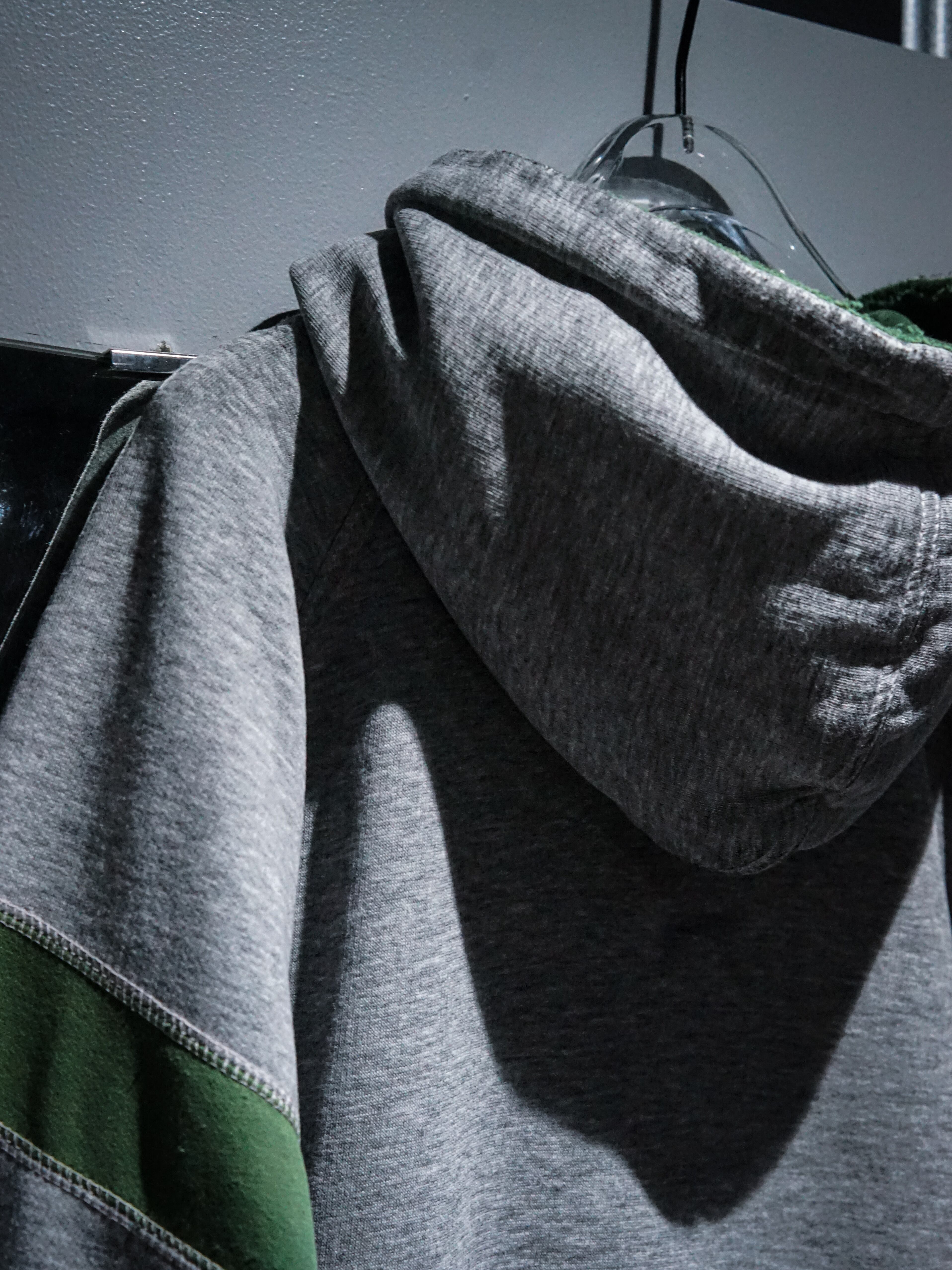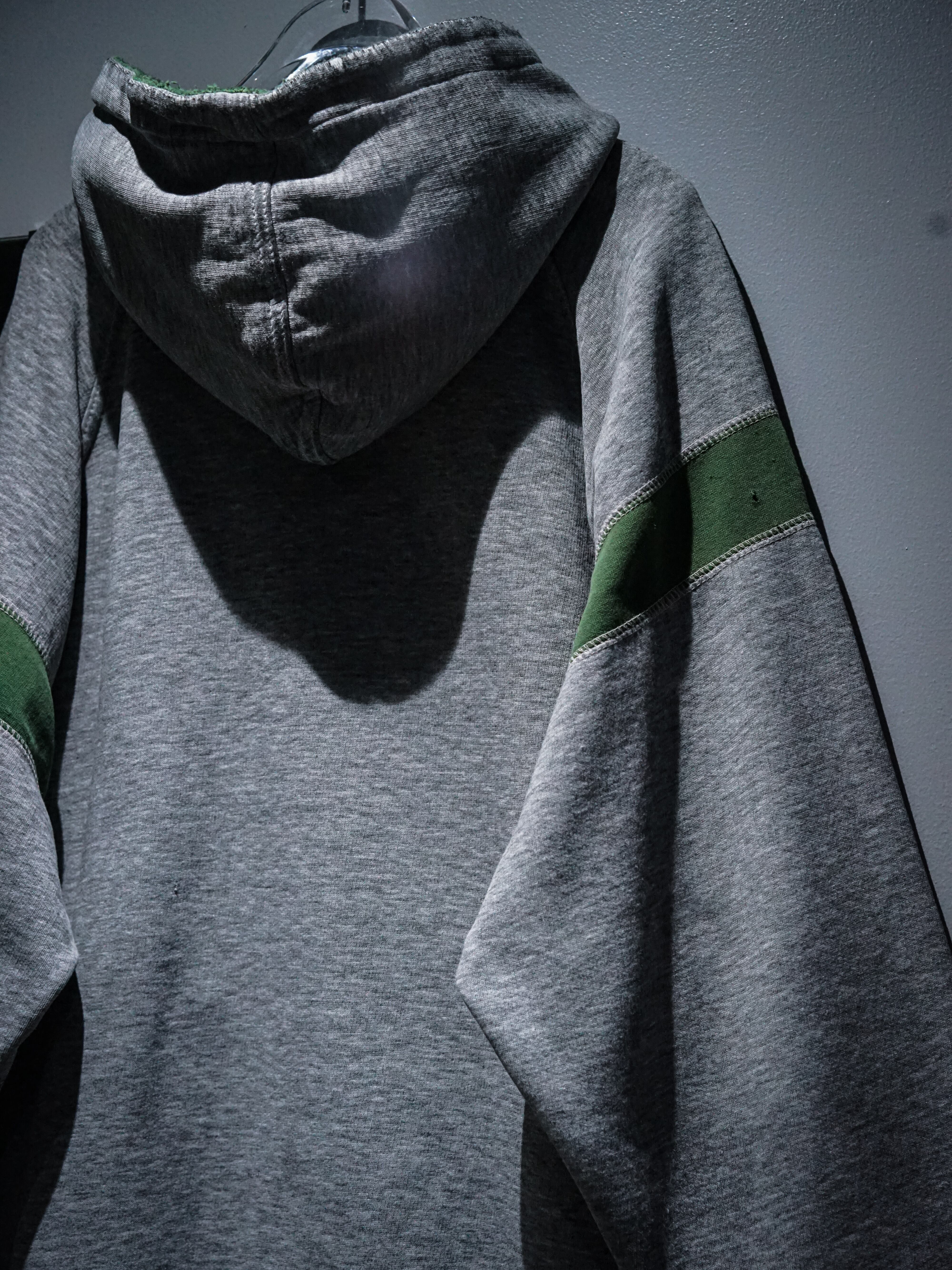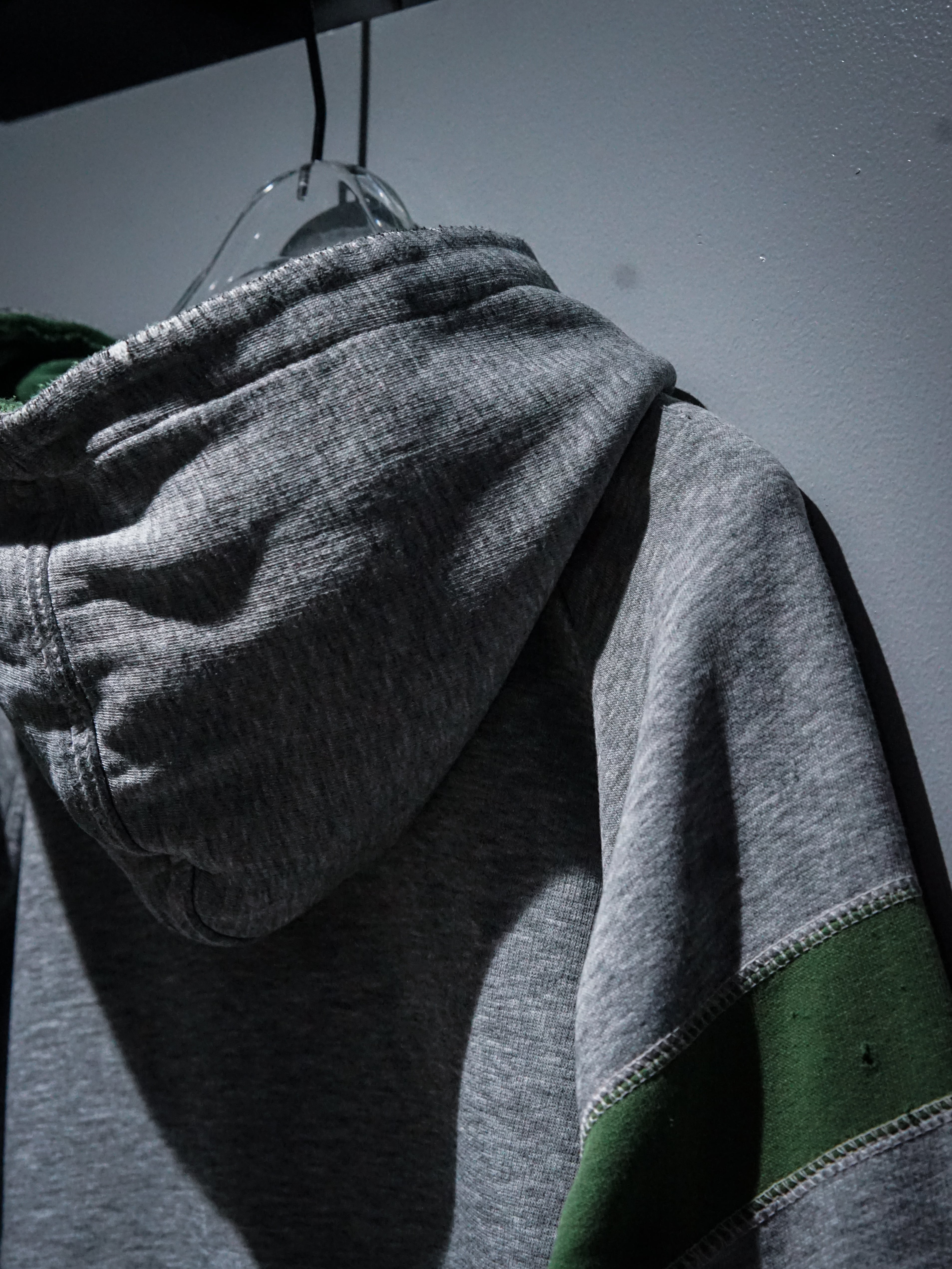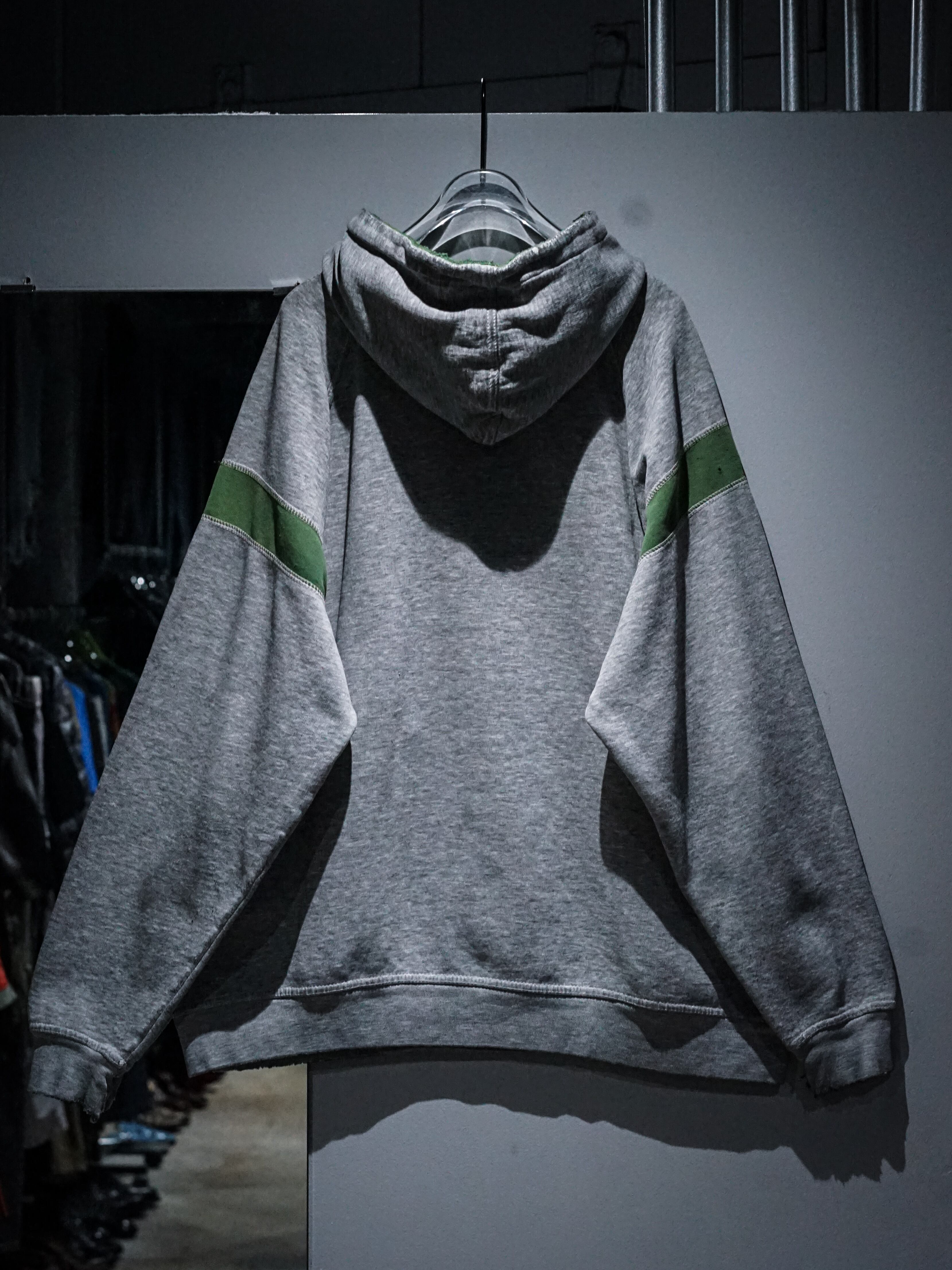グレーのボディをベースにグリーンのラインを施したシンプルなフーディに、袖口やフーディなどボディの随所が経年変化による"ボロ"い1着。