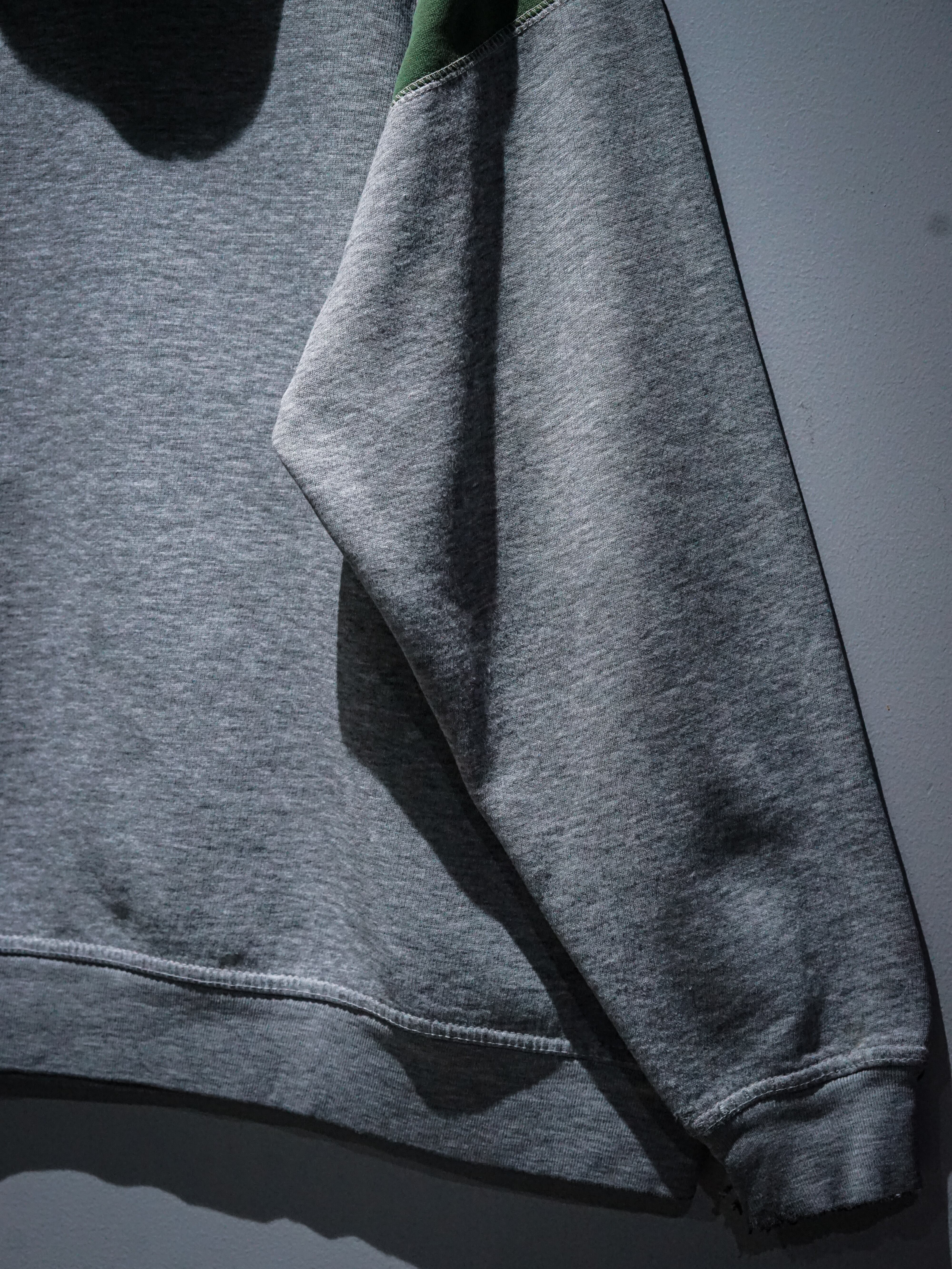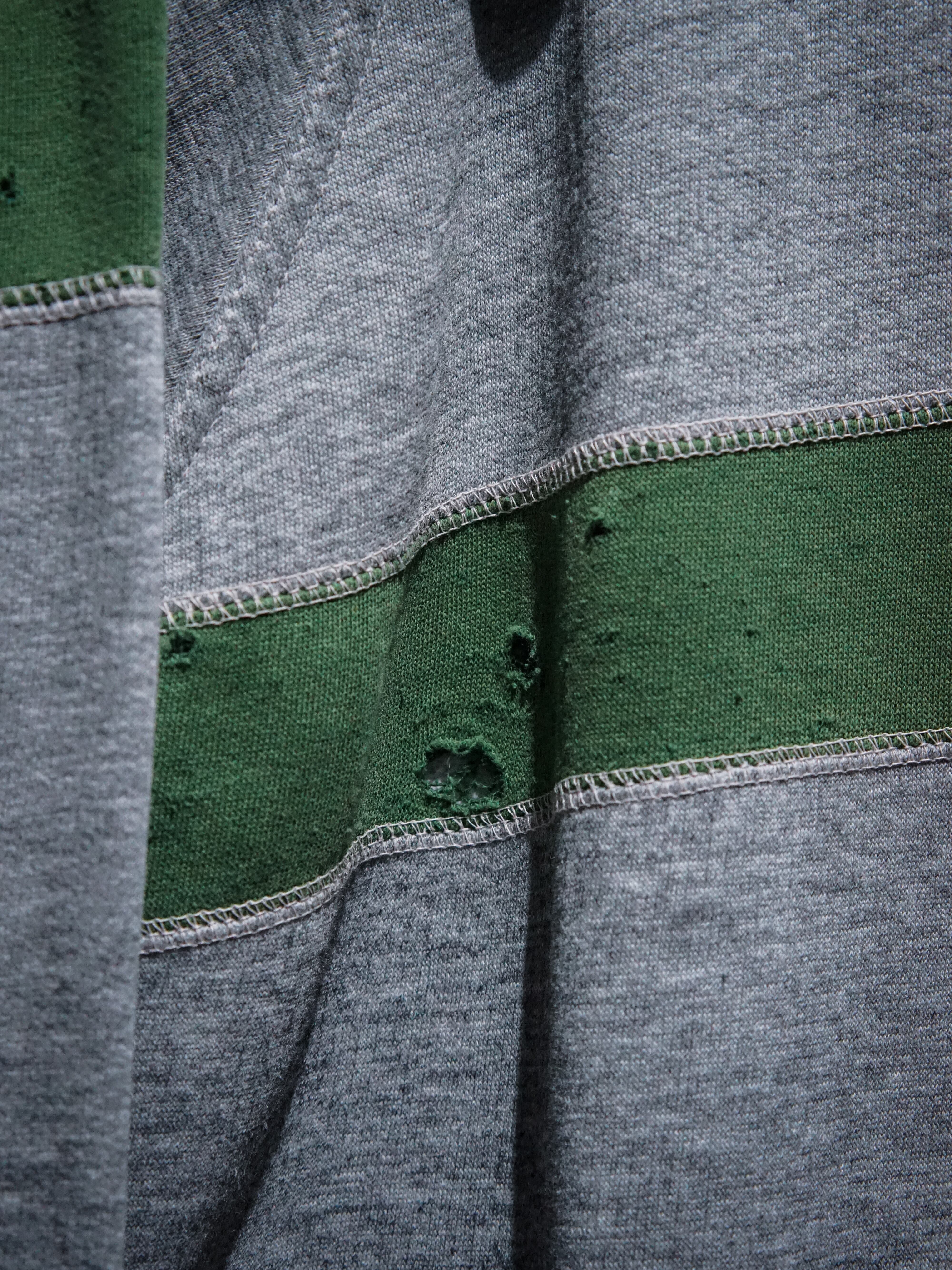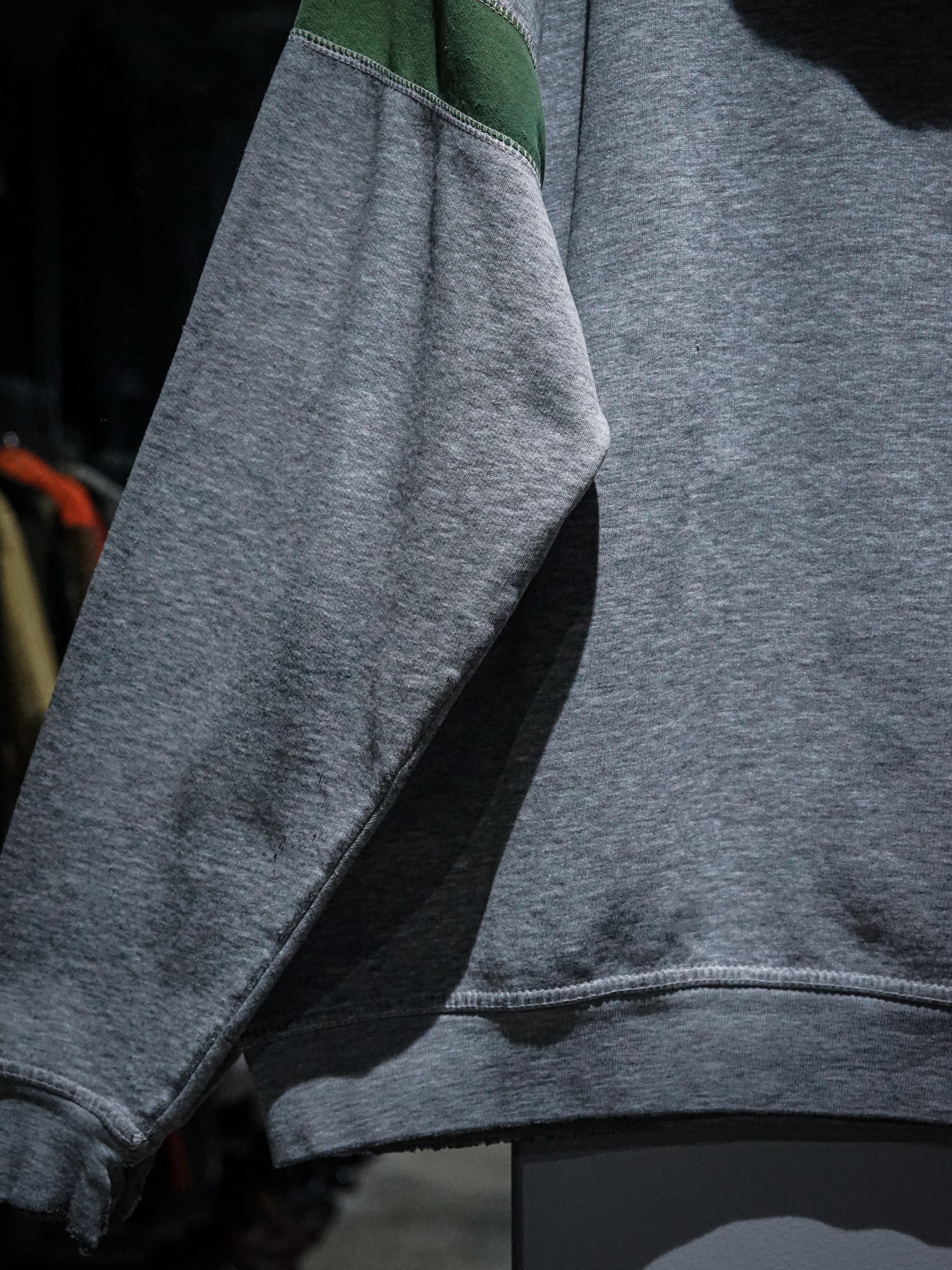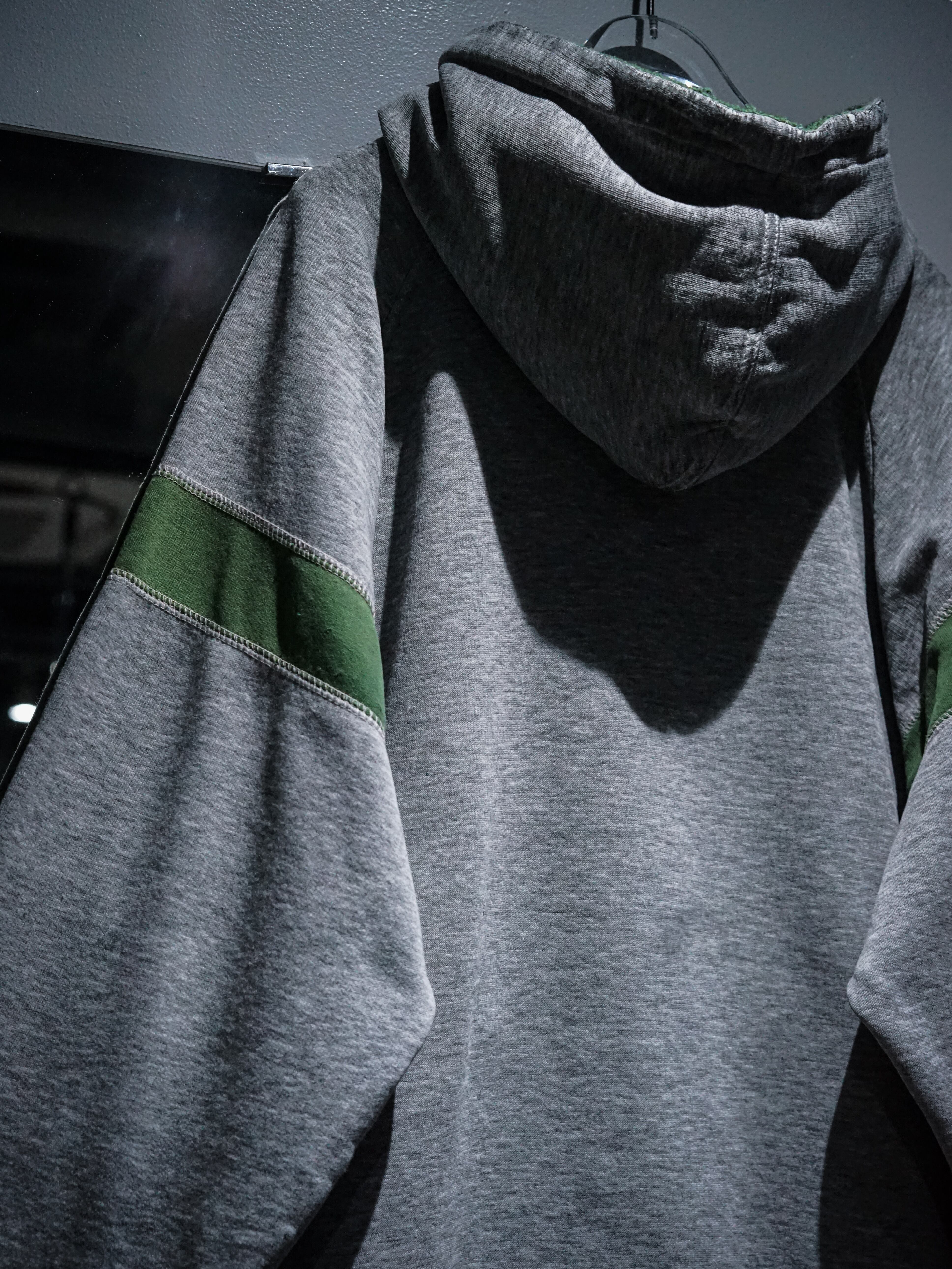 グレーのボディをベースにグリーンのラインを施したシンプルなフーディに、袖口やフーディなどボディの随所が経年変化による"ボロ"い1着。