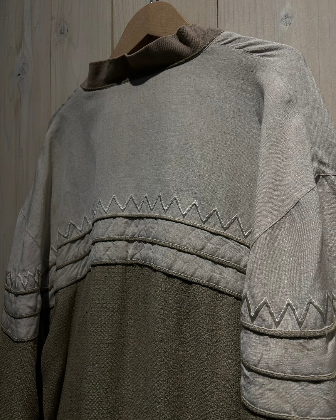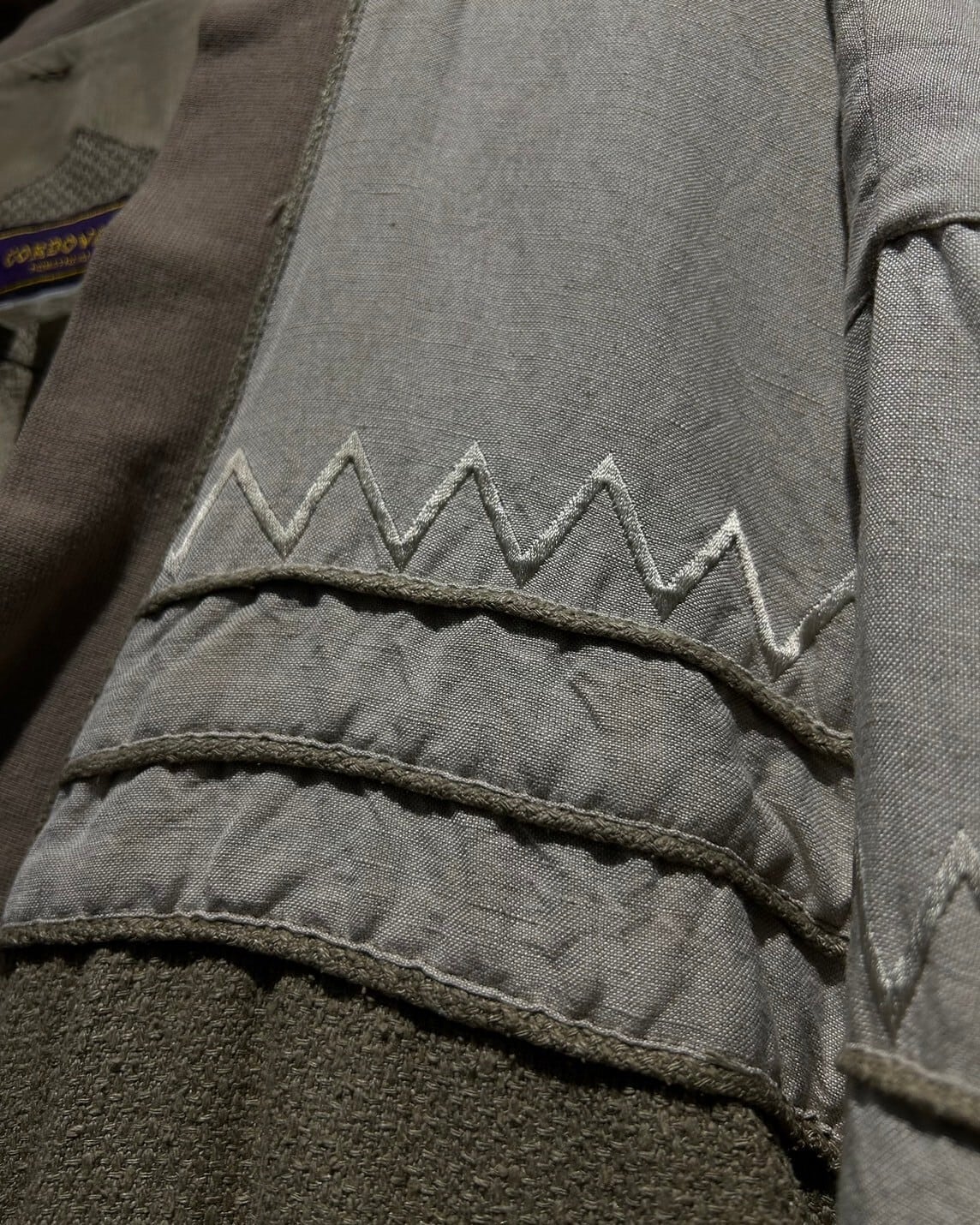 リネン部分にはパイピングを走らせ、さらにジグザグに刺繍を刻み立体感を表現。ブラウンベースのワントーンのカラーリングながら、素材感やデザインでメリハリが生まれています。