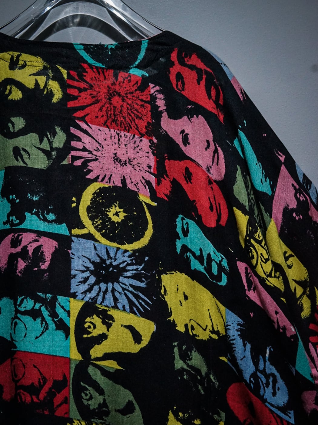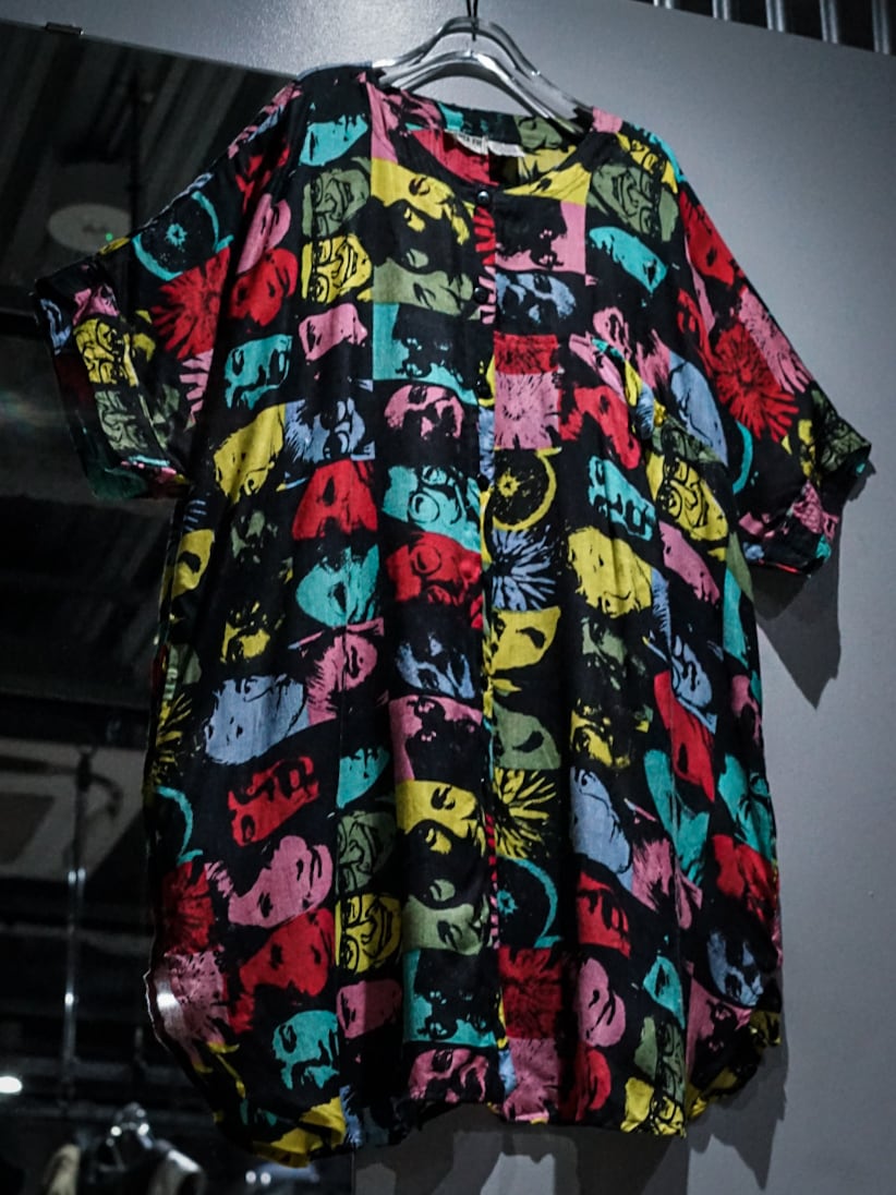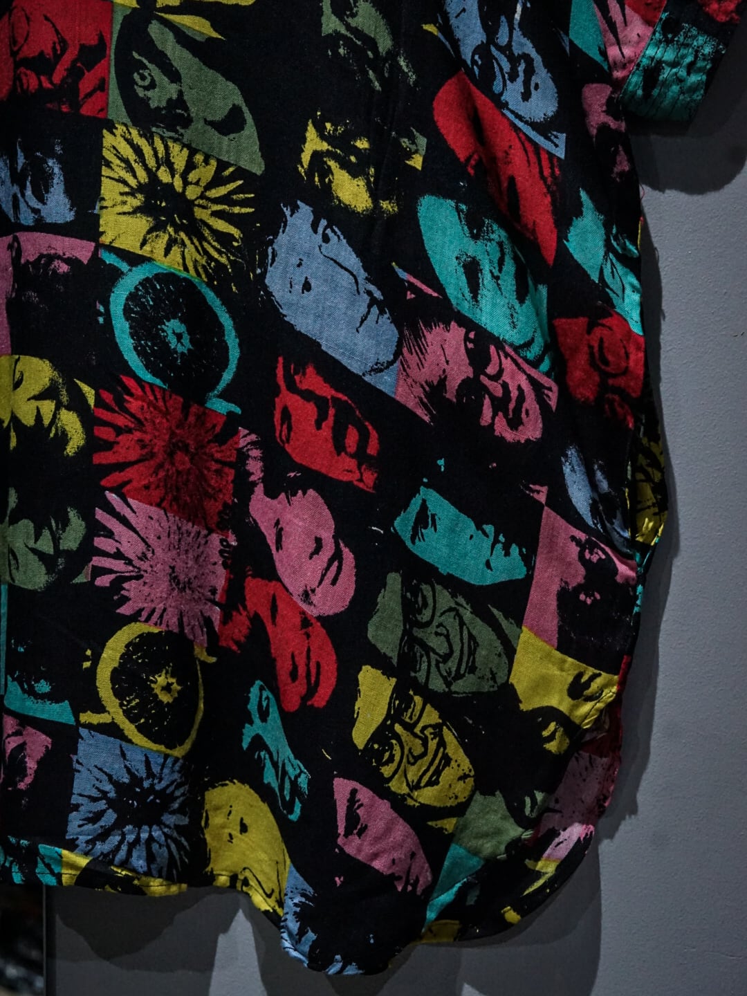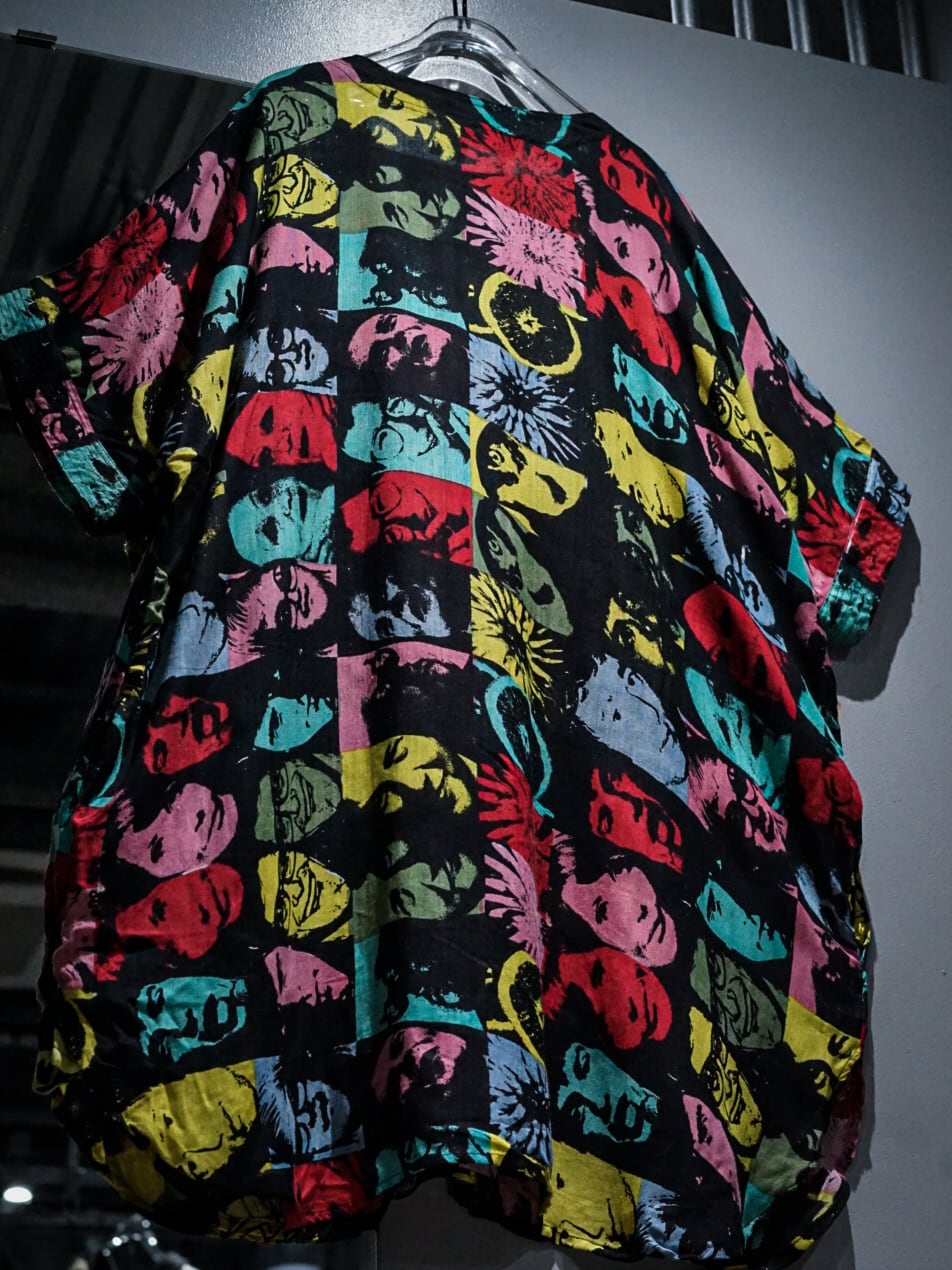 ハリのある柔らかなレーヨン素材を用いたボディに、ポップアートの第一人者"アンディ・ウォーホル"の作品を彷彿とさせる、マルチなカラーリングのフェイスパターンを載せた1着。