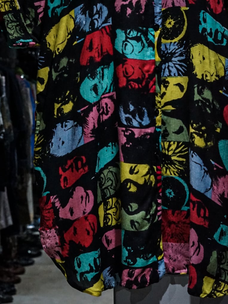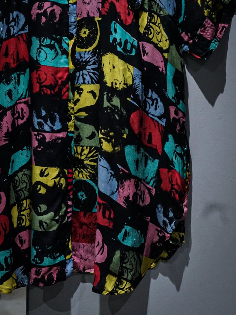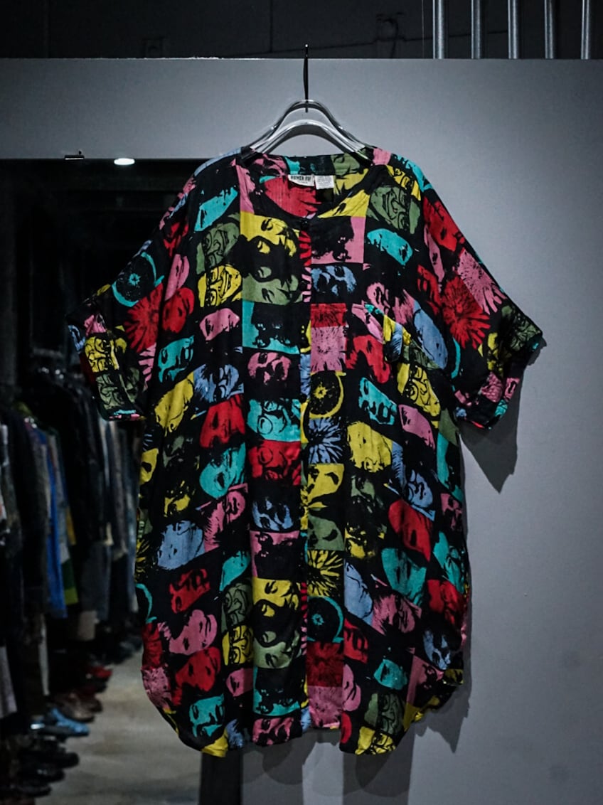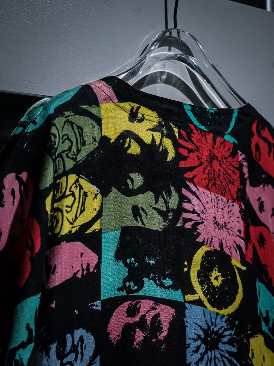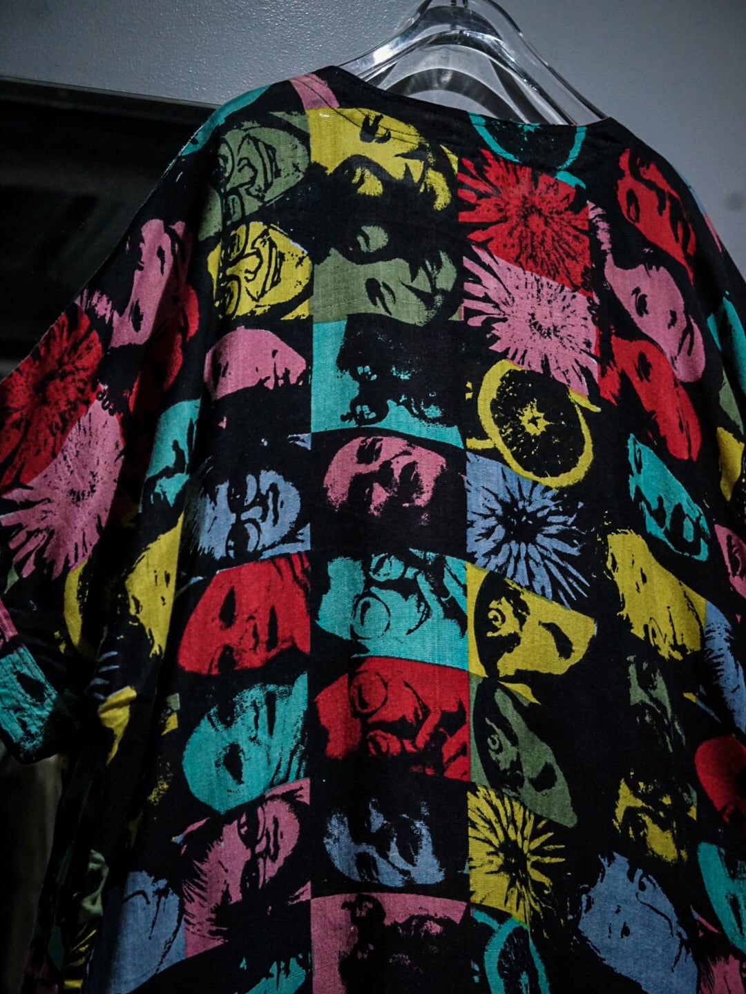 ハリのある柔らかなレーヨン素材を用いたボディに、ポップアートの第一人者"アンディ・ウォーホル"の作品を彷彿とさせる、マルチなカラーリングのフェイスパターンを載せた1着。