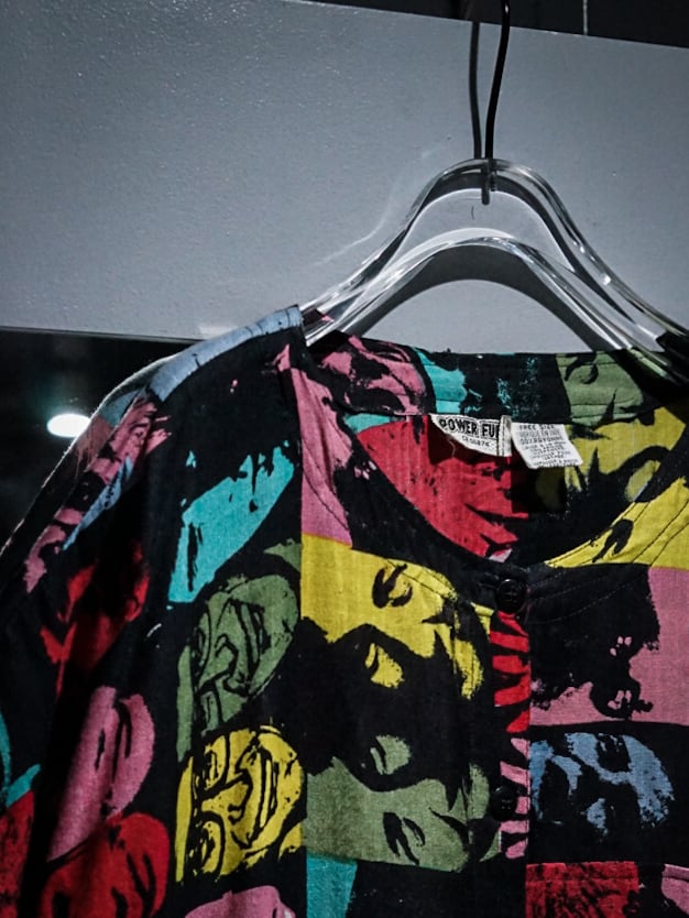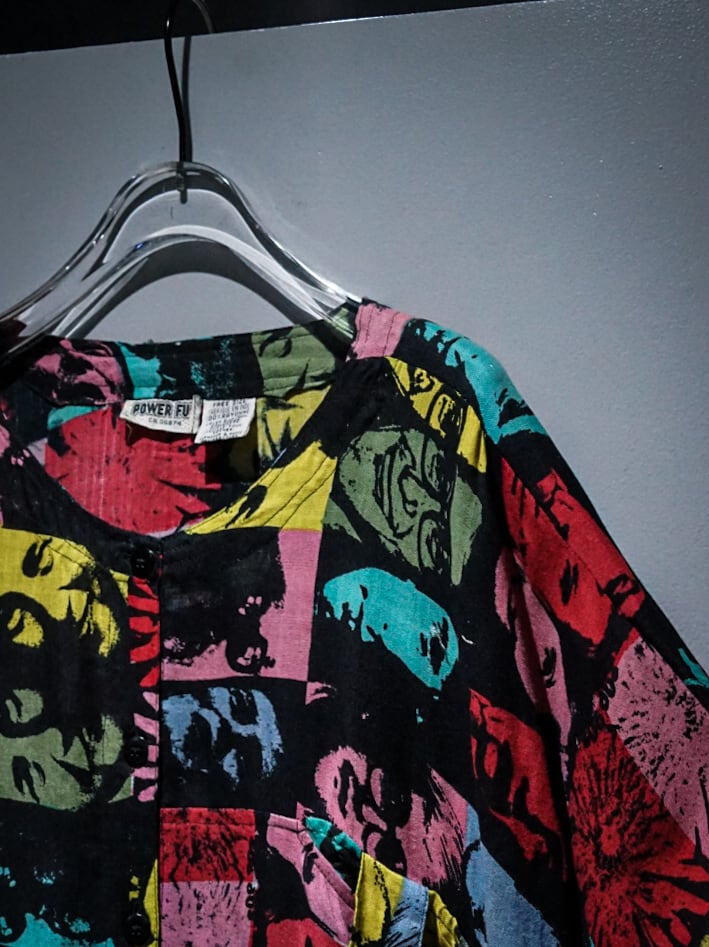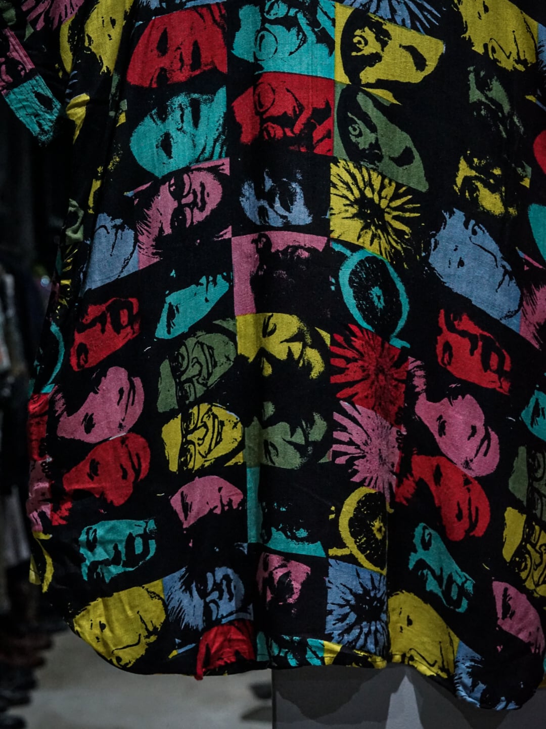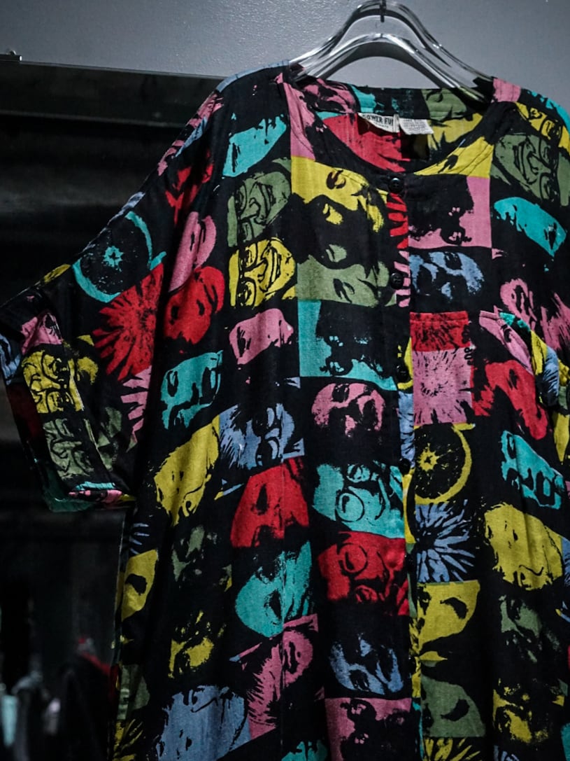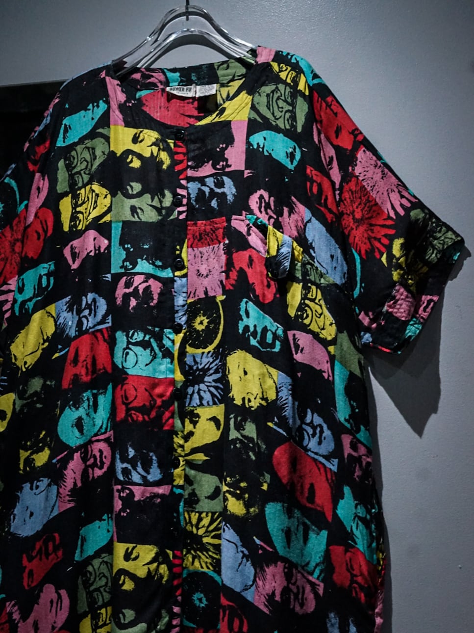 ハリのある柔らかなレーヨン素材を用いたボディに、ポップアートの第一人者"アンディ・ウォーホル"の作品を彷彿とさせる、マルチなカラーリングのフェイスパターンを載せた1着。
