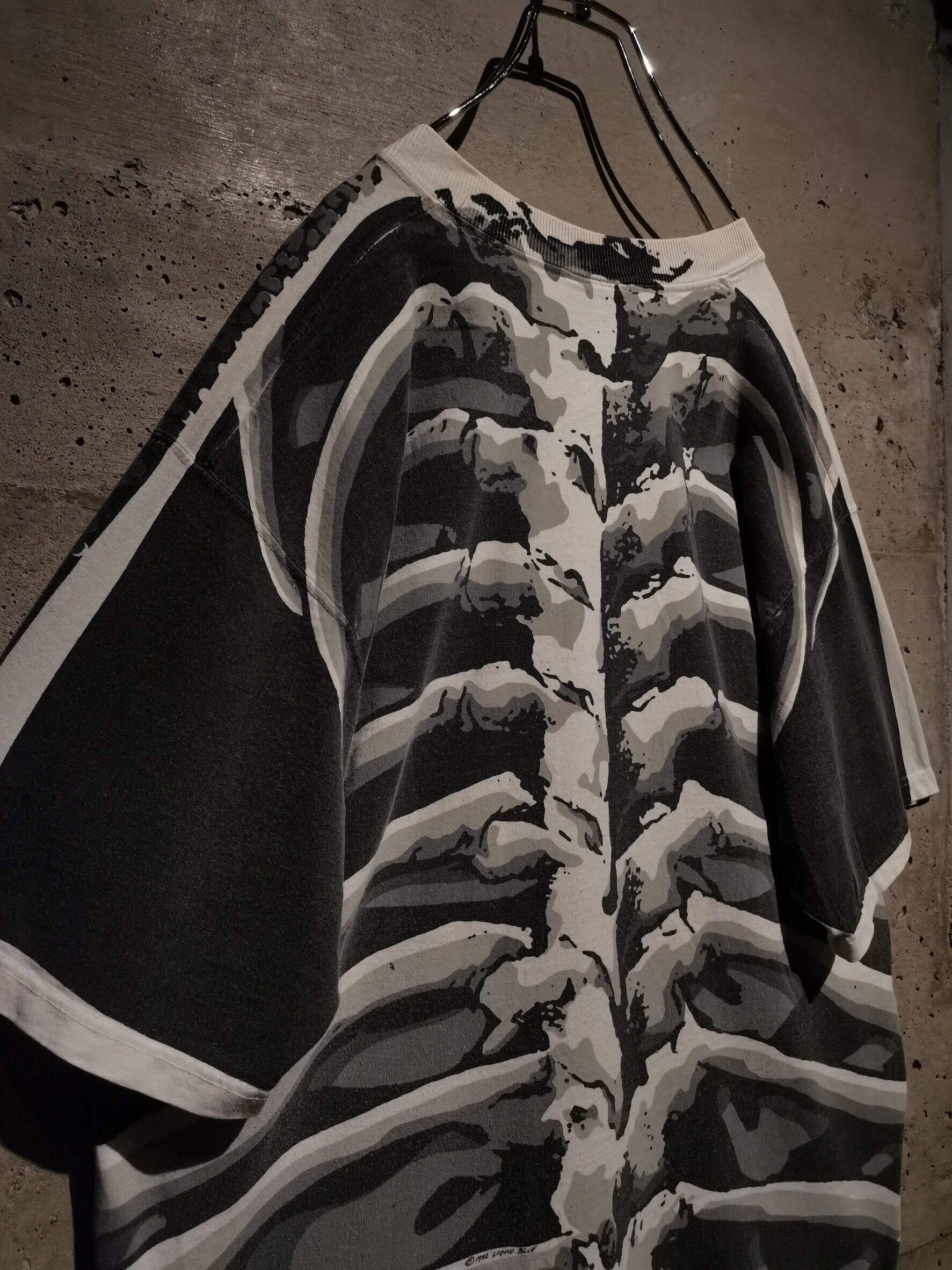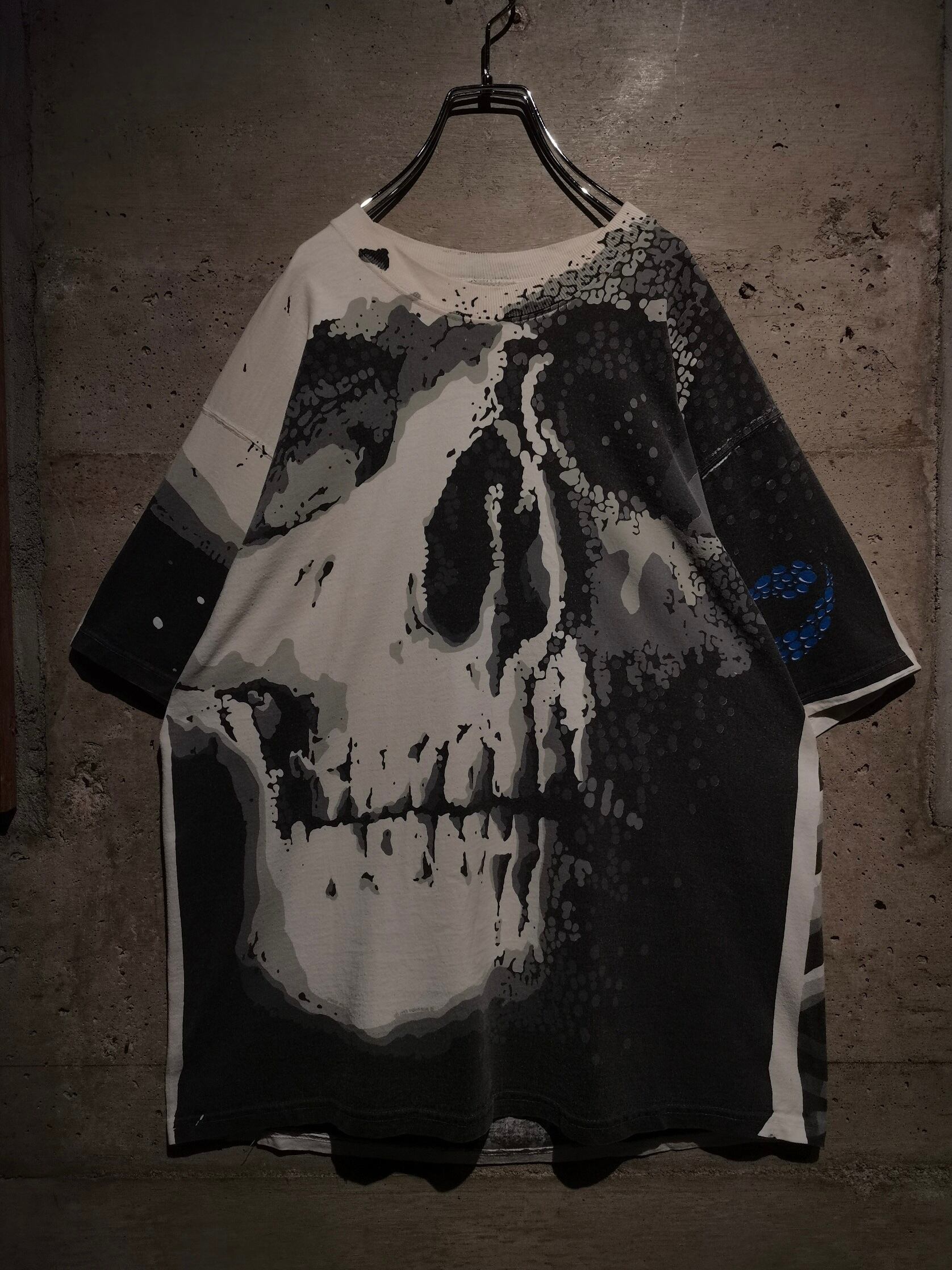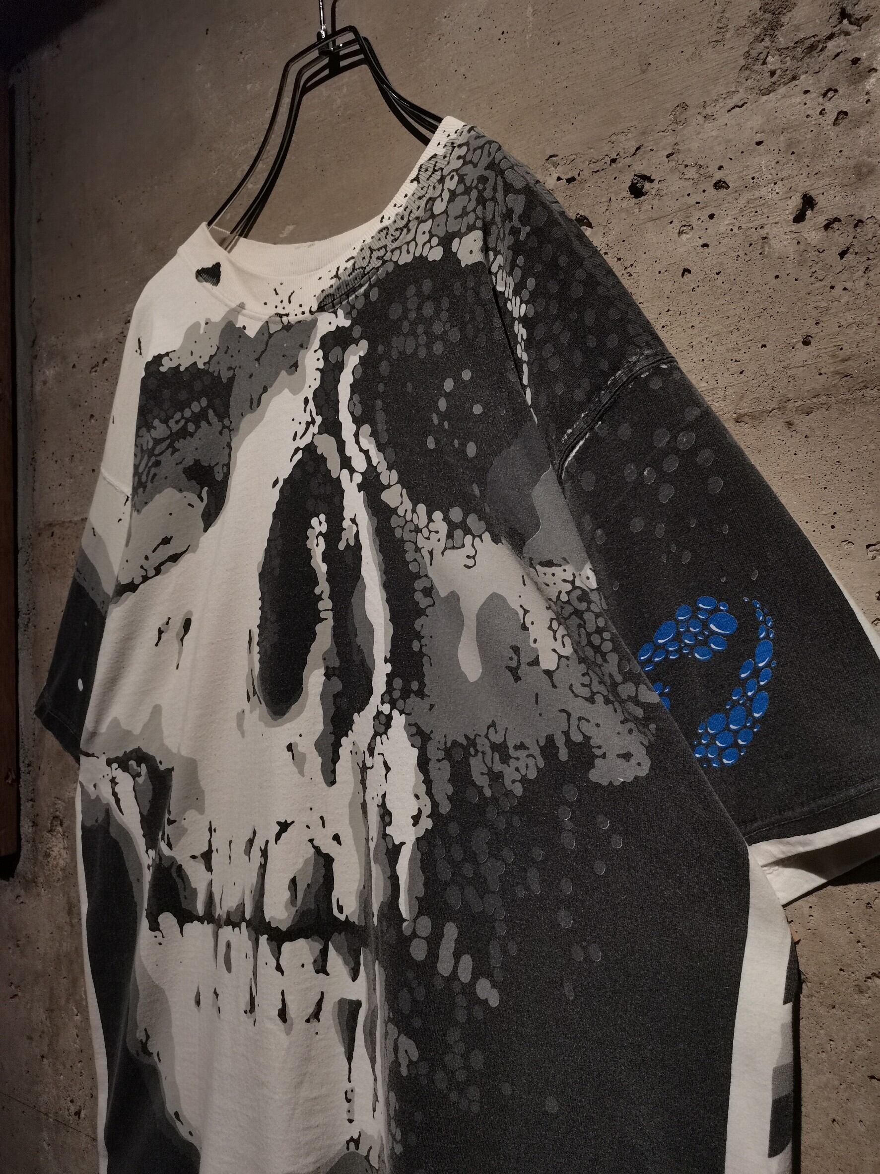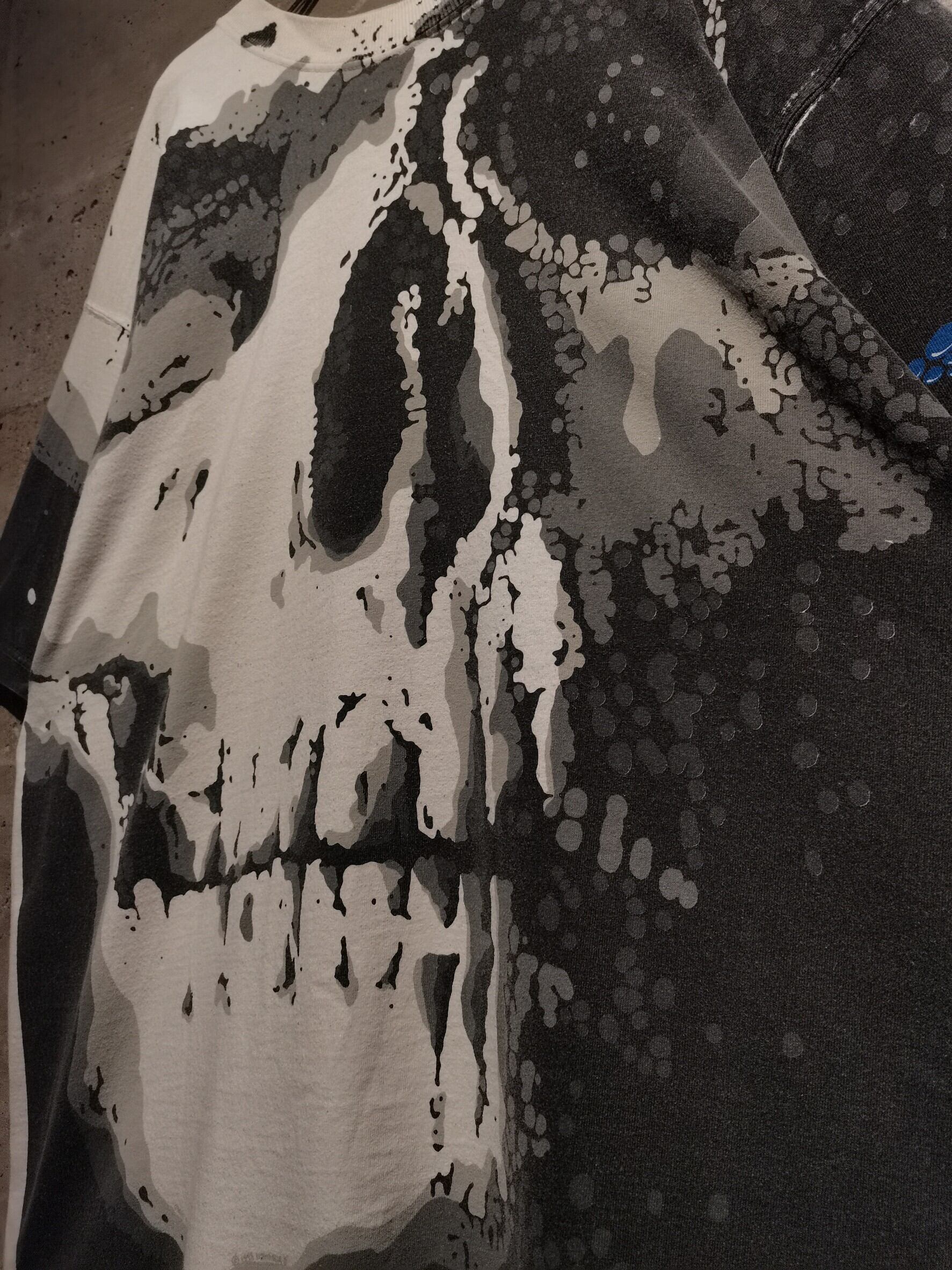 白のボディを埋め尽くすように、大胆なオールオーバープリントによってスカルをボディ全面に載せた、抜群のインパクトを放つ90's "LIQUID BLUE" のTシャツ。