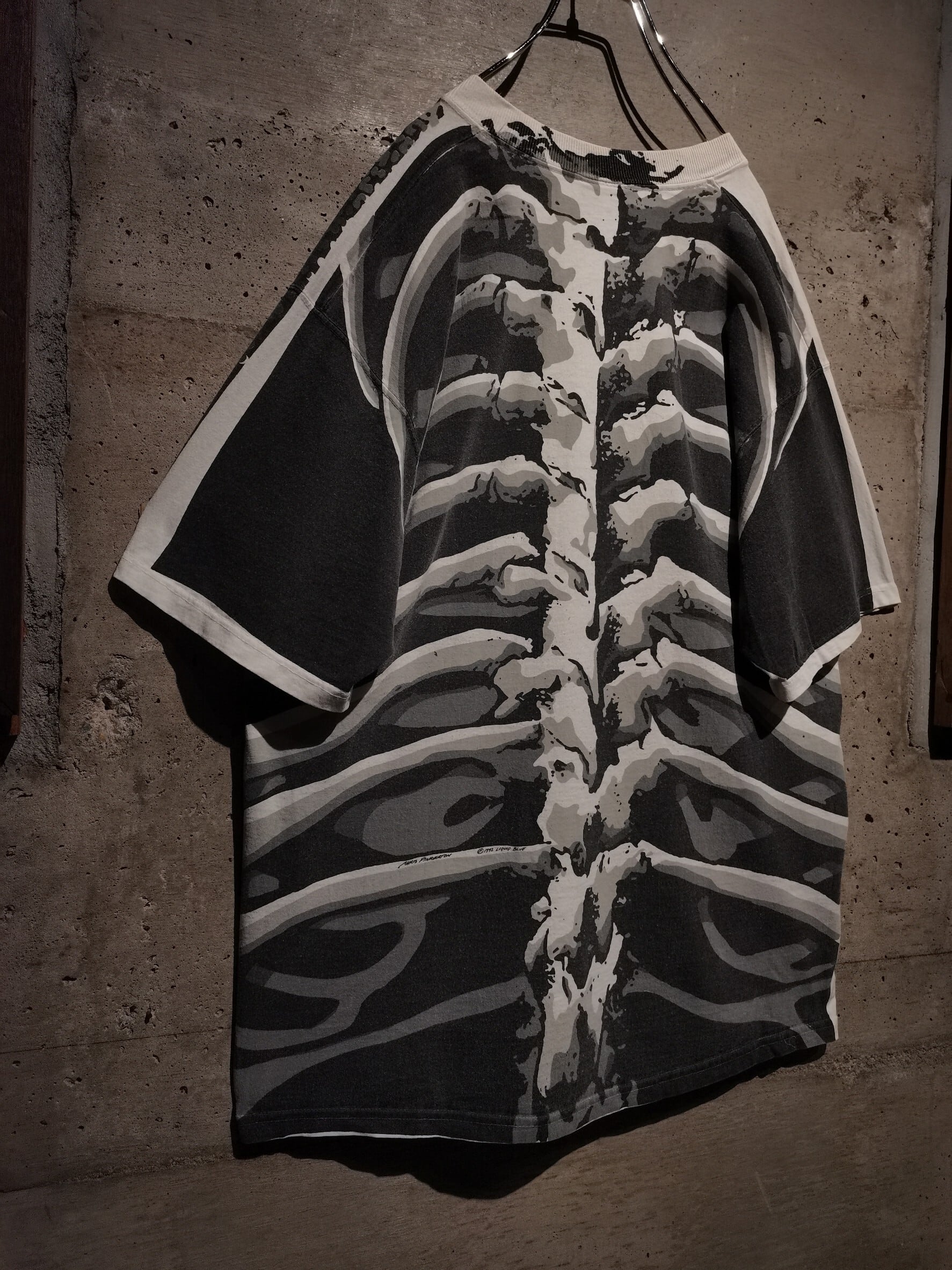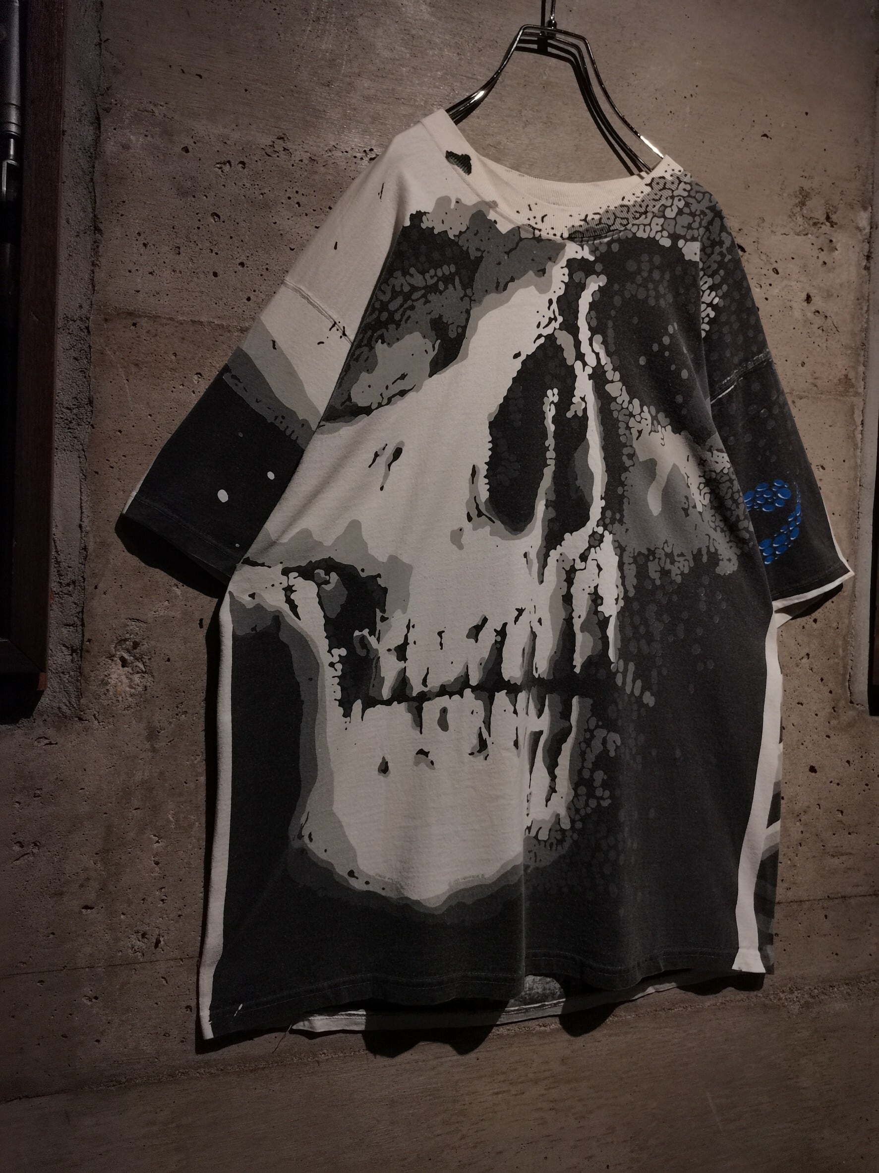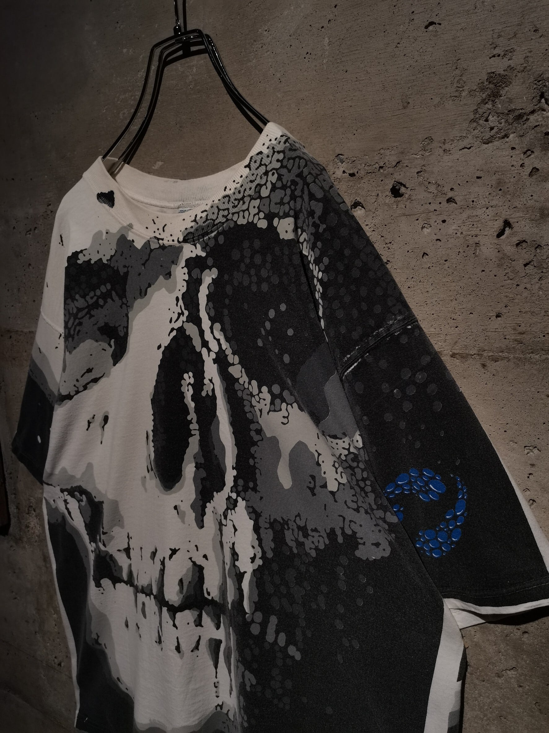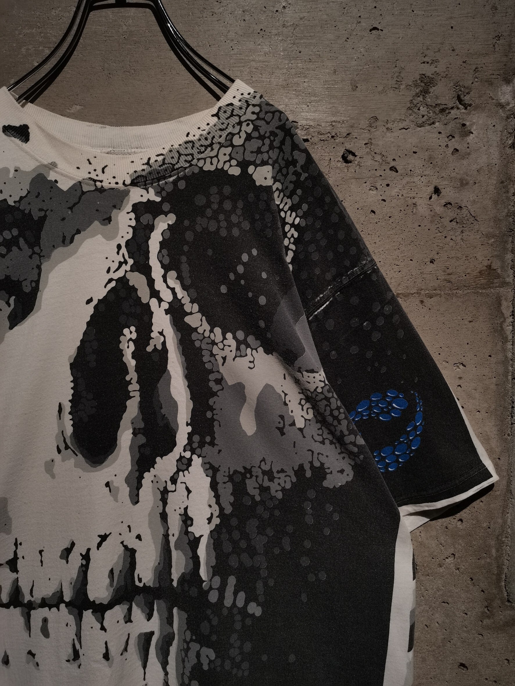 白のボディを埋め尽くすように、大胆なオールオーバープリントによってスカルをボディ全面に載せた、抜群のインパクトを放つ90's "LIQUID BLUE" のTシャツ。