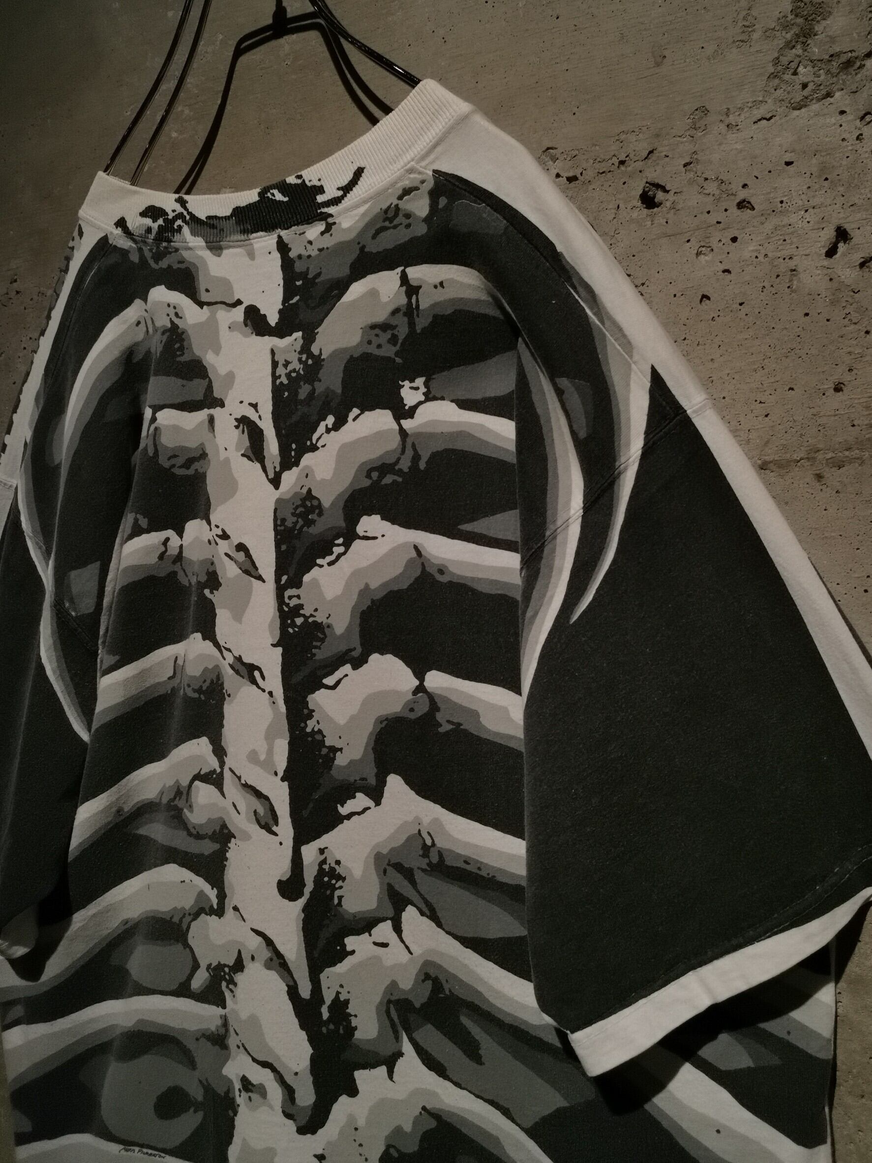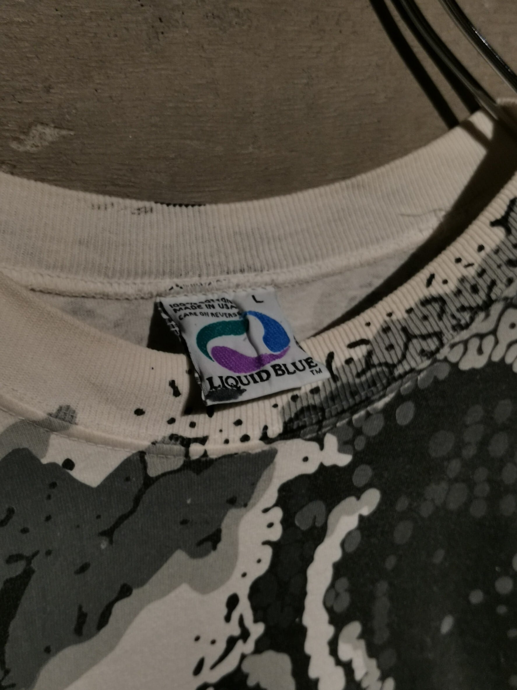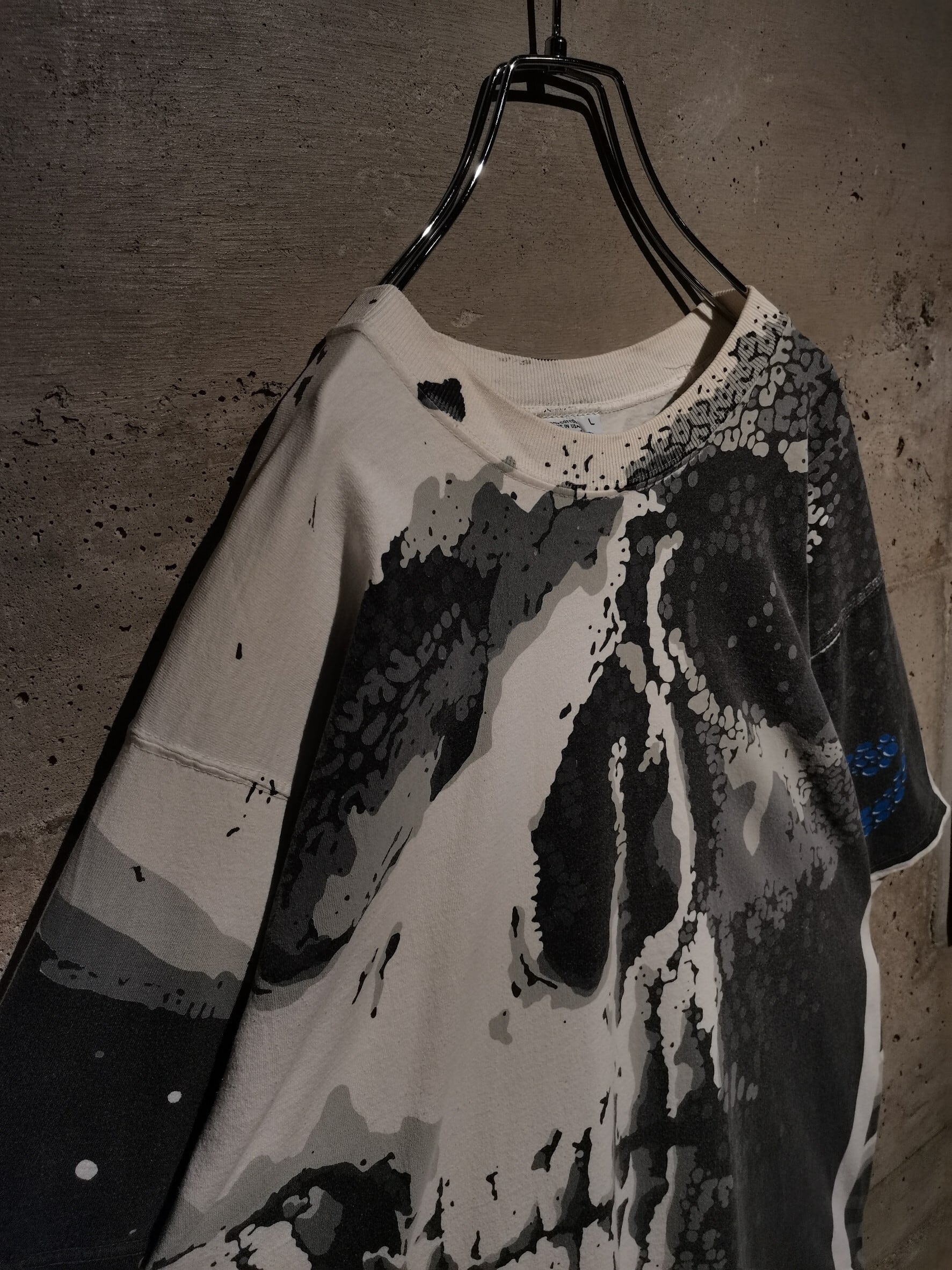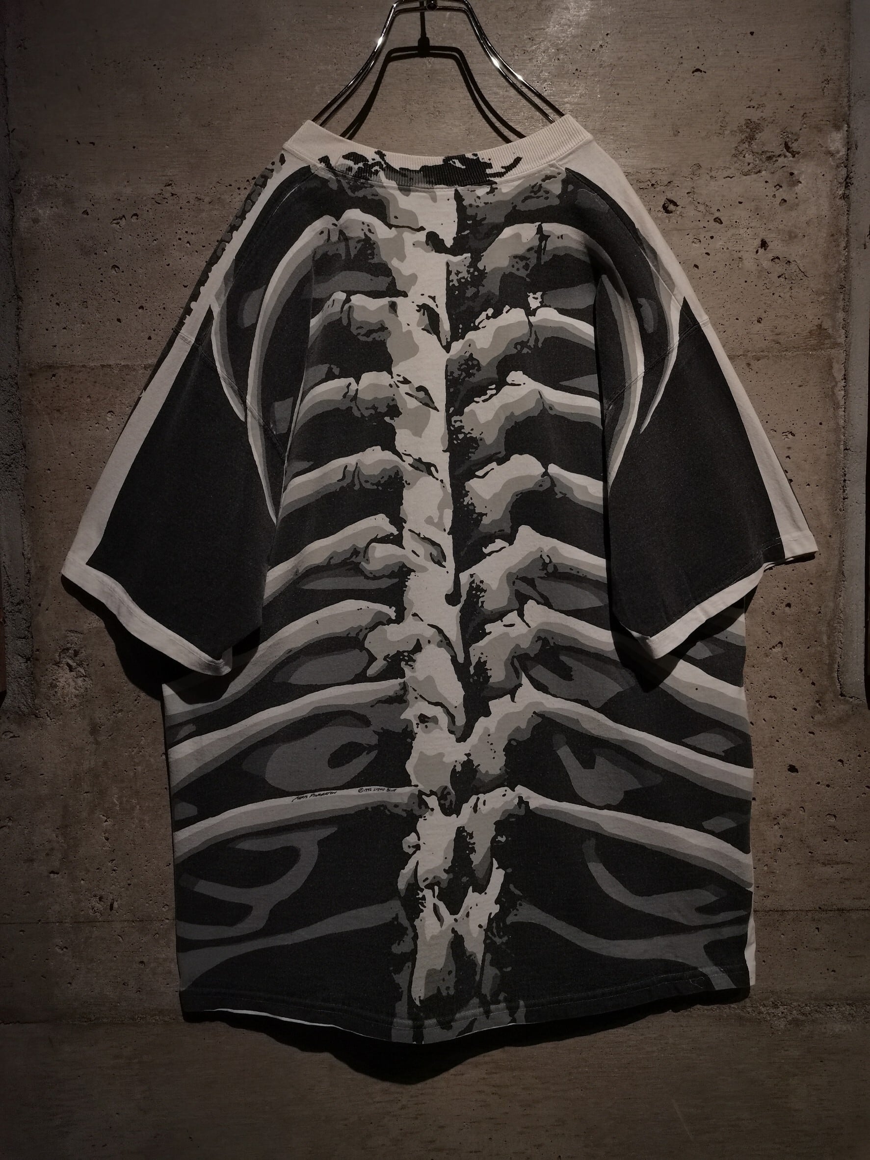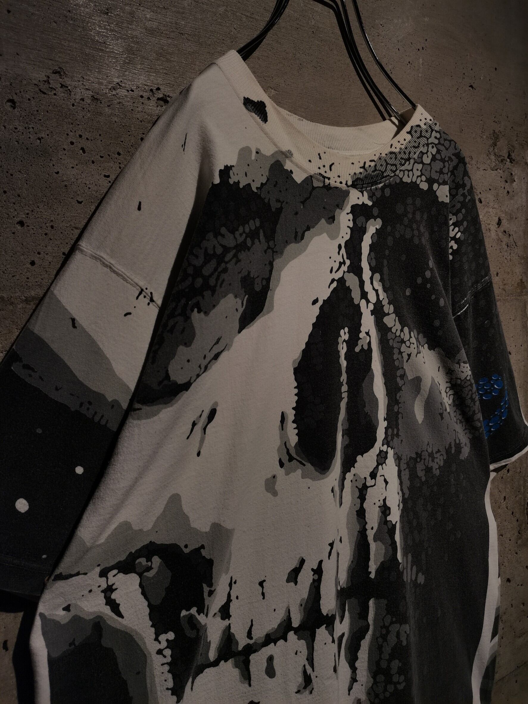 白のボディを埋め尽くすように、大胆なオールオーバープリントによってスカルをボディ全面に載せた、抜群のインパクトを放つ90's "LIQUID BLUE" のTシャツ。