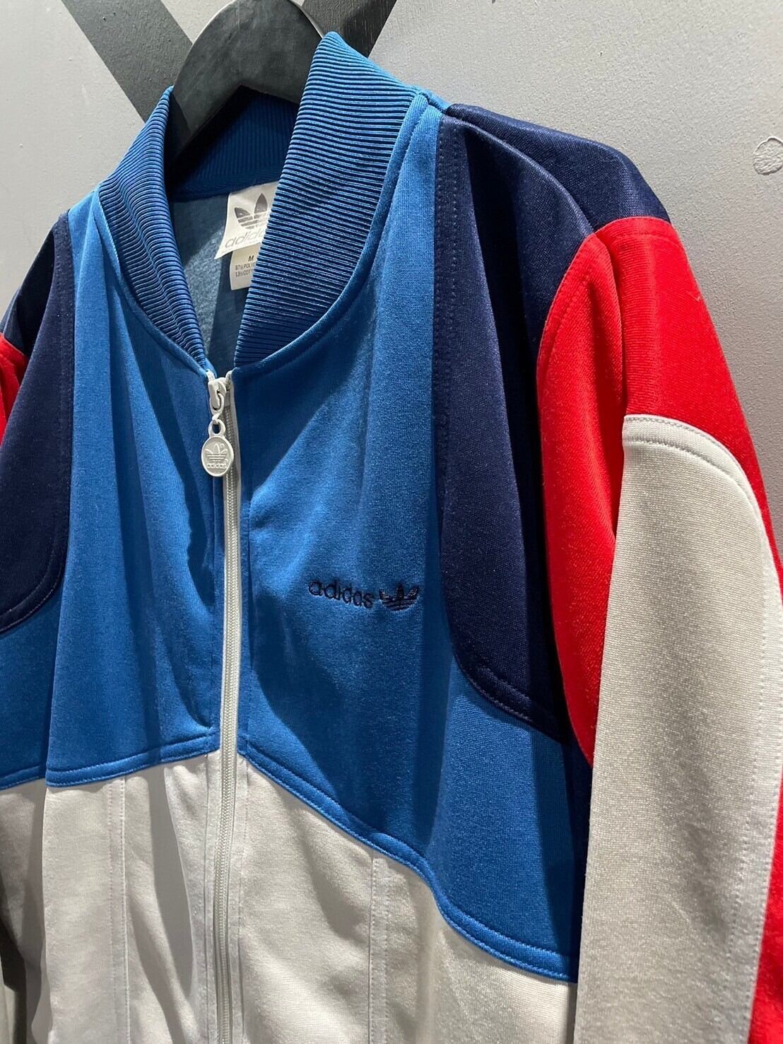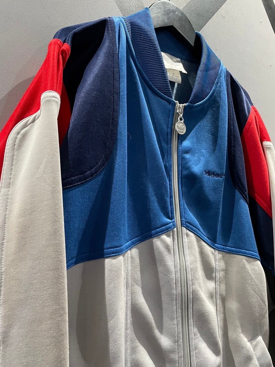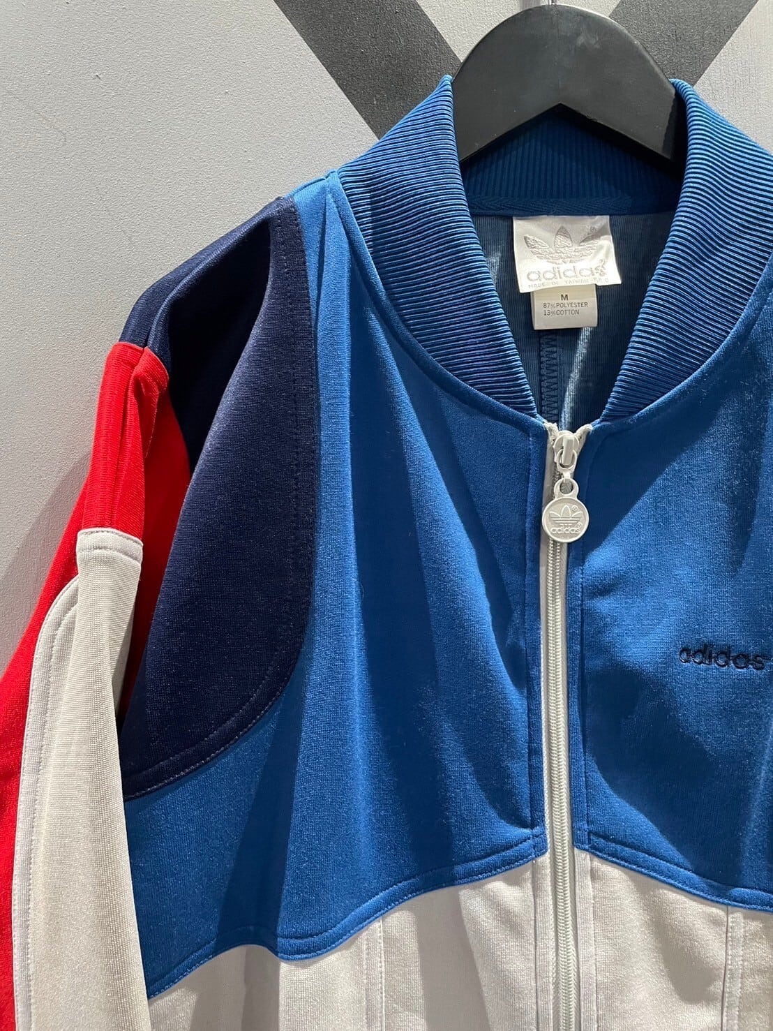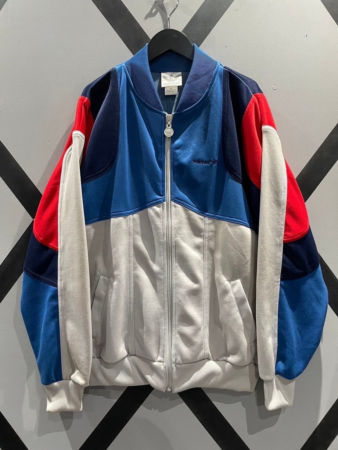 ホワイト×ブルー×ネイビー×レッドを切り替えた、80〜90's adidasのトラックジャケット。