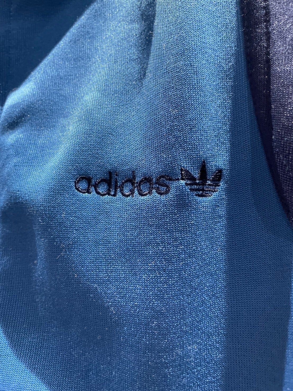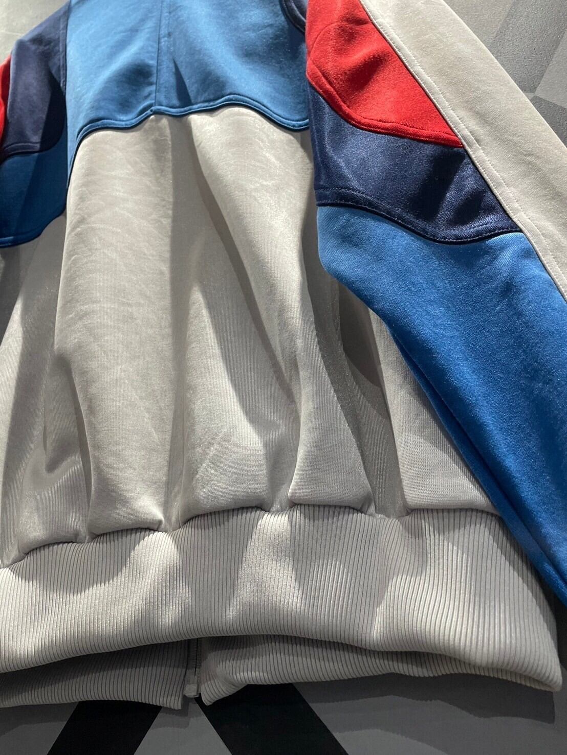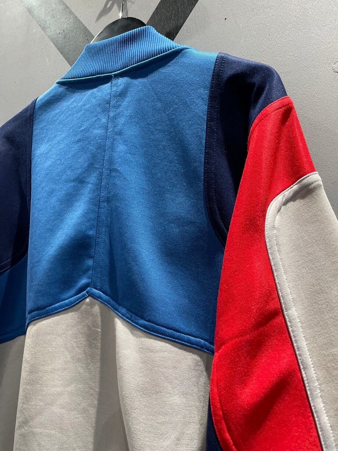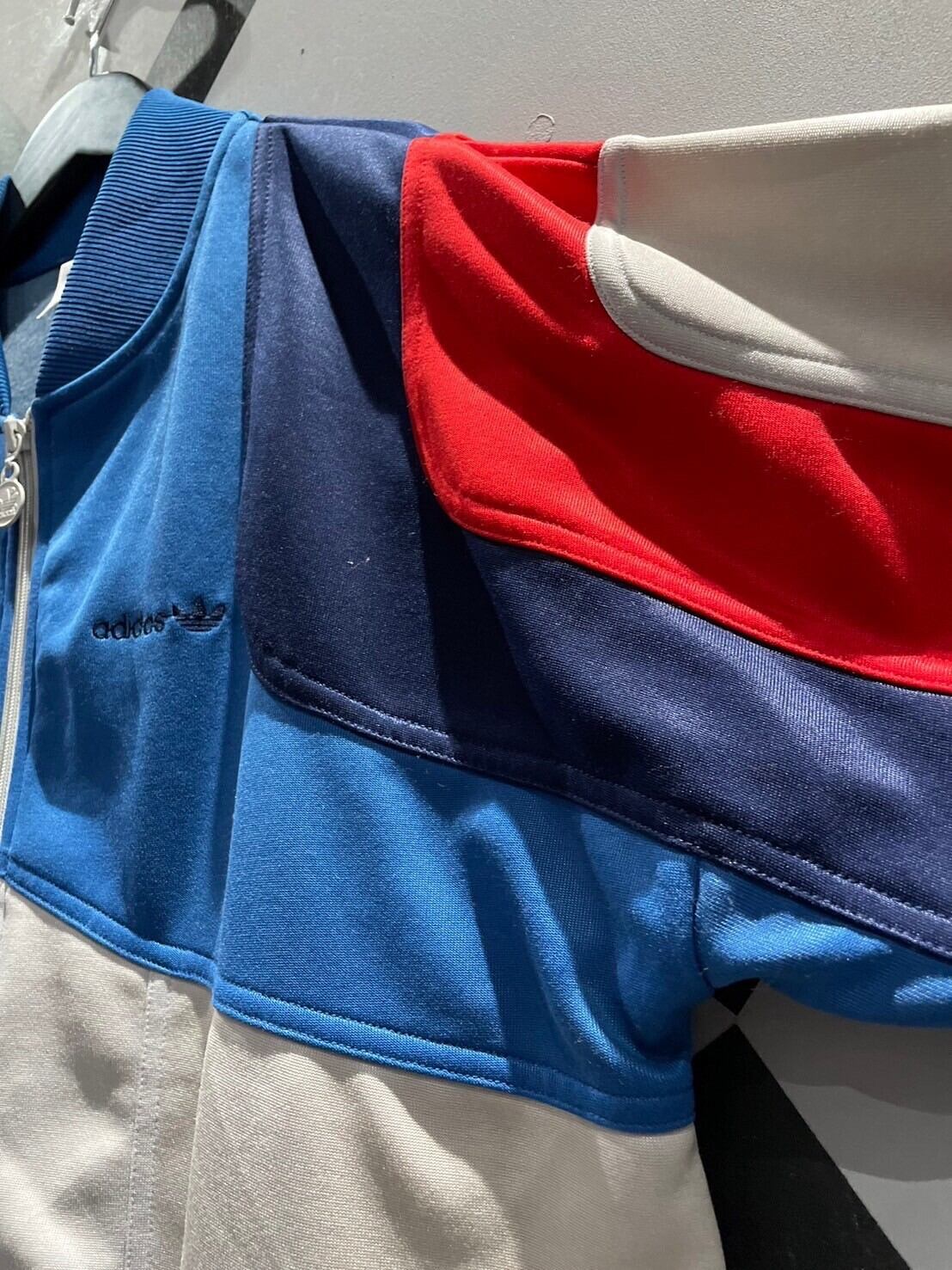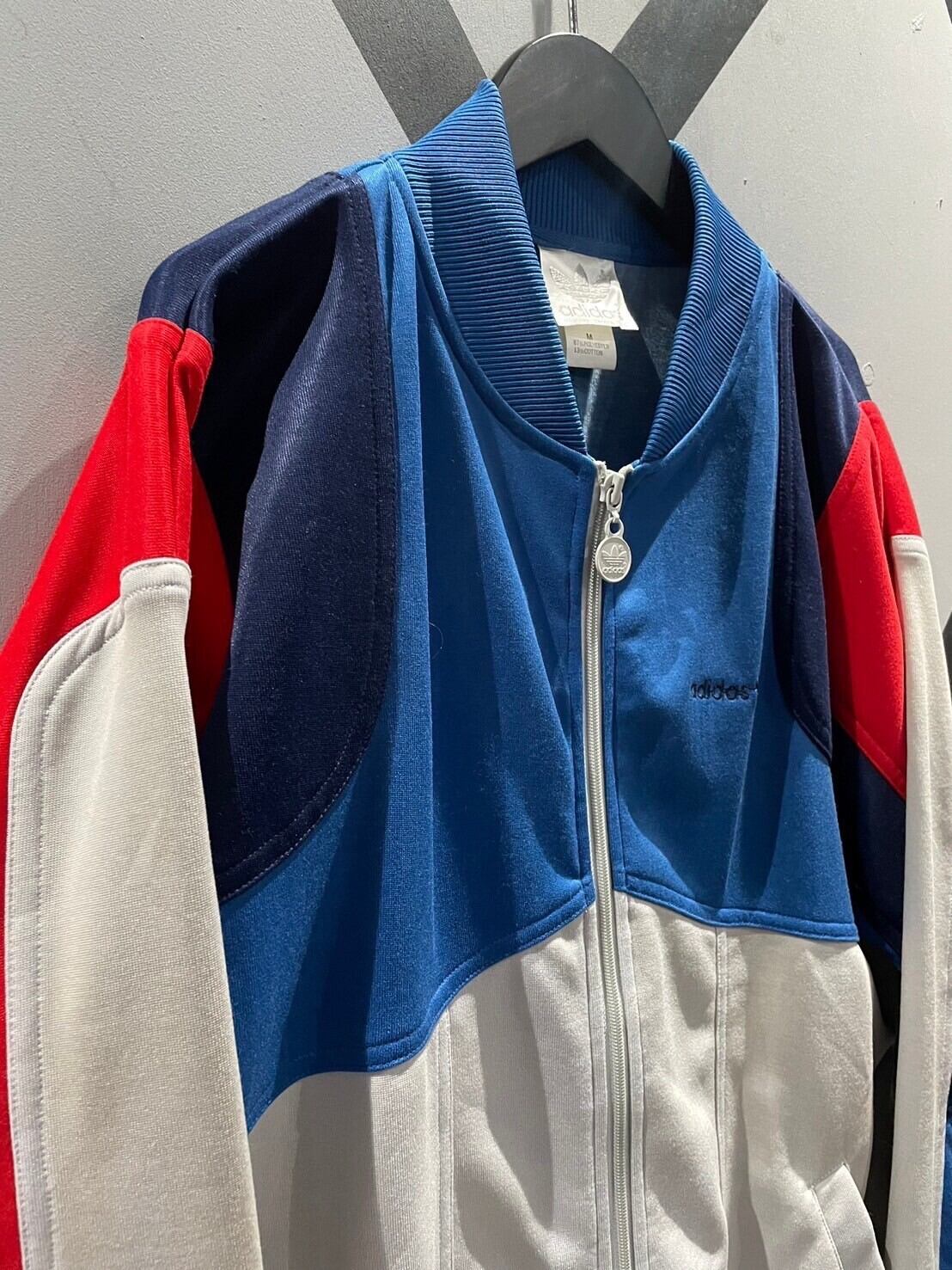ホワイト×ブルー×ネイビー×レッドを切り替えた、80〜90's adidasのトラックジャケット。
