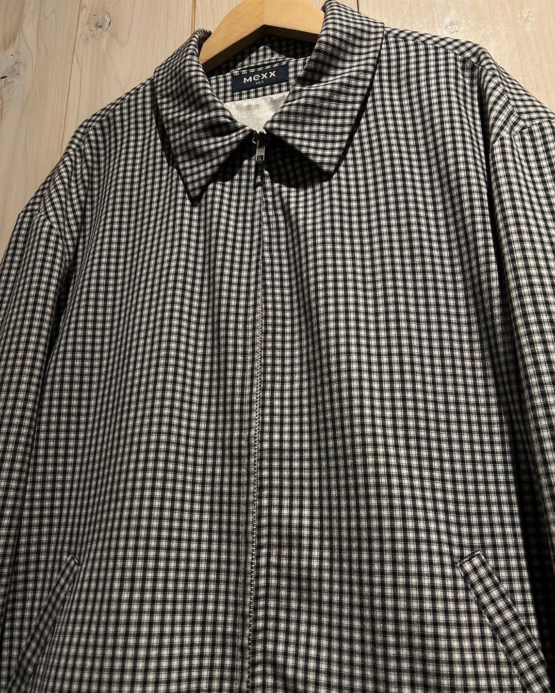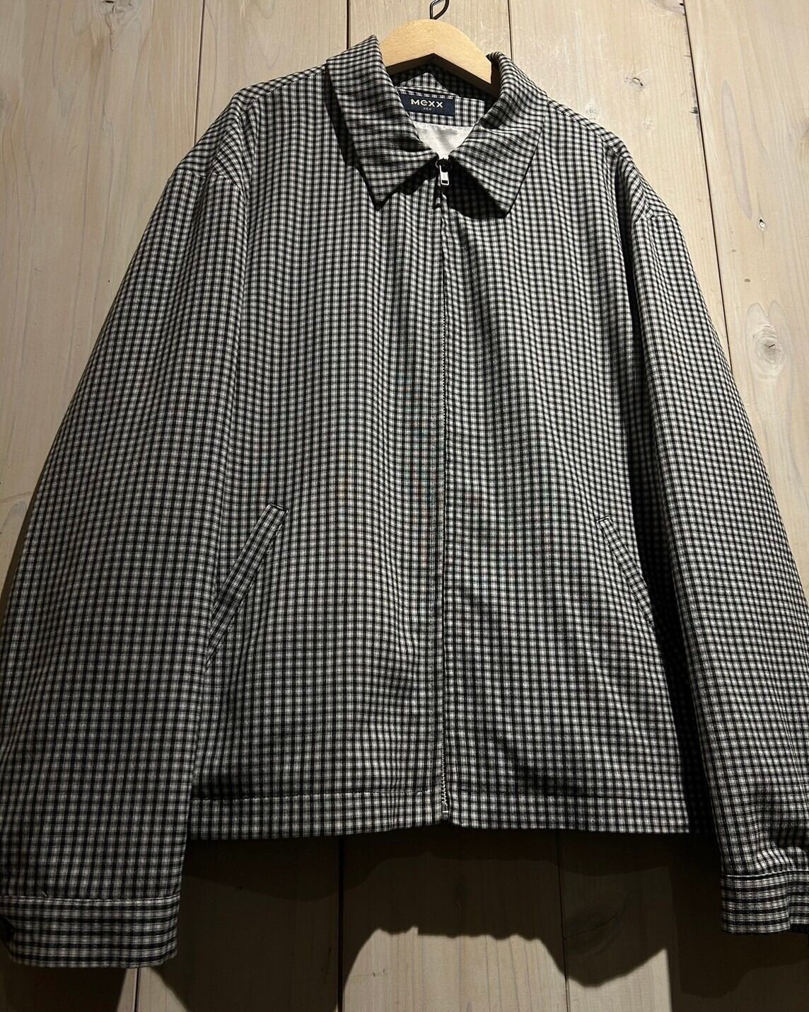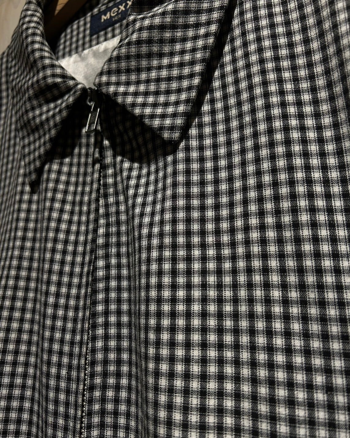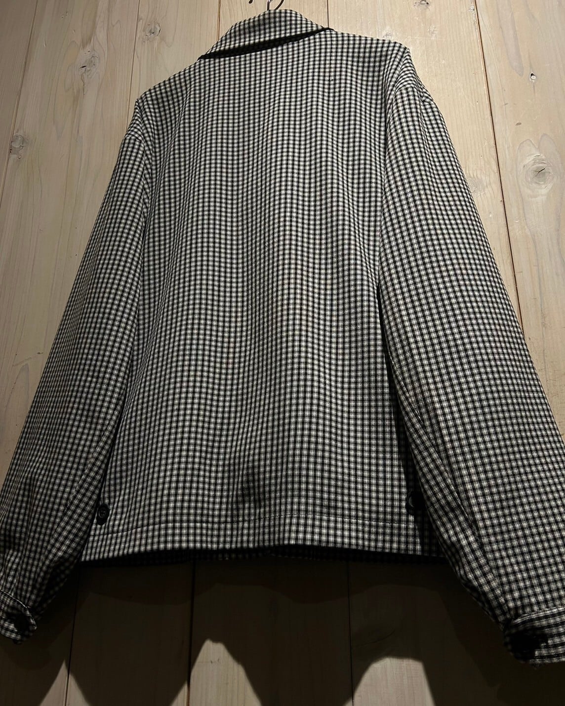ハリのある素材を用いて、細やかな黒×白のモノトーンのチェック柄を載せたジップアップジャケット。