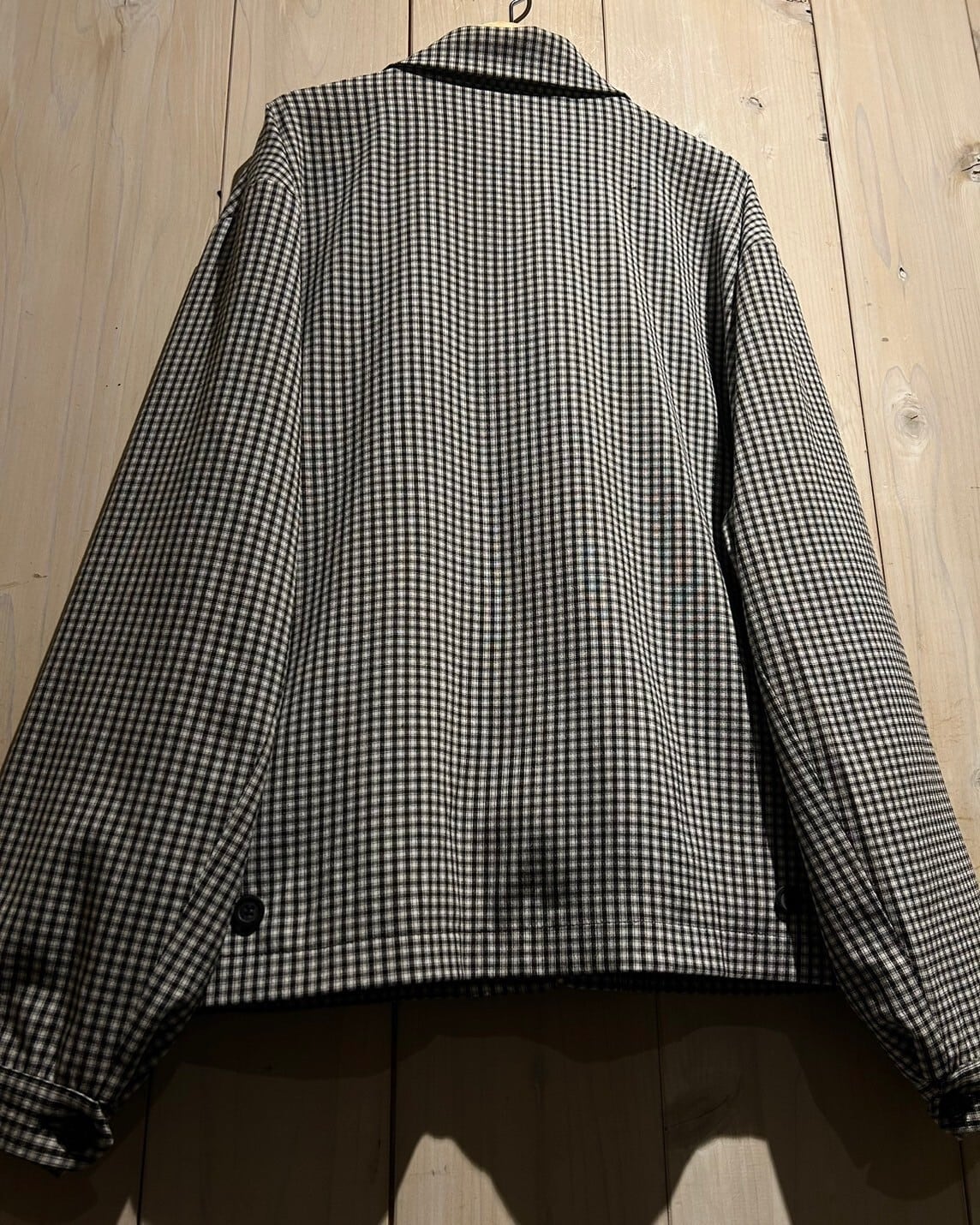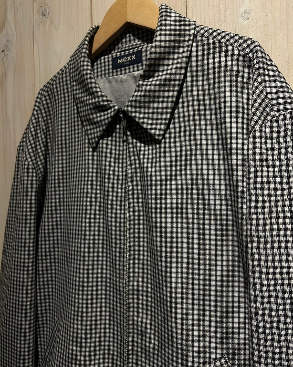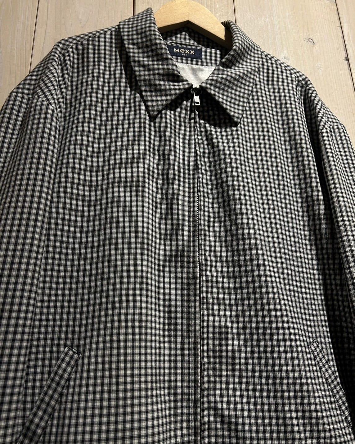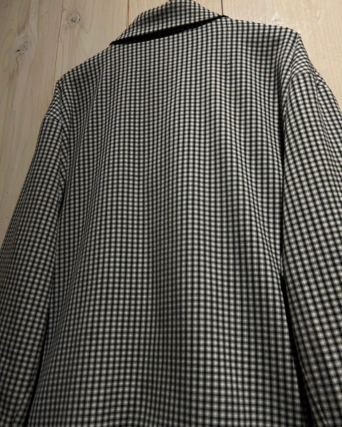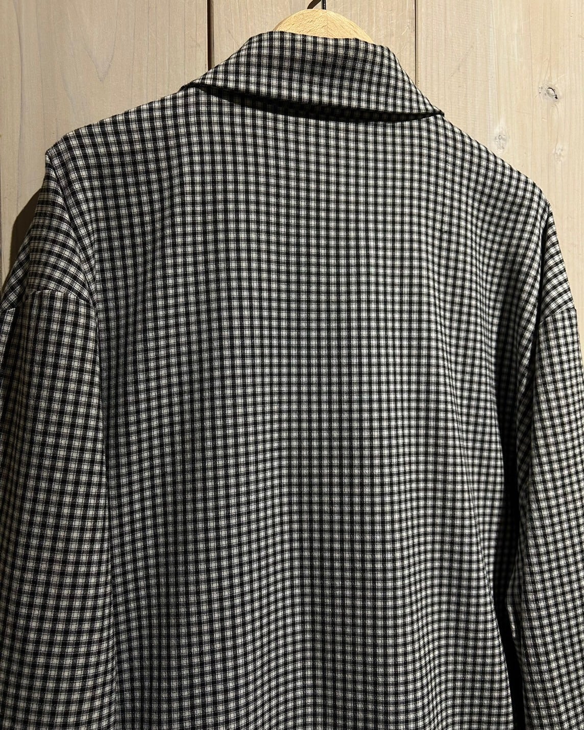ハリのある素材を用いて、細やかな黒×白のモノトーンのチェック柄を載せたジップアップジャケット。