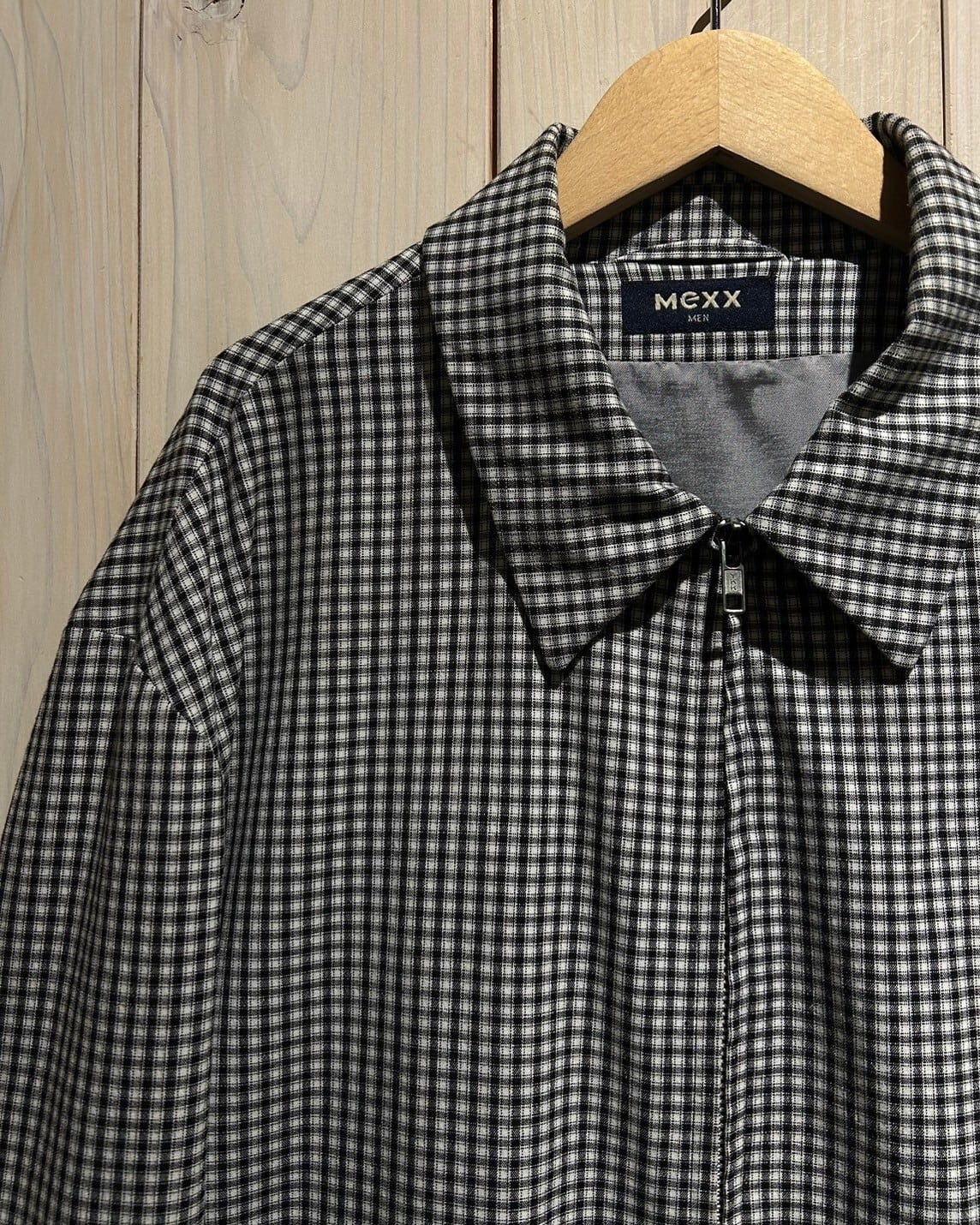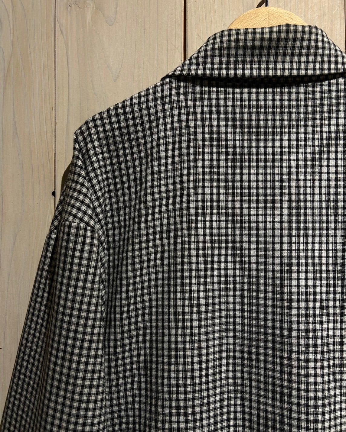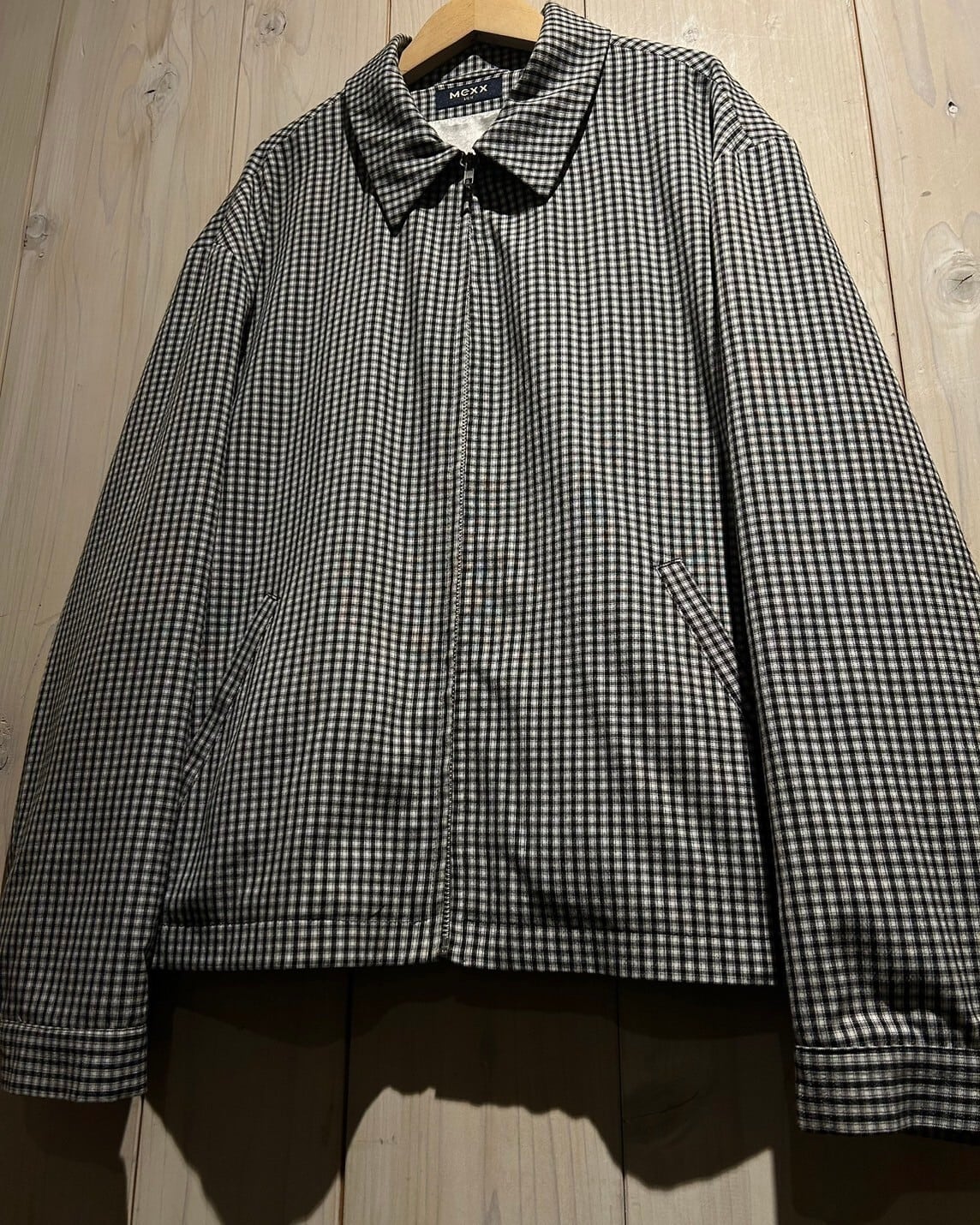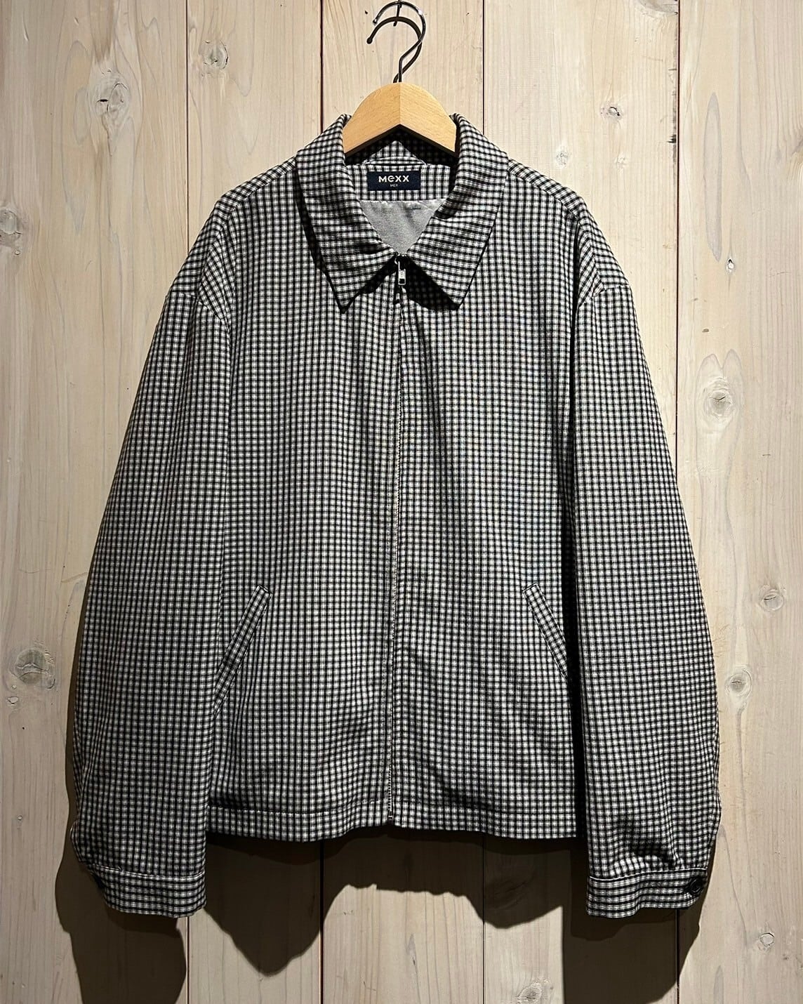 ハリのある素材を用いて、細やかな黒×白のモノトーンのチェック柄を載せたジップアップジャケット。