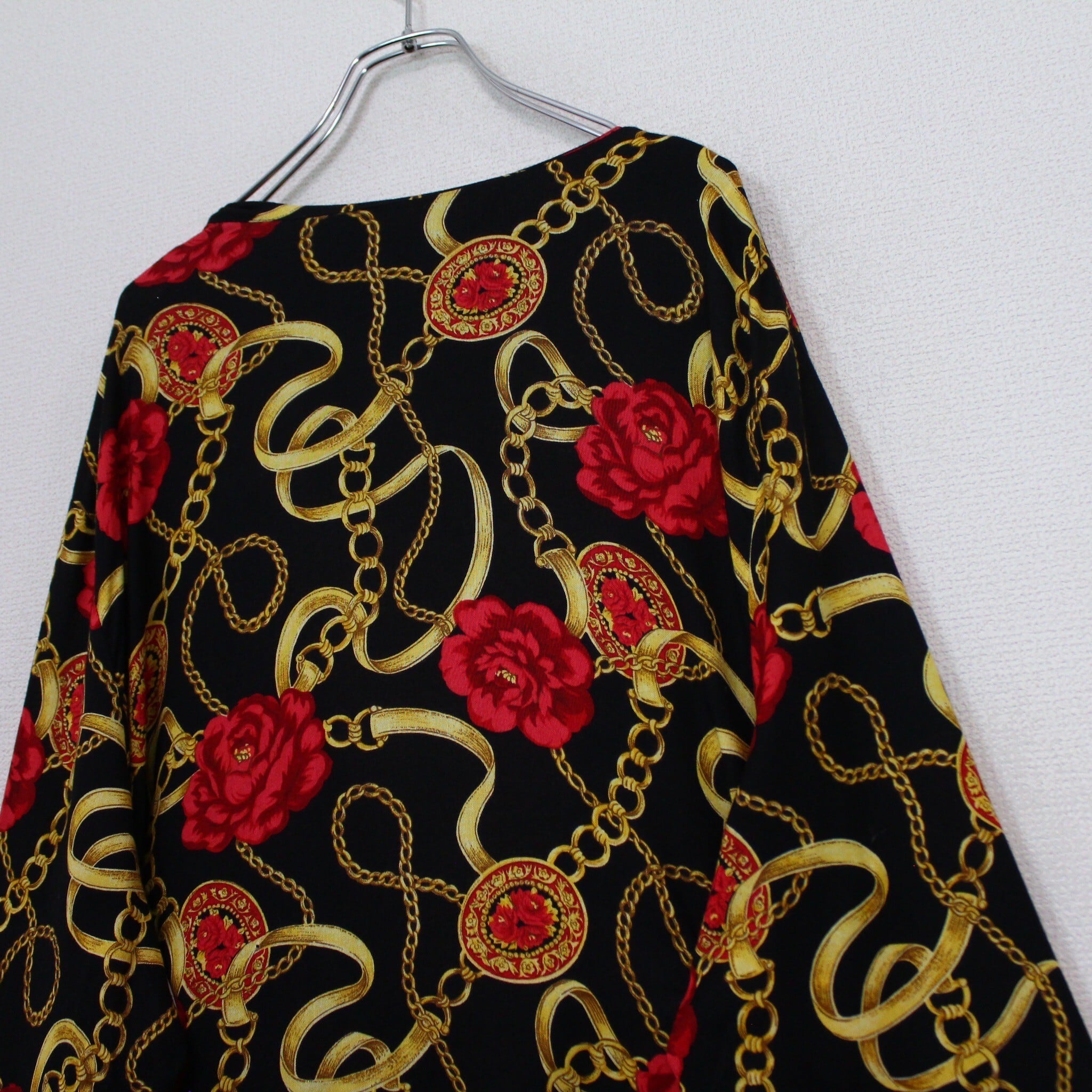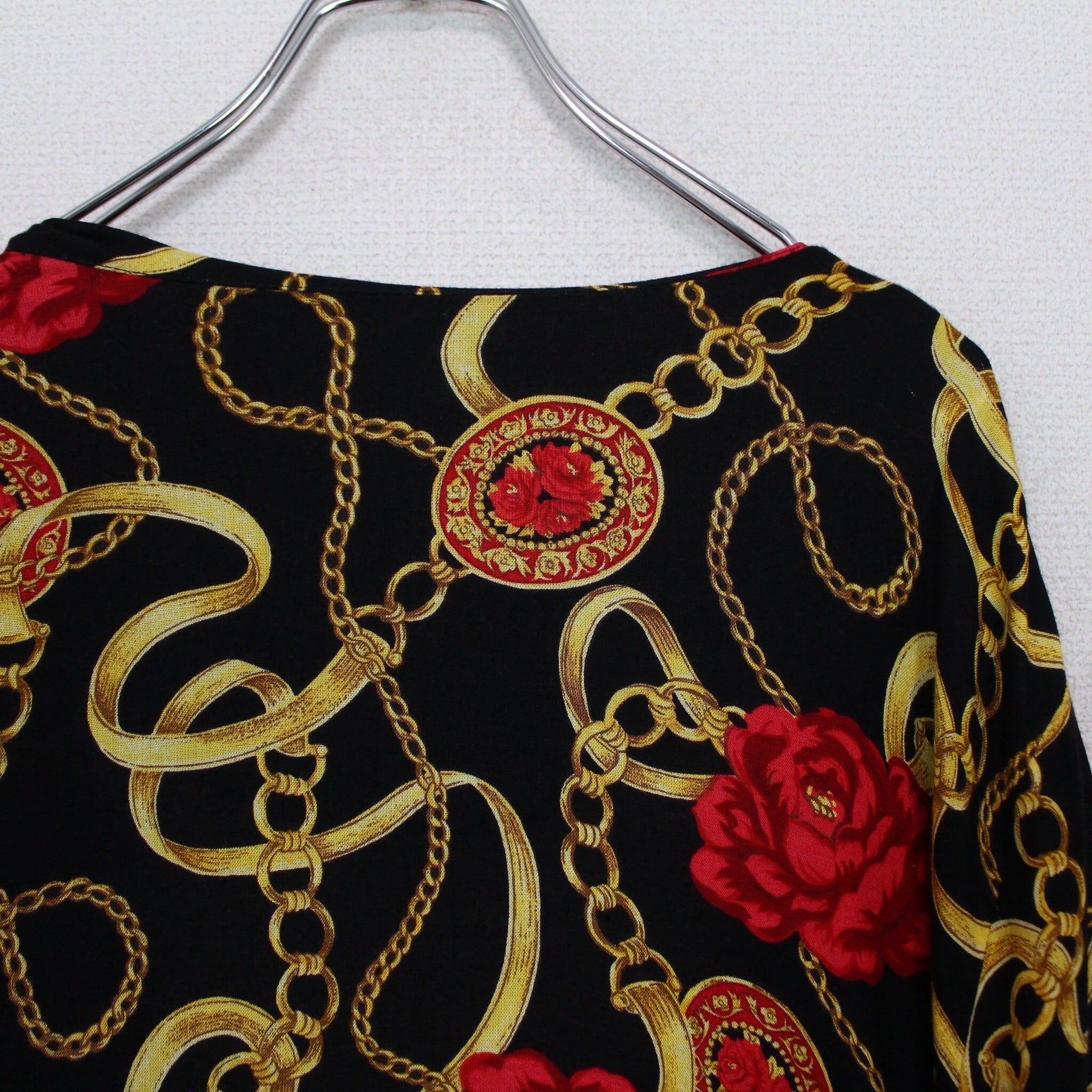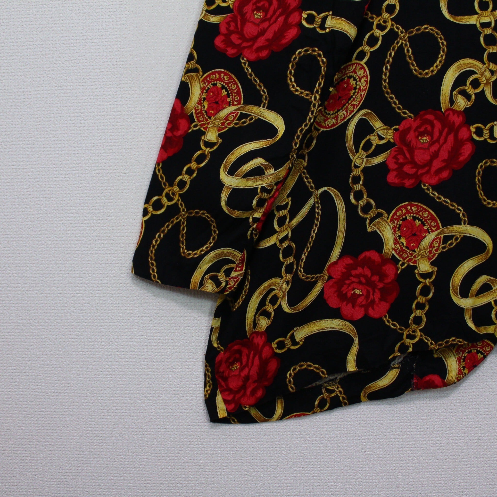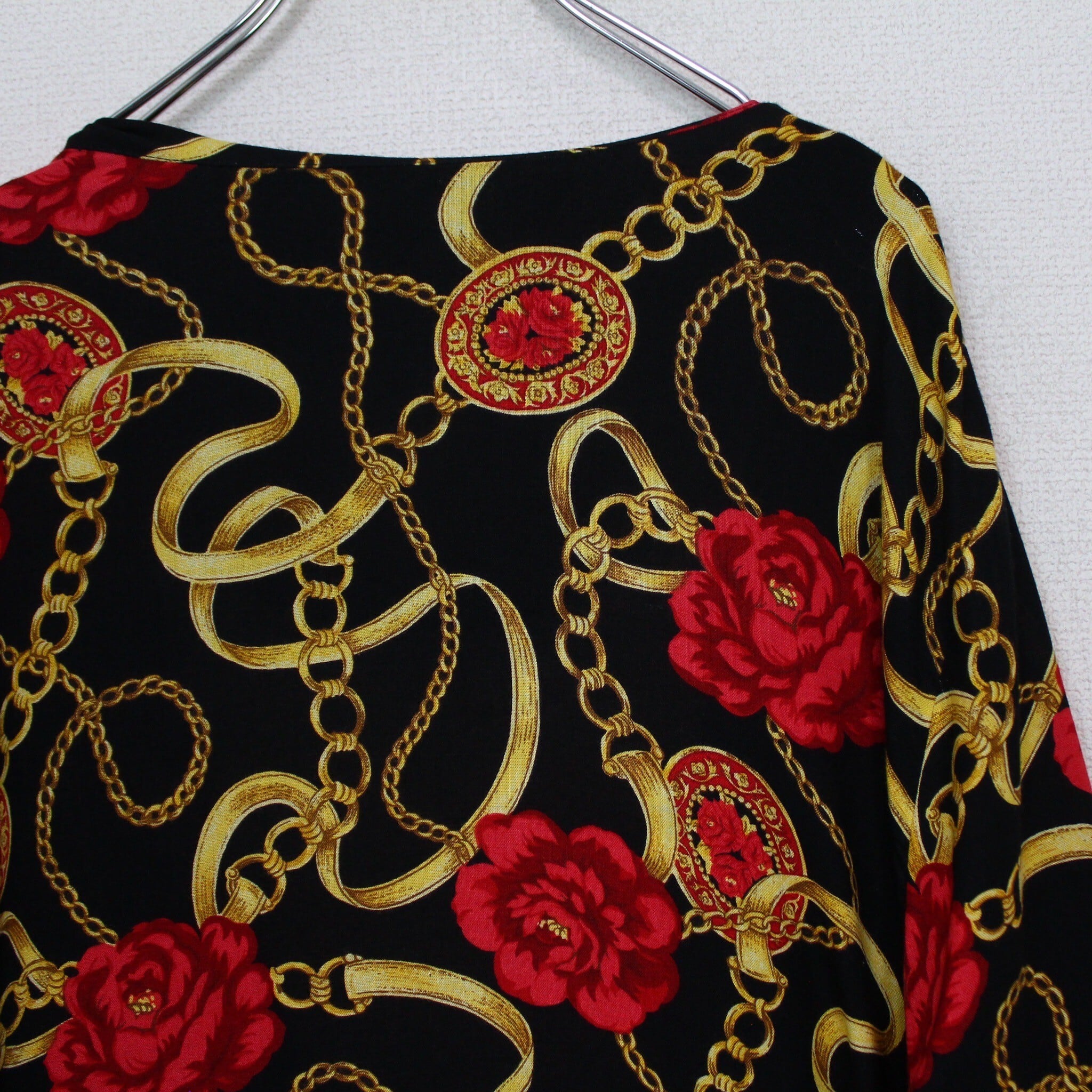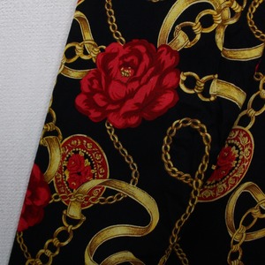 ブラックベースのボディに、真紅の花、ゴールドのチェーン柄を掛け合わせたスカーフ柄を載せた逸品。