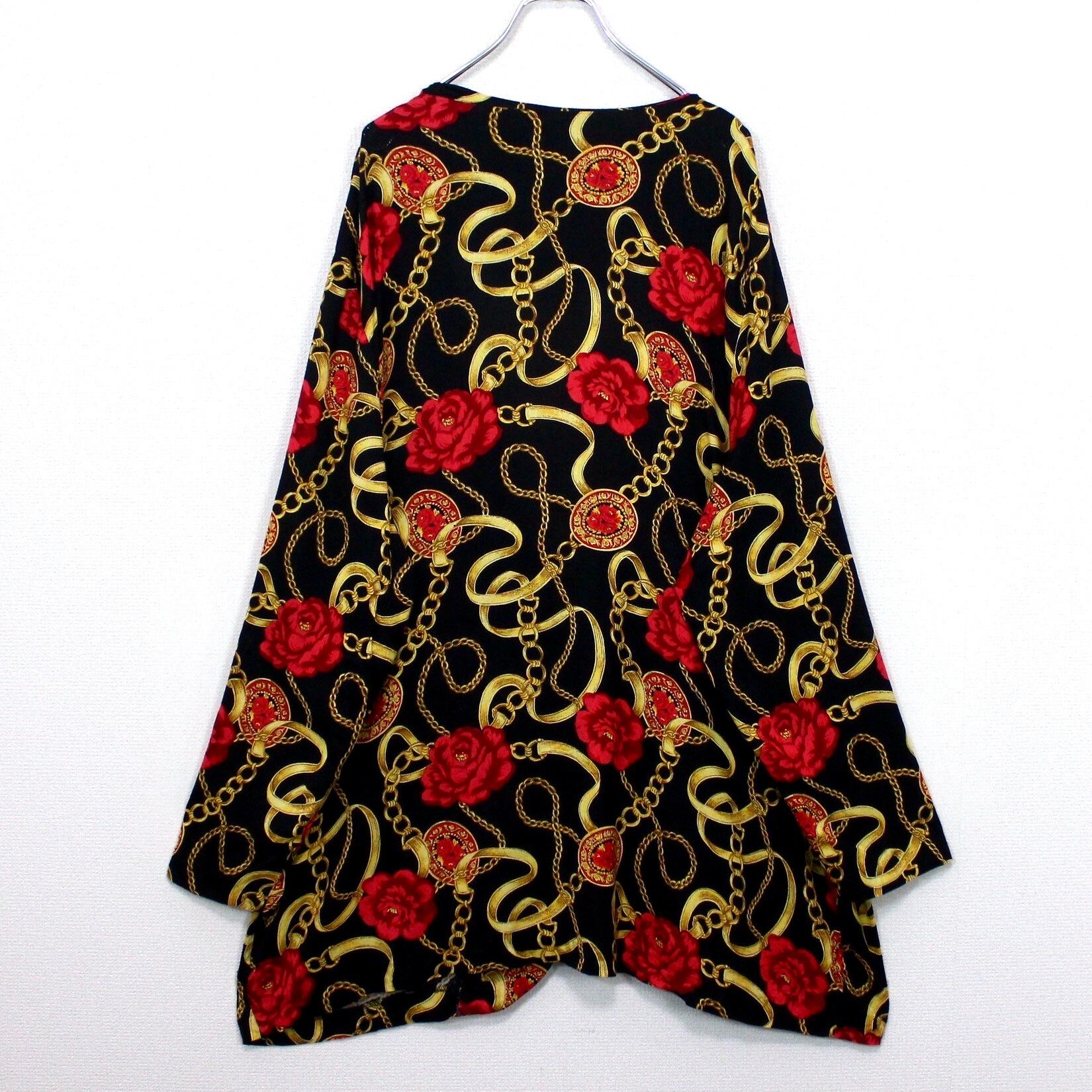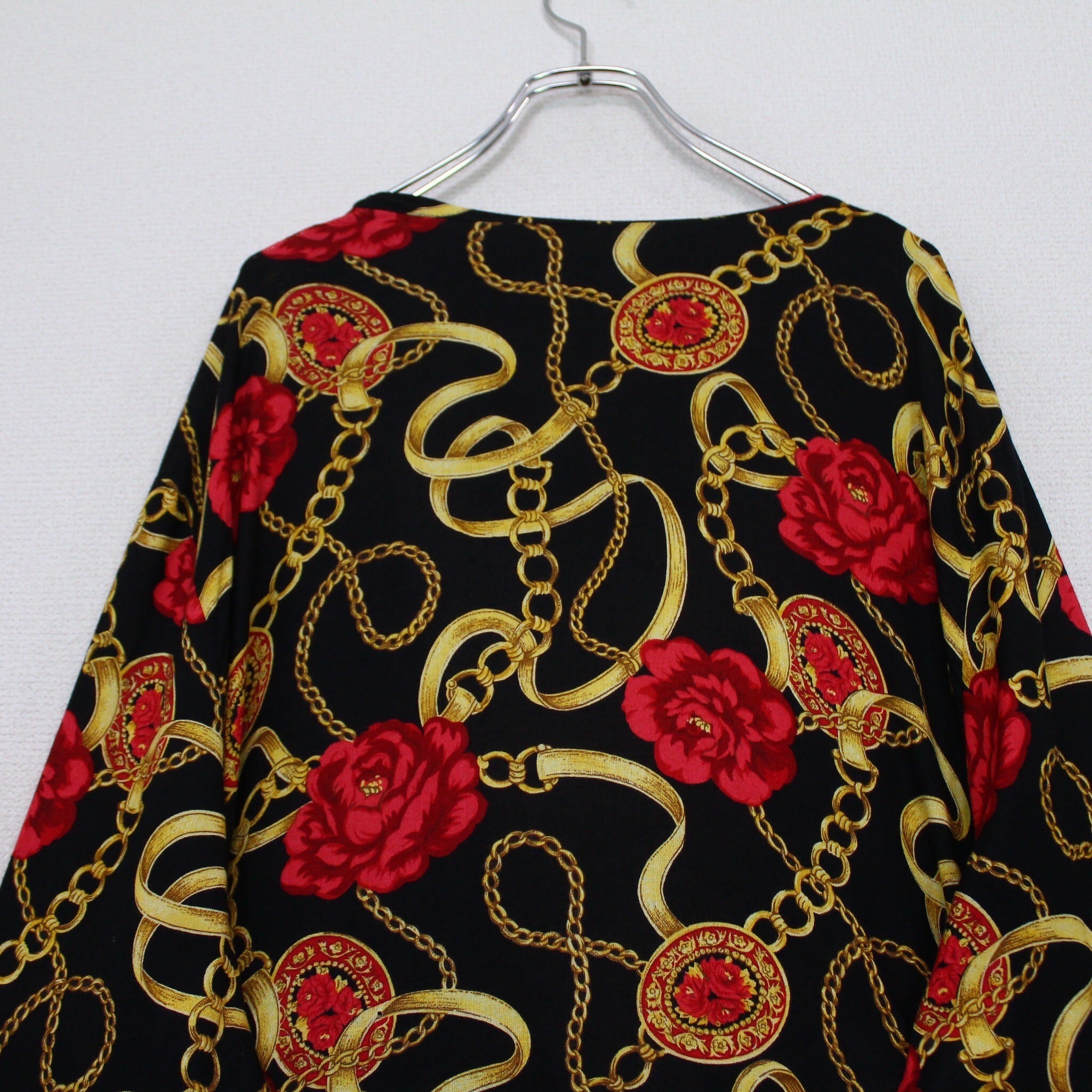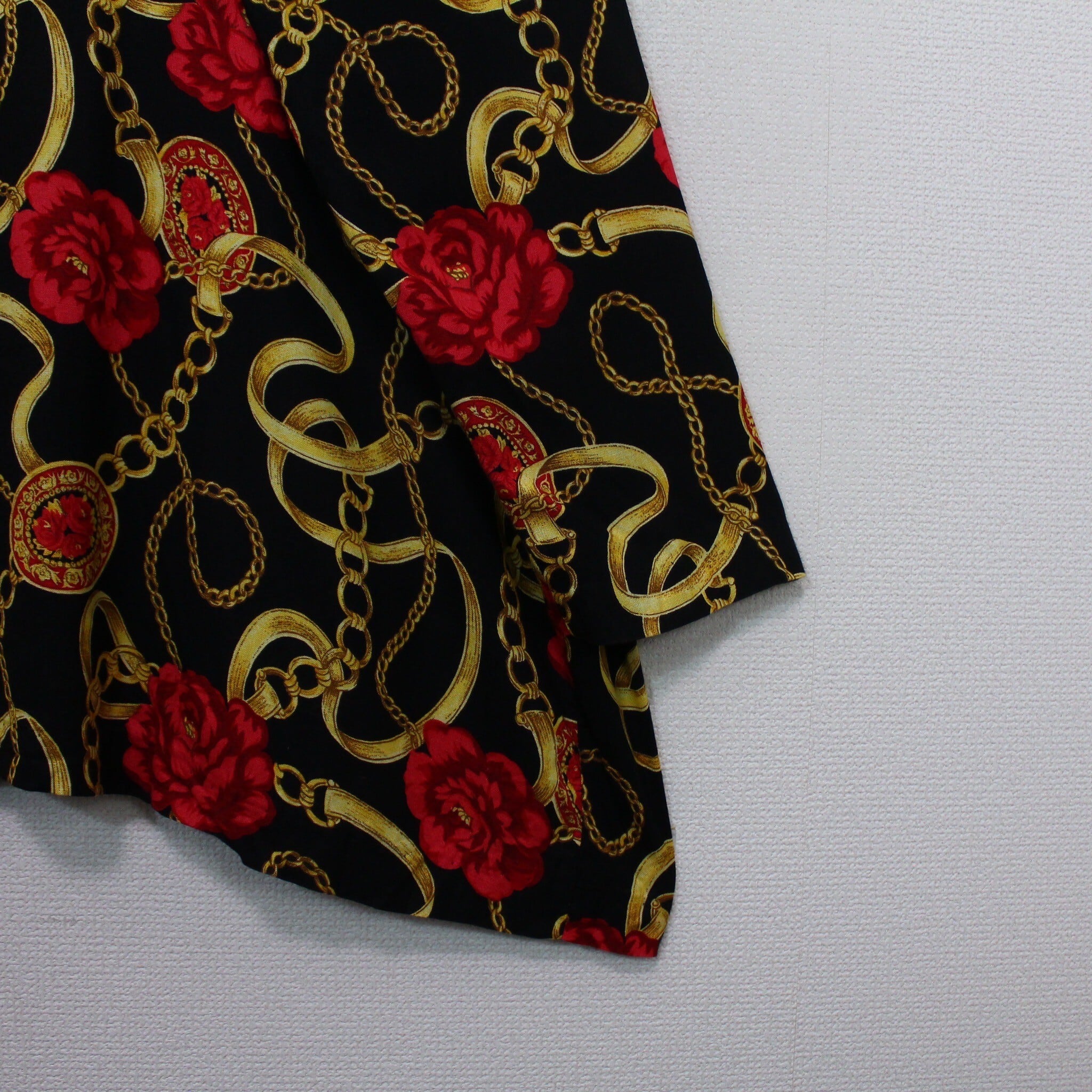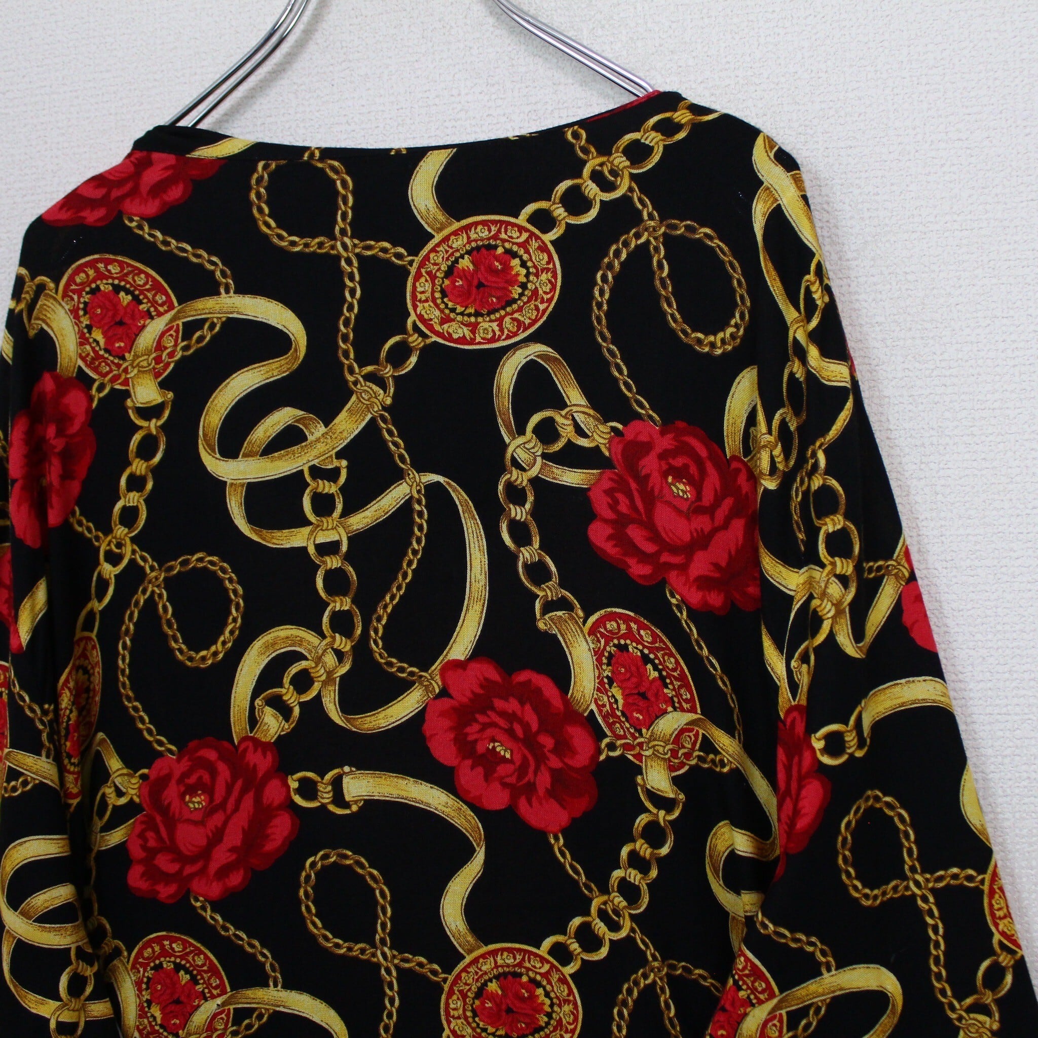 ブラックベースのボディに、真紅の花、ゴールドのチェーン柄を掛け合わせたスカーフ柄を載せた逸品。
