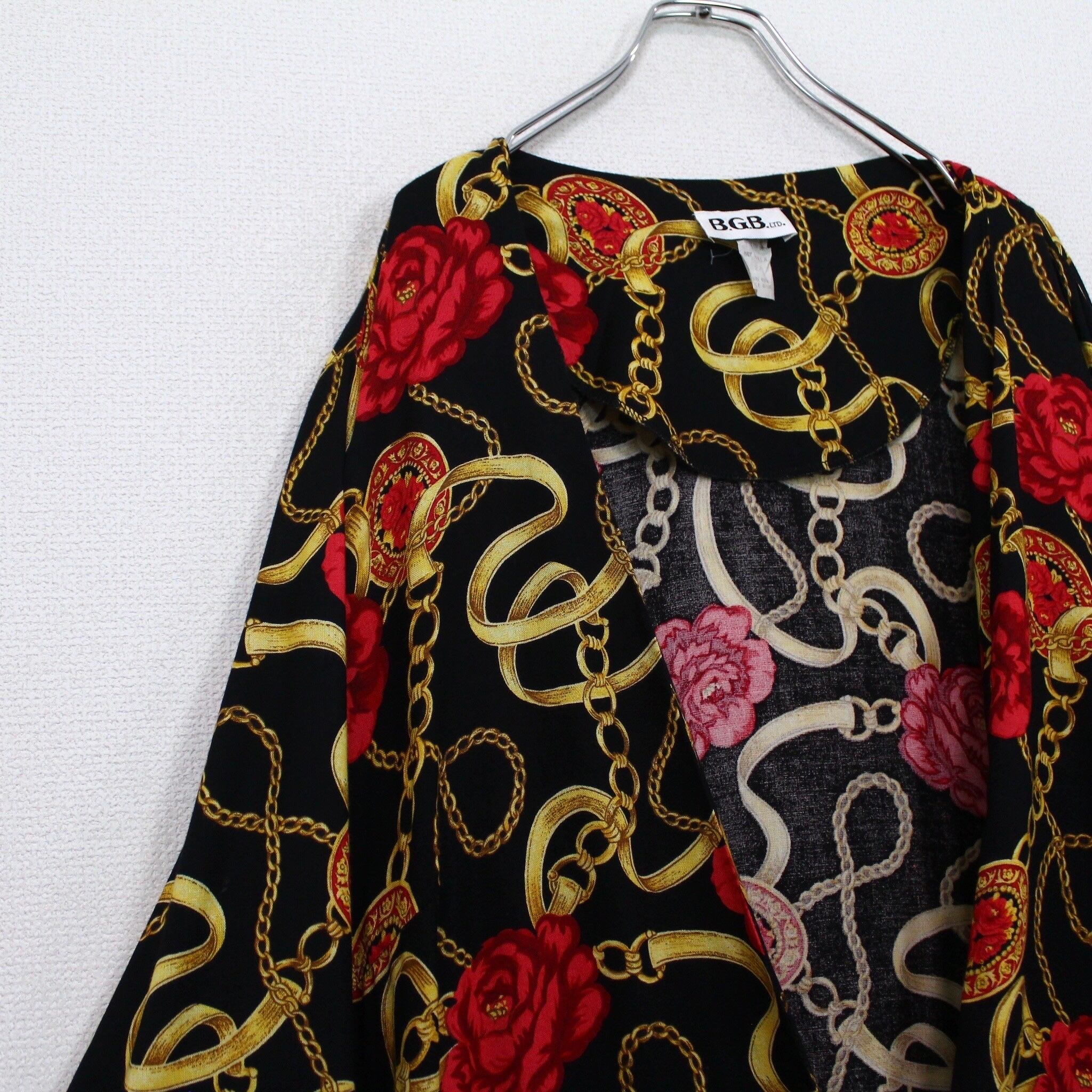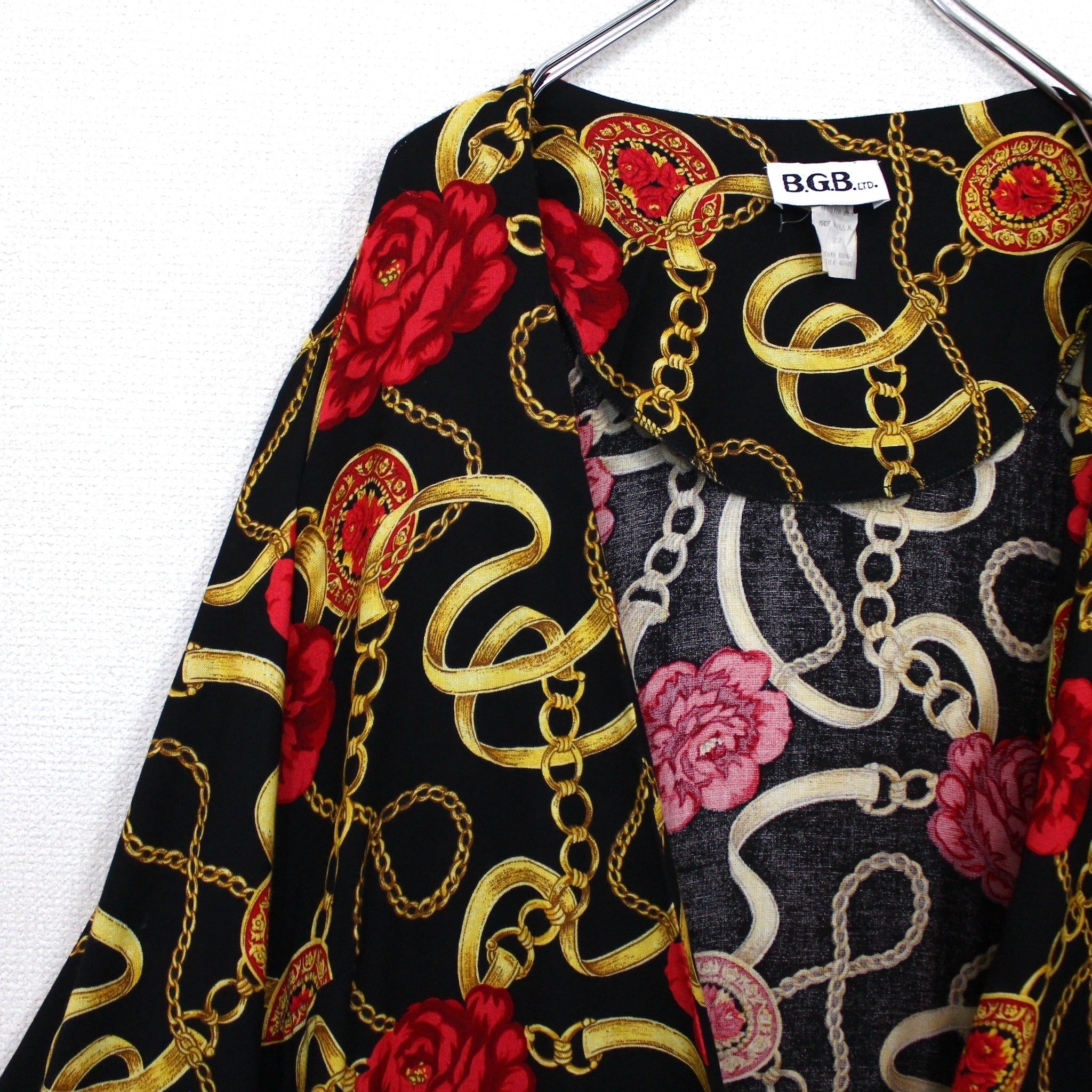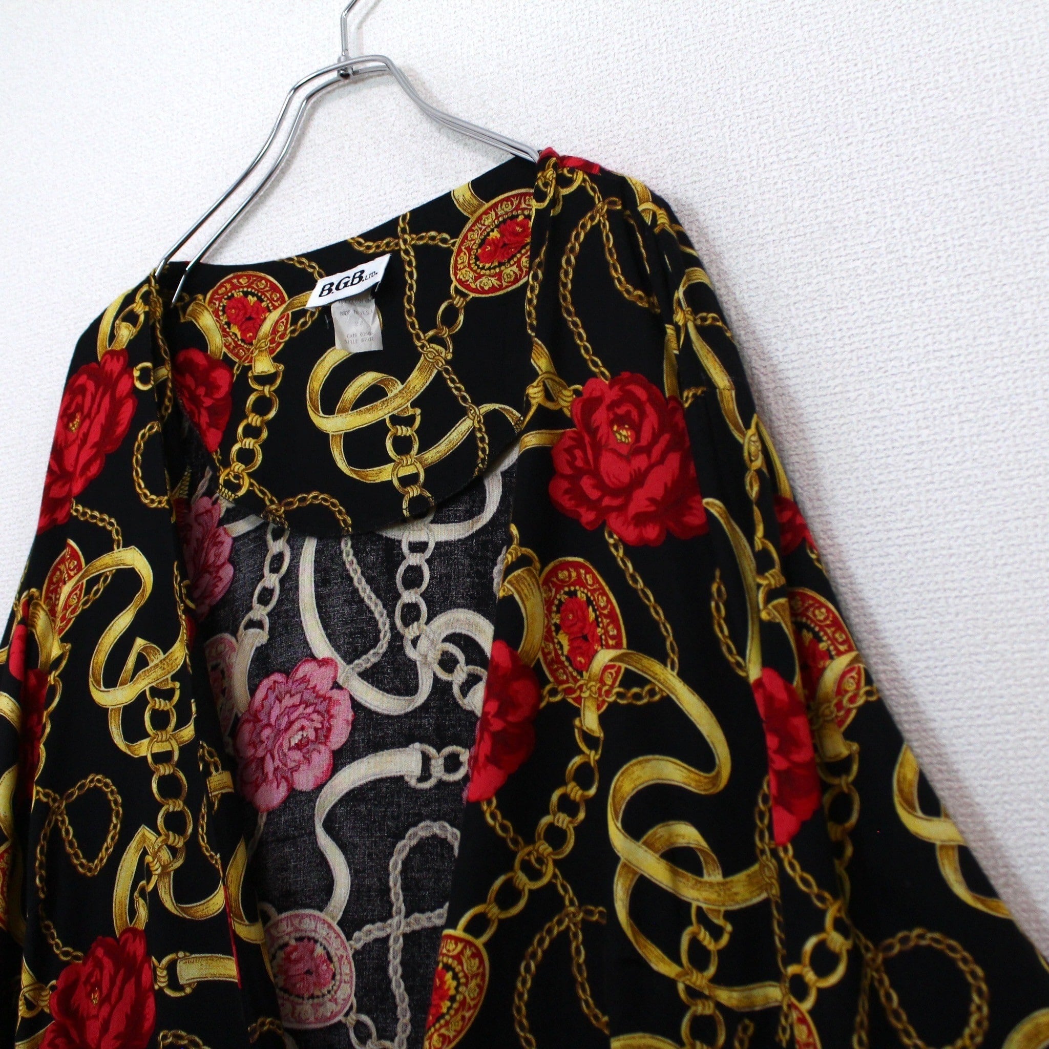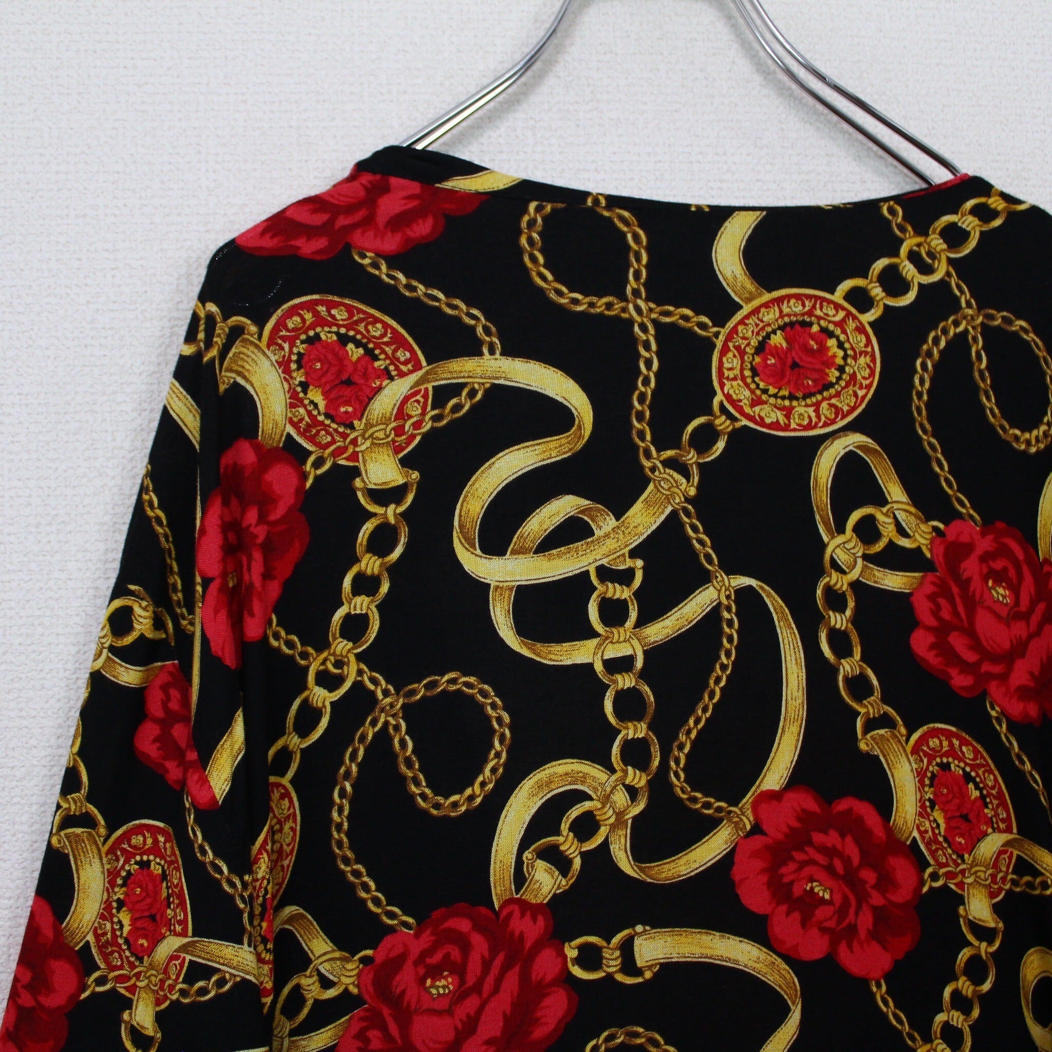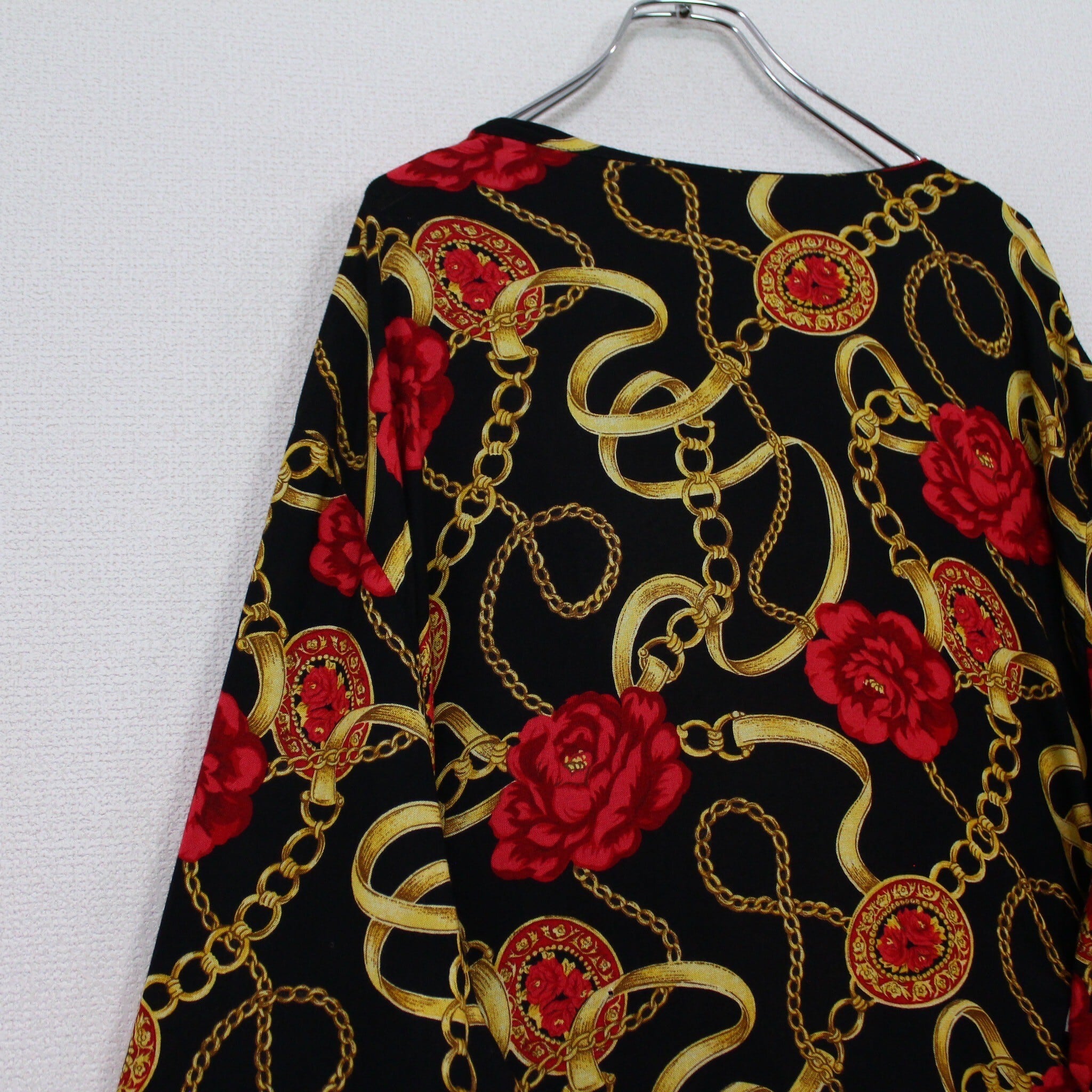 ブラックベースのボディに、真紅の花、ゴールドのチェーン柄を掛け合わせたスカーフ柄を載せた逸品。